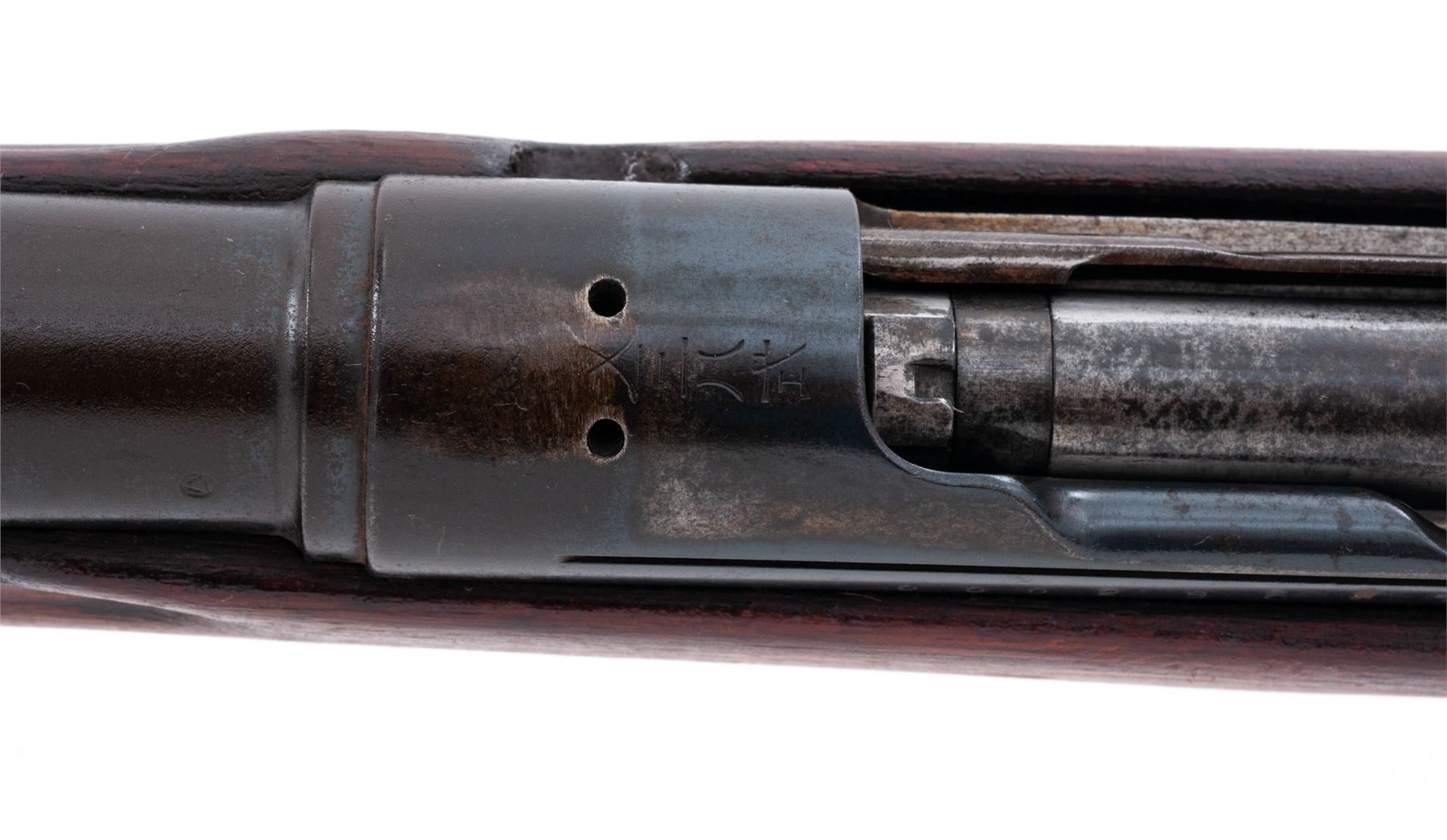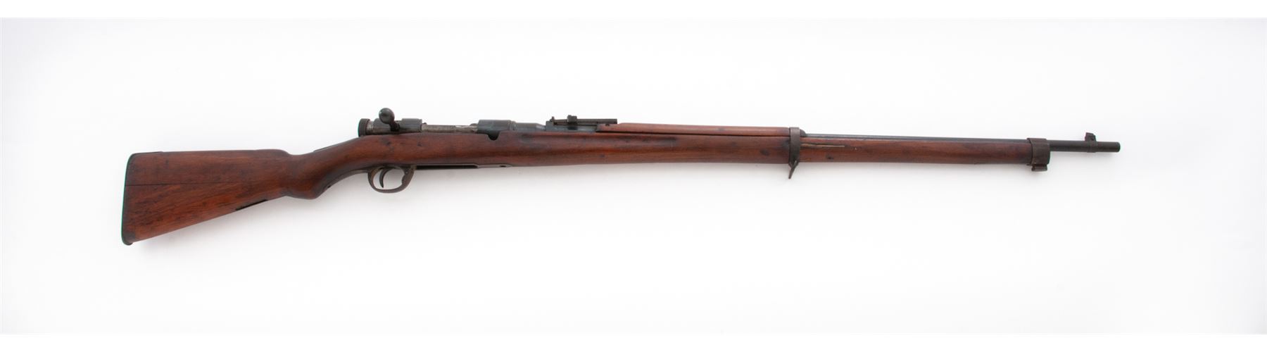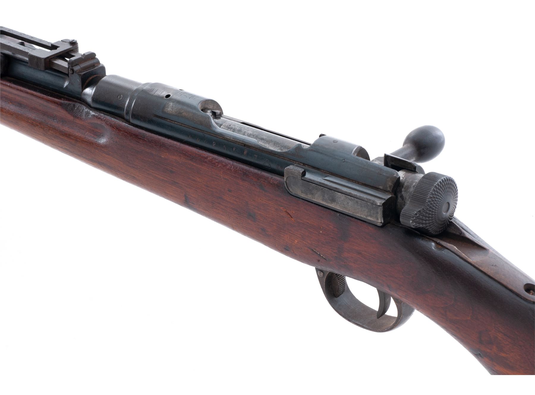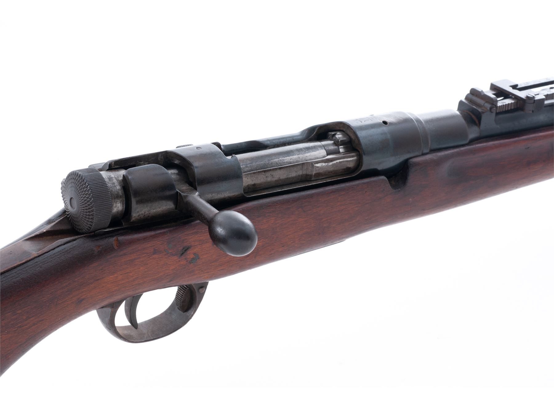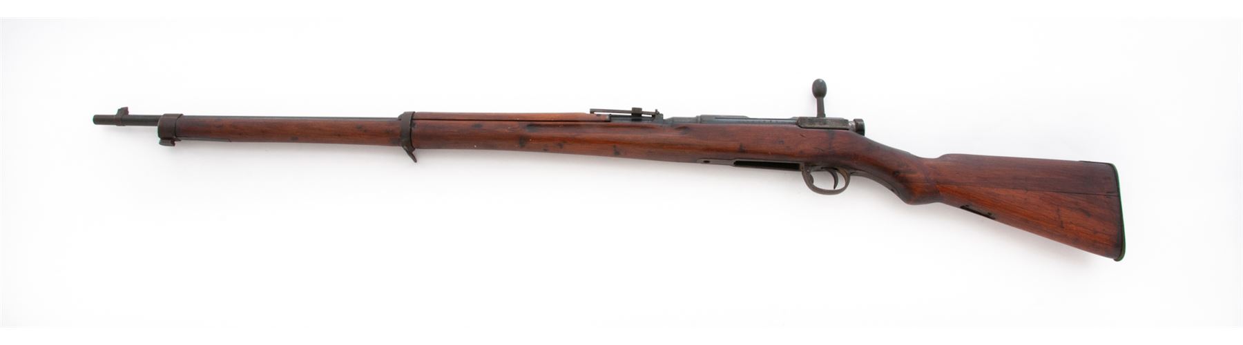 Japanese Type 38 Arisaka Bolt Action Rifle, #00028587, 6.5x50mm cal., 31.25'' barrel, blued finish, hardwood stock, inverted ''V'' front sight and adjustable folding leaf rear sight. Marked on top of receiver with obliterated Imperial chrysanthemum over a partially visible character for ''school'' and ''38 Type''. Left side of receiver has ''00'' stamped next to serial number, indicating rifle was removed from service, along with the mark for the Kokura Arsenal. Mismatched number on bolt handle. Rifle is missing cleaning rod, front triggerguard screw, magazine floorplate, spring and follower, and rear sling bracket and swivel. Front of extractor has been filed. Condition overall is good with approx. 40% finish remaining on the rifle, turning brown over much of the surface. Pistol grip has been re-shaped and wood has been sanded and varnished over old handling marks. Action is smooth, bore is poor and dark overall with visible rifling. No visible import stamps. Est.: $200-$300. (C&R)
