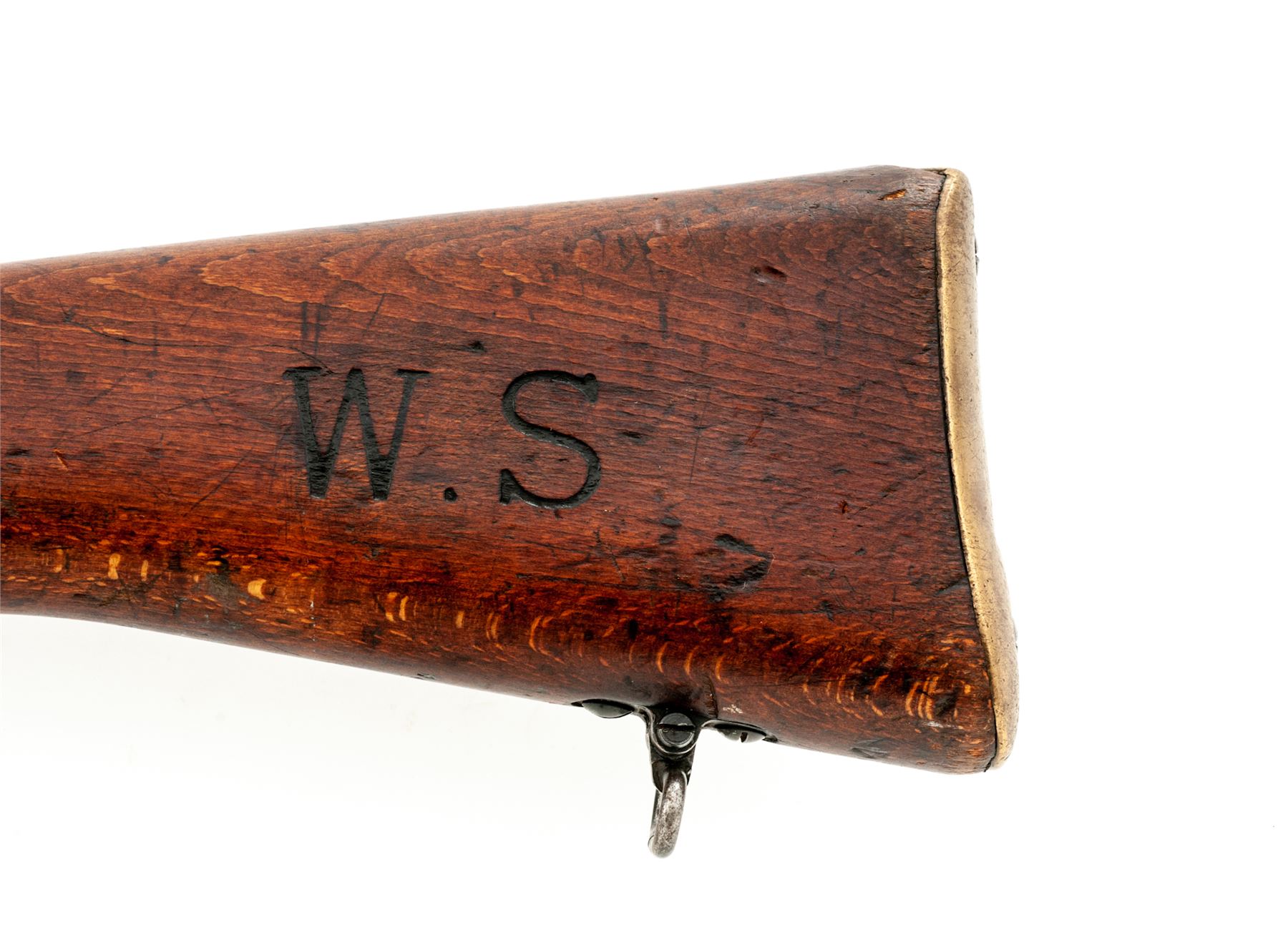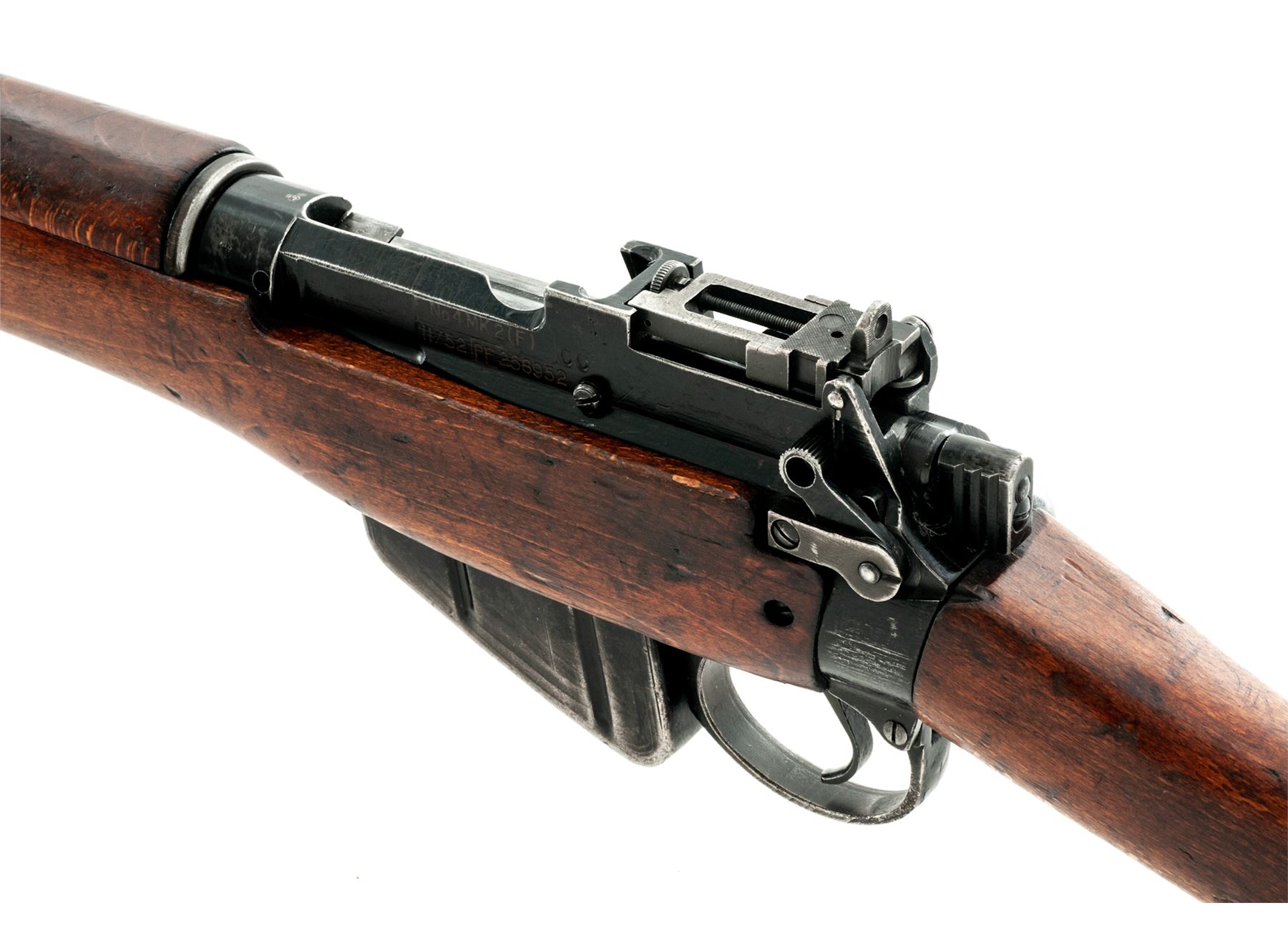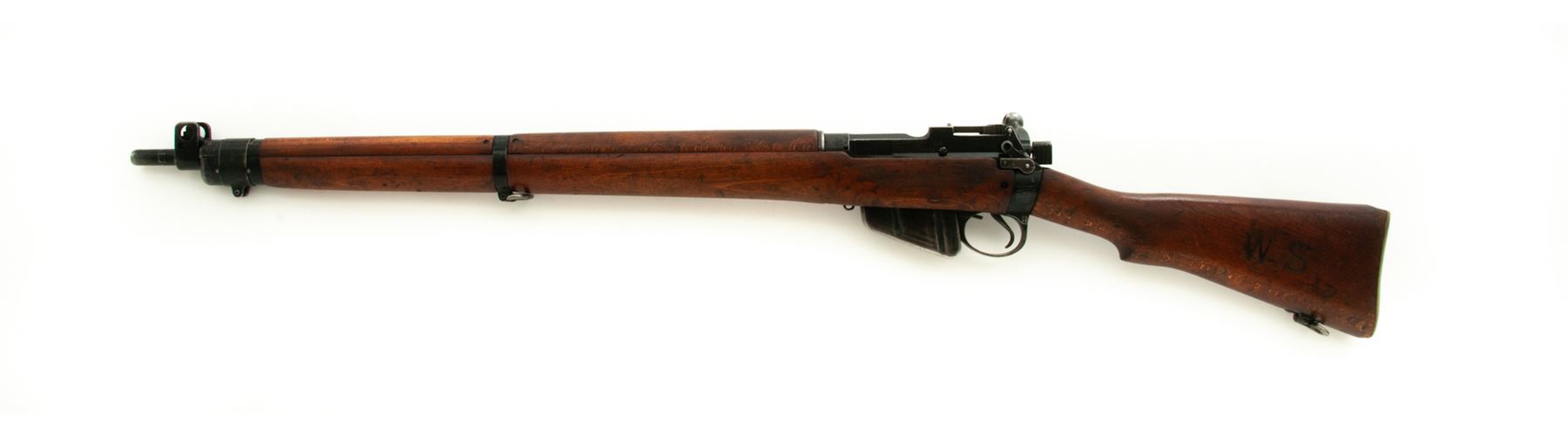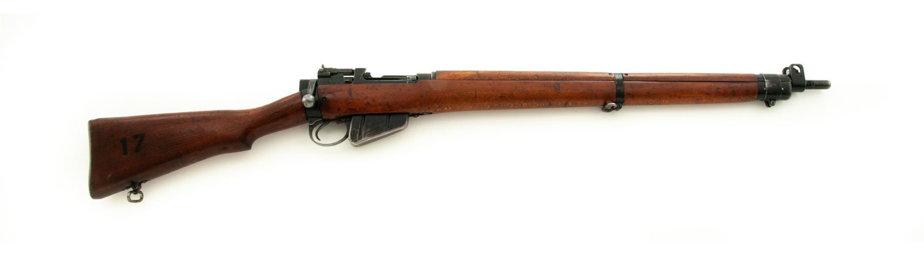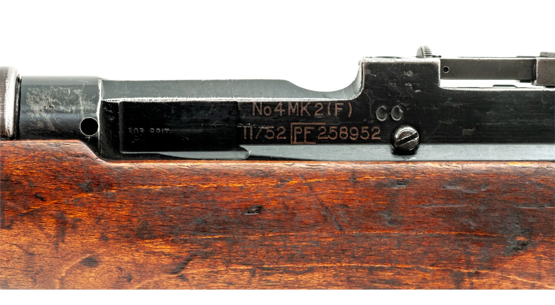 British No. 4 Mk 2 Lee-Enfield Bolt Action Rifle, #PF258952, .303 British cal., 25.2'' barrel, black painted finish, hardwood stock, blade front sight with protective ears and adjustable folding rear sight with aperture. Marked on left side of receiver ''No 4 MK 2(F) 11/52 PF258952'' in electric pencil. An added ''CC'' has also been stamped. A large ''W.S.'' has been burned into left side of buttstock, and ''17'' has been painted on right side. Matching numbers, and a #1 bolt head fitted. Condition overall is very good with approx. 70% finish remaining on the metal. Wood is very good with overall handling marks and darkening to the finish. Action is smooth, bright bore is very good with very good rifling. Import stamped on left side of receiver. Est.: $400-$550. (C&R)