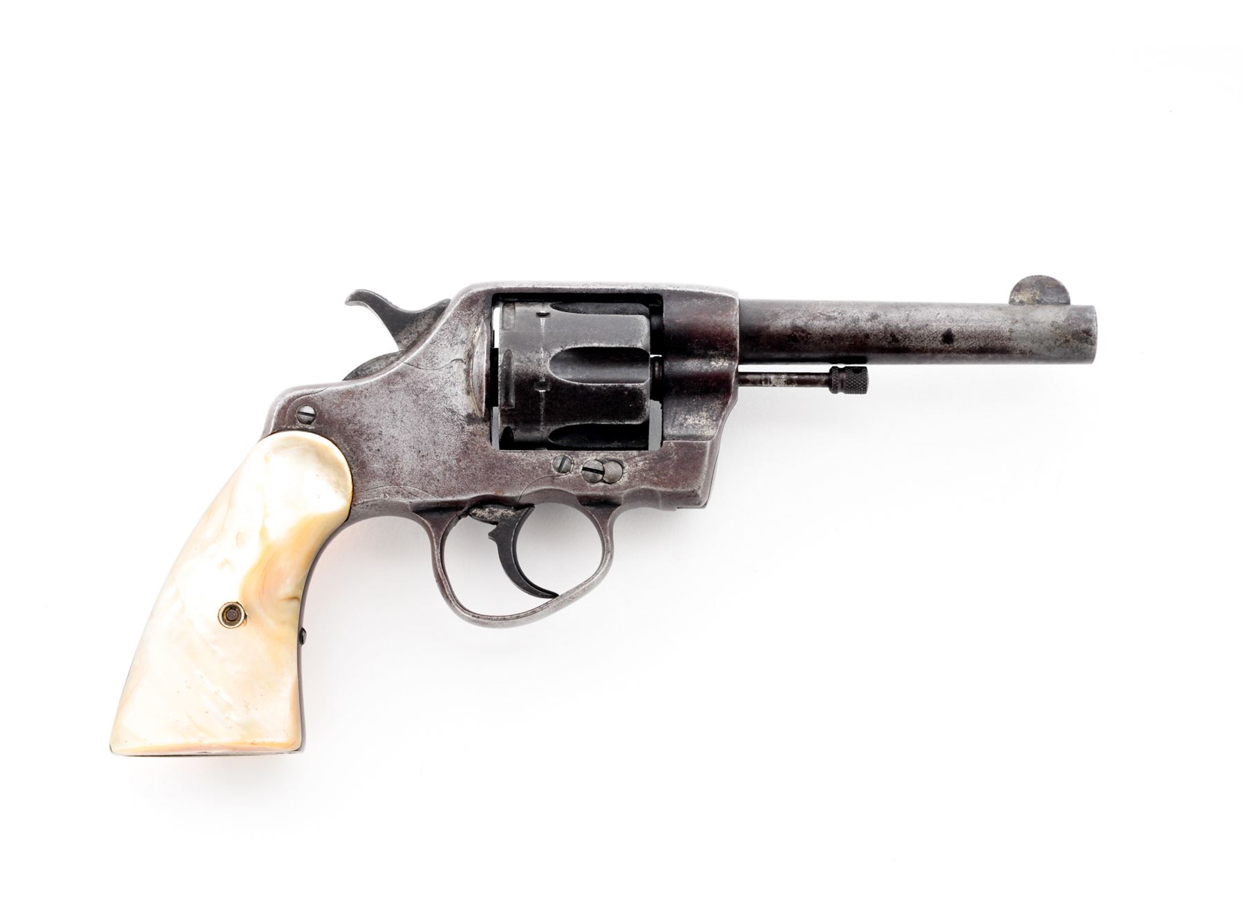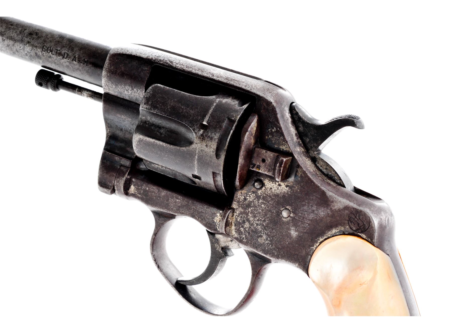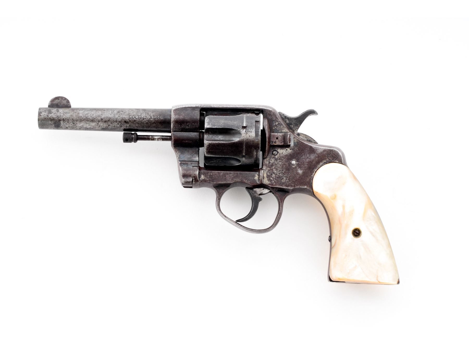 Colt Model 1895 Double Action Revolver, #342307, .41 Colt cal., 4.5'' barrel, blue finish, smooth pearl grips, with early features, such as checkered hammer and cylinder release. Condition is fair to good with little original finish remaining. Markings are clear. Sideplate fits well, with straight screw slots. Triggerguard is dented but does not affect action. Grips with small losses to left side of butt area. Good action, fair bore. Serial number may have been mismarked. ''Aug. 5 '84, Nov. 6 '88, Mar. 5 '95'' patent dates marked on top of barrel. Est.: $150-$250. (C&R)