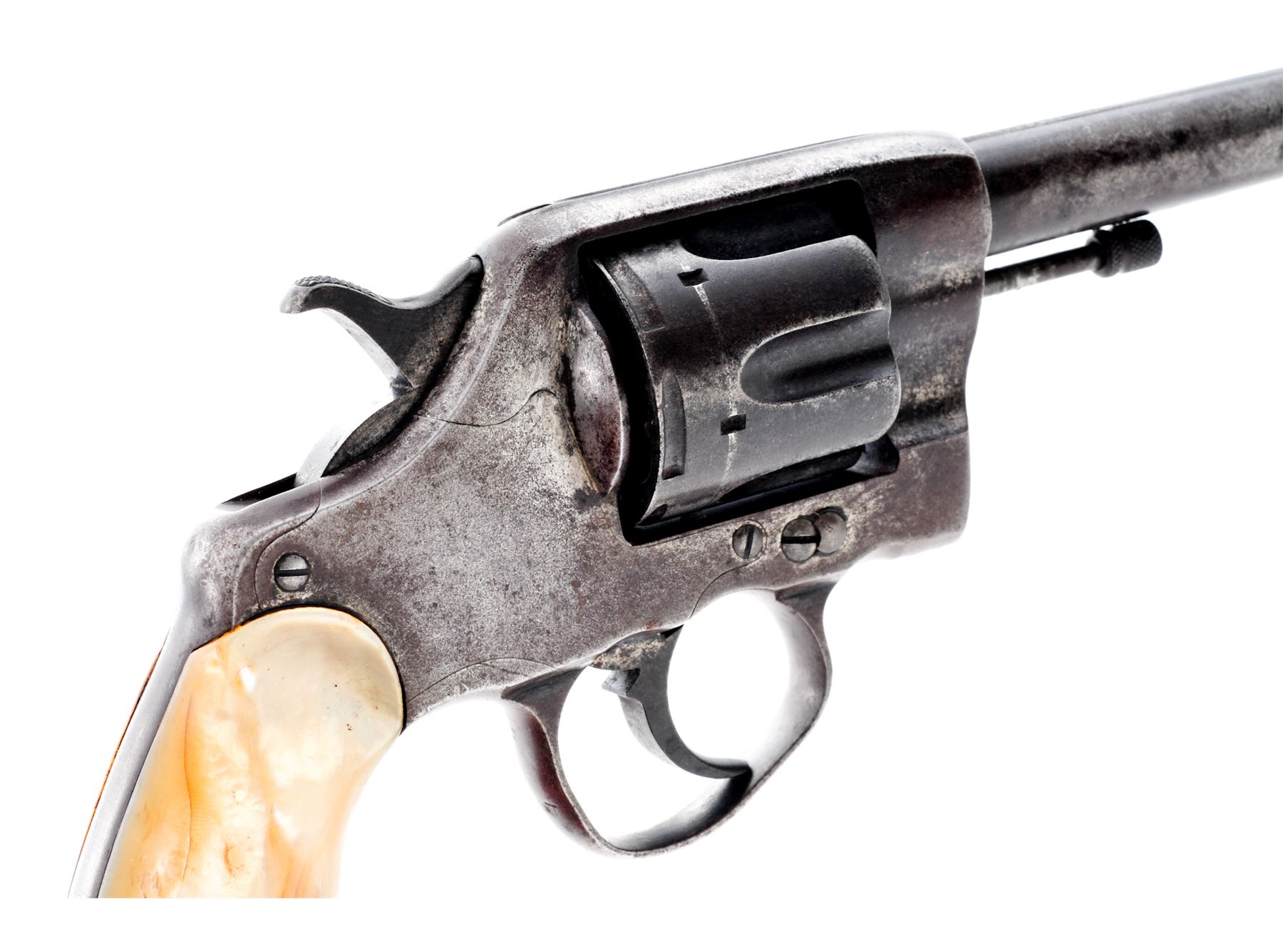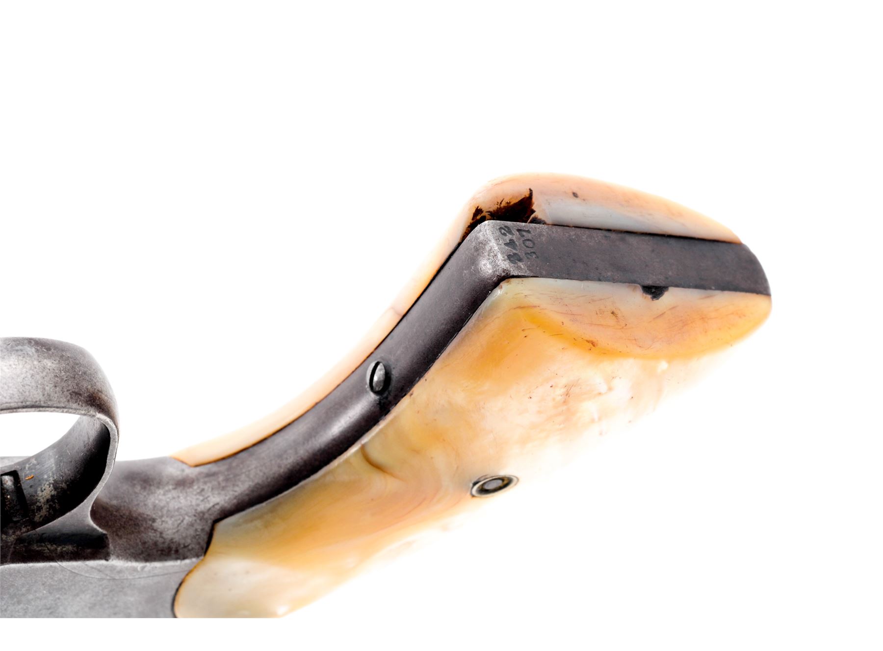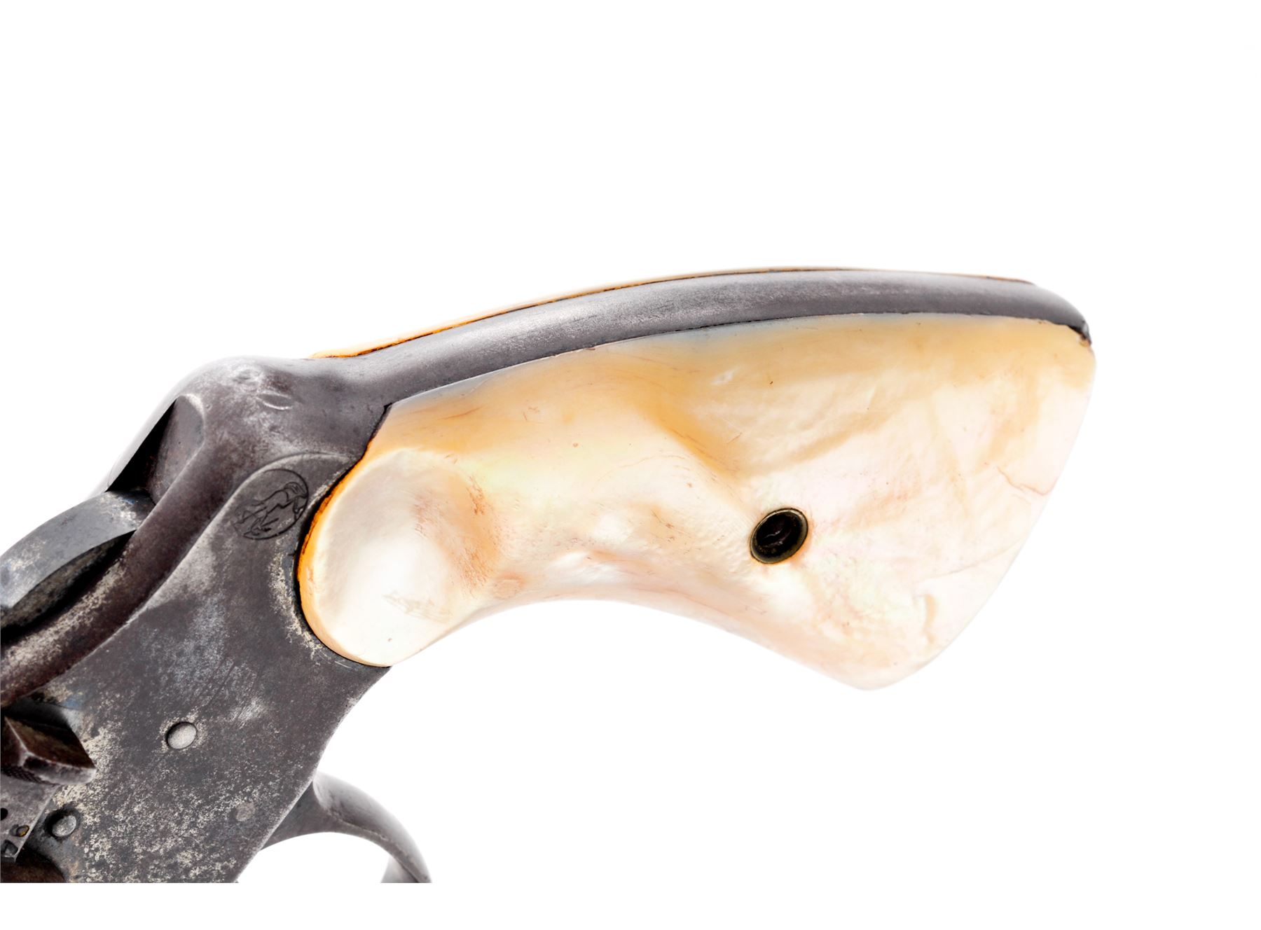 Colt Model 1895 Double Action Revolver, #342307, .41 Colt cal., 4.5'' barrel, blue finish, smooth pearl grips, with early features, such as checkered hammer and cylinder release. Condition is fair to good with little original finish remaining. Markings are clear. Sideplate fits well, with straight screw slots. Triggerguard is dented but does not affect action. Grips with small losses to left side of butt area. Good action, fair bore. Serial number may have been mismarked. ''Aug. 5 '84, Nov. 6 '88, Mar. 5 '95'' patent dates marked on top of barrel. Est.: $150-$250. (C&R)