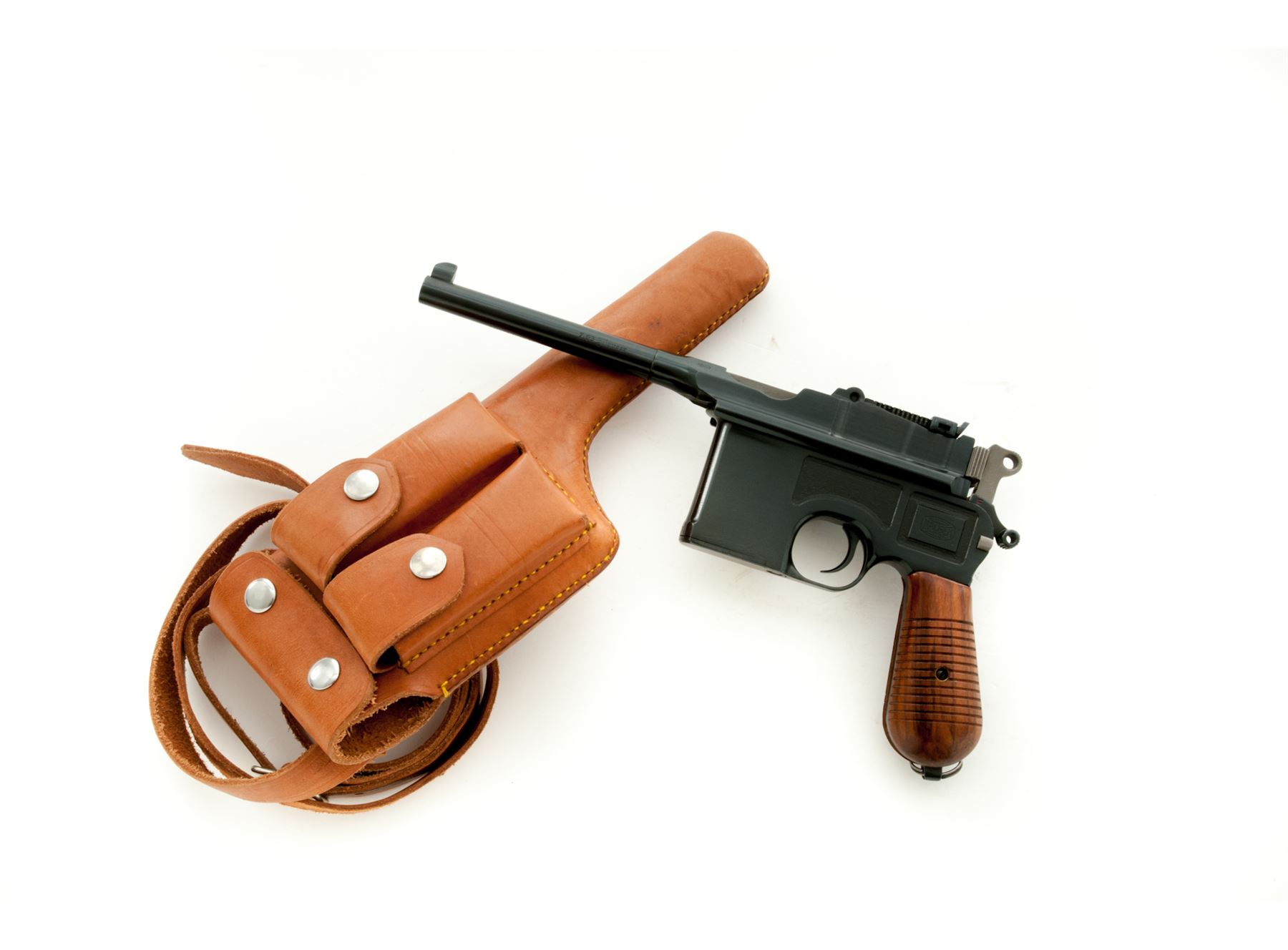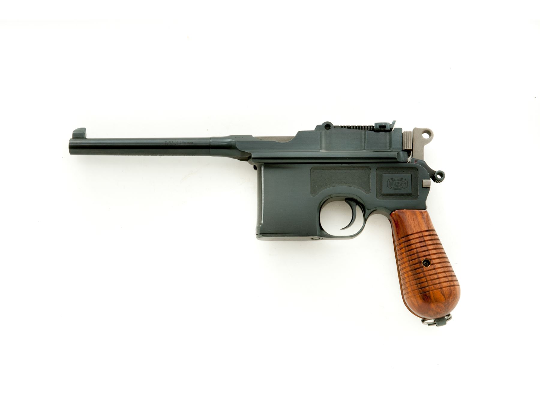Mauser C96 Broomhandle Semi-Automatic Pistol, #905778, .30 Mauser cal., 5.5'' barrel, blue finish, grooved walnut stocks, in brown leather holster. Condition is excellent as professionally restored by Fed Ord, So. El Monte, CA in the late 1980s. Pistol retains approx. 98%+ professionally applied blue finish, new mfg'd grips are excellent, action needs minor adjustment (trigger does not release hammer), bore is bright. Chinese mfg'd leather shoulder-carried rig is as new. Est.: $500-$750. (C& R/PPT)