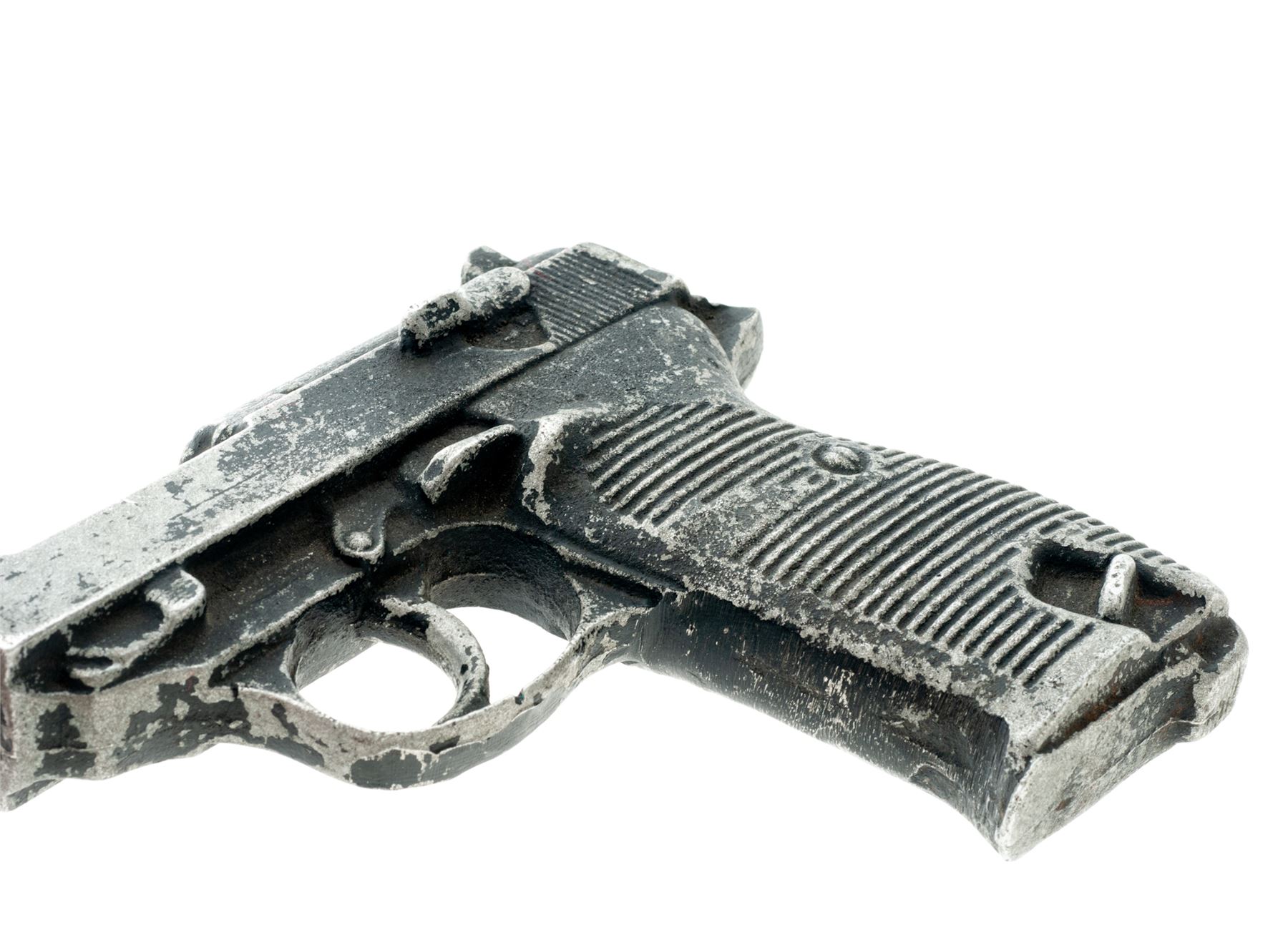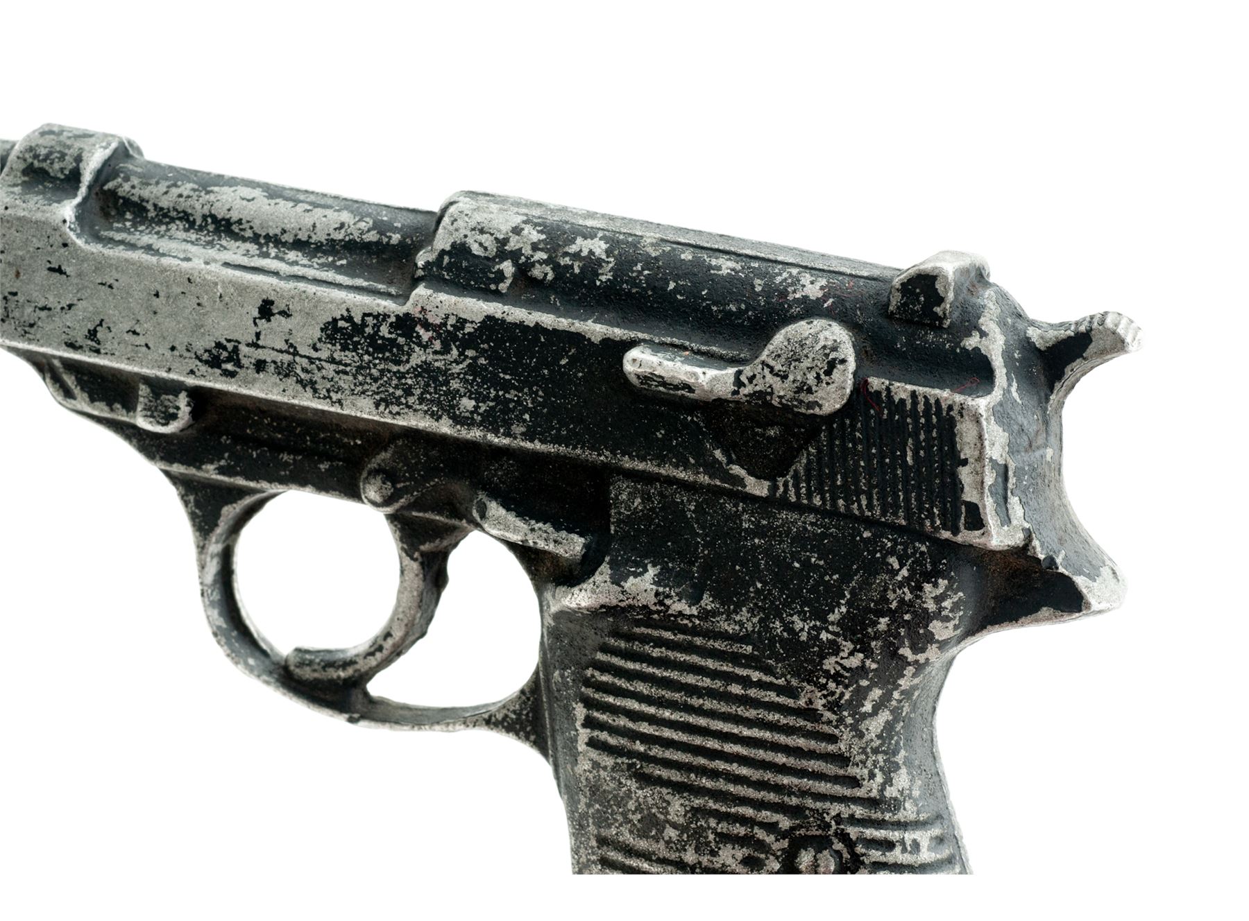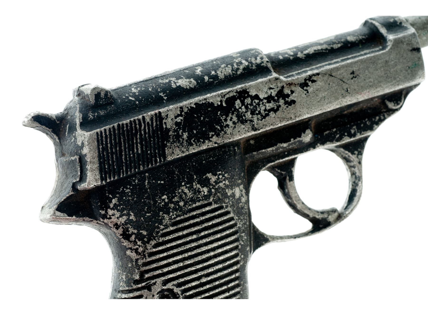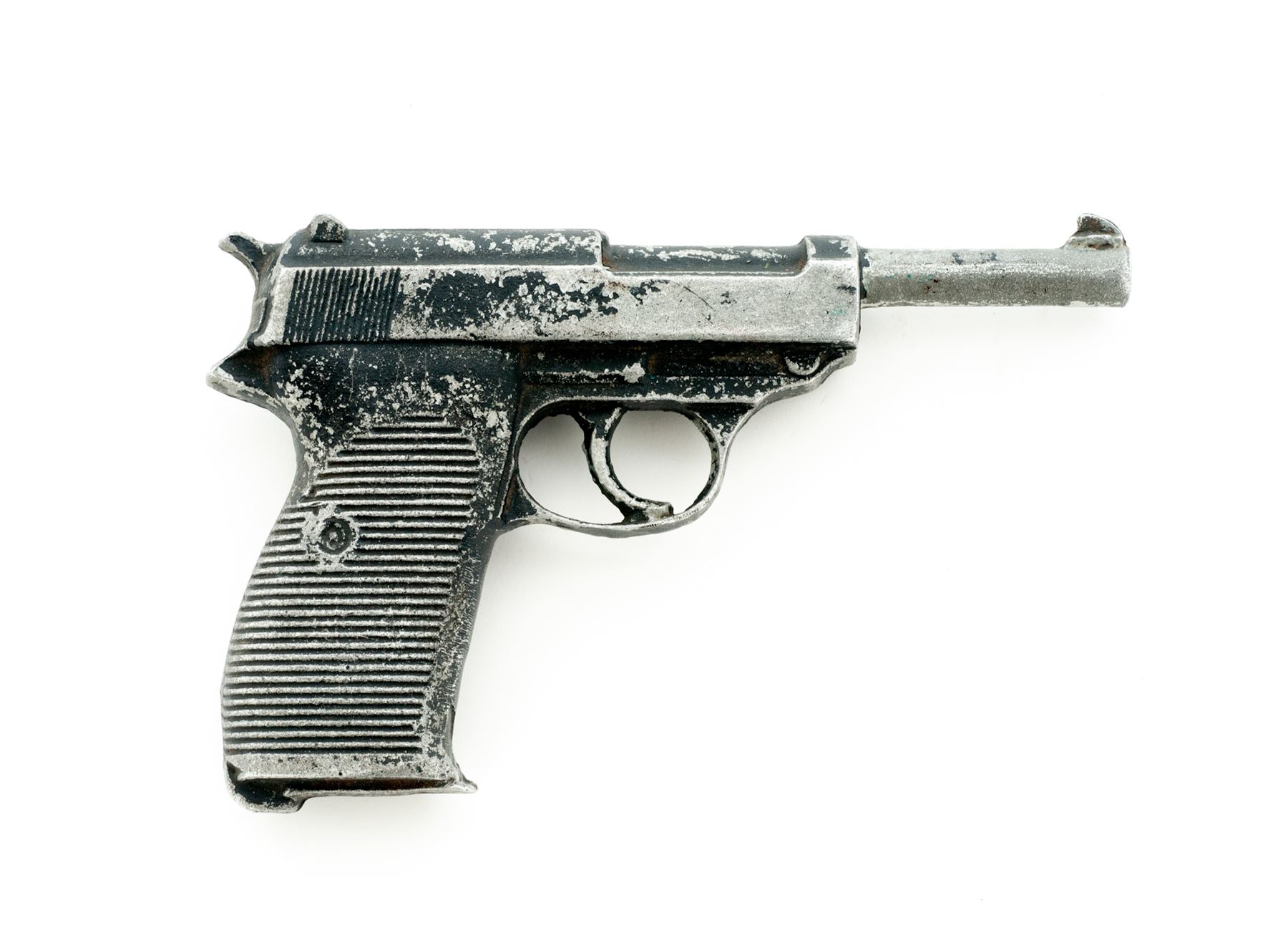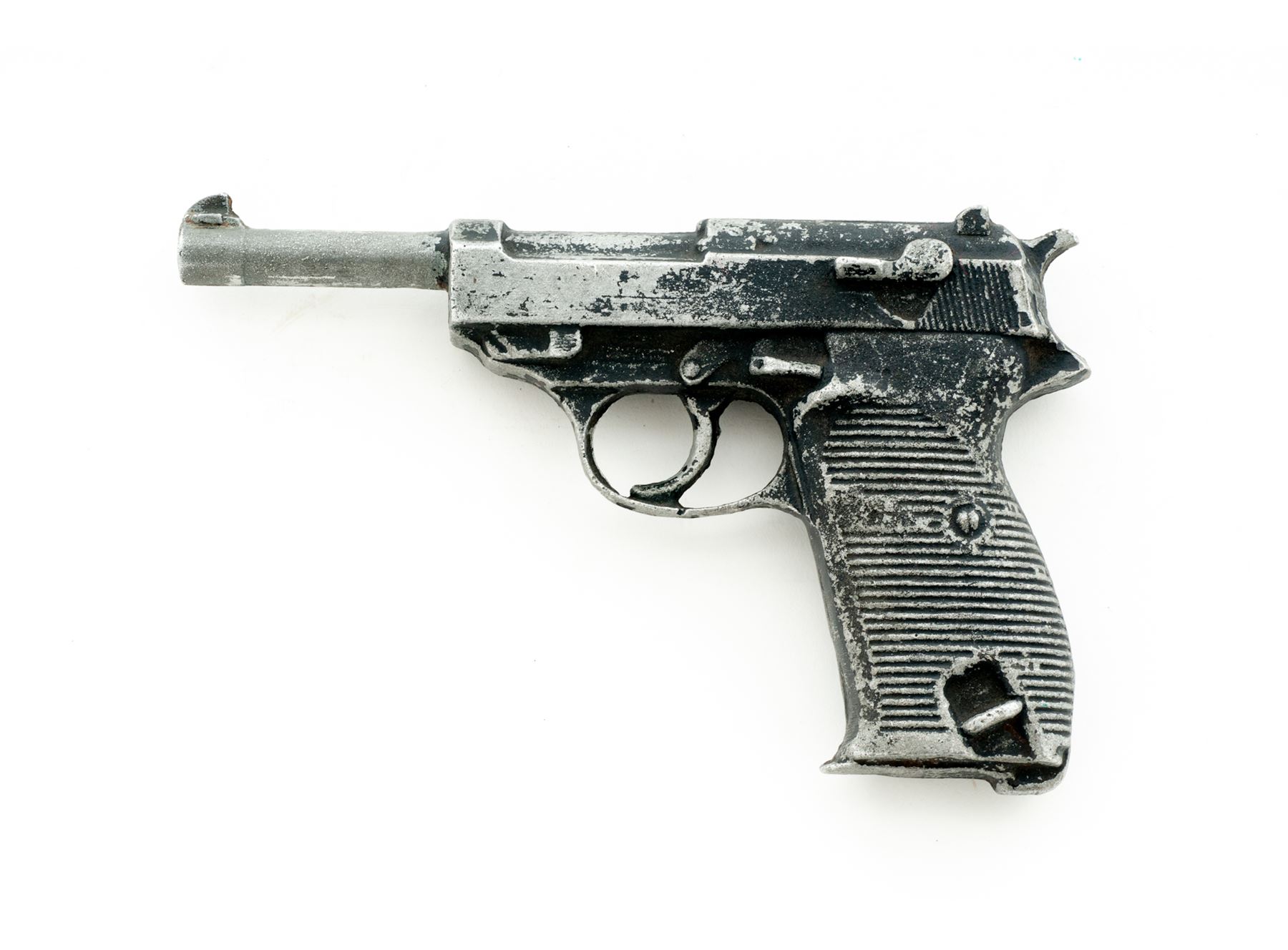 Aluminum Holster Mold for P.38 Semi-Automatic Pistol, NVSN, molded from WWII era P.38. Cast aluminum pieces like this were made by making sand molds from real pistols and casting aluminum and sometimes iron into the shape of these pistols, which were predominantly used in the shaping and production of holsters. Condition is very good. Aluminum is in excellent condition, with approx. 50% of its black finish having worn away. Est.: $100-$200.
