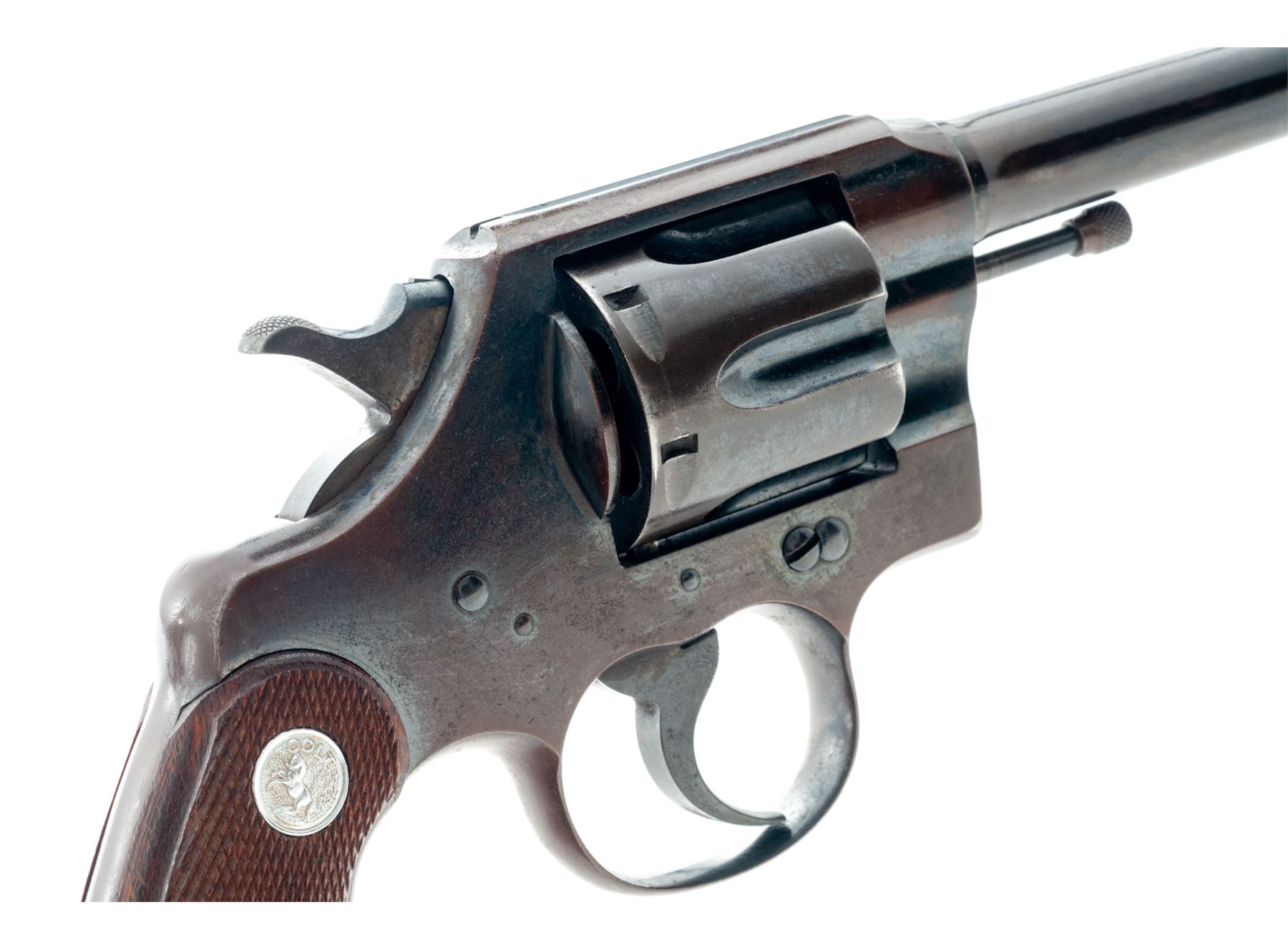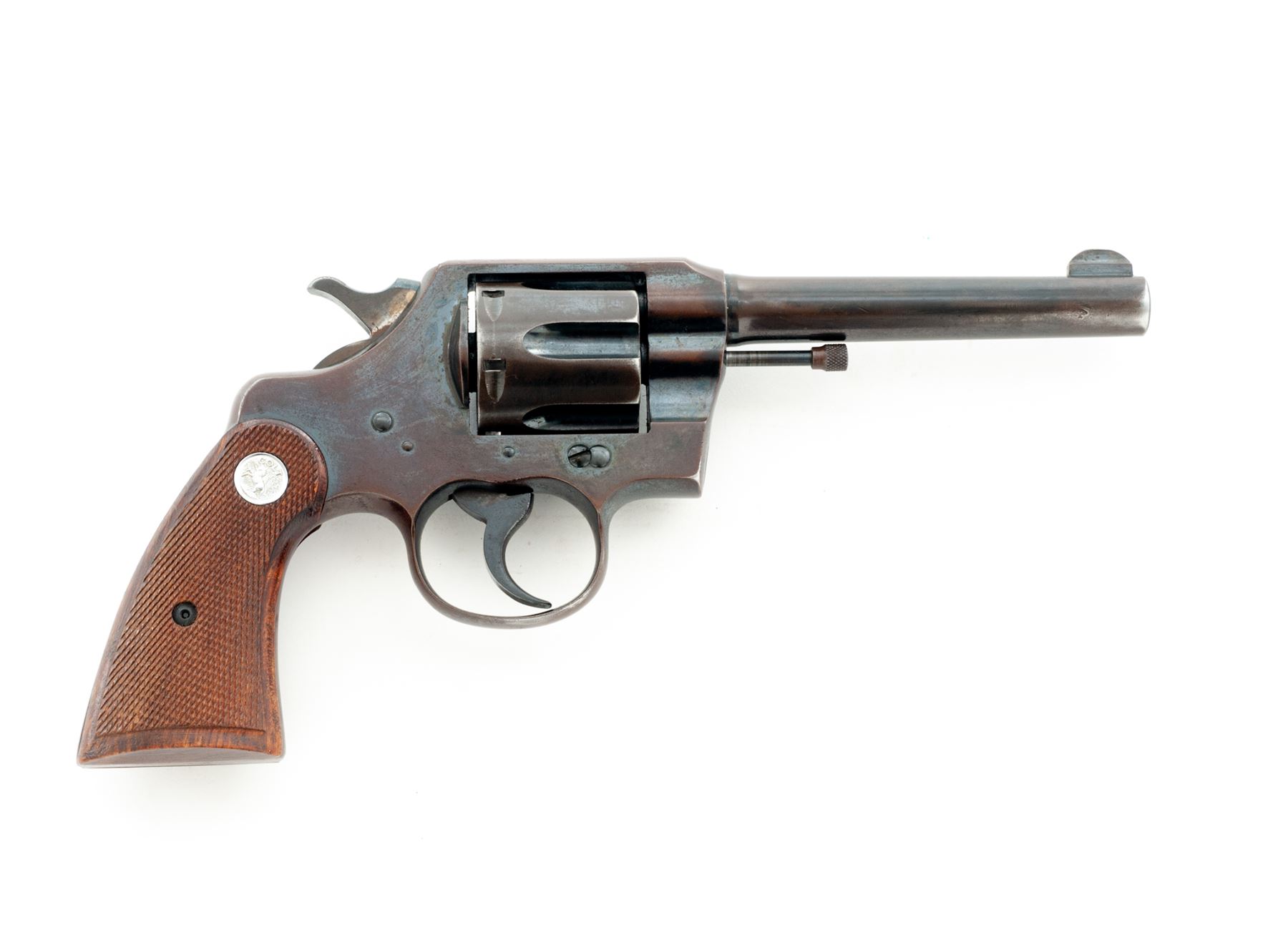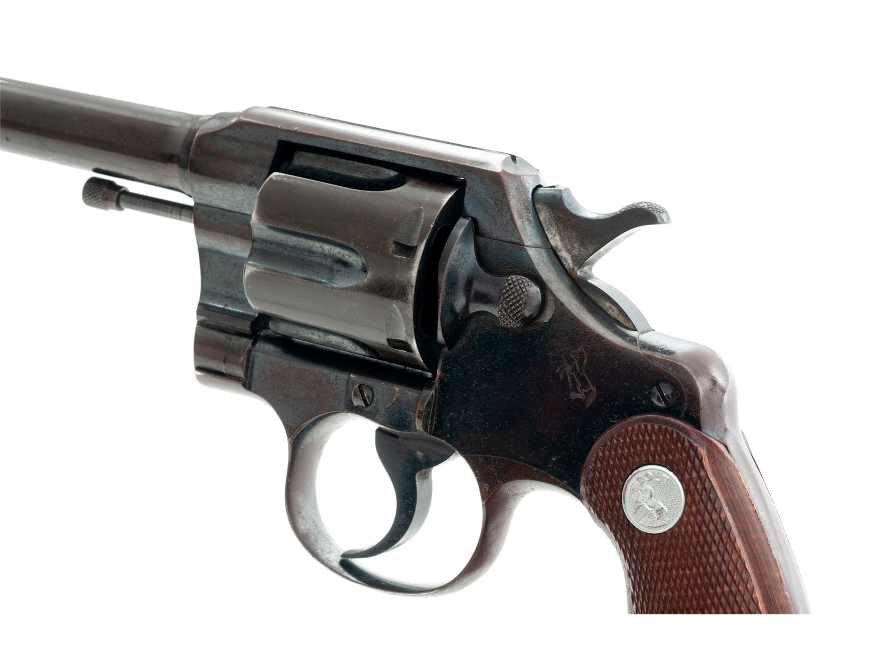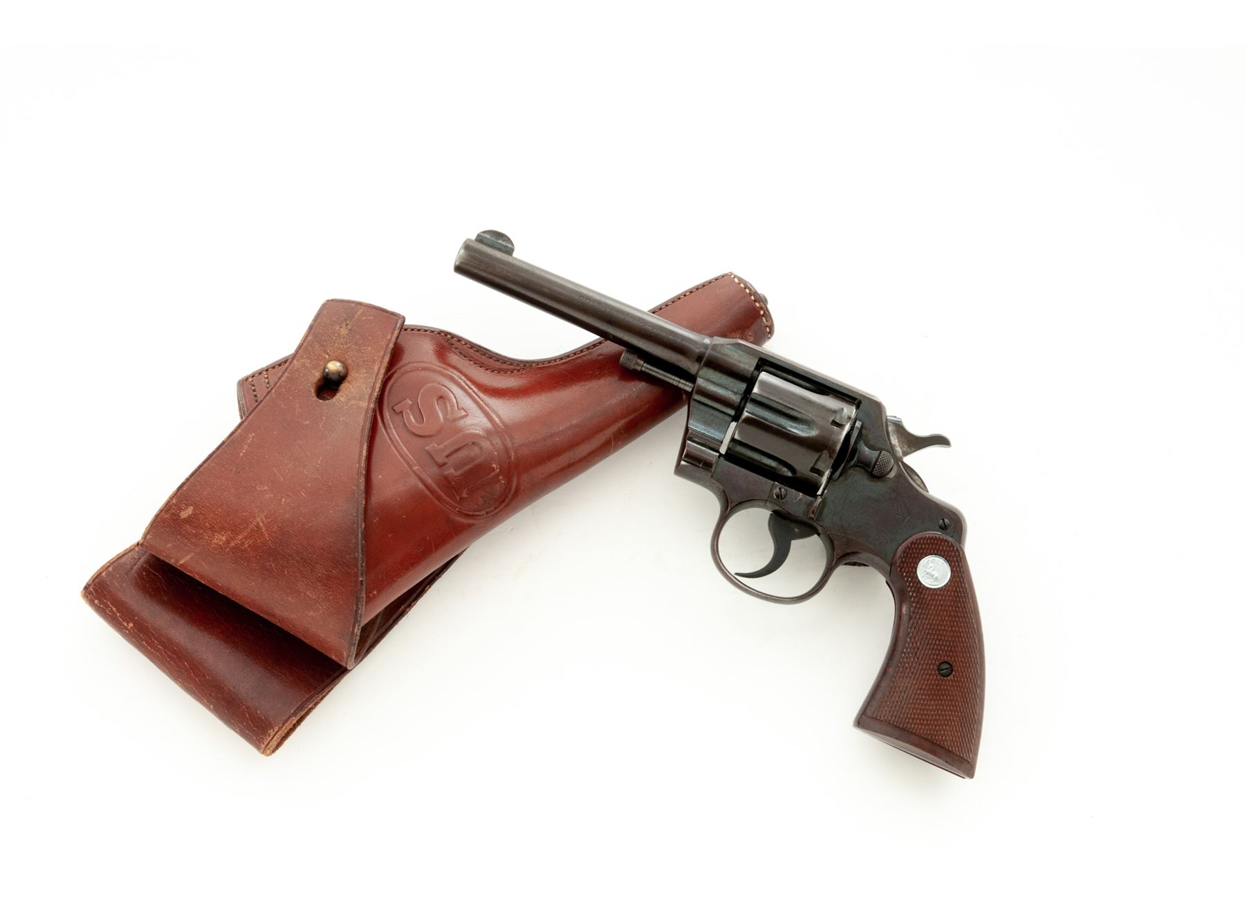 Colt Army Special Double Action Revolver, with 1909 dated U.S. military holster, #404761, .32-20 cal., 5'' barrel, blue finish, later factory checkered walnut grips with bright medallions. Mfg'd 1915. Condition is very good retaining approx. 90% original but moderately toning blue. Bright sides of hammer have darkened. 1960s era grips are excellent. Action is crisp, bore is very good. Holster is excellent with just light wear; end plug and loop are present. Est.: $350-$500. (C&R/PPT)