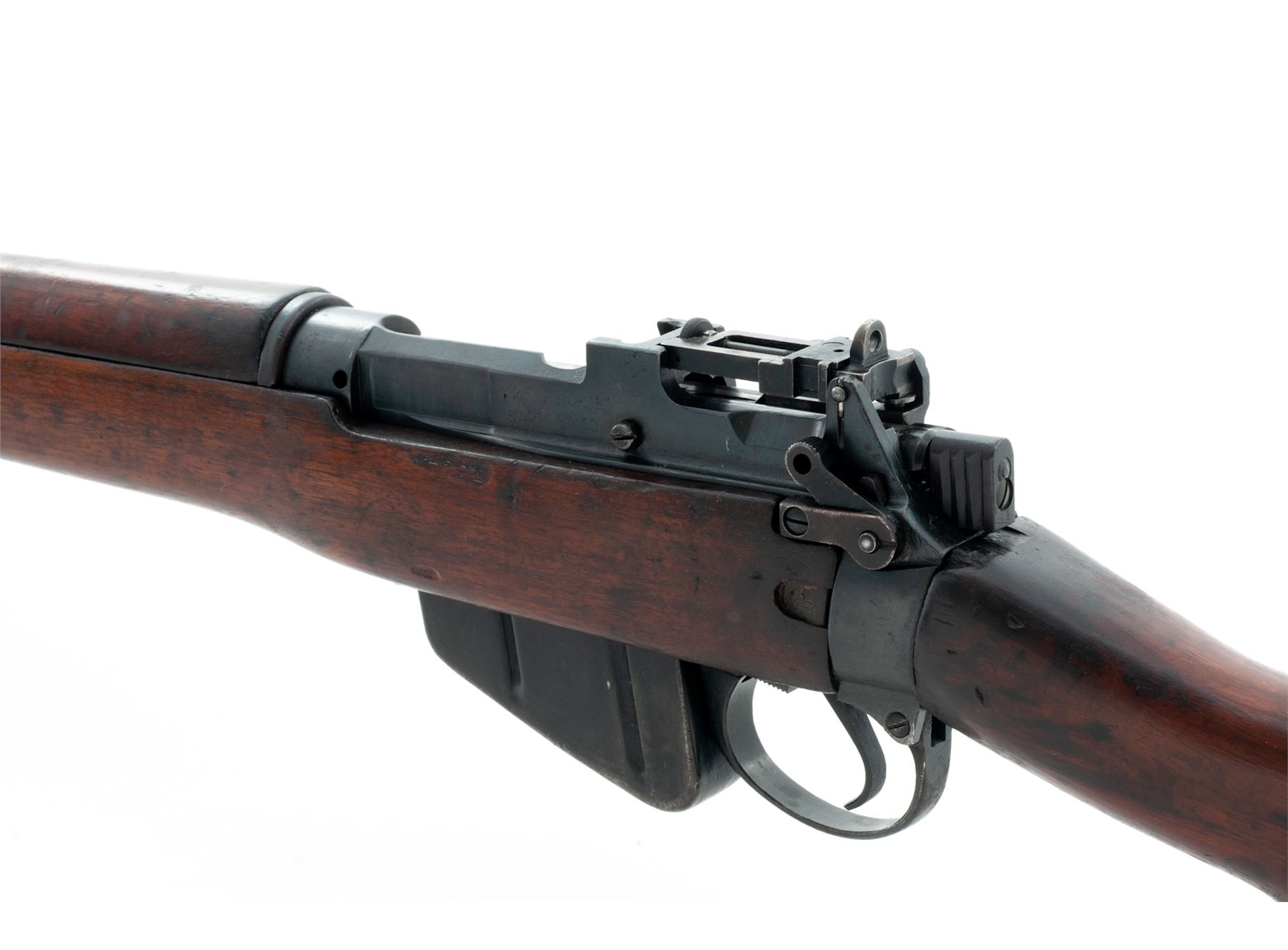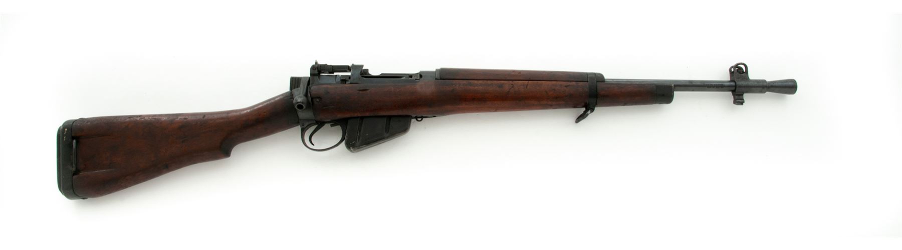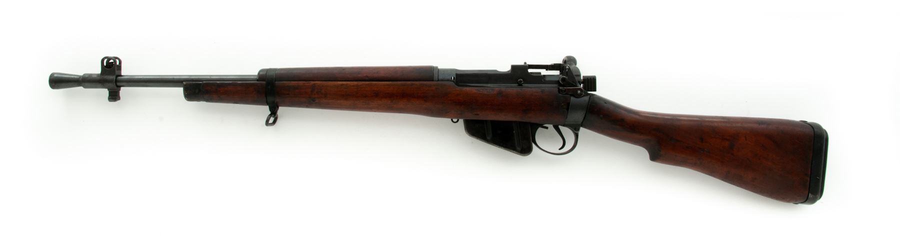 British No. 5 Mk 1 Lee-Enfield Bolt Action Carbine, #H4150, .303 British cal., 20.5'' barrel (including flash hider), blued finish, walnut stock, blade front sight with protective ears and folding adjustable rear sight. Engraved on left side of receiver ''No 5 MK 1 ROF(F) 3/45'' showing this is a ''Jungle Carbine'' mfg'd at the Royal Ordnance Factory, Fazakerley, Liverpool, England. ''M/47C'' stamped on left side of front sight. ''M47A'' stamped on right side of front band. Matching numbers. Metal forend cap, #1 bolt head, and milled 800-yard rear sight are fitted. Condition overall is very good with approx. 80% finish remaining on the metal, with areas of rust on the front sight and magazine. Wood is in very good condition with bruises and handling marks. The finish has deteriorated, especially on right side of buttstock and forend, leaving a blemished appearance. Action is smooth, bore is very good with darkening in the grooves and strong rifling. Import stamped on right side of barrel. Est.: $450-$650. (C&R)