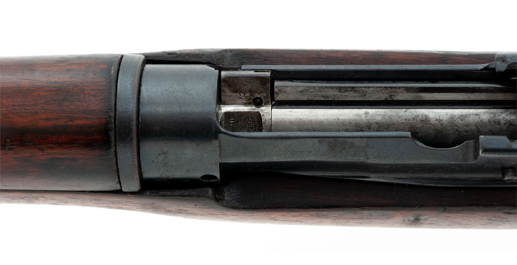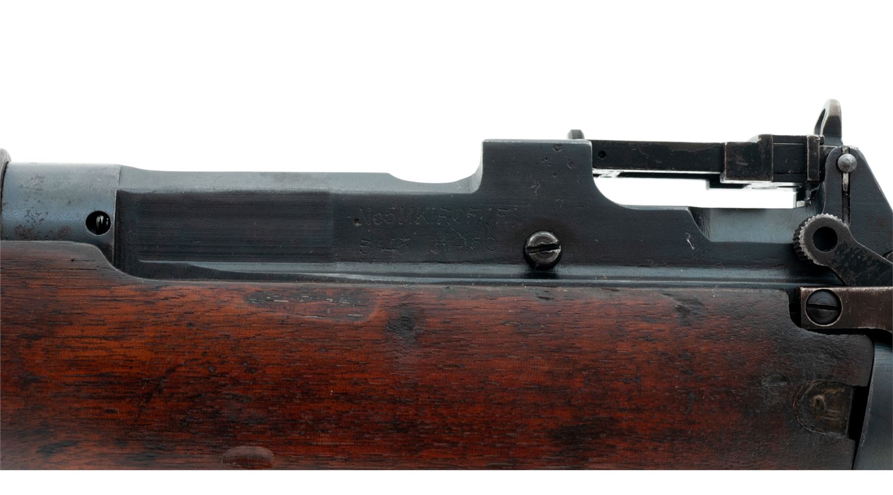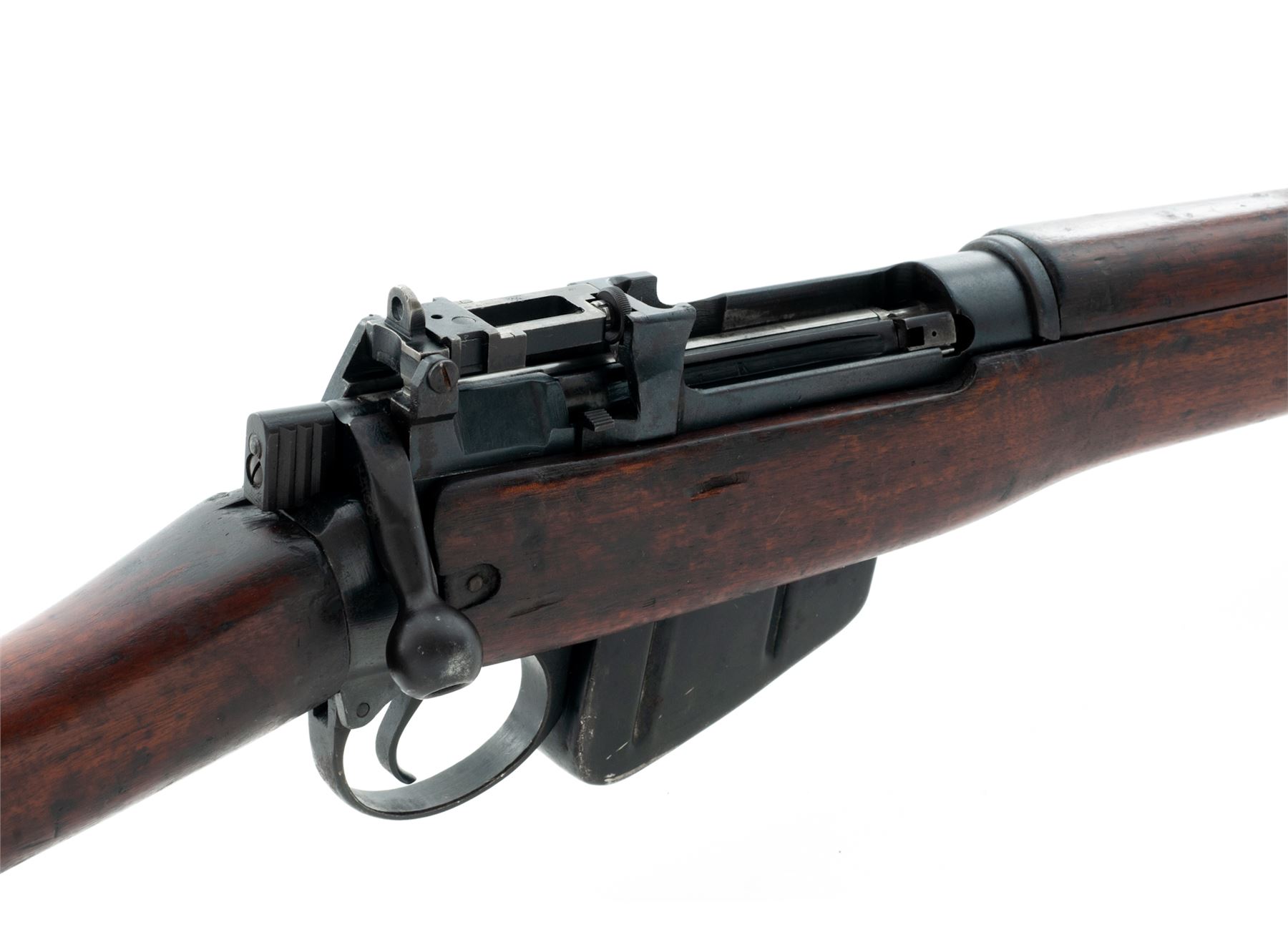 British No. 5 Mk 1 Lee-Enfield Bolt Action Carbine, #H4150, .303 British cal., 20.5'' barrel (including flash hider), blued finish, walnut stock, blade front sight with protective ears and folding adjustable rear sight. Engraved on left side of receiver ''No 5 MK 1 ROF(F) 3/45'' showing this is a ''Jungle Carbine'' mfg'd at the Royal Ordnance Factory, Fazakerley, Liverpool, England. ''M/47C'' stamped on left side of front sight. ''M47A'' stamped on right side of front band. Matching numbers. Metal forend cap, #1 bolt head, and milled 800-yard rear sight are fitted. Condition overall is very good with approx. 80% finish remaining on the metal, with areas of rust on the front sight and magazine. Wood is in very good condition with bruises and handling marks. The finish has deteriorated, especially on right side of buttstock and forend, leaving a blemished appearance. Action is smooth, bore is very good with darkening in the grooves and strong rifling. Import stamped on right side of barrel. Est.: $450-$650. (C&R)