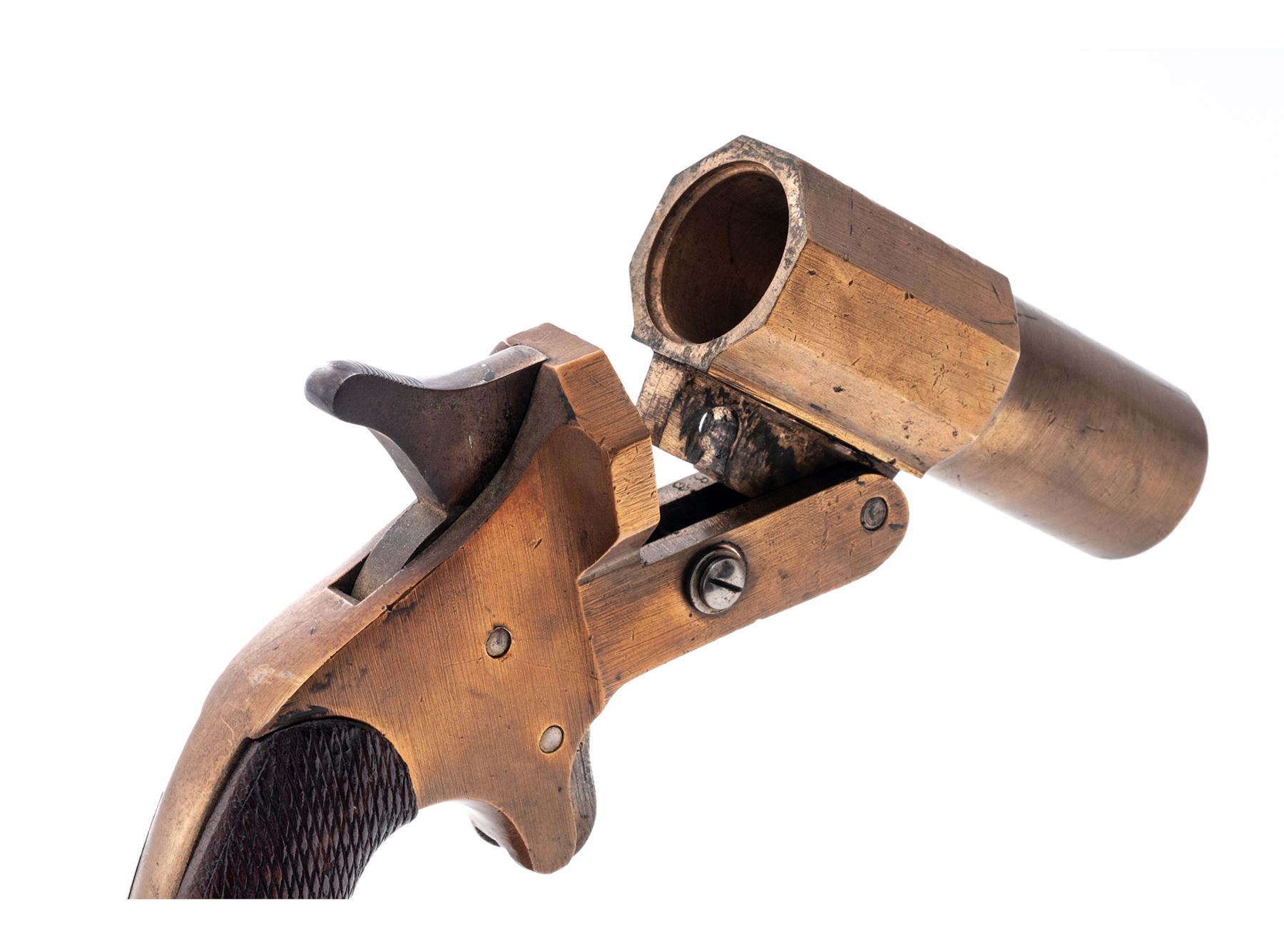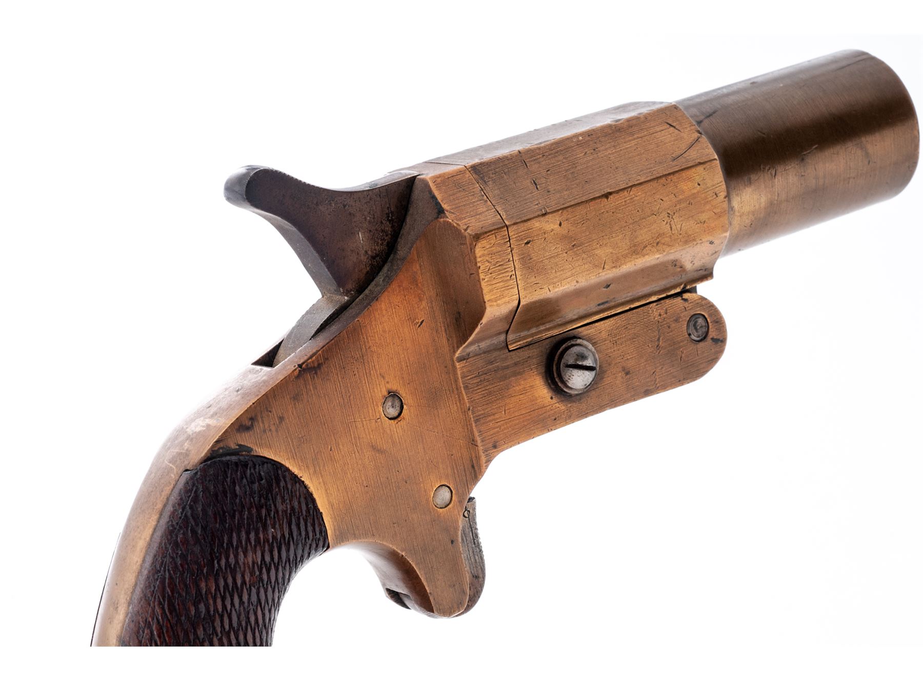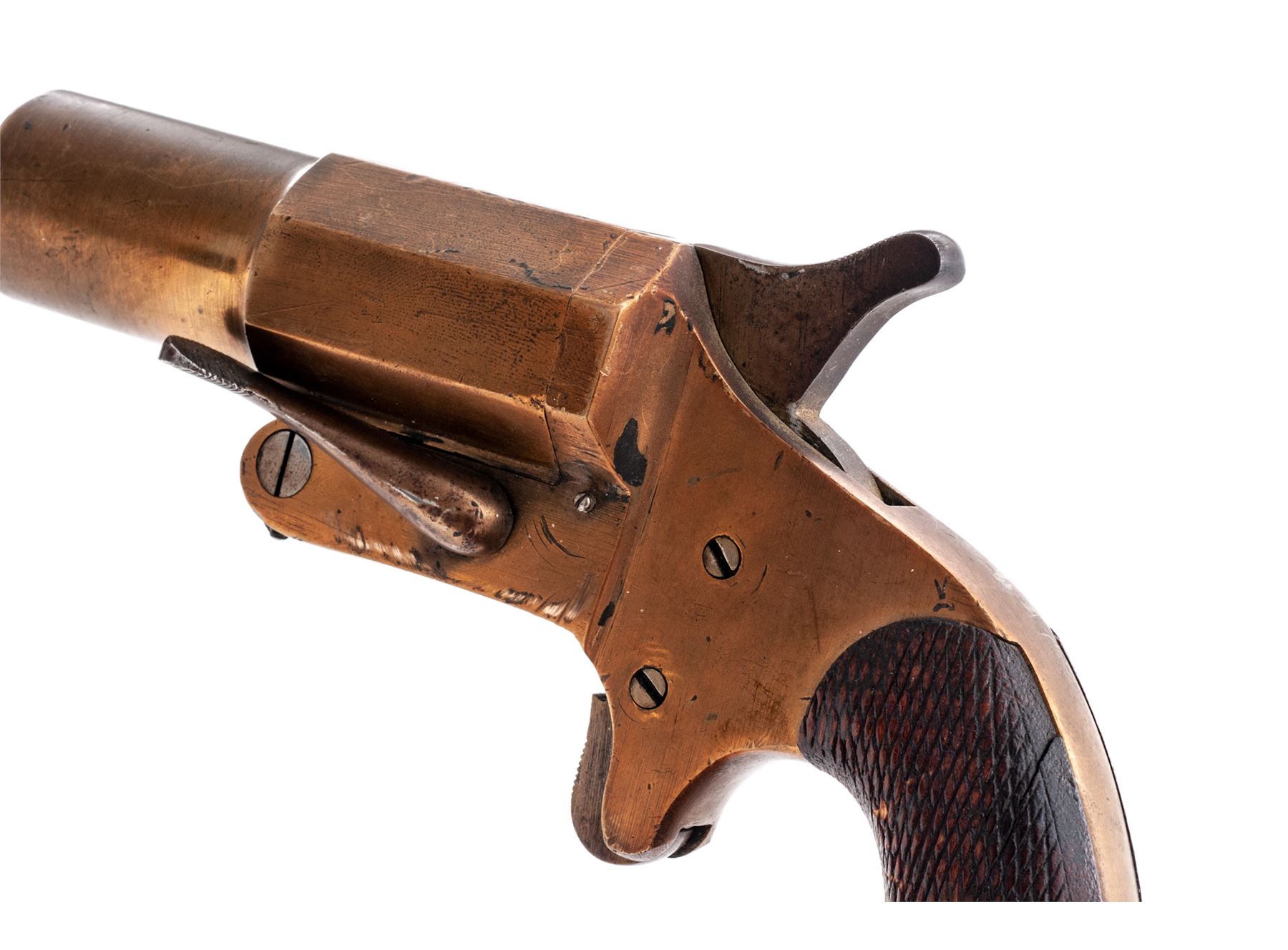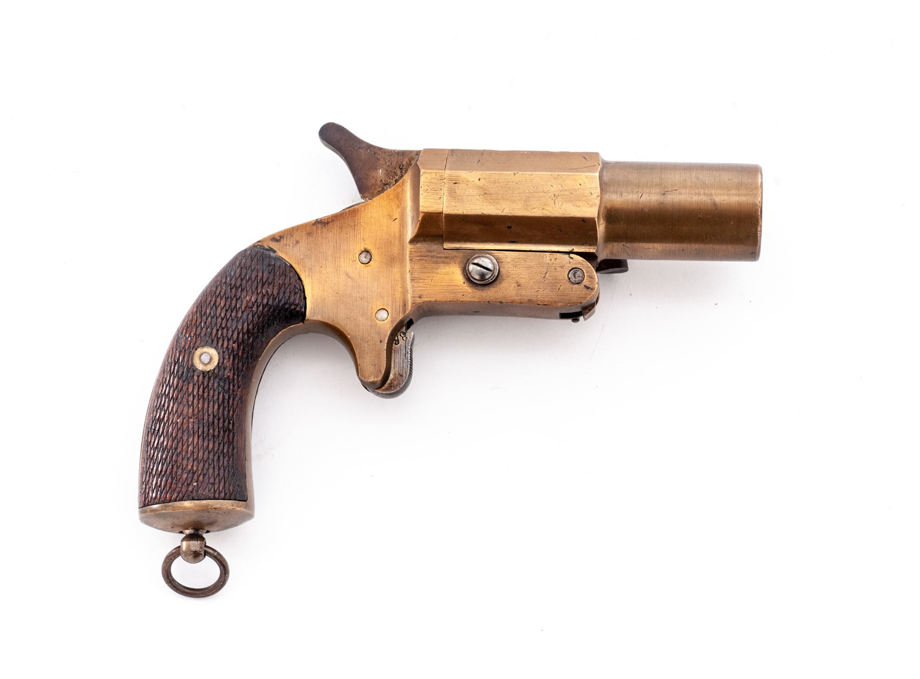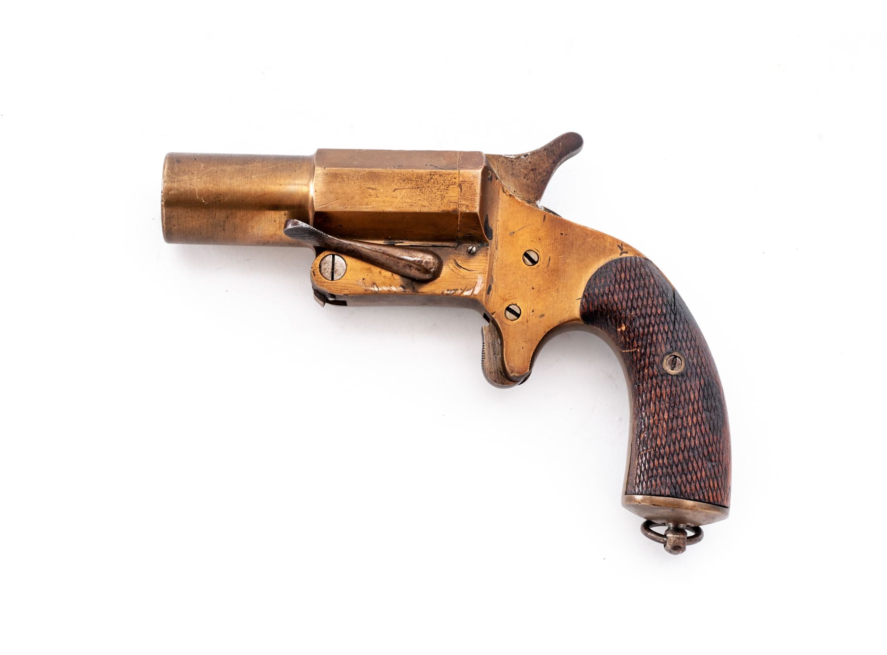 WWI French Model 1917 Flare Pistol, #868, 25mm, 4'' brass barrel, brass frame, checkered walnut grips, side-lever, with lanyard ring. Trigger is numbered to match the frame. Left side of barrel and rear portion of frame are stamped with a ''V''. Condition overall is very good. Brass with intermittent moderate impressions and toning. Left grip with a hairline crack above the retaining screw, otherwise both show moderate age and wear consistent with the metal surfaces. Hammer and trigger operate smoothly; very good bore. Est.: $100-$200.