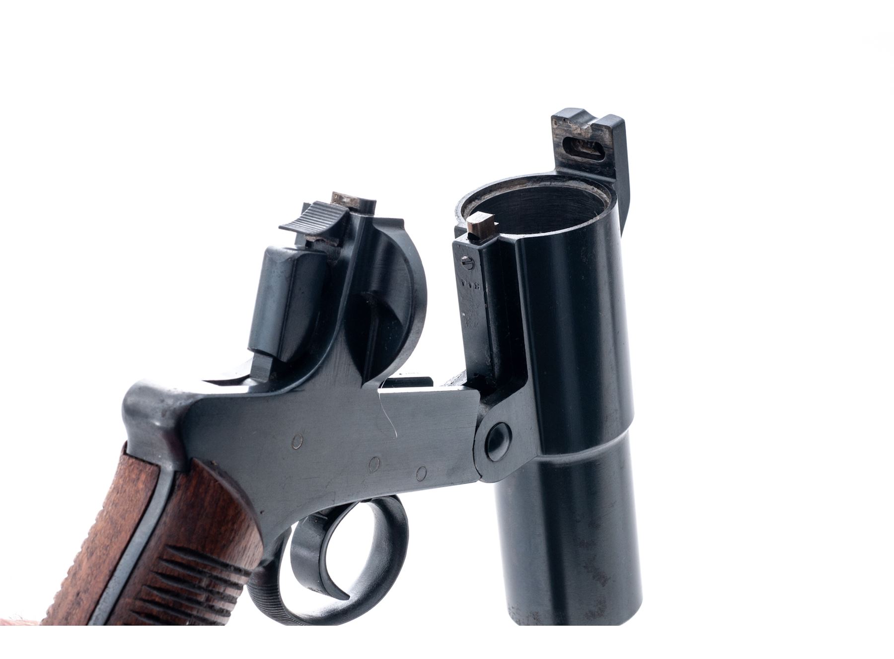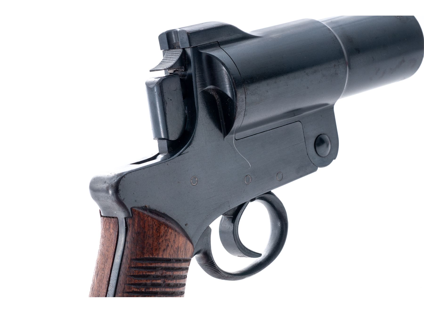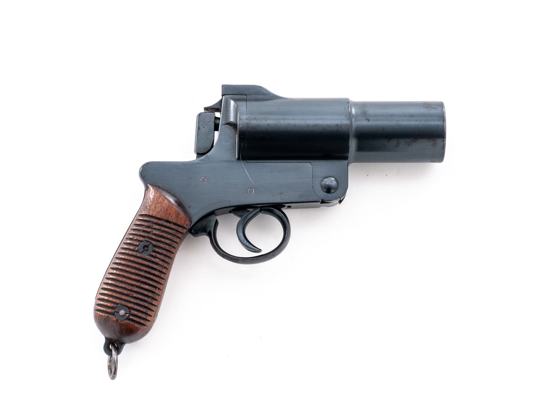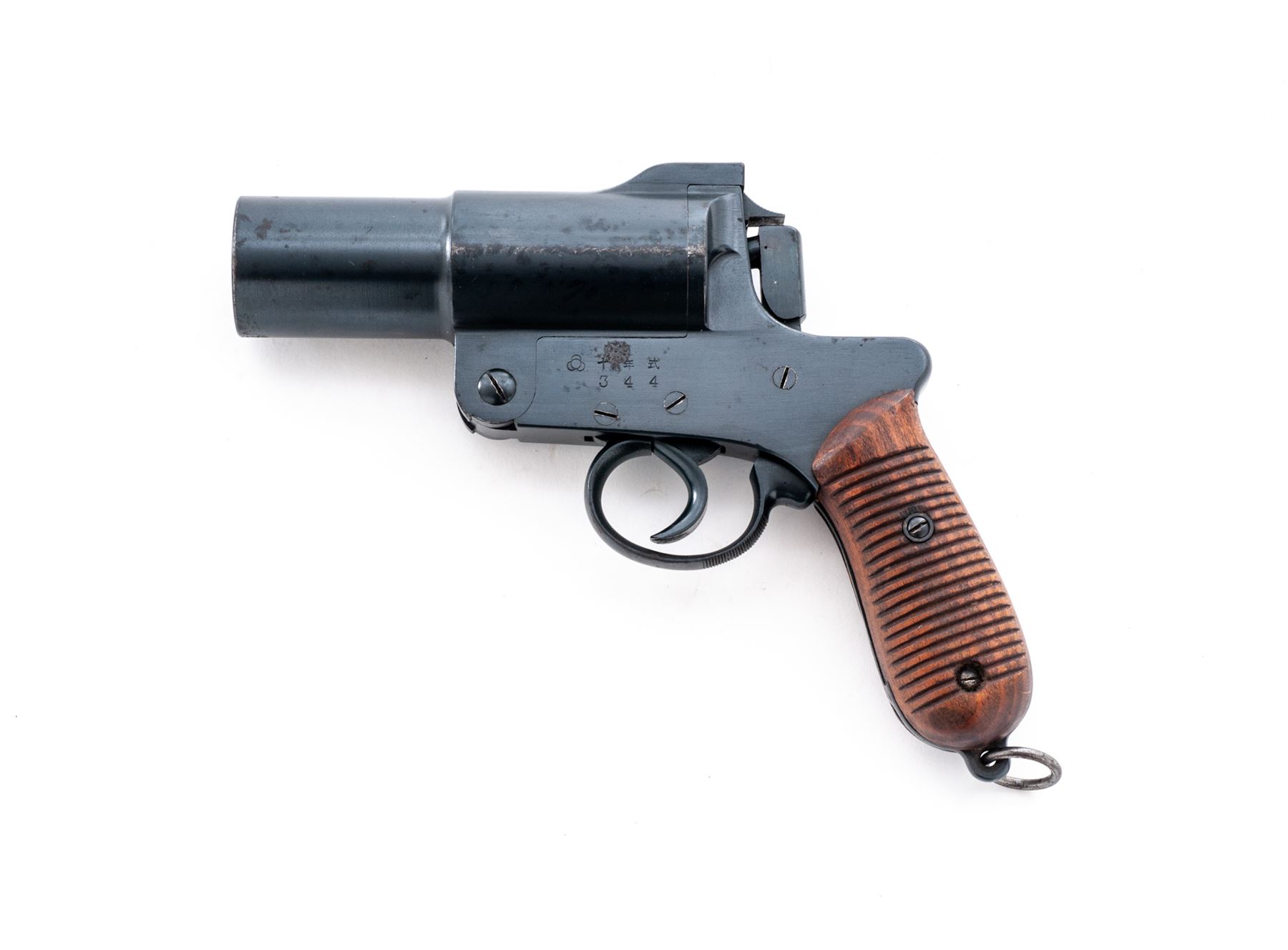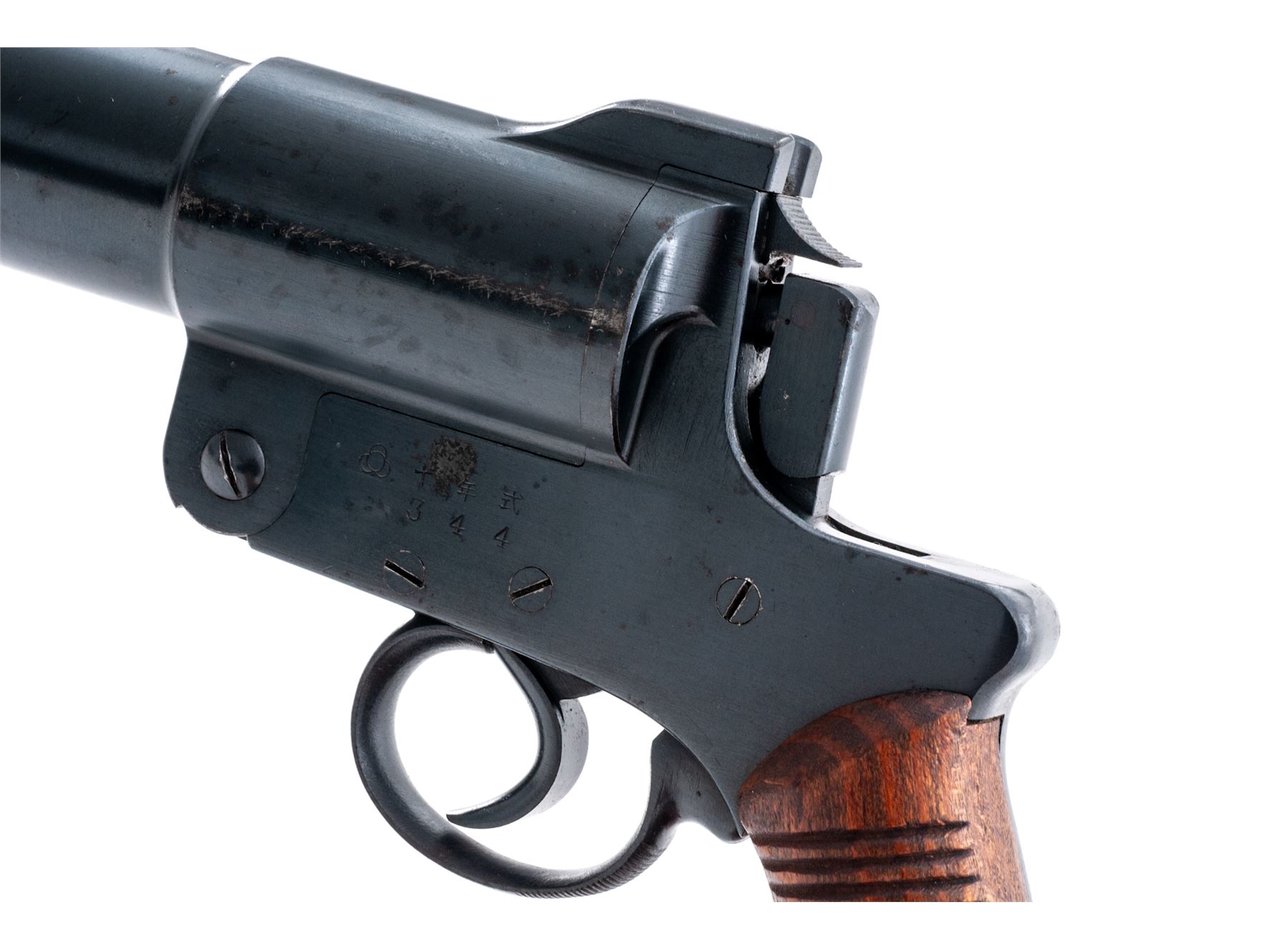 WWII Japanese Type 10 Flare Gun, by Kokura Arsenal, #344, 35mm, 4.75'' barrel, blue finish, grooved hardwood grips, with lanyard ring. Condition is very good, retaining approx. 95% blue finish. Left side of frame with a dime-sized spot of pitting, as well as a few small spots near the muzzle. Left side of barrel with a line of finish loss and scratches that could be from a holster. Grips with a few spots of moderate wear and are nice for their age. Action operates smoothly; bore with some spots of fine erosion to one side and is otherwise very clean. Est.: $300-$450.