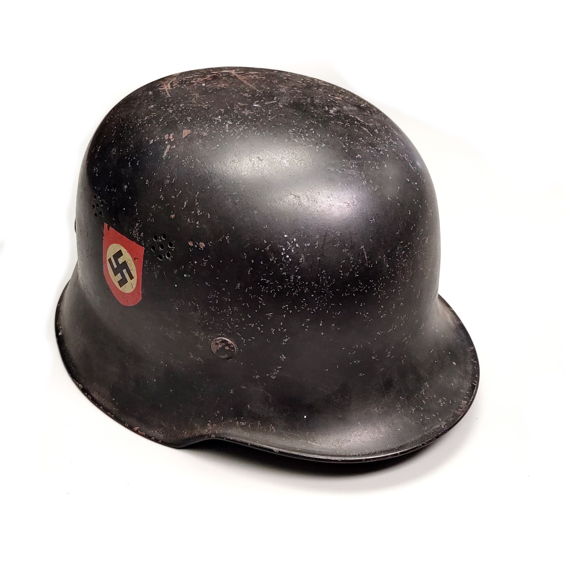 WWII German Police Helmet, with chin strap and liner, silver and black German Police decal on one side and black/white/red Party shield on the opposite side. Condition overall is good with approx. 75%-80% finish remaining; general specs and spots of finish loss have lightly rusted. Approx. 95% Party shield decal remains; police decal shows a little more wear with approx. 85%-90% remaining finish and some flaking and cracking. Chin strap is present but broken at one end. Liner shows moderate deterioration and wear, drawstring is missing. Est.: $200-$300.