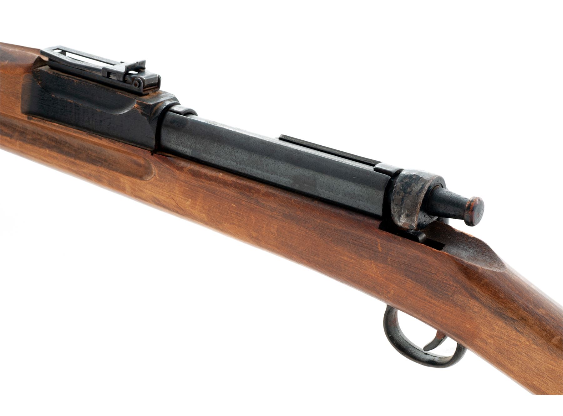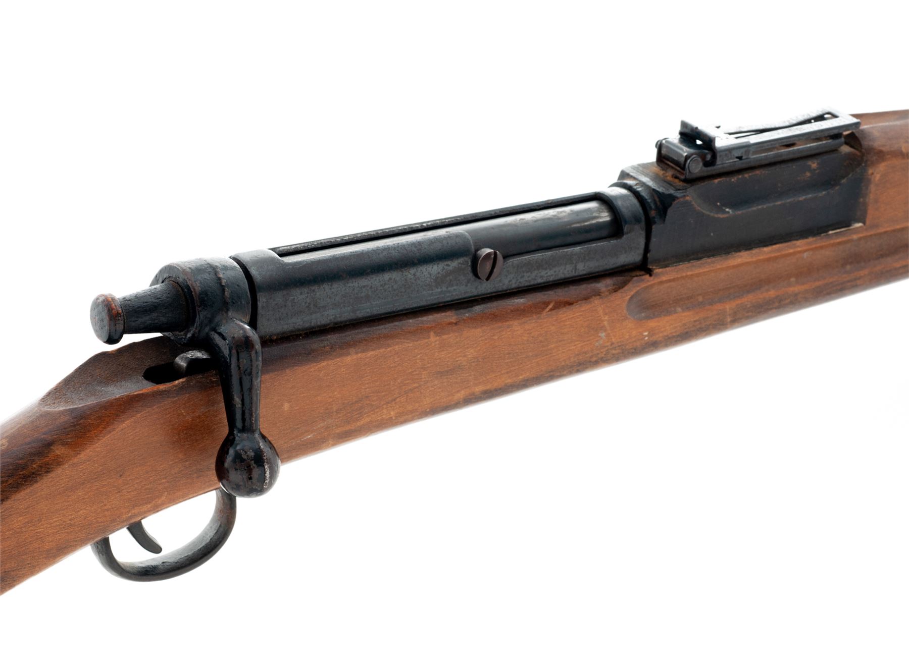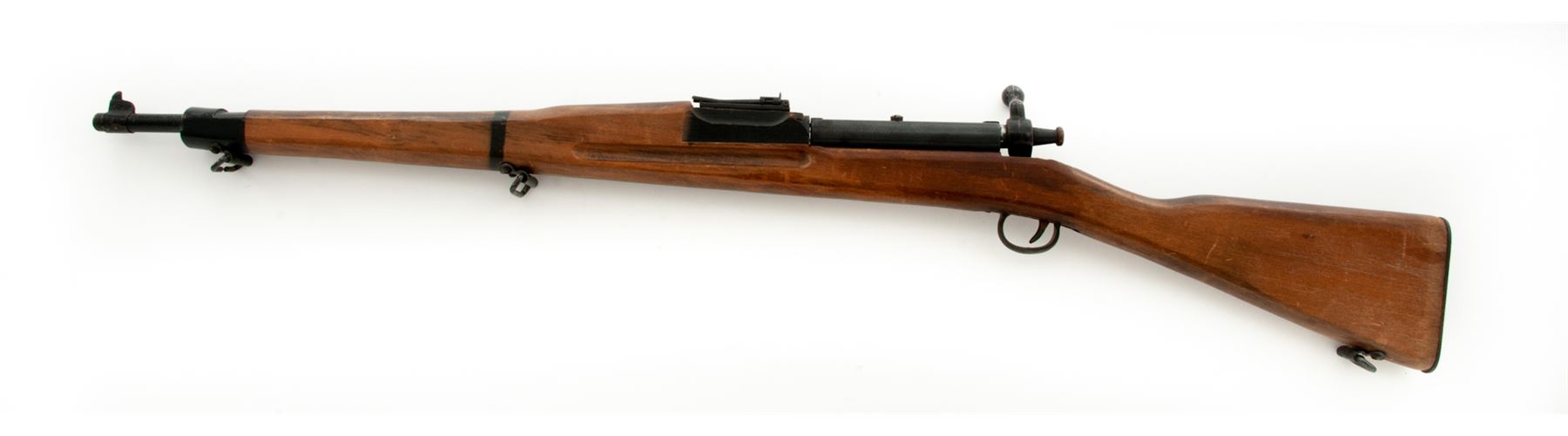 U.S. Parris Dunn Dummy Training Rifle, NVSN, blued/painted finish, hardwood stock, blade font sight and adjustable folding leaf rear sight. Marked on buttplate ''MADE IN U.S.A. PARRIS DUNN CORP. CLARINDA IOWA''. Partial decal remaining on right side of buttstock. Action functions as designed, with wooden barrel and case bolt handle. Front and rear barrel bands are painted replicas. Condition overall is very good with approx. 70% finish remaining on the metal parts, with flaking, fading, and some light rust present. Rear sight is bent. Wood is very good with light fading, scratches and darkening. Est.: $100-$200. (No FFL Required)