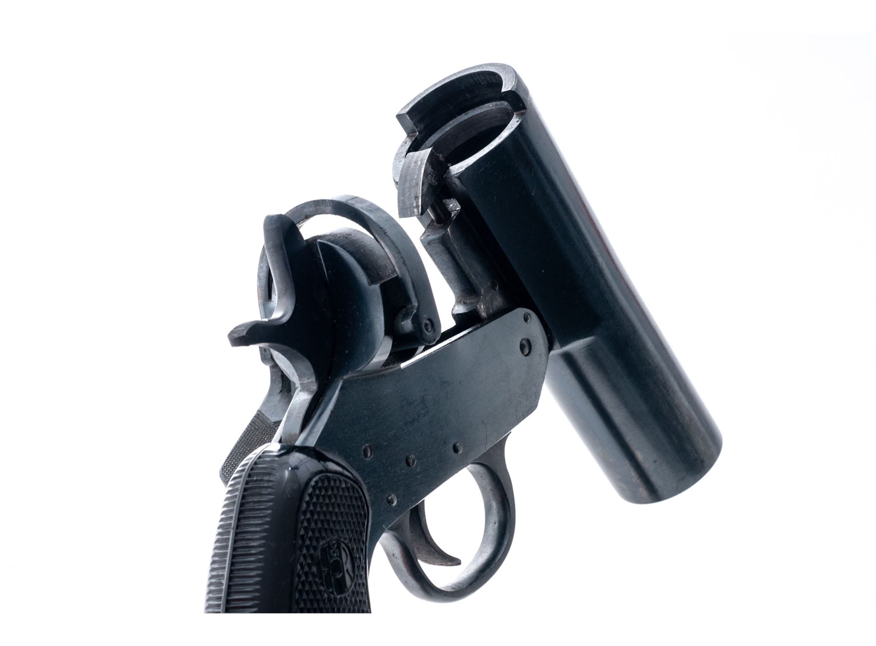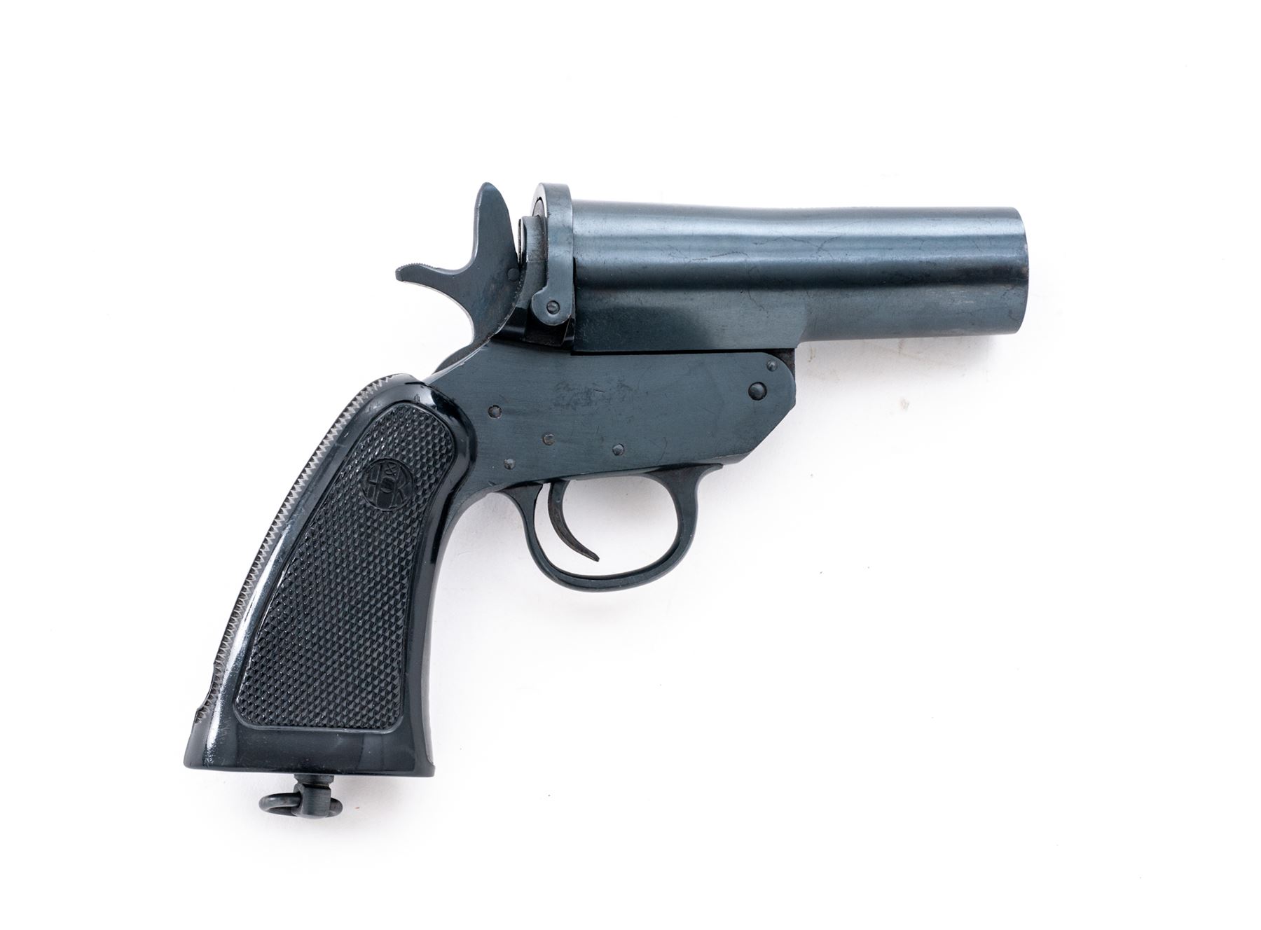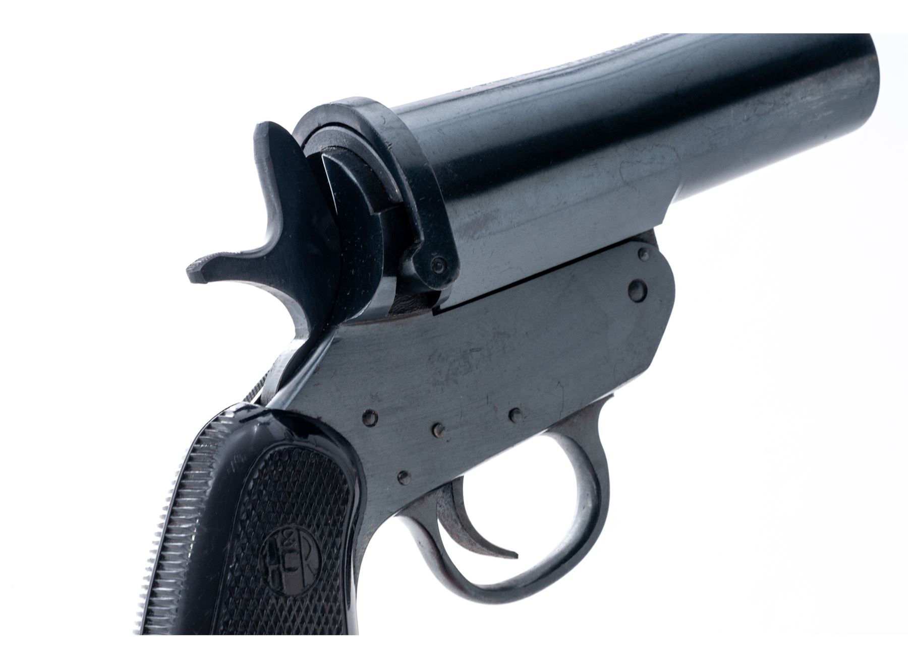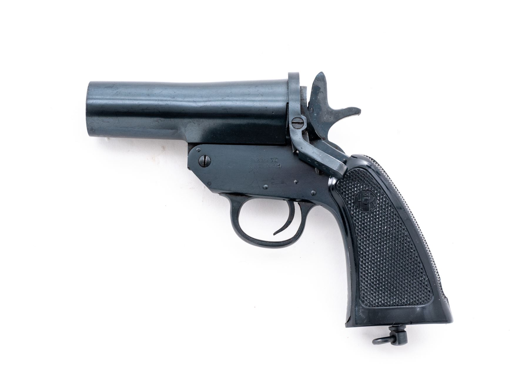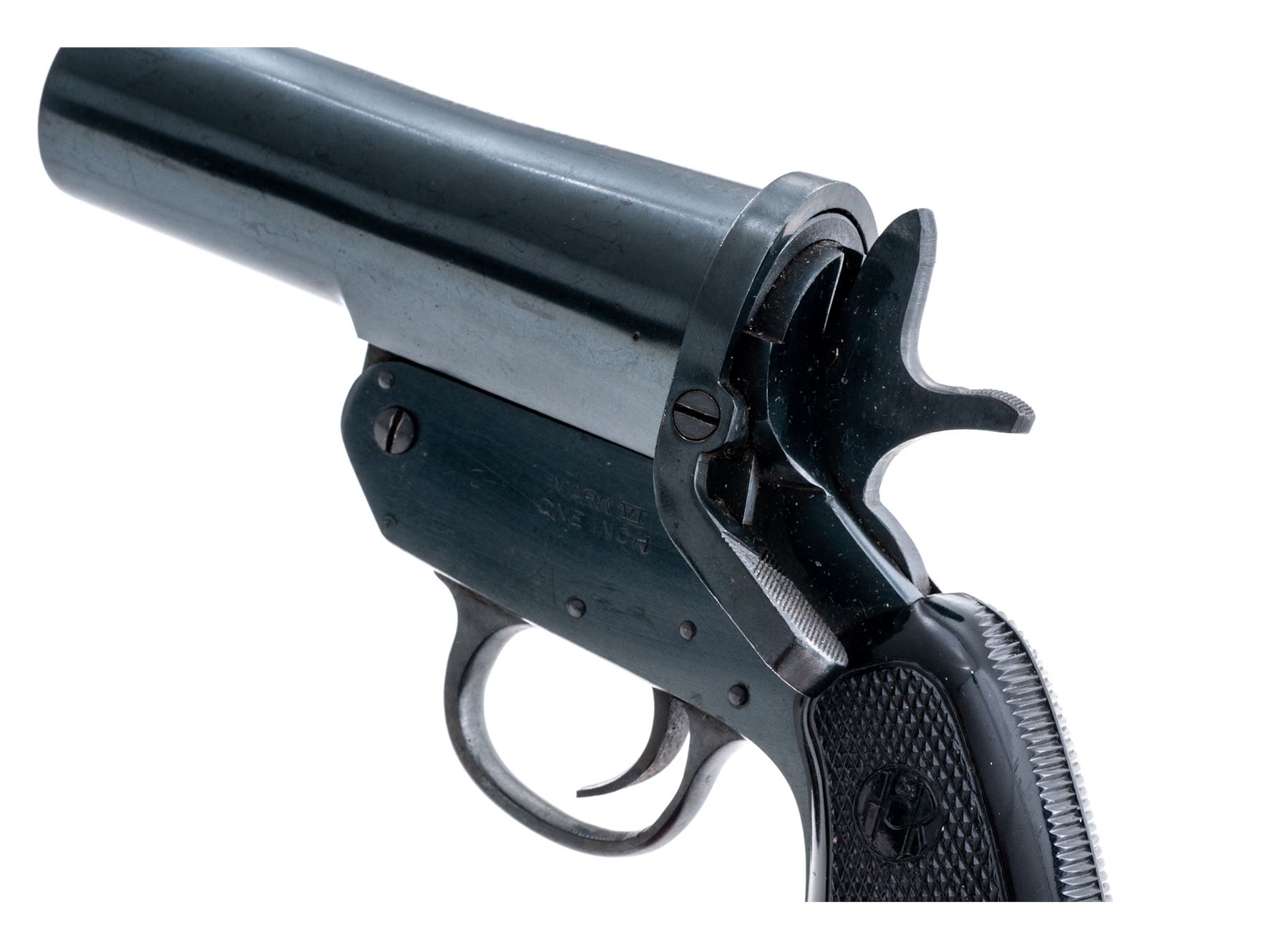 Harrington & Richardson Mark VI Flare Pistol, #1535, 1'' bore, 4.5'' barrel, blue finish, checkered black plastic H&R grips, with lanyard ring. Barrel, frame, and lever with matching numbers. Top of barrel marked ''HARRINGTON & RICHARDSON ARMS. CO./WORCESTER, MASS. U.S.A.''; left side of the frame ''MARK VI/ONE INCH''. In fine overall condition, retaining approx. 98% blue finish. Metal with a few tiny impressions and specks of freckling, factory lettering is clear and defined. Grips show normal small scratches and handling marks to the flat borders, checkering is mostly sharp, no chips or cracks to either grip. Good action, very good clean bore. Est.: $200-$300.