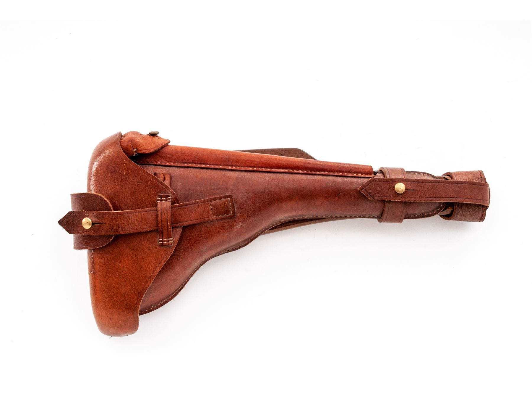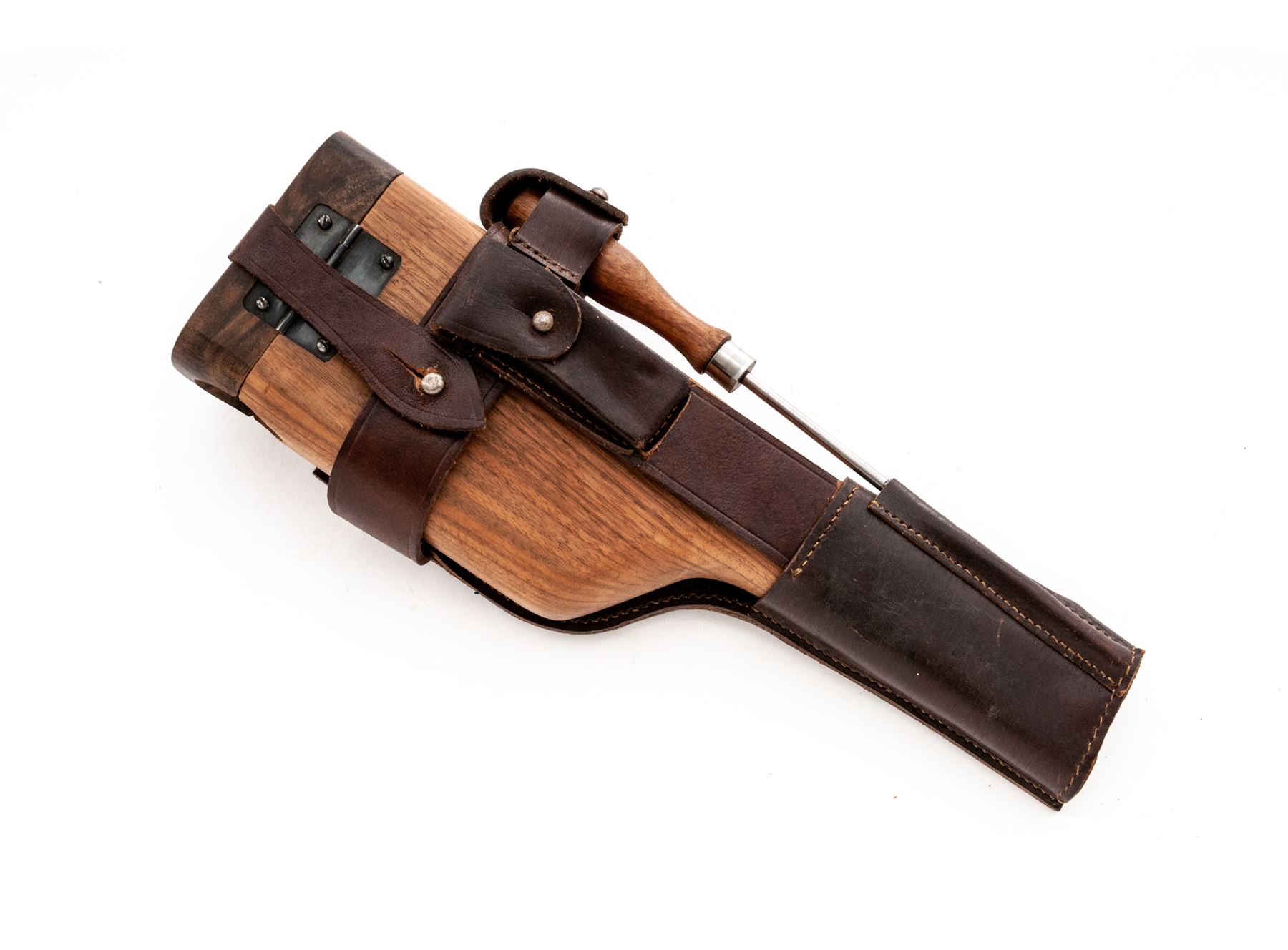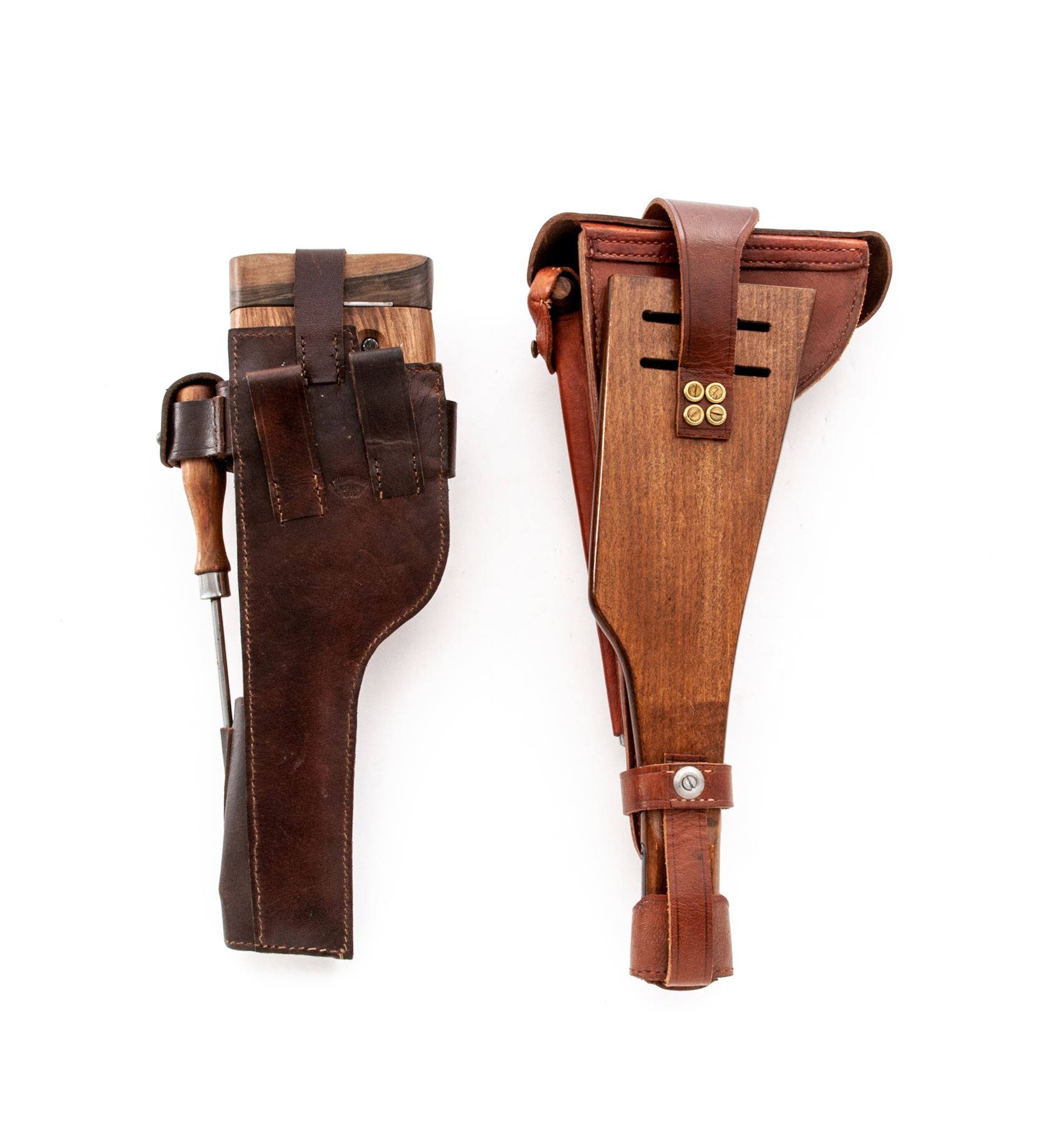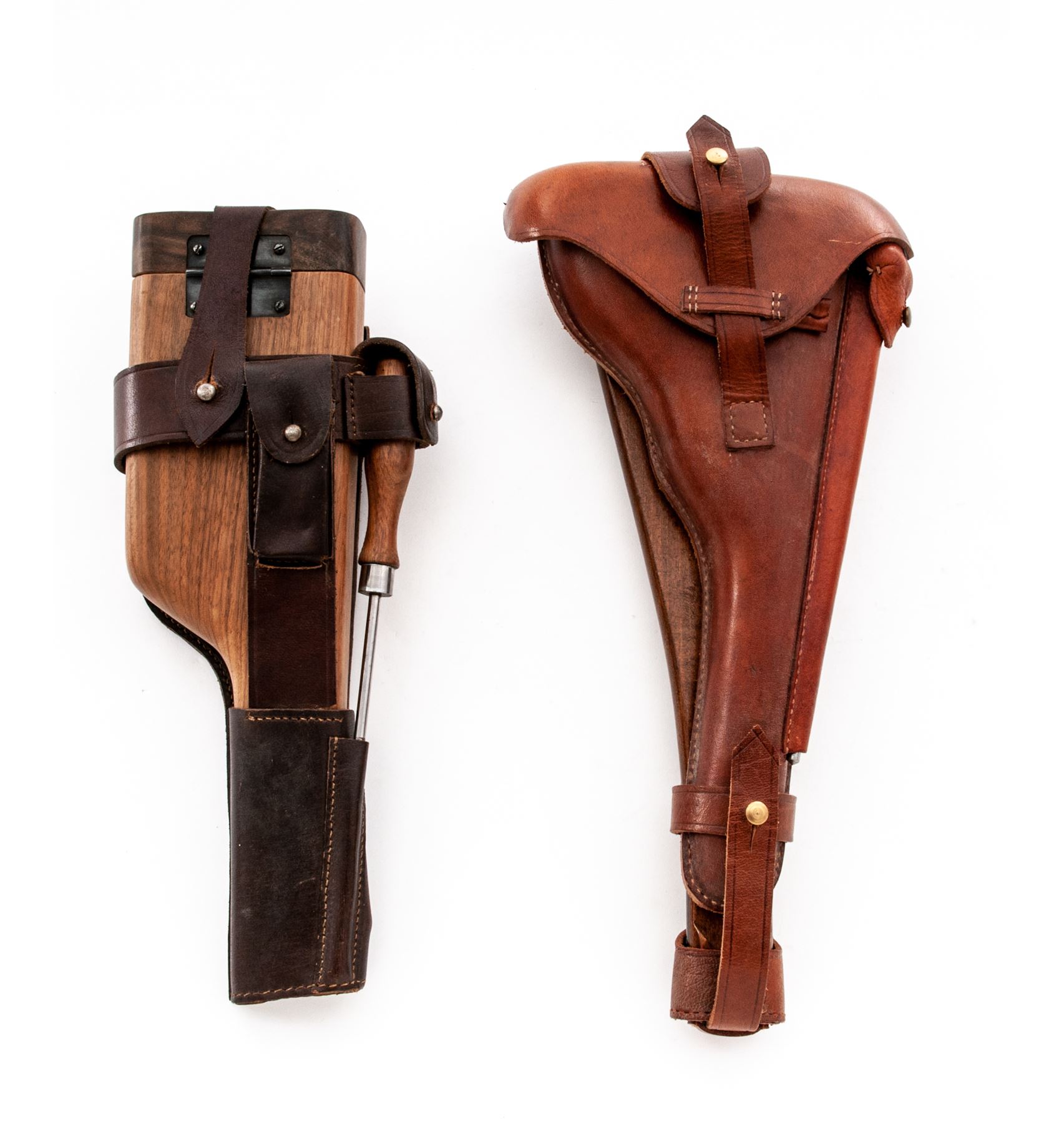 Lot of Two (2) Reproduction Holster/Shoulder Stock Rigs: (1) Artillery Luger, tan leather with wooden paddle stock, shoulder strap, barrel handled cleaning rod, and loading tool. No magazine pouch. Excellent condition with minor handling marks. (2) C-96 Mauser Broomhandle, dark brown leather with wooden shoulder stock that encloses pistol for storage. Includes wooden handled cleaning rod. Excellent condition with a couple of handling marks. Est.: $200-$300/lot.