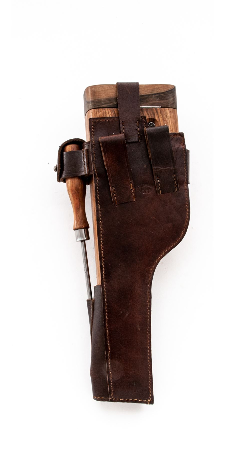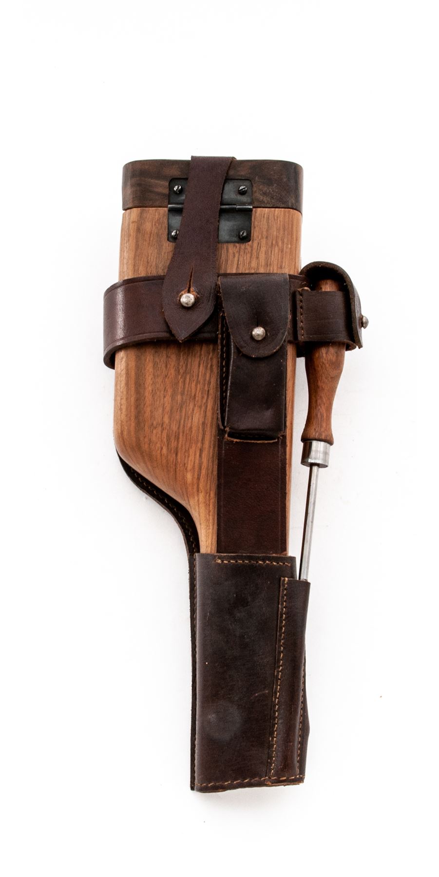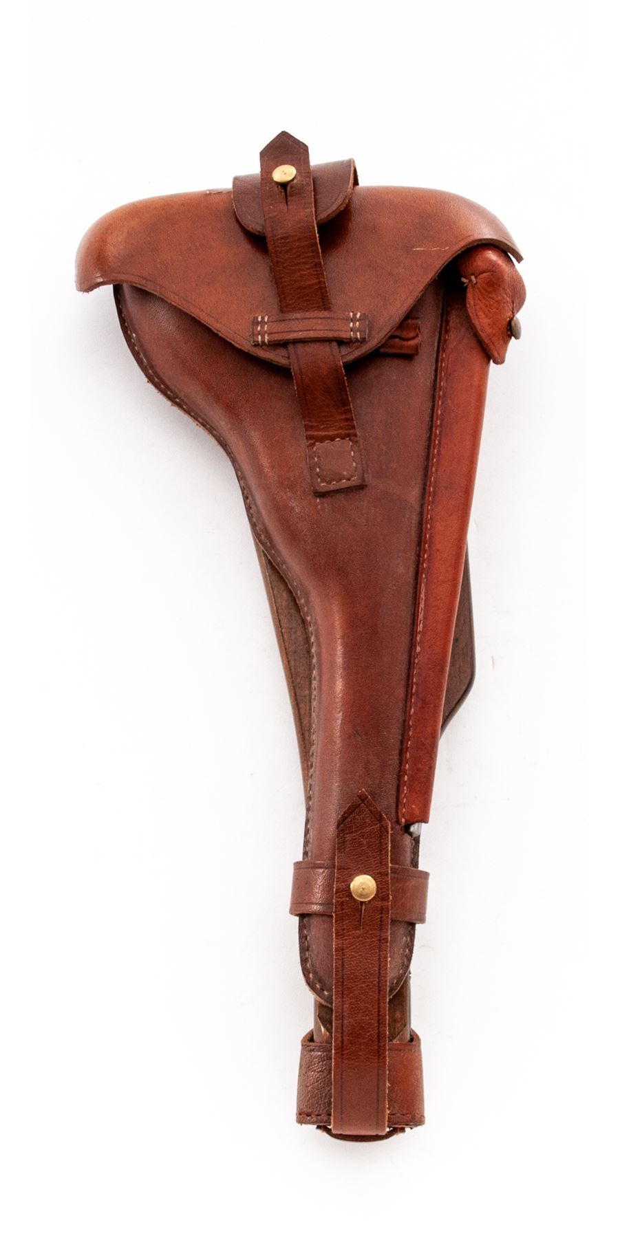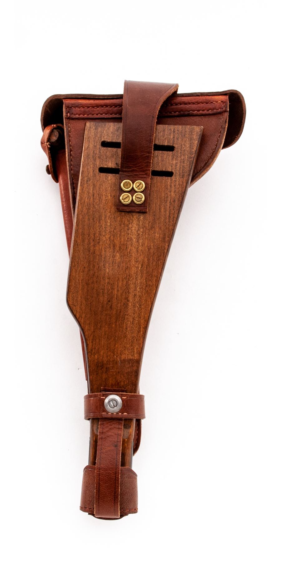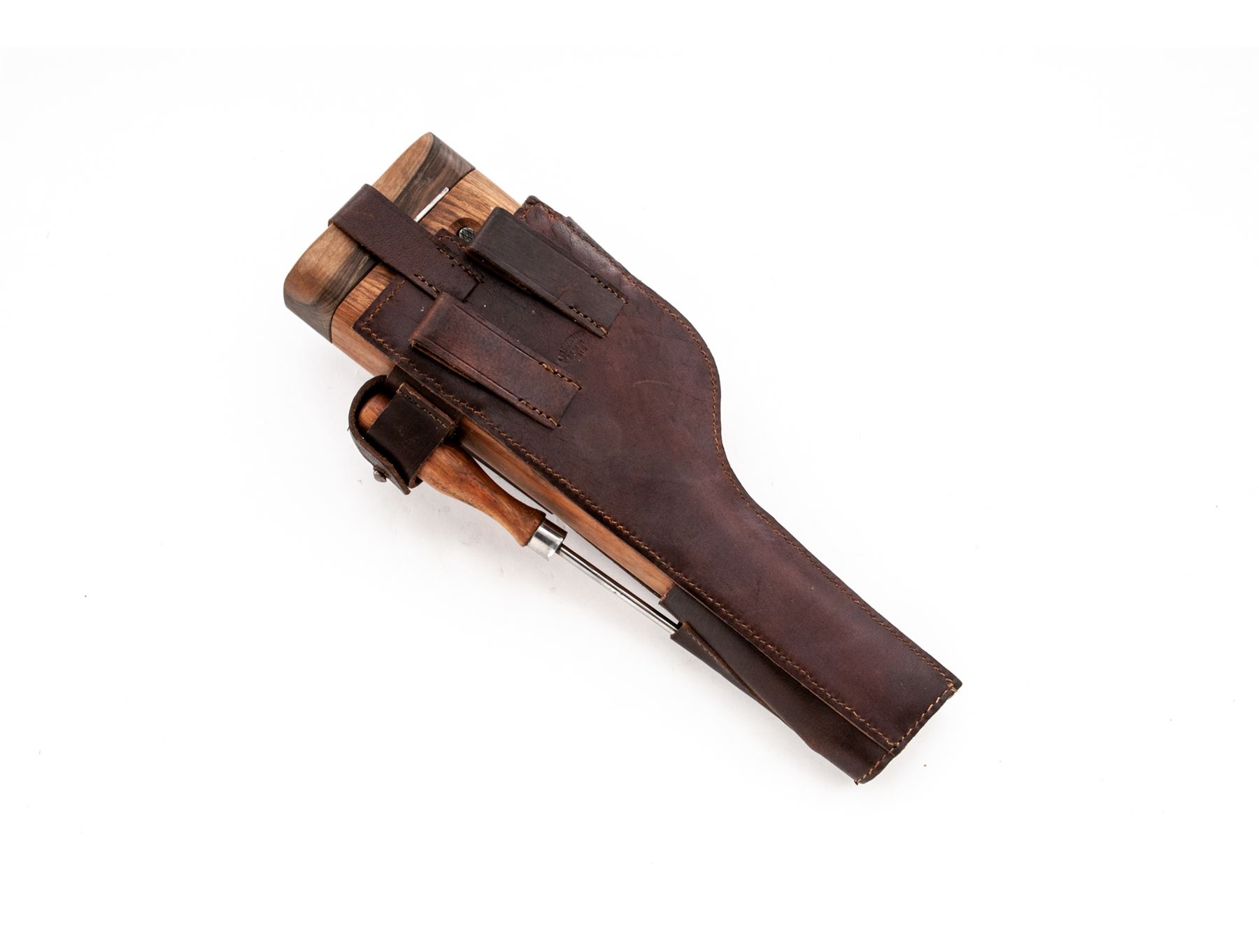 Lot of Two (2) Reproduction Holster/Shoulder Stock Rigs: (1) Artillery Luger, tan leather with wooden paddle stock, shoulder strap, barrel handled cleaning rod, and loading tool. No magazine pouch. Excellent condition with minor handling marks. (2) C-96 Mauser Broomhandle, dark brown leather with wooden shoulder stock that encloses pistol for storage. Includes wooden handled cleaning rod. Excellent condition with a couple of handling marks. Est.: $200-$300/lot.