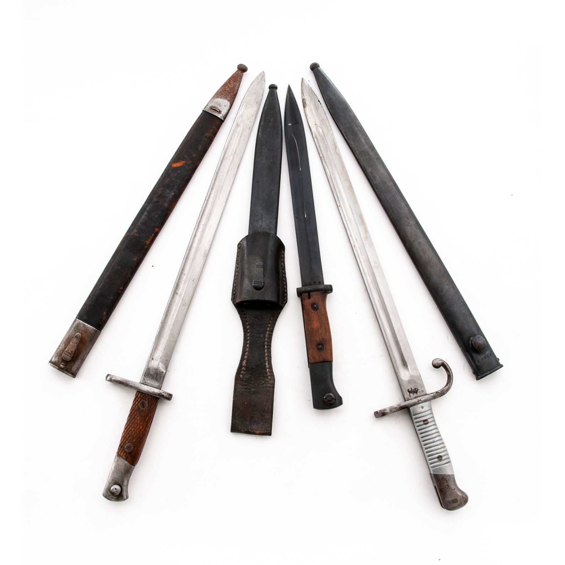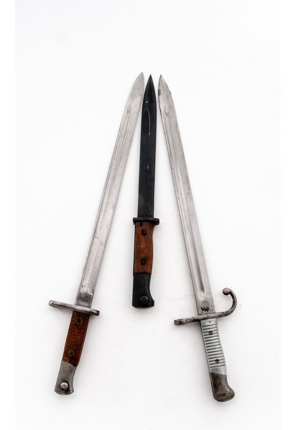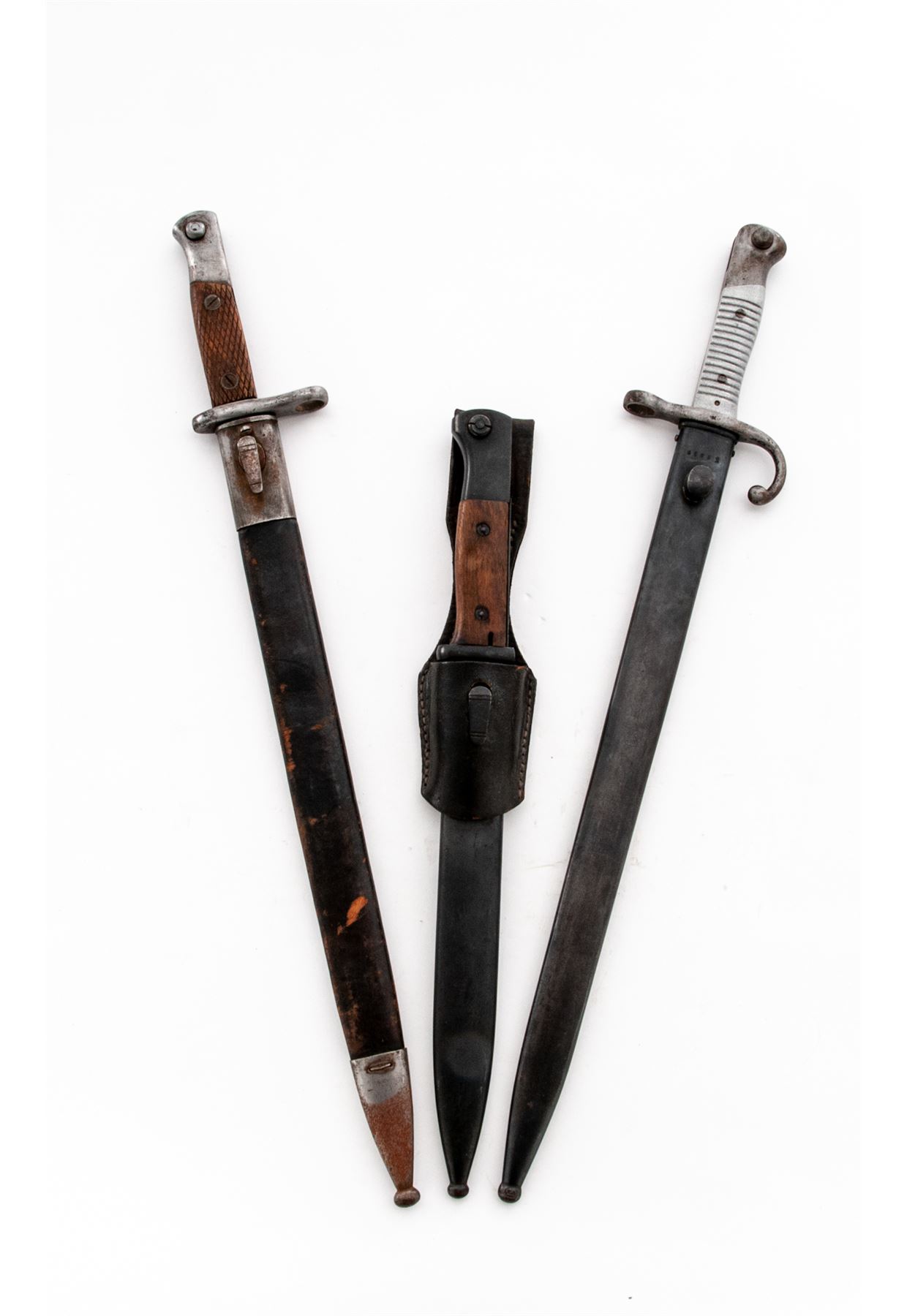 Lot of Three (3) Bayonets: (1) German 84/98, wooden handles, with scabbard and unmarked leather frog. ''S/177G'' on blade ricasso, matching number on scabbard. Very good condition with unsharpened blade; scabbard with light patina and frog with dried leather. (2) Argentine M1891 Mauser bayonet and scabbard, ''WEYERSBERG KIRSCHBAUM &CO SOLINGEN''on ricasso, aluminum grips, National crest ground off, mismatched number on scabbard. Condition is very good with bayonet and scabbard showing areas of rust and patina. (3) Spanish M1913 Bayonet and Scabbard, faint ''ARTILLERIA FBA NACIONALTOLEDO'' on ricasso. Condition is very good with sharpened blade and some wear. Scabbard with flaking and aging to leather and rust on metal. Est.: $200-$300/lot.