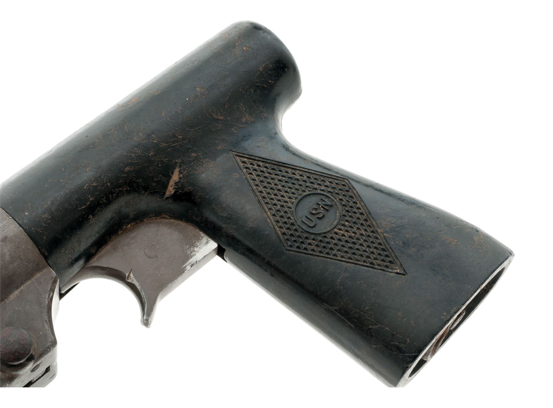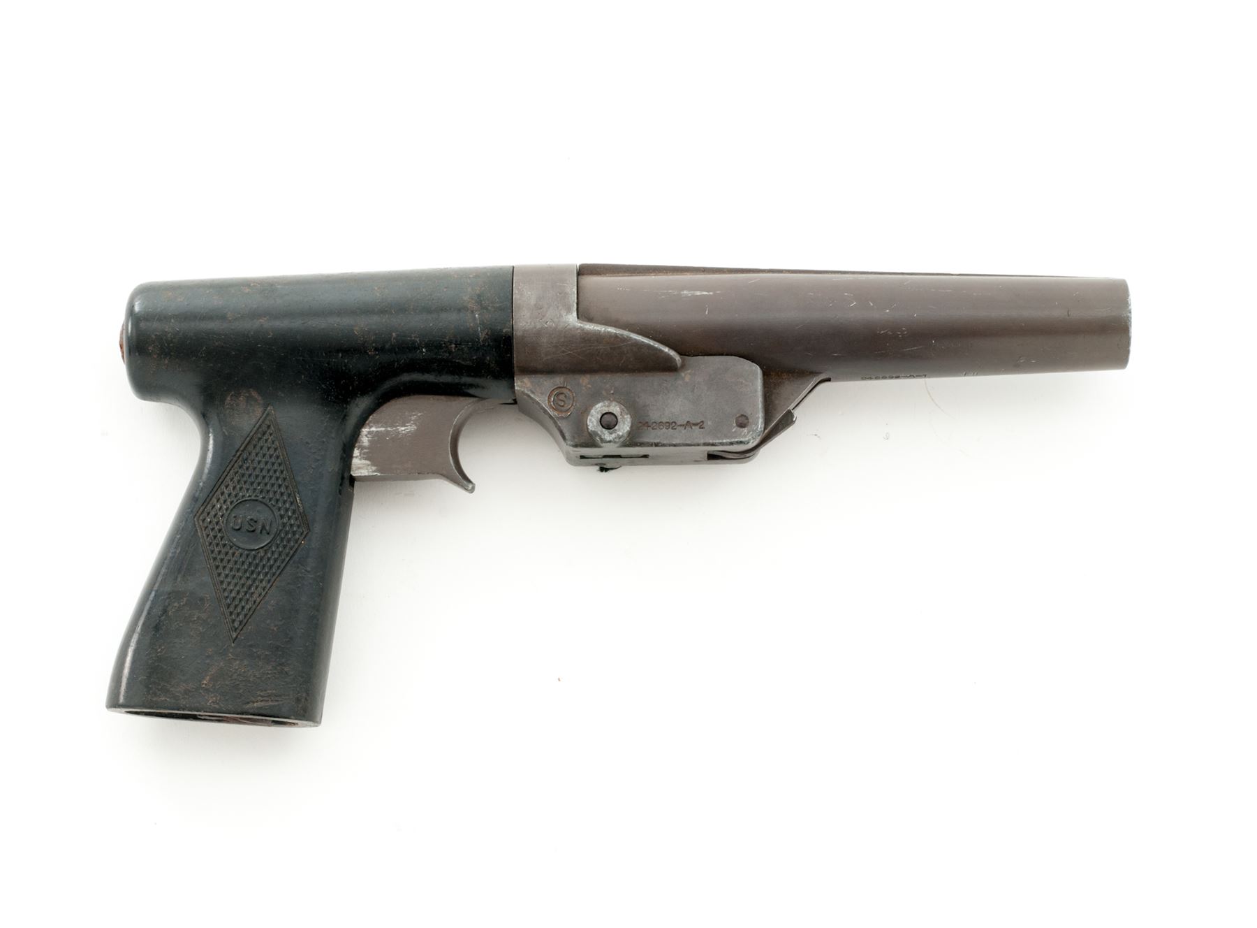 R.F. Sedgley Mark 5 Flare Pistol, 6'' barrel, gray finish, black synthetic ''USN'' marked grip, with lanyard ring. Condition is good with general moderate dents and scratches; most of the gray finish remains. Left side of grip with a small sliver missing. Lanyard ring is rusted. Good action and bore. Est.: $100-$150.