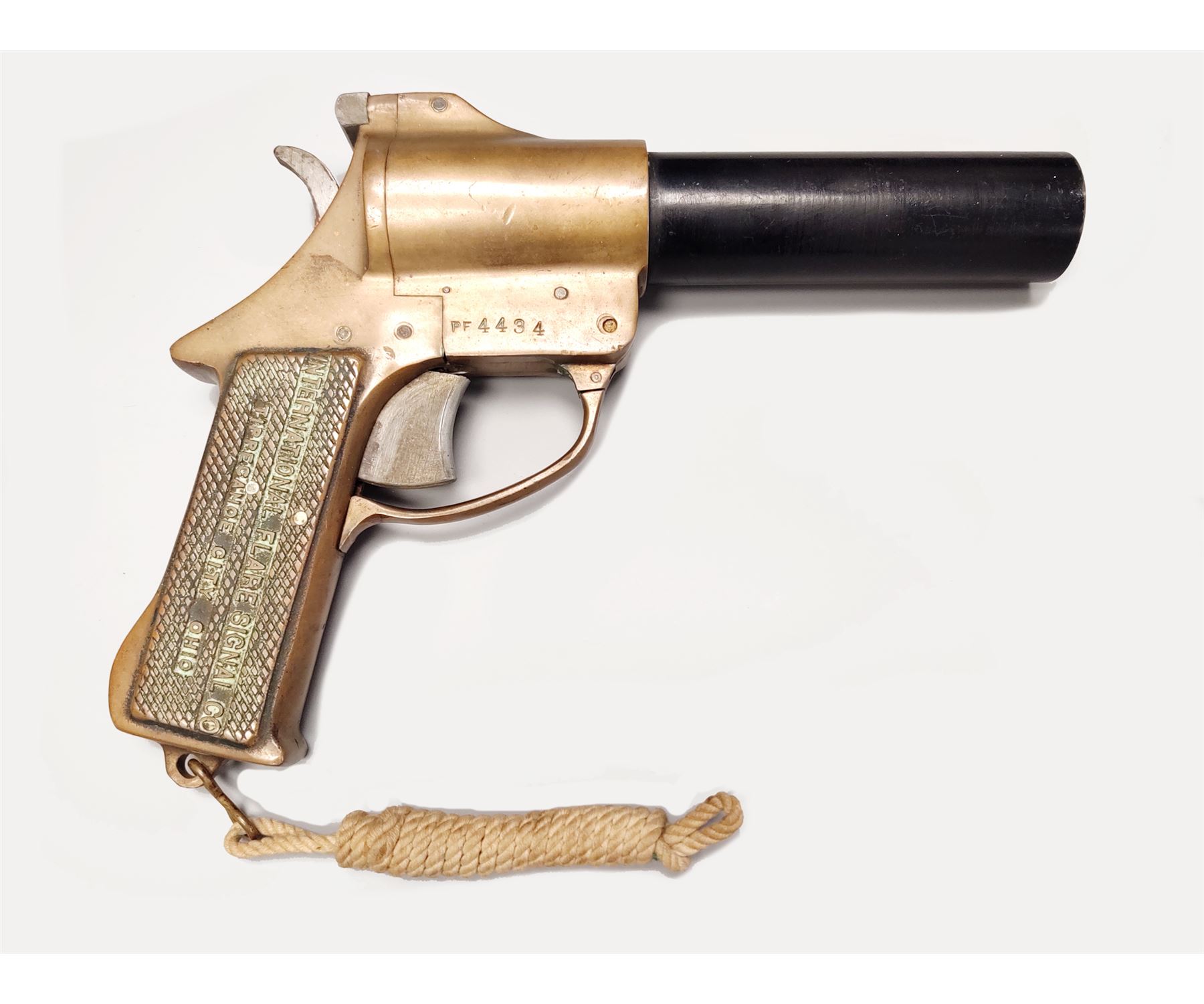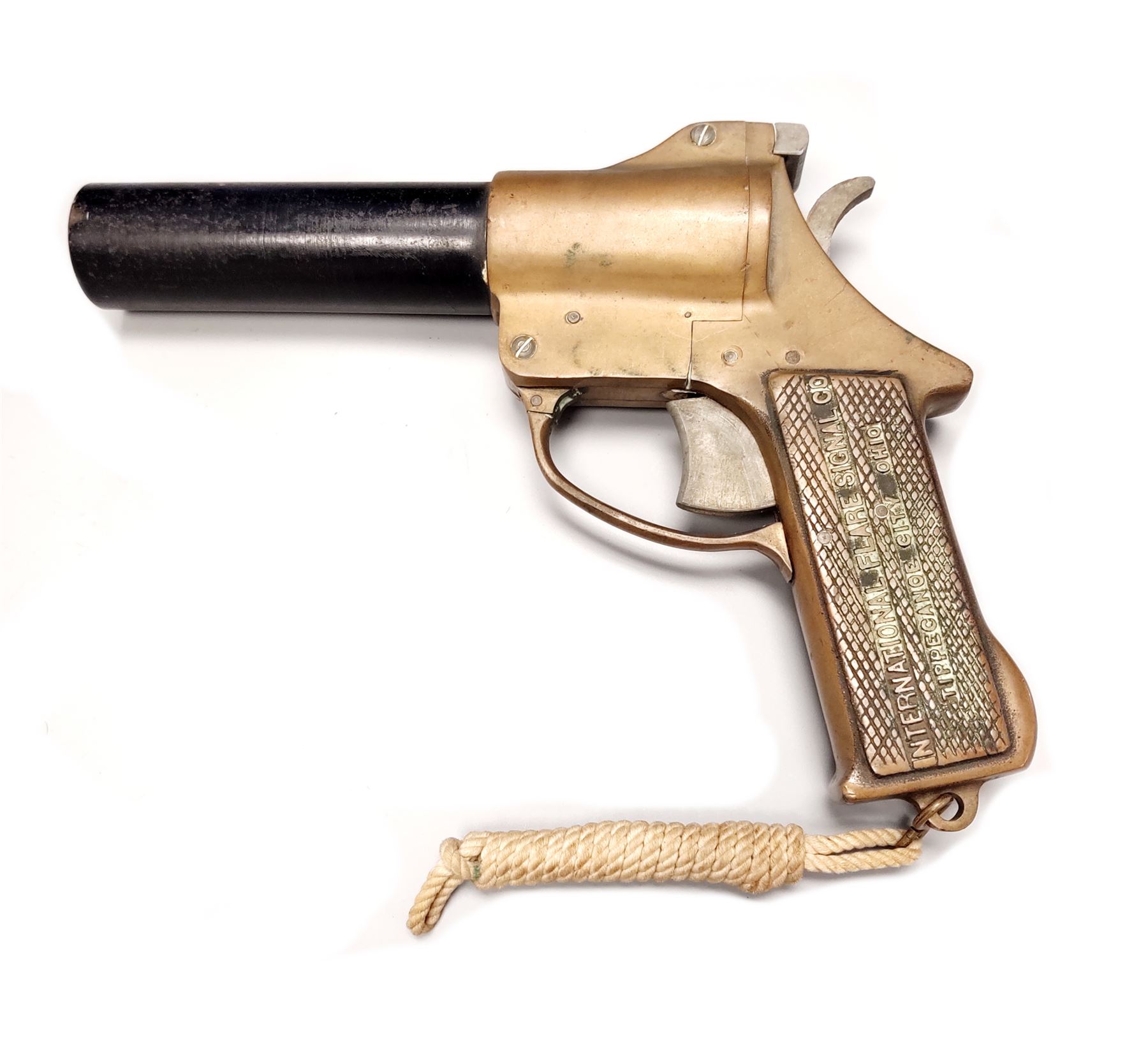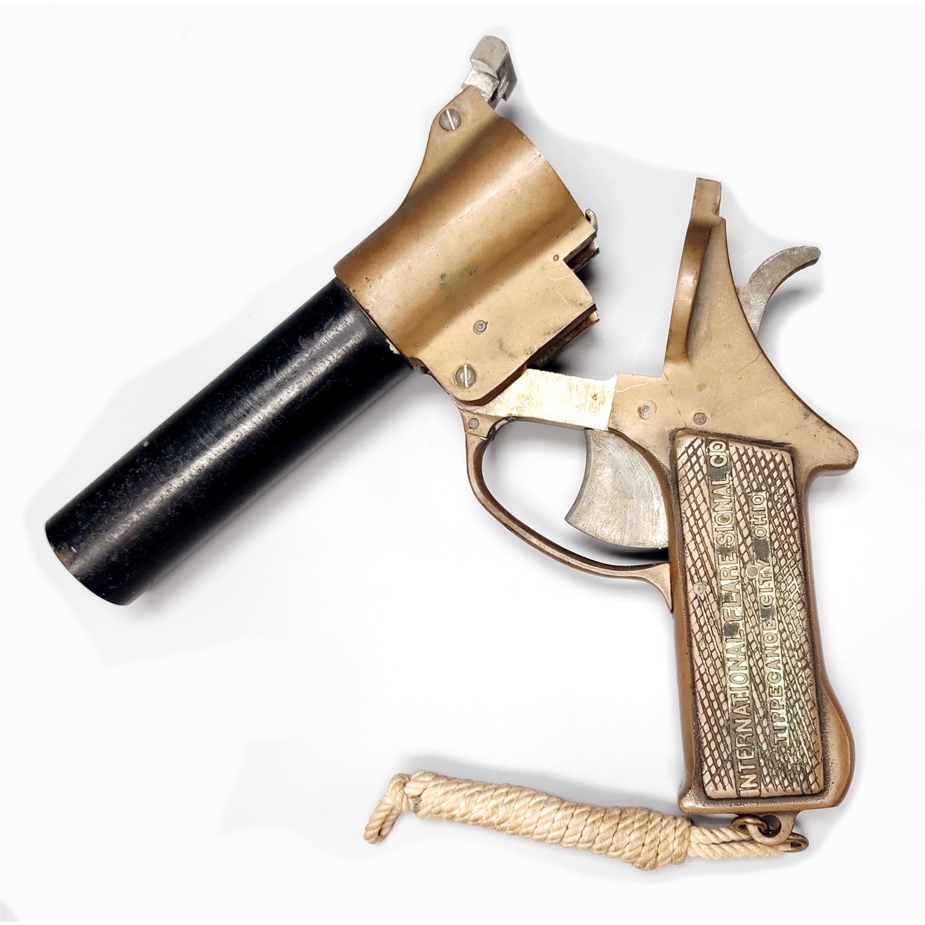 International Flare Signal Co. Flare Pistol, 37mm, 8'' black steel barrel, brass frame with lanyard. Each of the checkered integral brass grips is marked ''INTERNATIONAL FLARE SIGNAL CO/ TIPPECANOE CITY, OHIO''; right side of frame is marked ''PF4434''. Condition overall is very good. Brass frame with a mild patina and a few spots of verdigris on the left side and in the lettering on the grips. Barrel retains approx. 80% of its black finish with specks of light surface rust and some pitting, mainly to the right side. Hinge spring is rusted and parts of the hammer below the frame line with spots of rust. Action functions properly, bore is dark. All factory lettering is clear. Lanyard with normal mild discoloration from age and appears original. Est.: $125-$225.