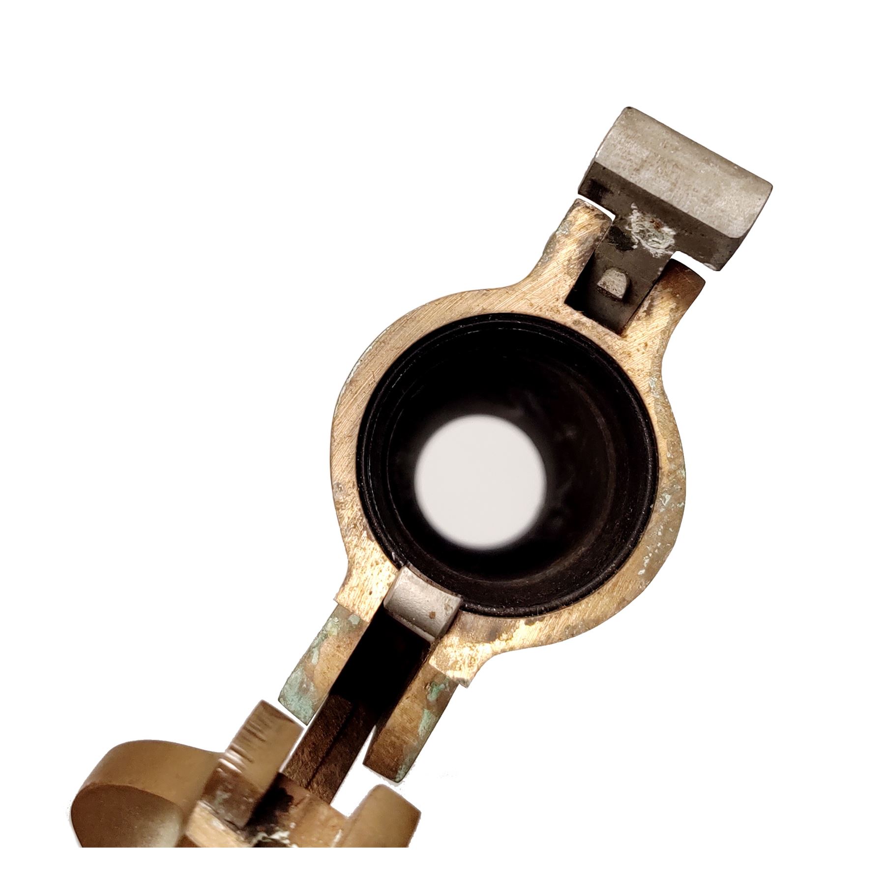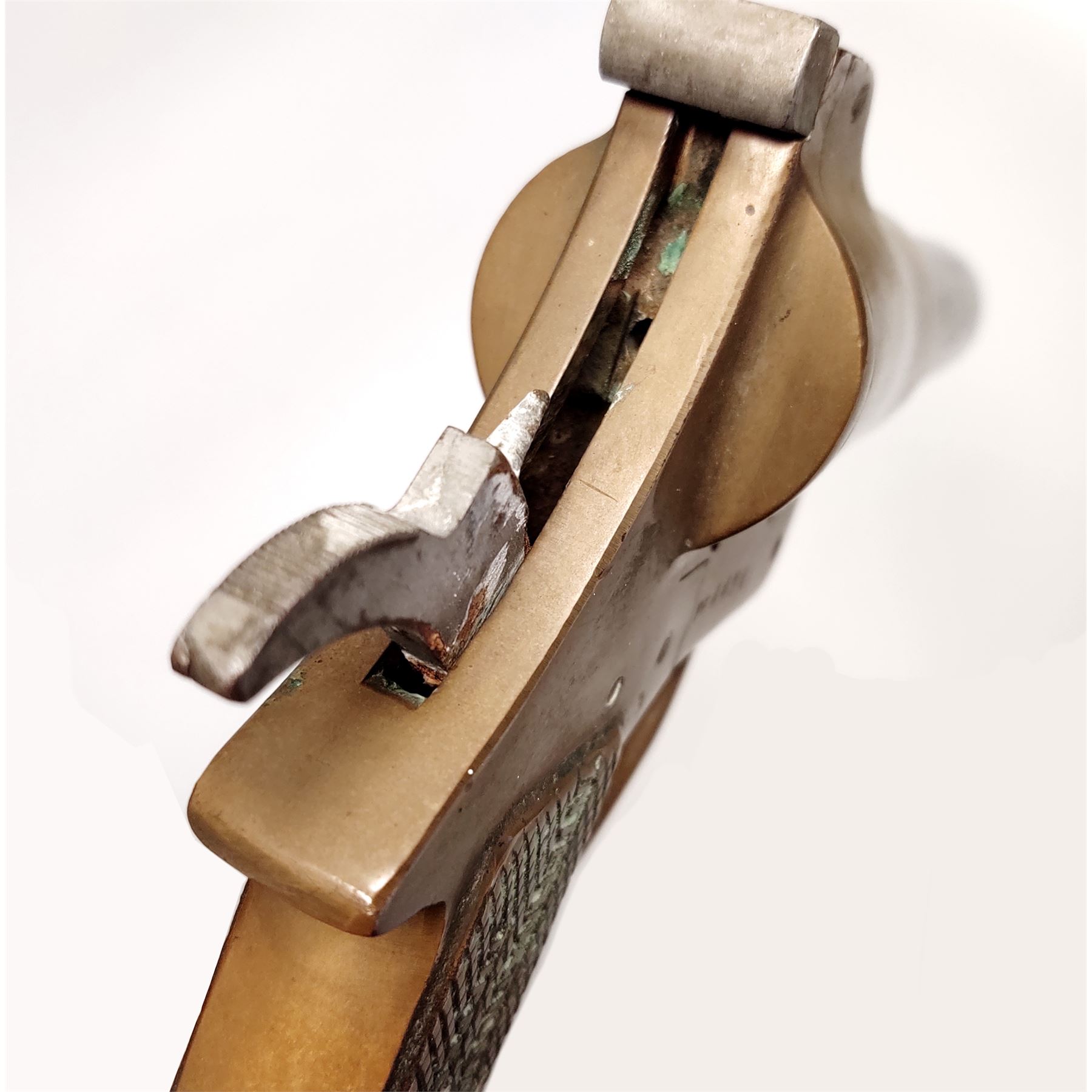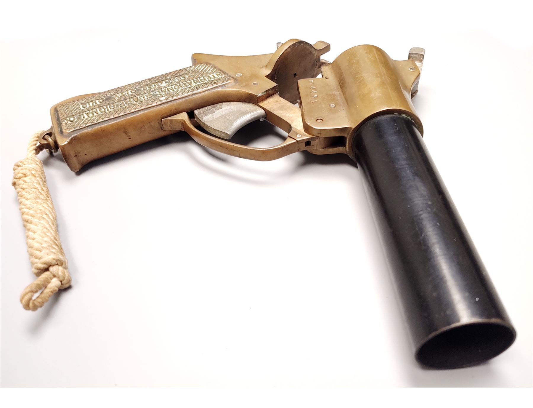 International Flare Signal Co. Flare Pistol, 37mm, 8'' black steel barrel, brass frame with lanyard. Each of the checkered integral brass grips is marked ''INTERNATIONAL FLARE SIGNAL CO/ TIPPECANOE CITY, OHIO''; right side of frame is marked ''PF4434''. Condition overall is very good. Brass frame with a mild patina and a few spots of verdigris on the left side and in the lettering on the grips. Barrel retains approx. 80% of its black finish with specks of light surface rust and some pitting, mainly to the right side. Hinge spring is rusted and parts of the hammer below the frame line with spots of rust. Action functions properly, bore is dark. All factory lettering is clear. Lanyard with normal mild discoloration from age and appears original. Est.: $125-$225.