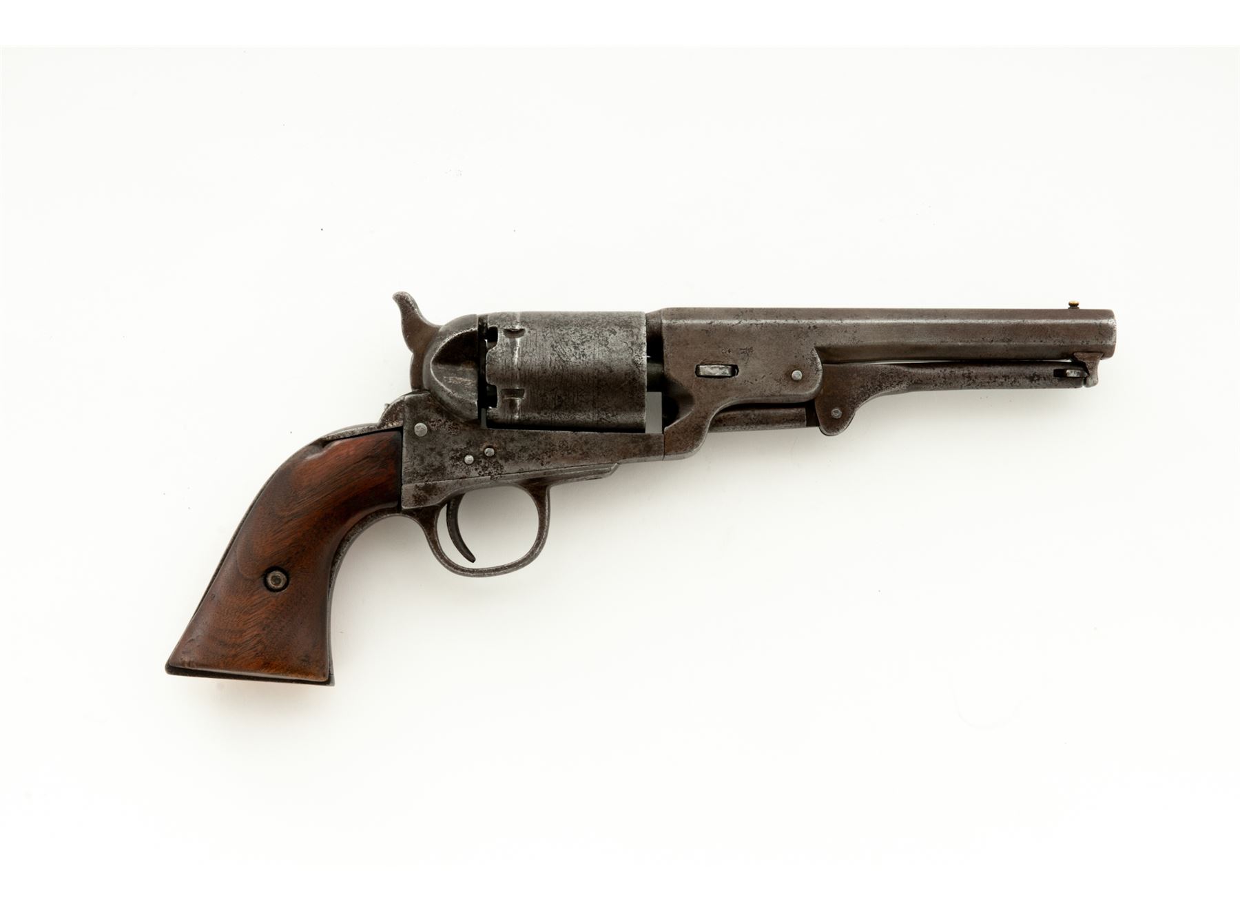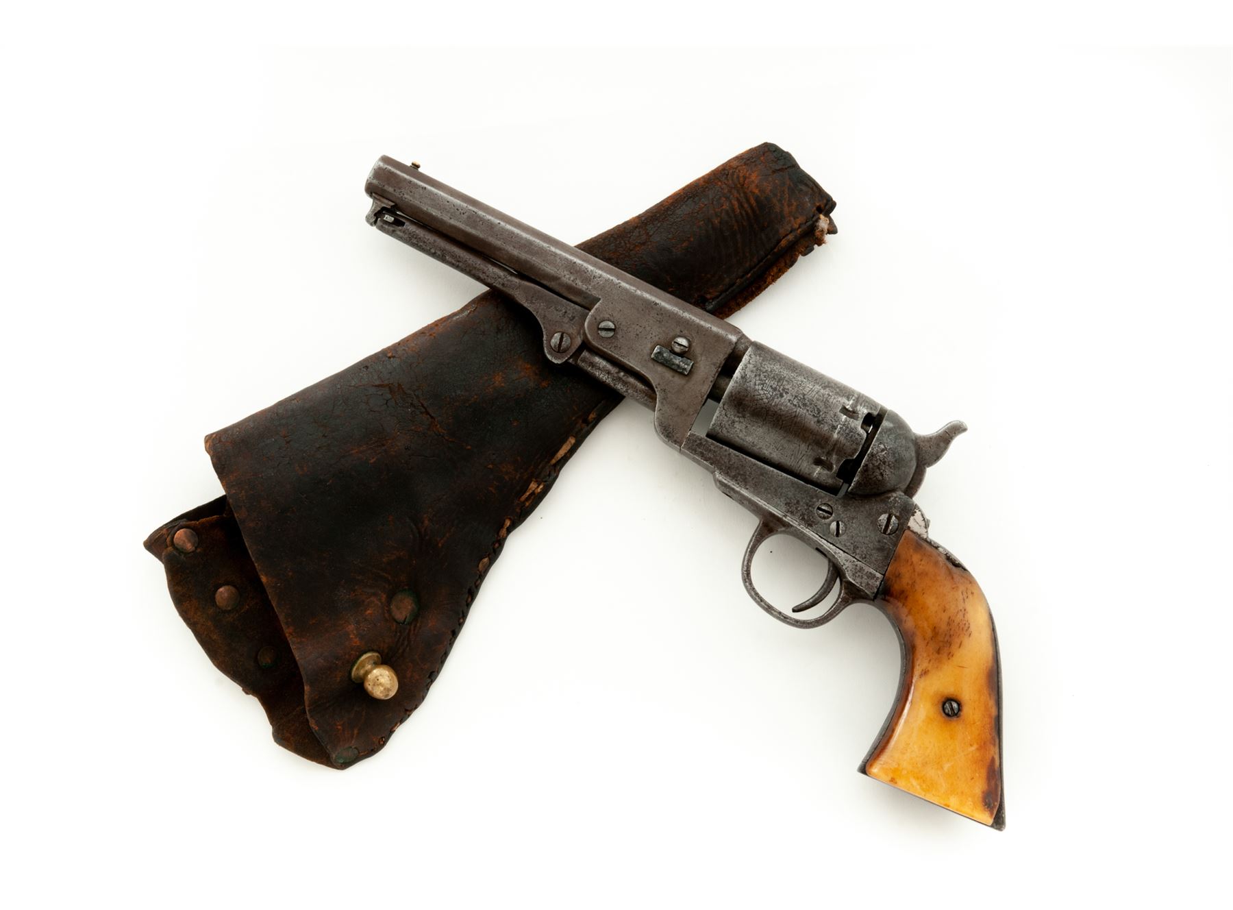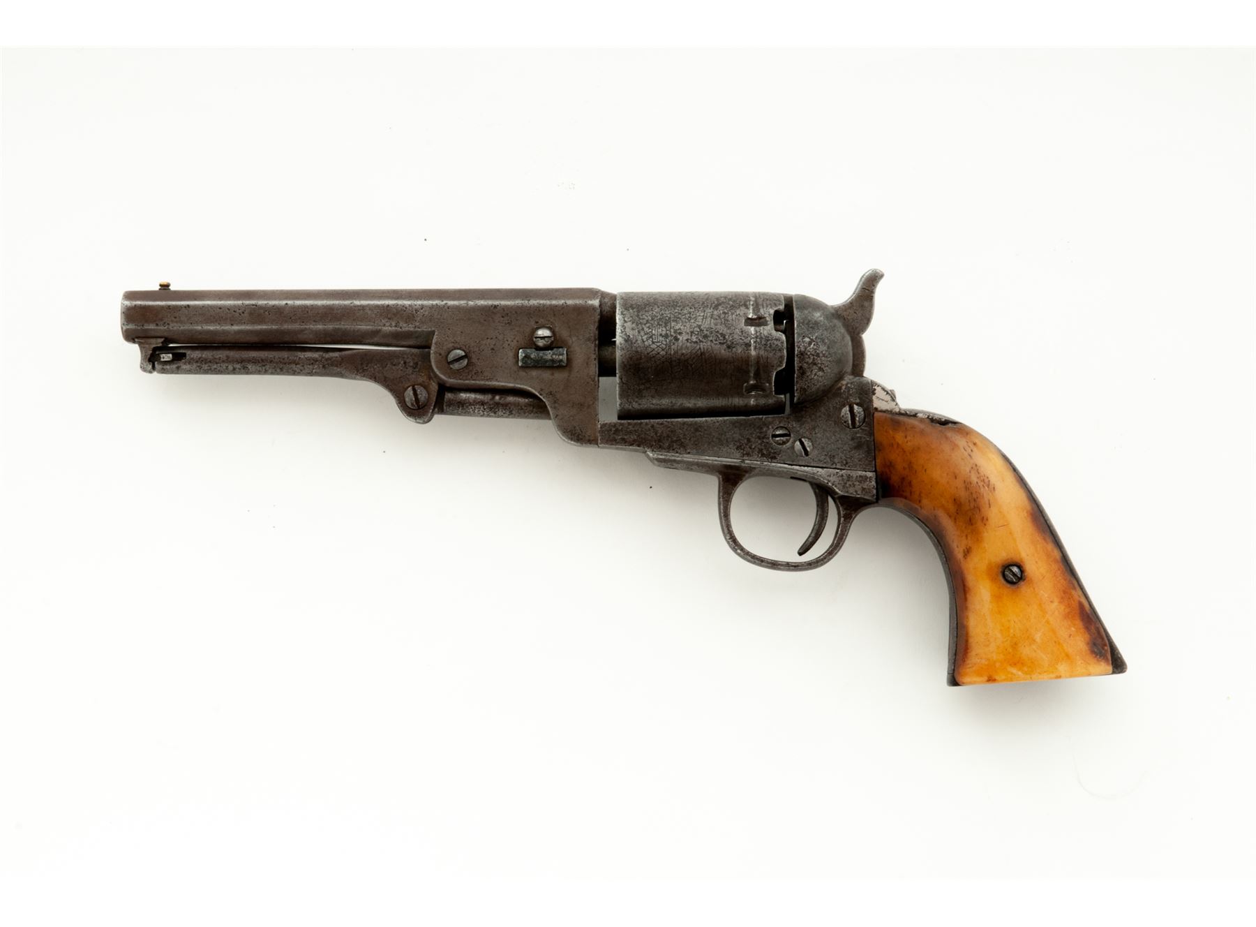 Antique Belgian-made Copy of the Colt Model 1851 Navy Single Action Percussion Revolver, with holster, #1579, approx. .40 cal., 5-3/4'' octagonal barrel marked ''(crossed keys) First Quality American Pattern (crossed keys)'' on top flat, 6-shot round cylinder with roll-engraved scene of what appears to be a naval engagement and a crosshatch pattern with Belgian proofmarks; frame marked ''35 Calibre'' at left front at barrel juncture and on left rear triggerguard bolster, nickel-plated steel gripstraps, two-piece grips with bone panel at left side and hardwood panel on right. Condition is near very good retaining no original finish (traces of nickel on gripstraps) and an overall gunmetal gray color with occasional pitting (mainly to sides of frame, with a patch on cylinder); cylinder scene is perhaps 50% clear; other markings are distinct. All serial numbers match (wedge unnumbered). Grips are smooth having a chip out at left heel. Action is crisp, bore is shiny with distinct rifling. Dark leather holster shows age and some re-stitching, removed flap (but brass closure stud remains), and fits the gun perfectly. Est.: $400-$600. (Antique)