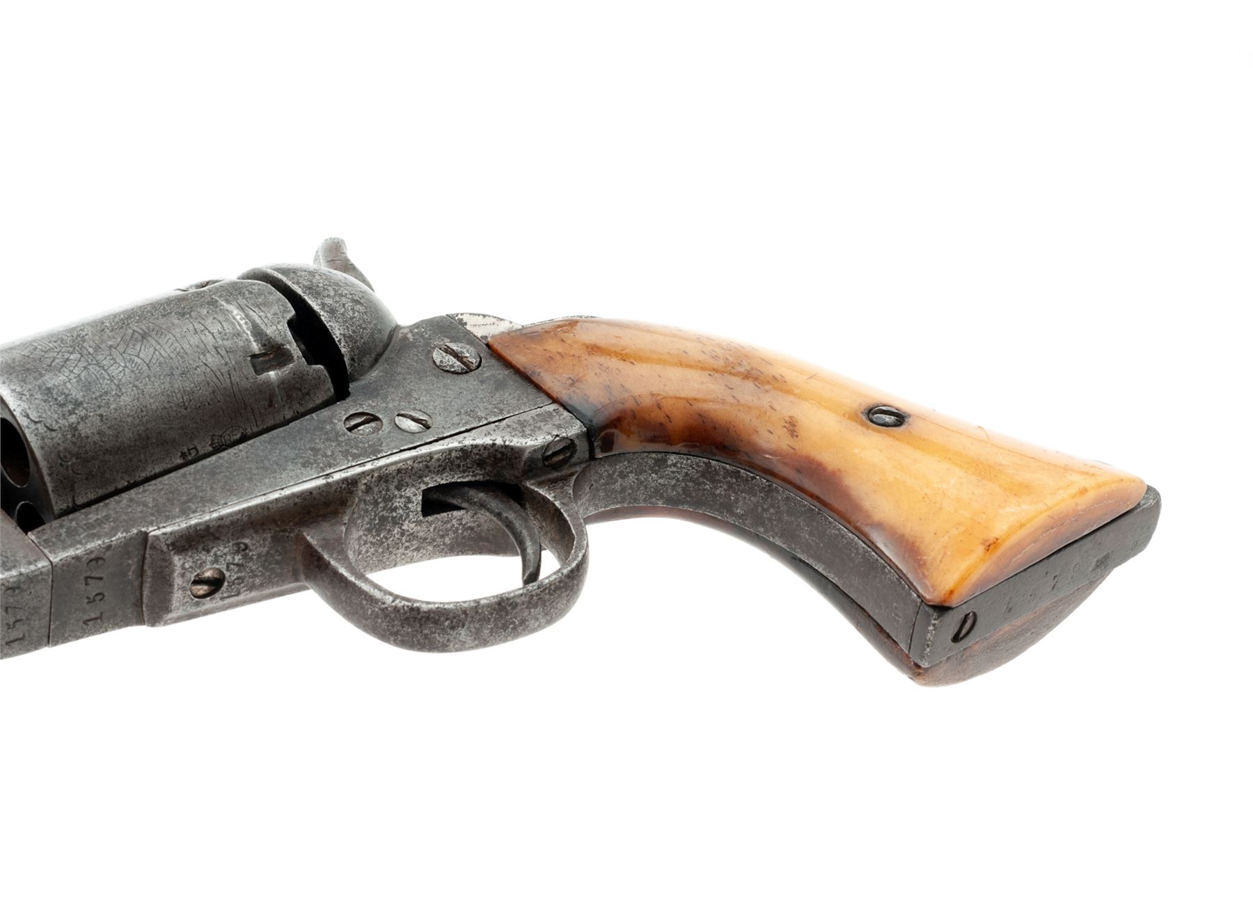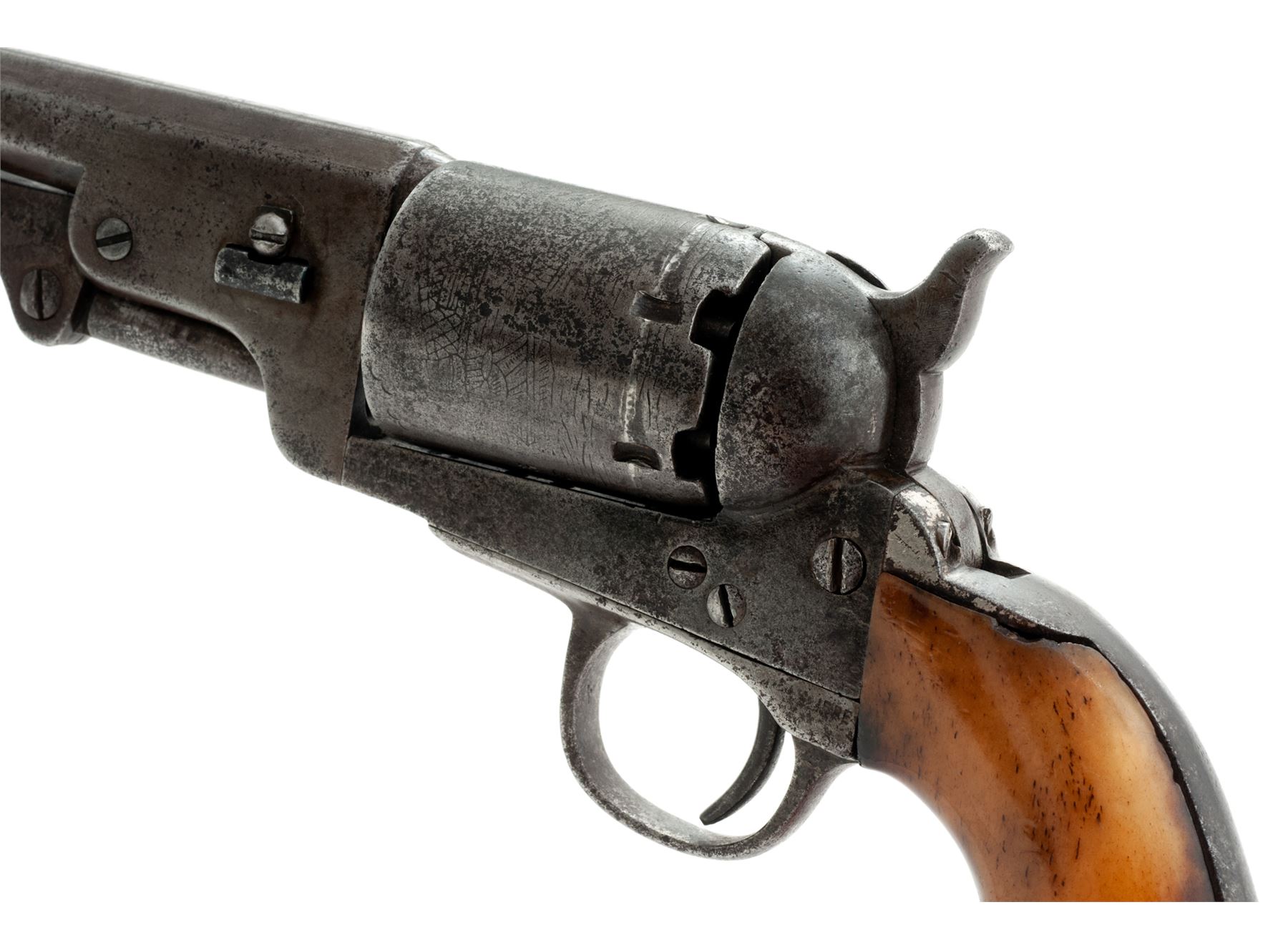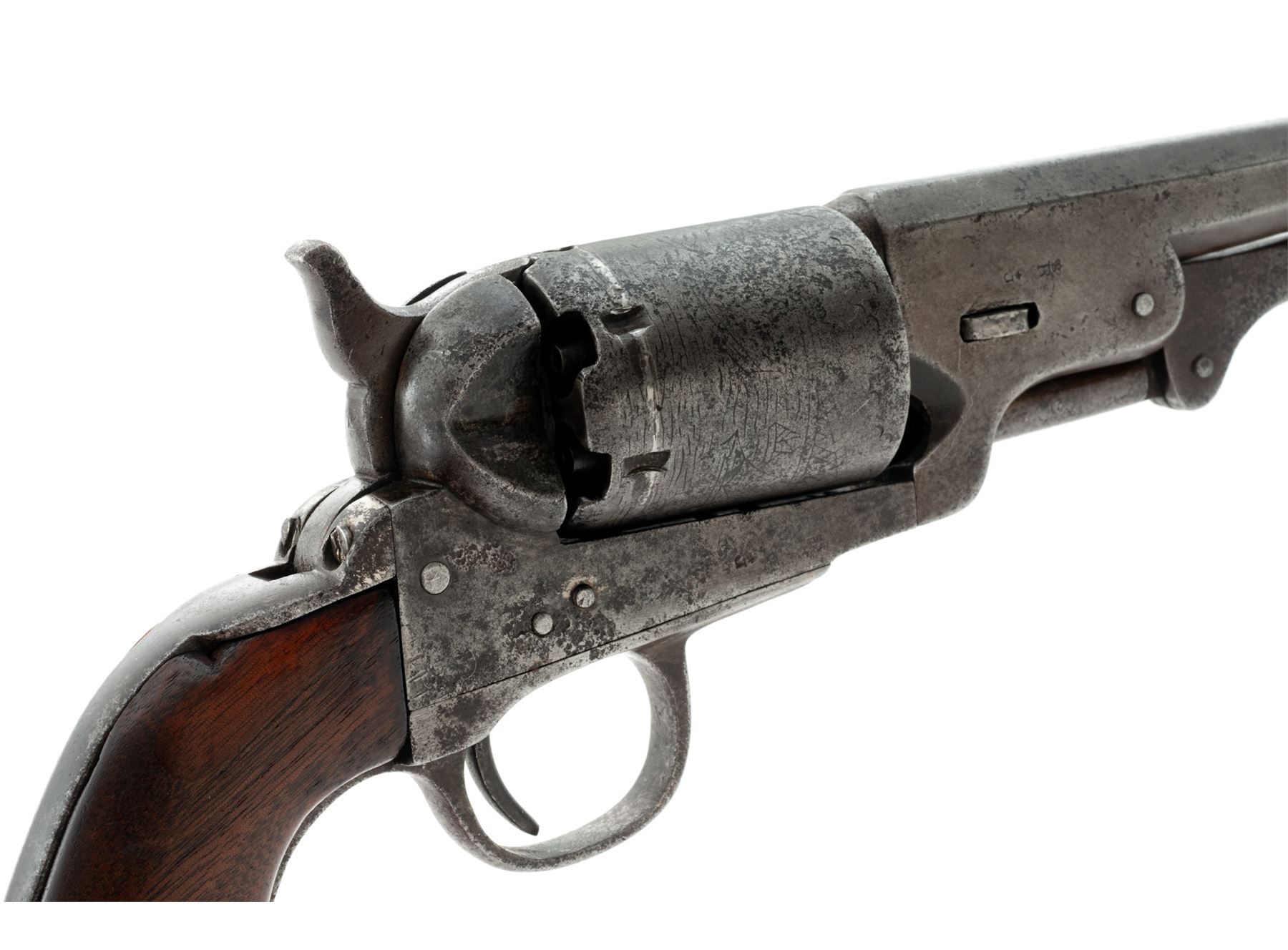Antique Belgian-made Copy of the Colt Model 1851 Navy Single Action Percussion Revolver, with holster, #1579, approx. .40 cal., 5-3/4'' octagonal barrel marked ''(crossed keys) First Quality American Pattern (crossed keys)'' on top flat, 6-shot round cylinder with roll-engraved scene of what appears to be a naval engagement and a crosshatch pattern with Belgian proofmarks; frame marked ''35 Calibre'' at left front at barrel juncture and on left rear triggerguard bolster, nickel-plated steel gripstraps, two-piece grips with bone panel at left side and hardwood panel on right. Condition is near very good retaining no original finish (traces of nickel on gripstraps) and an overall gunmetal gray color with occasional pitting (mainly to sides of frame, with a patch on cylinder); cylinder scene is perhaps 50% clear; other markings are distinct. All serial numbers match (wedge unnumbered). Grips are smooth having a chip out at left heel. Action is crisp, bore is shiny with distinct rifling. Dark leather holster shows age and some re-stitching, removed flap (but brass closure stud remains), and fits the gun perfectly. Est.: $400-$600. (Antique)