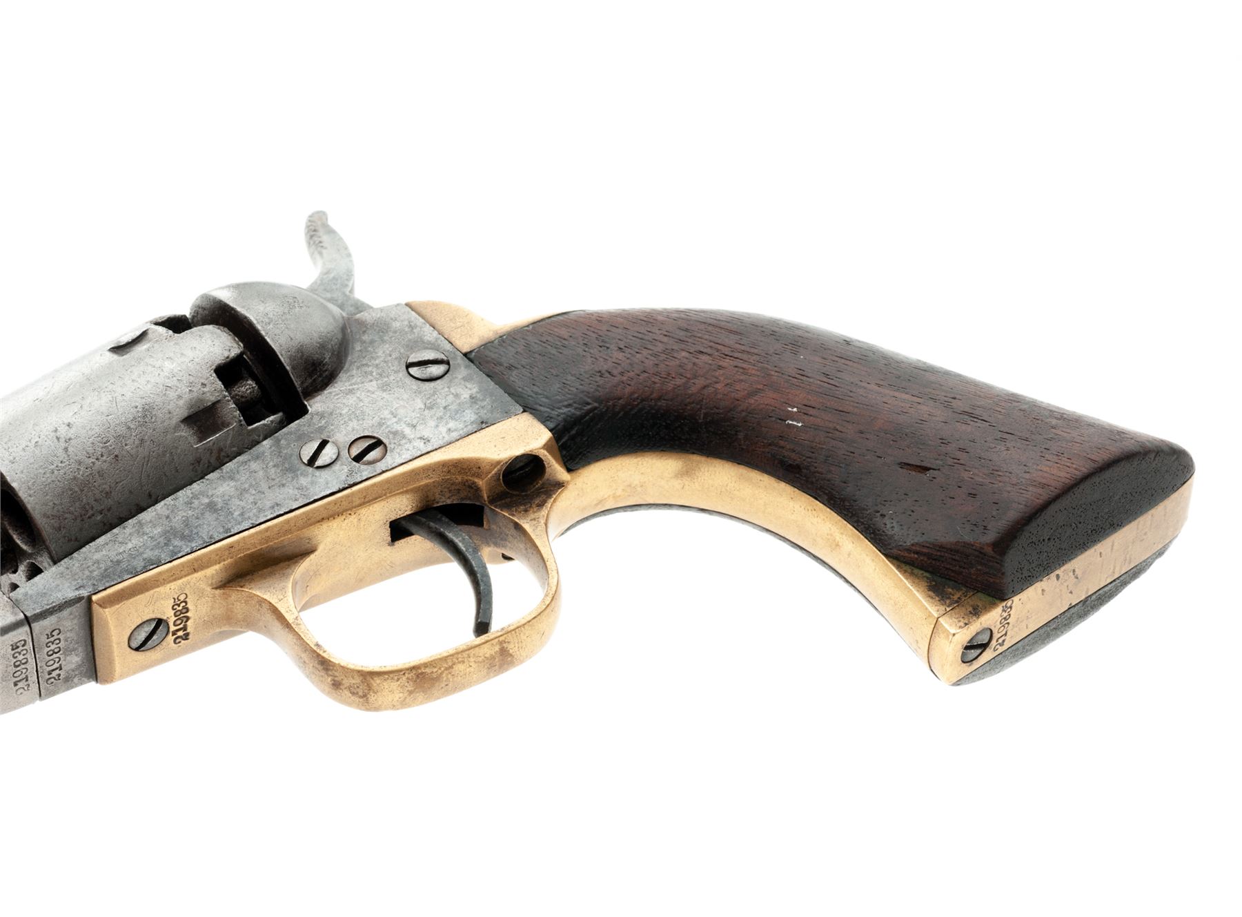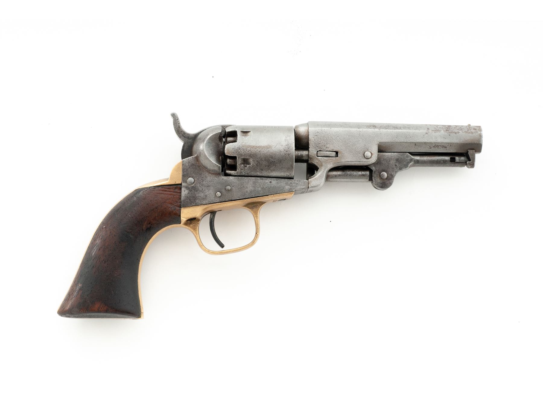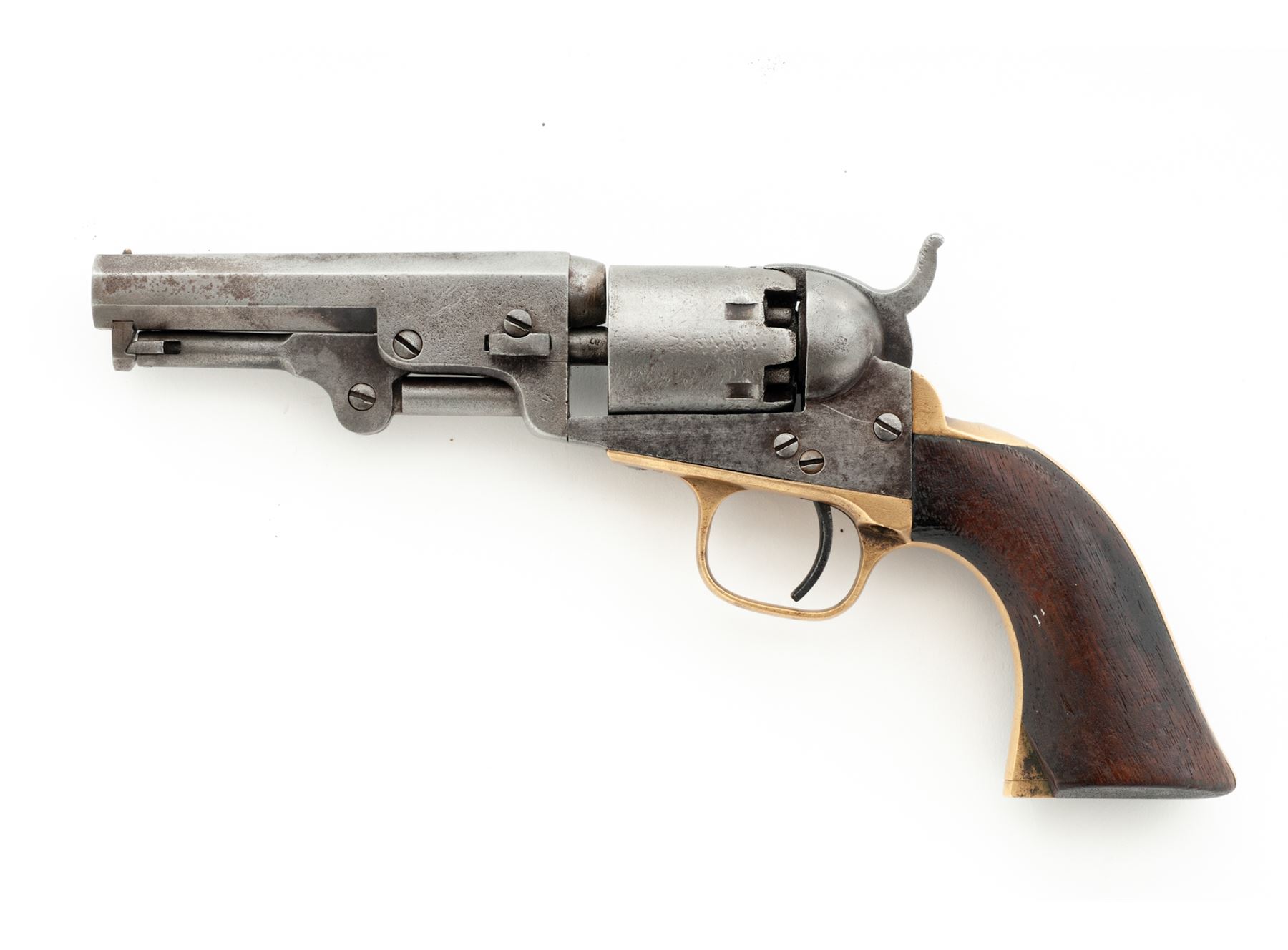 Civil War Colt Model 1849 Single Action Percussion Pocket Revolver, #219835, .31 cal., 4'' octagonal barrel with the one-line ''Address Col. Saml Colt New-York US America'' marking, 6-shot round cylinder with the familiar ''Stagecoach Hold-Up'' rolled scene, brass grip straps, one-piece varnished walnut grips. Originally blued and case hardened finishes. Mfg'd 1862 during the early Civil War. All serial numbers match except the wedge, which is original Colt part #14379. Condition is very good retaining no original finish to metal, which may have been chemically cleaned over light pitting in places; cylinder scene is perhaps 35% visible; most other markings are clear; screw slots are nice. Grips have a chip out at left bottom but are otherwise smooth and retain some original varnish. Action is crisp; bore is clean with distinct rifling. Est.: $450-$750. (Antique)