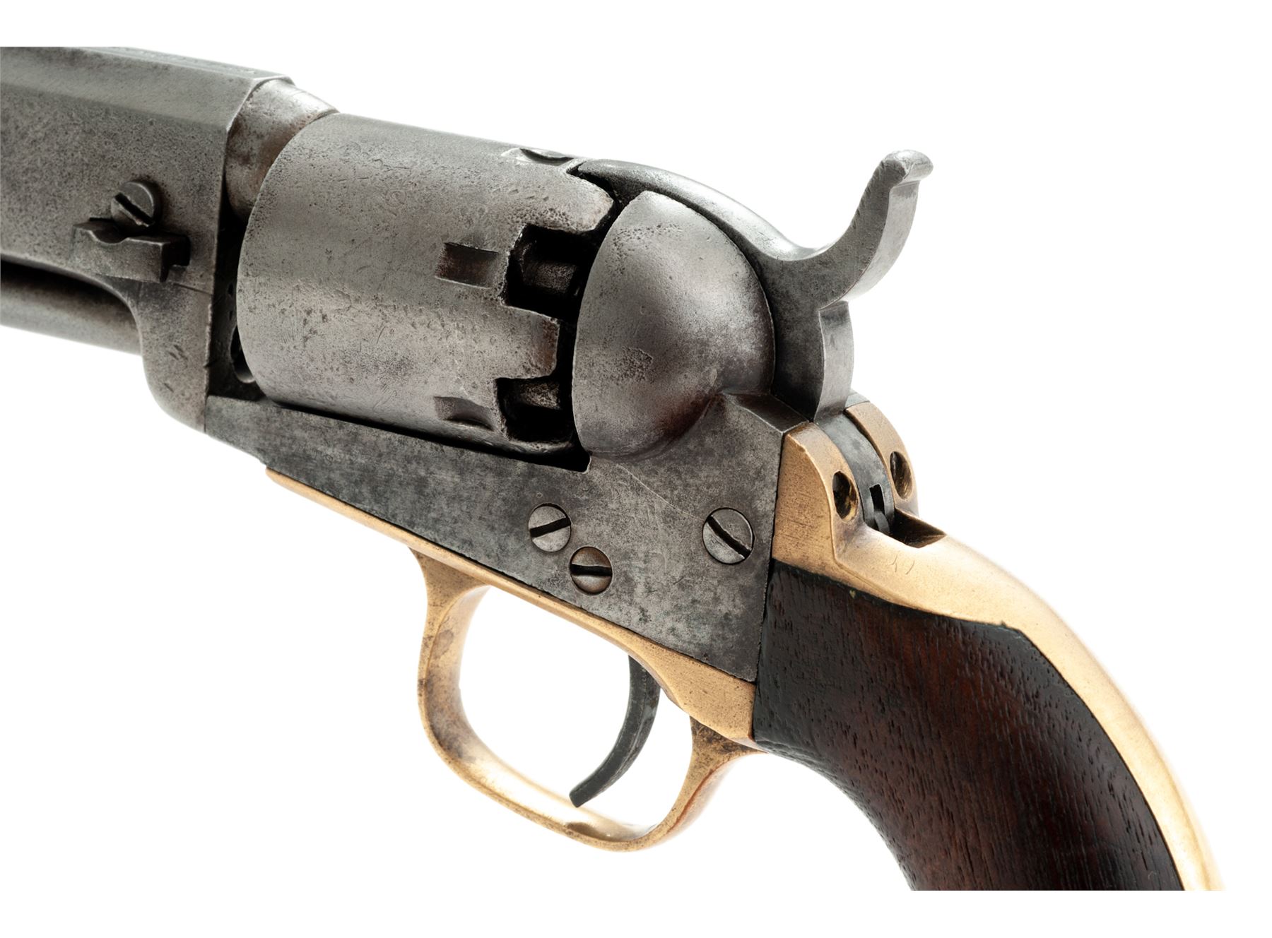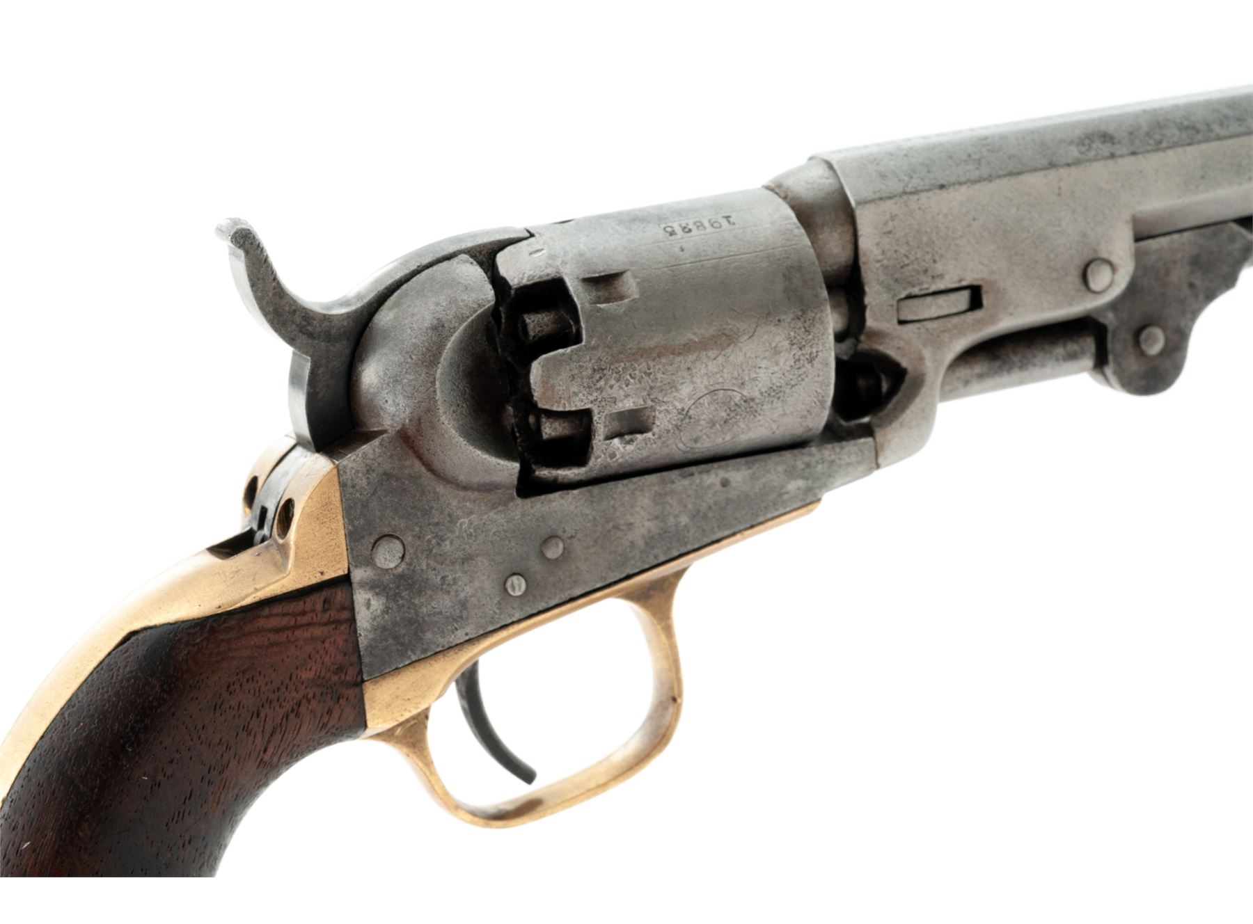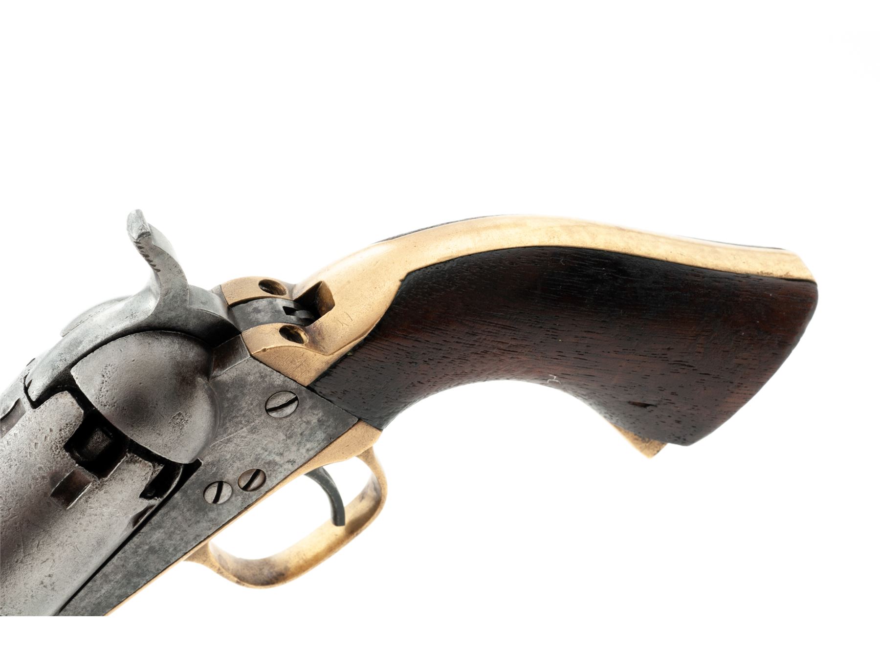 Civil War Colt Model 1849 Single Action Percussion Pocket Revolver, #219835, .31 cal., 4'' octagonal barrel with the one-line ''Address Col. Saml Colt New-York US America'' marking, 6-shot round cylinder with the familiar ''Stagecoach Hold-Up'' rolled scene, brass grip straps, one-piece varnished walnut grips. Originally blued and case hardened finishes. Mfg'd 1862 during the early Civil War. All serial numbers match except the wedge, which is original Colt part #14379. Condition is very good retaining no original finish to metal, which may have been chemically cleaned over light pitting in places; cylinder scene is perhaps 35% visible; most other markings are clear; screw slots are nice. Grips have a chip out at left bottom but are otherwise smooth and retain some original varnish. Action is crisp; bore is clean with distinct rifling. Est.: $450-$750. (Antique)