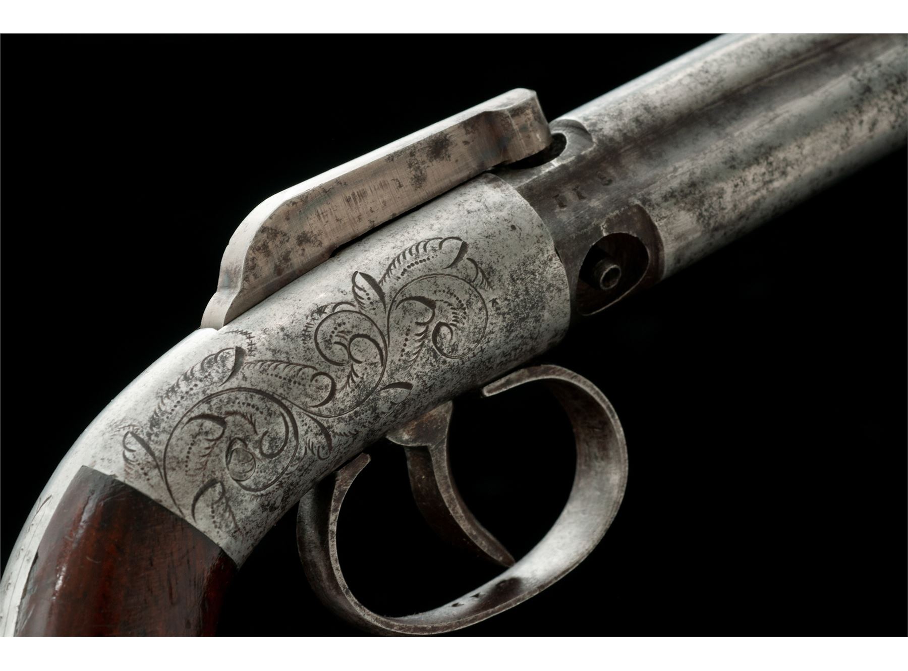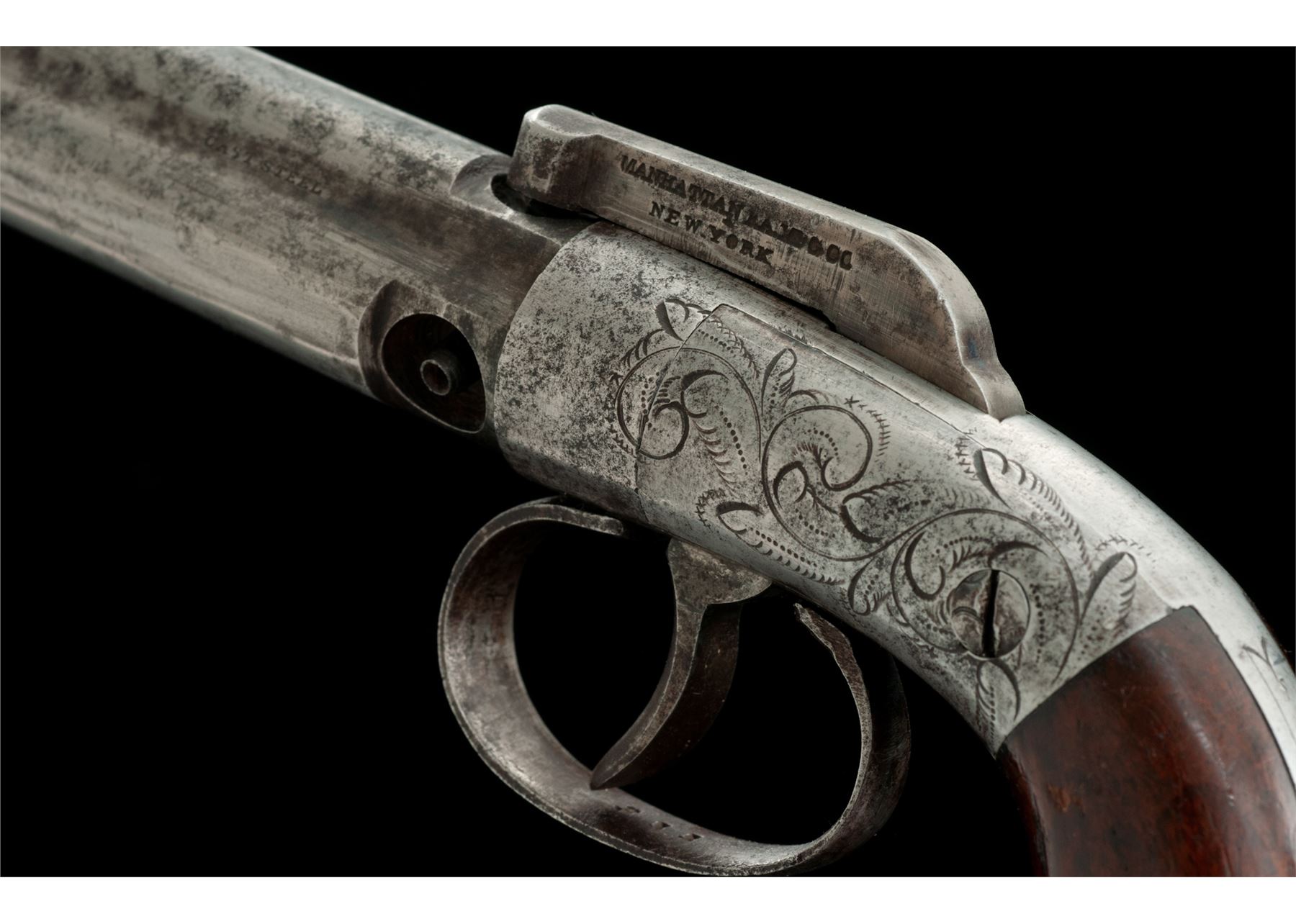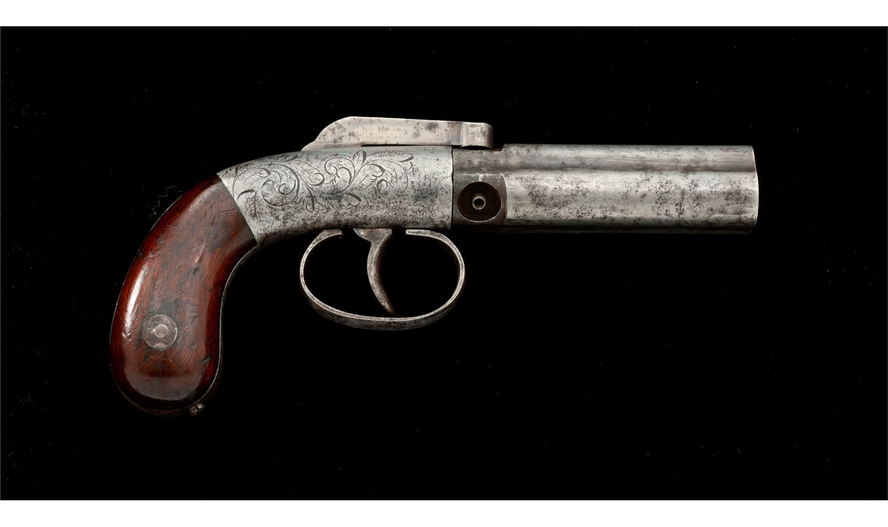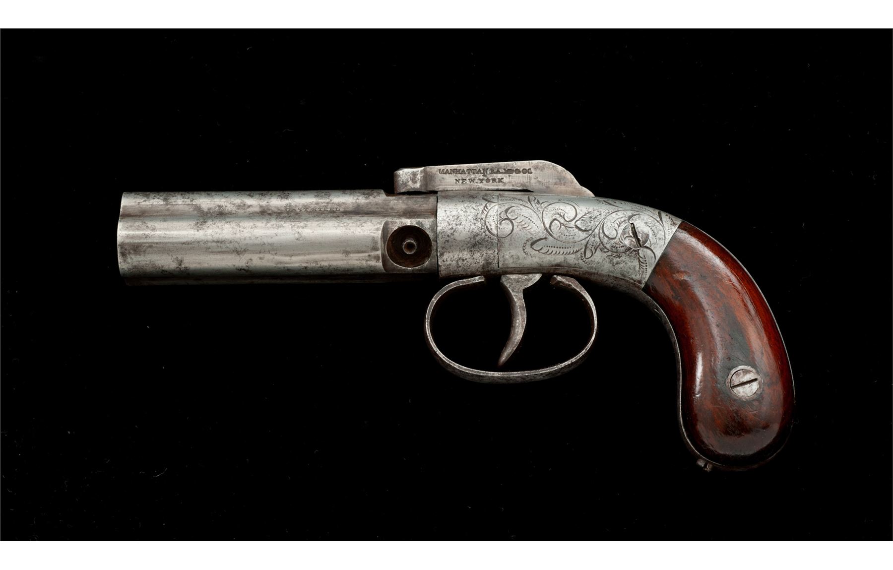 Antique Manhattan 3-Barrel Bar Hammer Double Action Percussion Pepperbox Pistol, #311, .28 cal., 3'' fluted round barrel group marked ''Cast Steel''; bar hammer marked on left side ''Manhattan F.A. Mfg. Co./New York'' in two lines; floral engraved frame having integral bag-style gripstraps and a simple loop triggerguard, with two-piece varnished walnut grips. Mfg'd in Norwich, CT circa the mid- to late 1850s, originally with blued and case hardened finishes. Condition is good+ retaining no original finish with an overall gunmetal gray patina showing cleaned scattered light erosion; all three nipples are intact; markings are legible. Grips are sound showing use and wear and retain approx. 75% original varnish finish. Action functions; smoothbores are clean. This pistol, with its hand-revolved 3-barrel group, is early and considered very scarce. Est.: $350-$450. (Antique)
