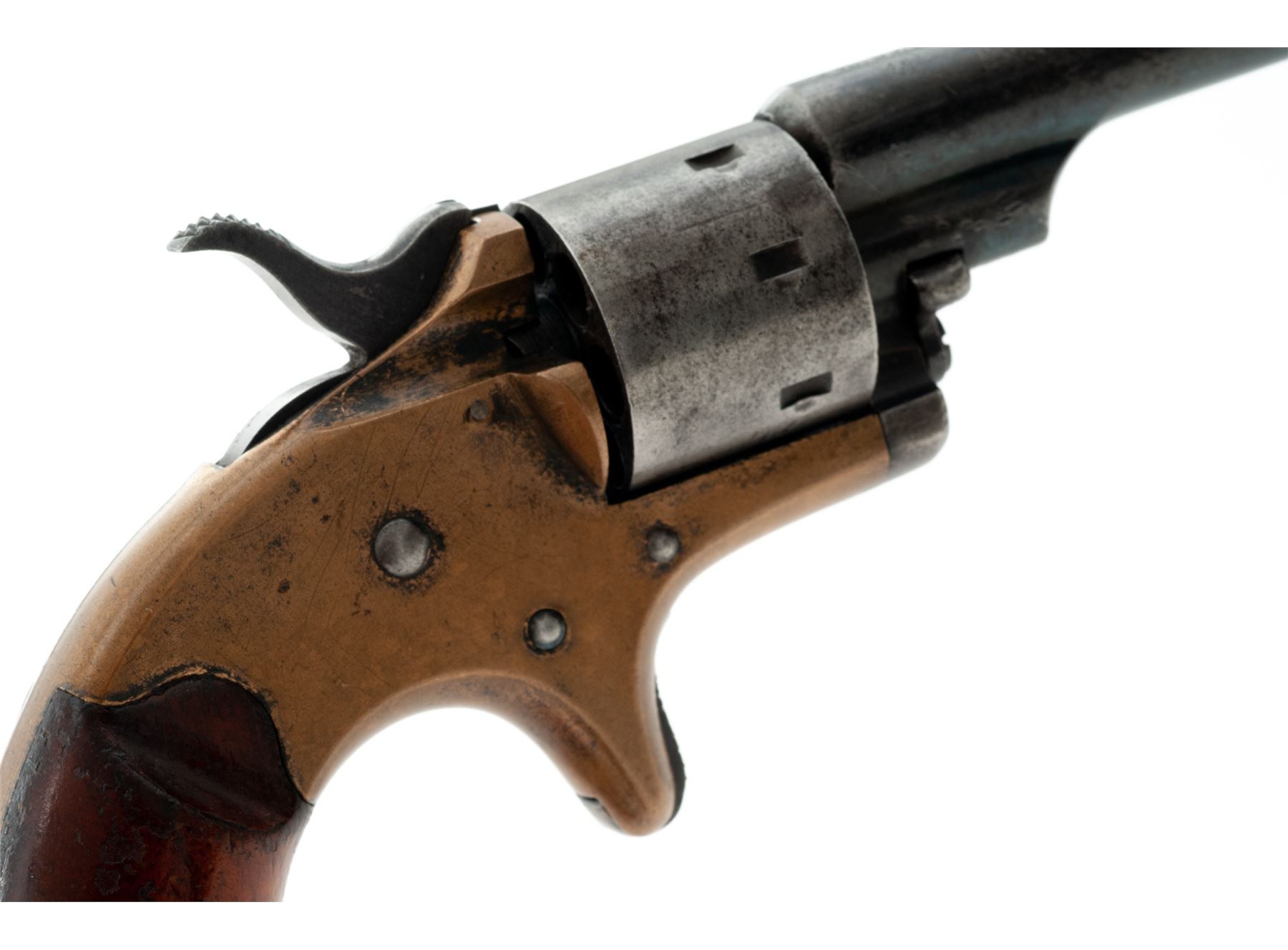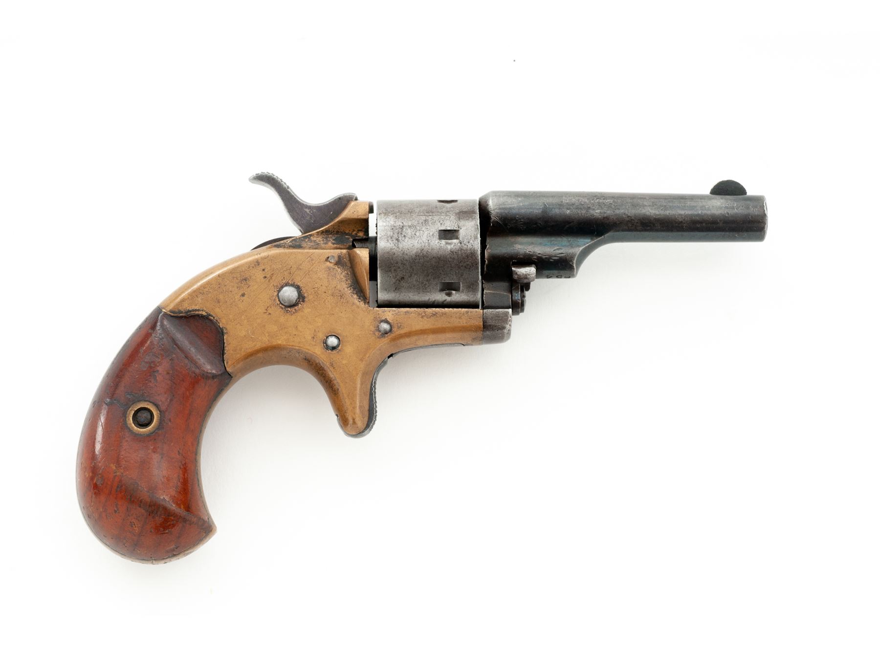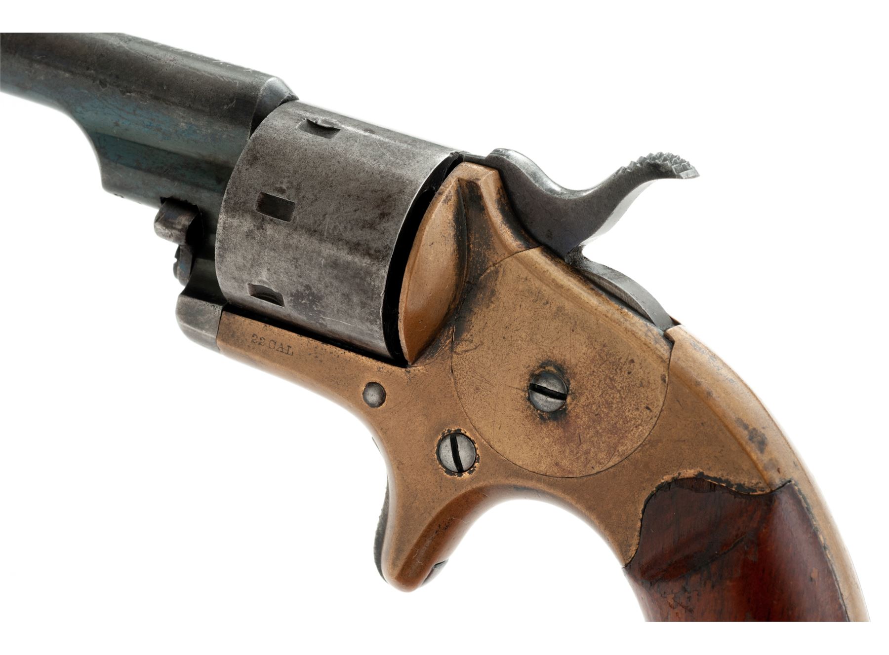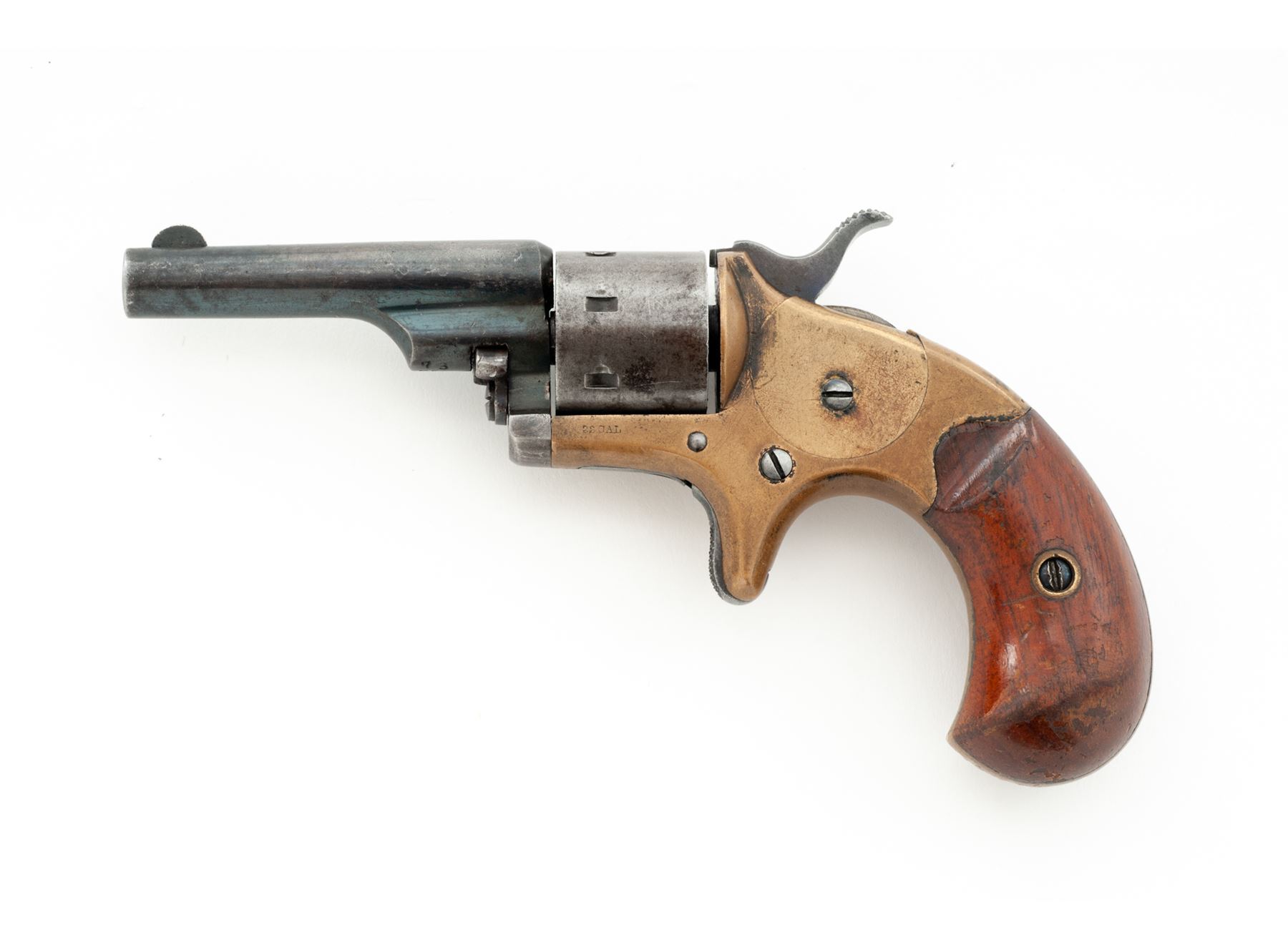 Colt Open-Top Spurtrigger Pocket Cartridge Revolver, #73654, .22 S-L-LR cal., 2-3/8'' round barrel marked ''Colt's Pt. F.A. Mfg. Co./Hartford, CT. U.S.A.'' in two lines flanked by crosses, plain round 7-shot cylinder with forward locking notches, brass spurtrigger frame marked ''22 Cal'' on left side at barrel juncture, two-piece varnished walnut ''bird's head'' grips. Originally finished in blued barrel and cylinder with nickel- (or silver) plated frame. Mfg'd mid-1870s. Condition is very good retaining approx. 35% barrel blue (address slightly obscured by pitting), cylinder and frame without finish. Grips retain approx. 80% original varnish with highpoint wear, fit well and show a nice color. Action is crisp and tight; bore appears clean with good rifling. Est.: $250-$400. (Antique)