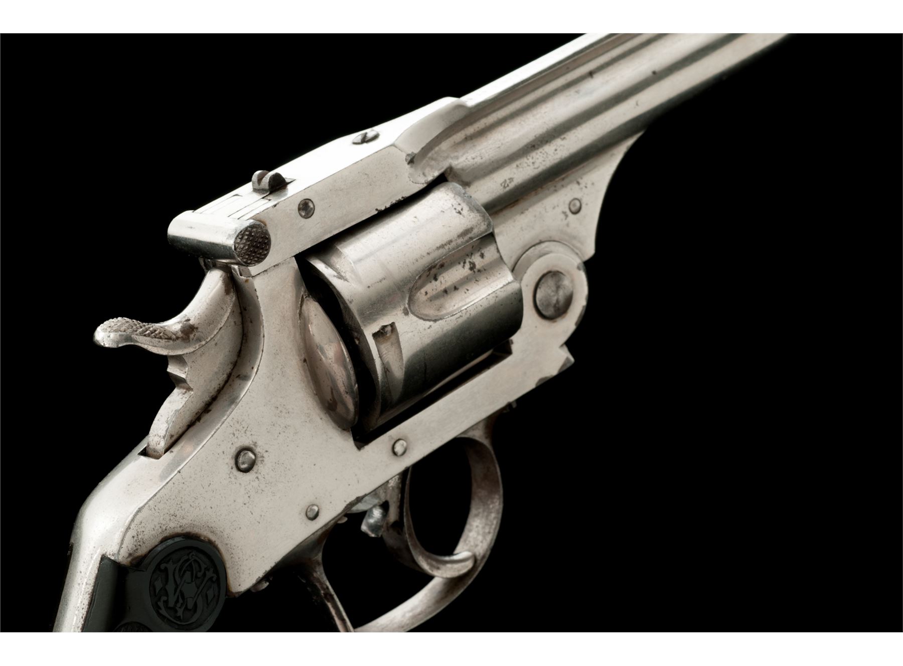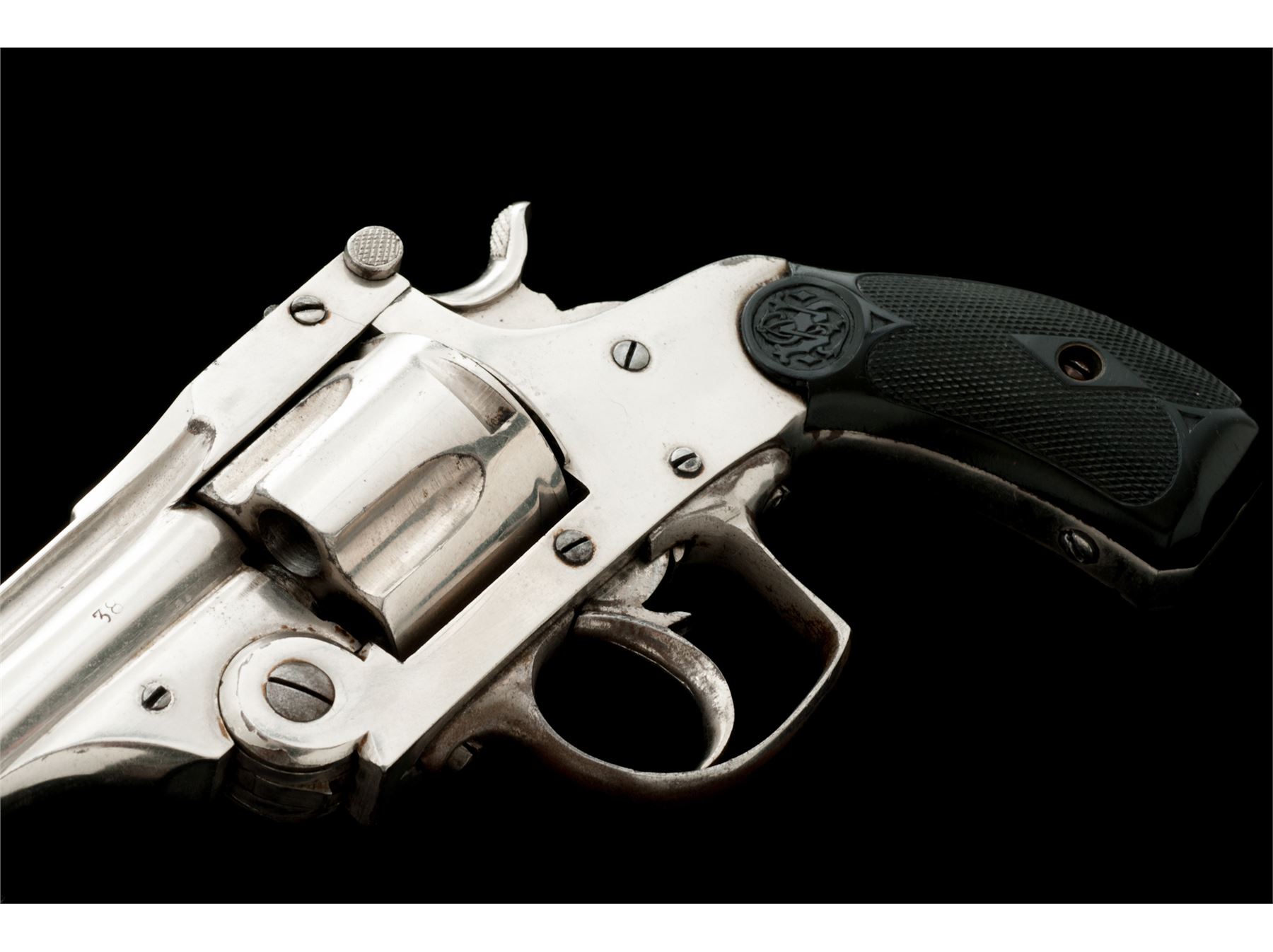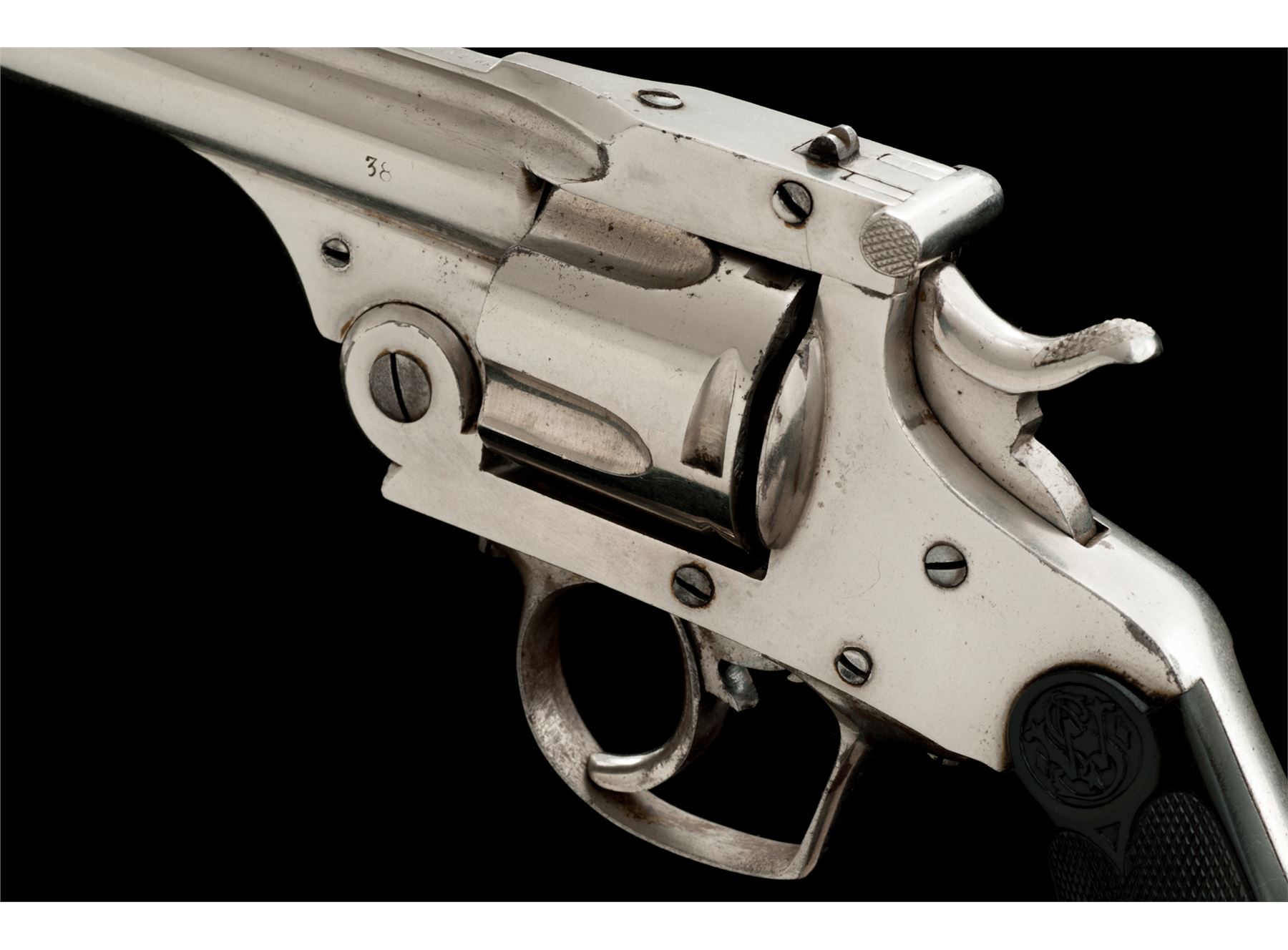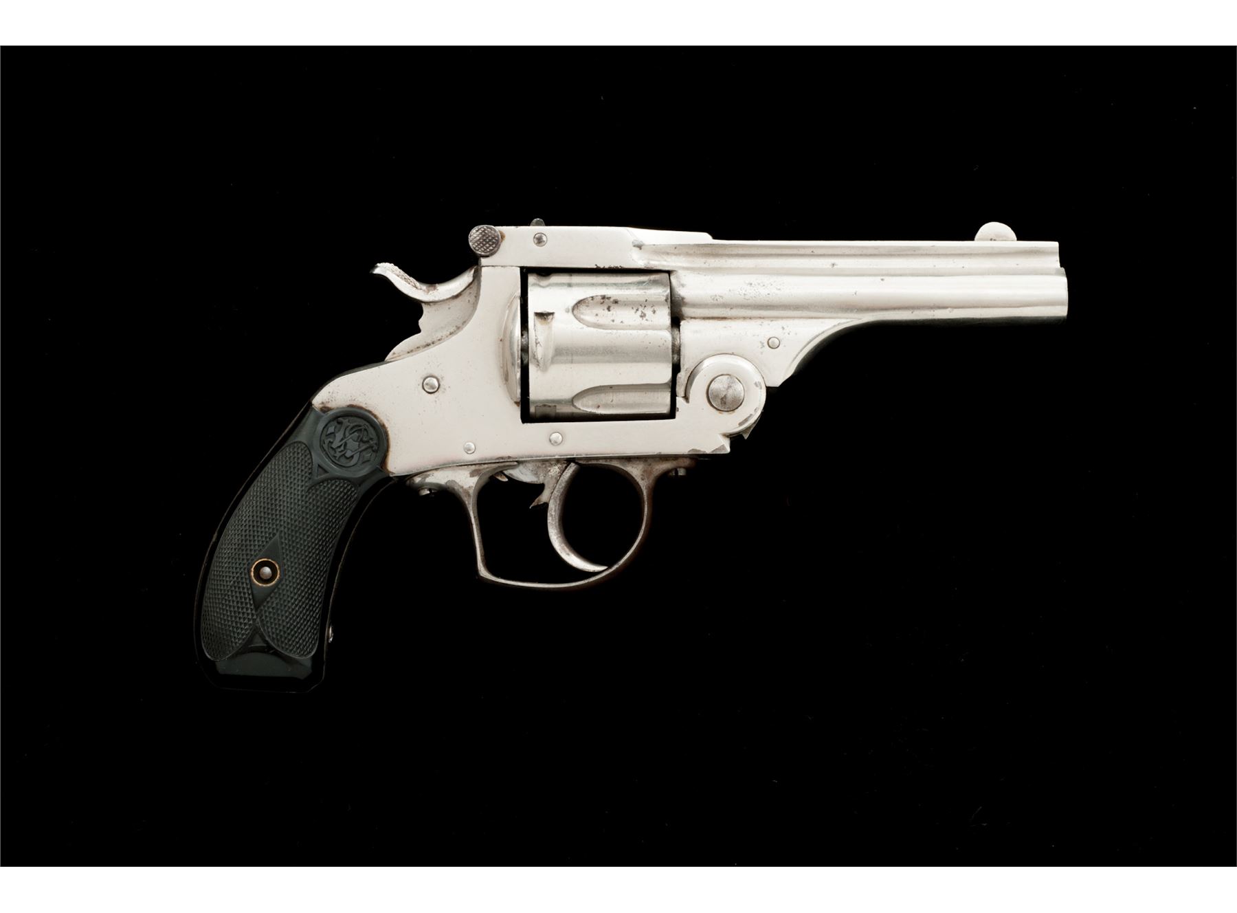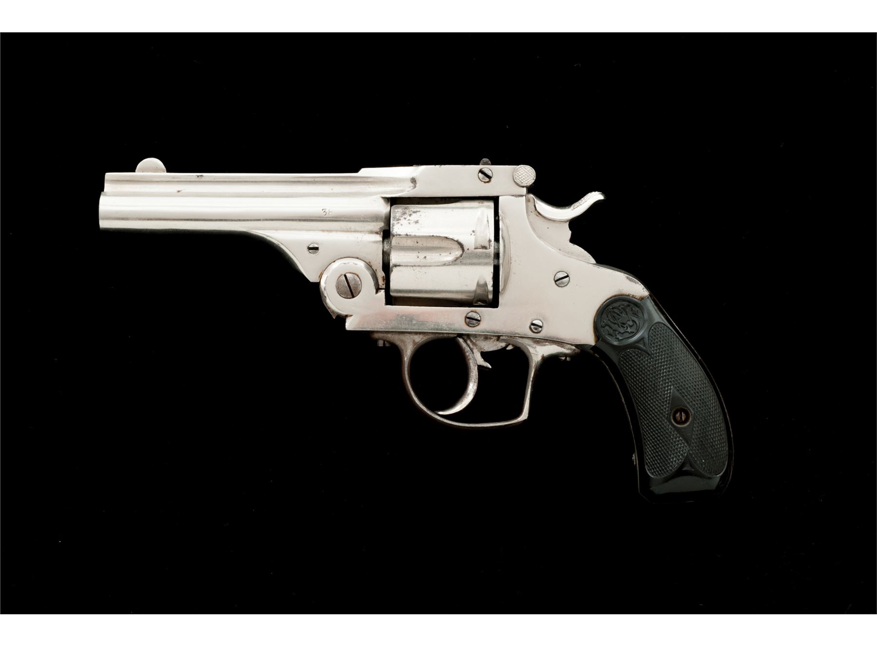 Belgian Copy of a Smith & Wesson Top-Break .38 Double Action Revolver, NVSN, .38 CF cal., 3.5'' round barrel, ''(star)/N'' proofmark, round 5-shot long-flute cylinder with automatic cartridge ejector marked with ''(star)/N'' and oval Li‚ge proofmarks on rear face; steel frame with large front barrel hinge and integral gripstraps; triggerguard with straight-back loop; two-piece finely-checkered hard rubber grips having the entwined ''S&W'' logo within a circular relief panel at top. Originally overall nickel-plated finish. Condition is near excellent retaining approx. 95% smooth nickel having a bit of roughness on forward edge of cylinder and two flutes and losses at front of triggerguard and barrel hinge area. Grips are excellent with sharp checkering and details and no cracks or chips. Solid barrel hinge; action is crisp and tight in both single- and double action; bore shows roughness with vague rifling. Est.: $250-$450. (C&R/PPT)