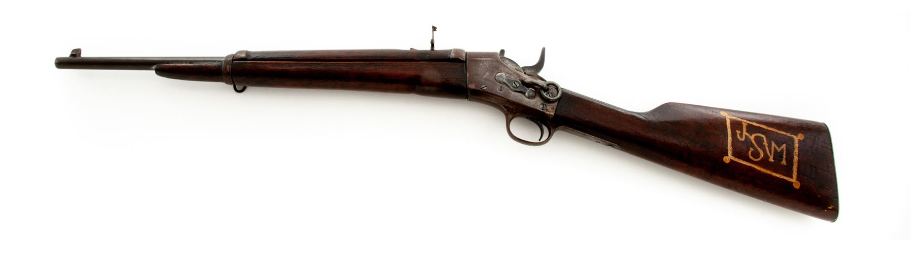 Remington Model 1897 Style Single Shot Rolling Block Action Military Saddle Ring Carbine, #60000, 7mm, 19'' round barrel with integral block-blade front and adjustable leaf rear sights is marked ''7MM - S M'' on top ahead of front barrel band; steel receiver with saddle bar and ring mounted on left side; steel furniture including single spring-retained barrel band with right-side-mounted sling swivel, front and rear upper handguard caps, and triggerguard; three-piece oil-finished hardwood handguard, forestock, and buttstock with right-side sling swivel and buttplate. Mfg'd 1897-1917. It is likely that this carbine was assembled by a foreign military armory utilizing Remington-made parts, which accounts for its caliber and lack of maker's marks. Condition is good to very good, the barrel having a blue-brown patina and the other steel parts an overall mostly smooth gunmetal-brown. Stocks are sound showing the expected marks of military use, with large initials ''JSM'' engraved into left buttstock and infilled with yellow-tan paint, and with a later heavy coat of varnish. Action is smooth and sure; bore is clean with deep rifling. Est.: $300-$400. (C&R)