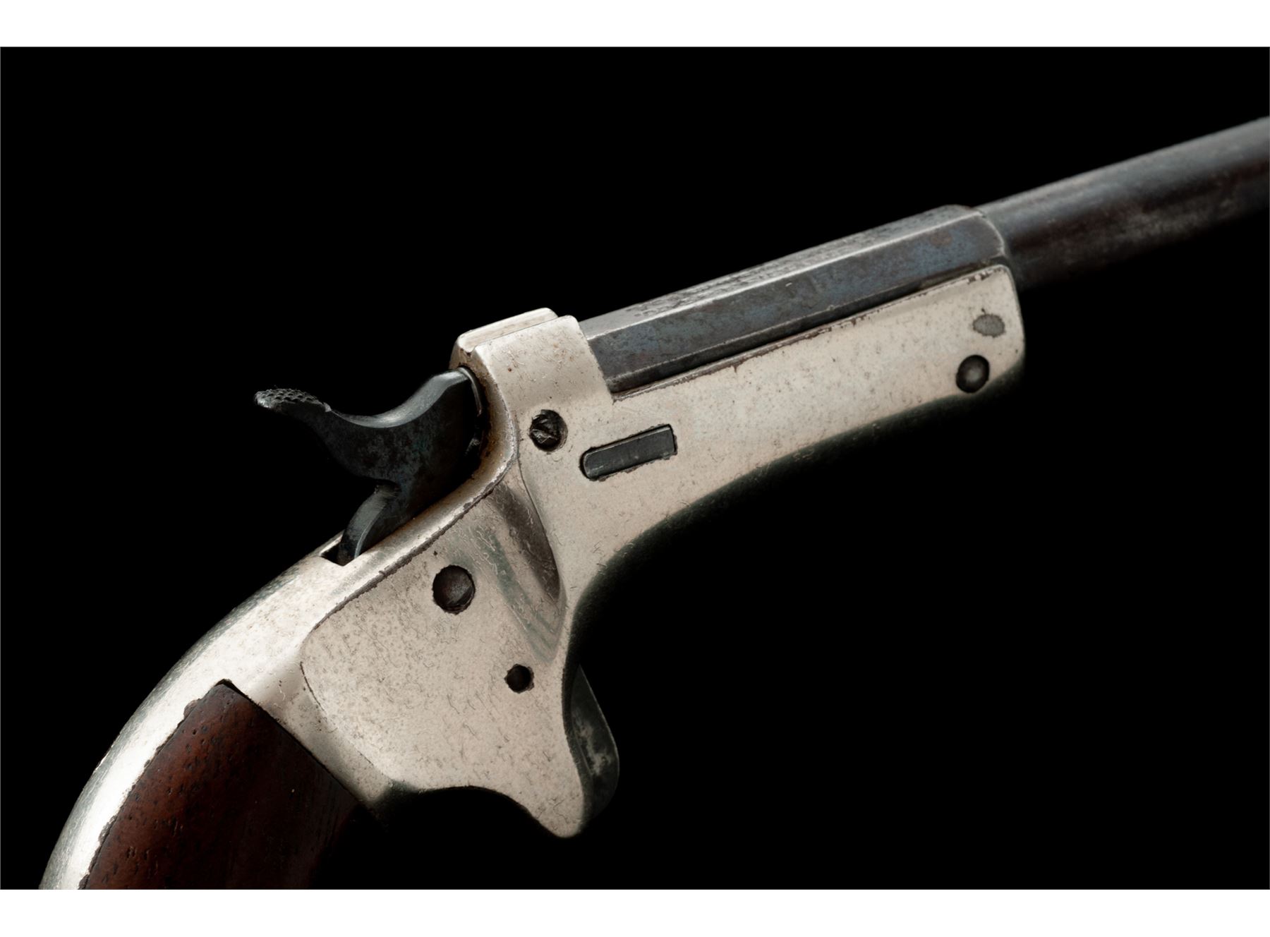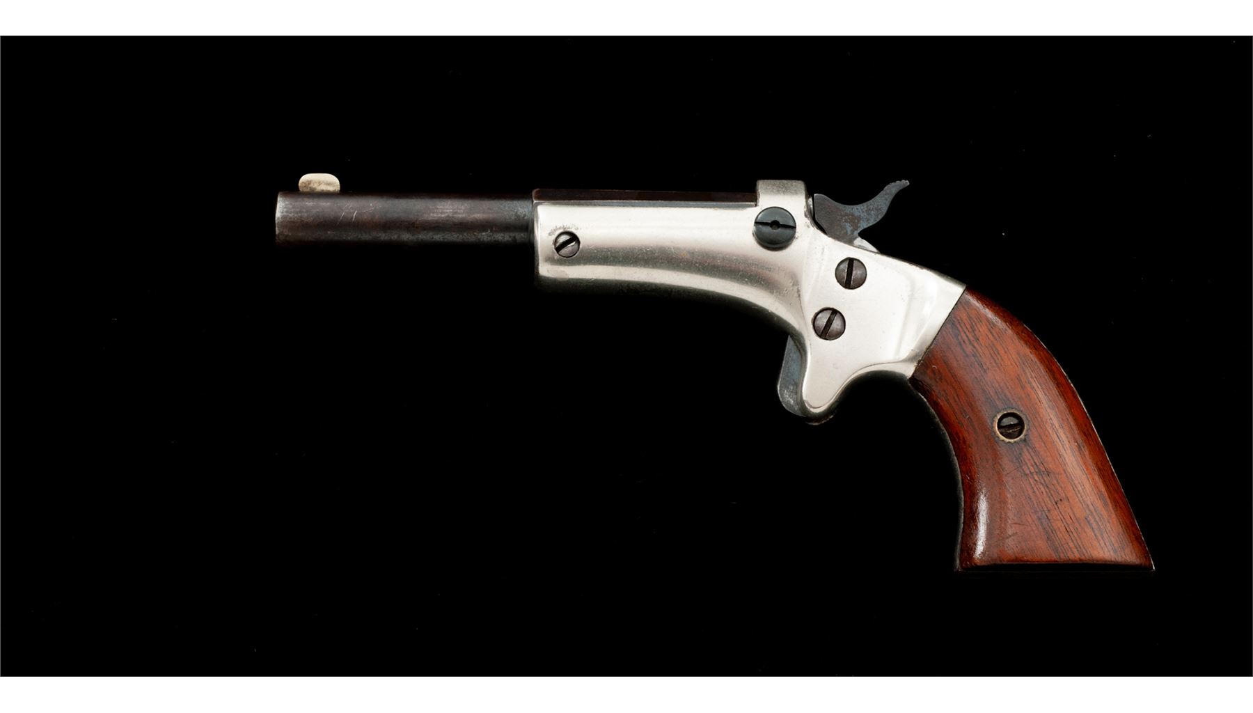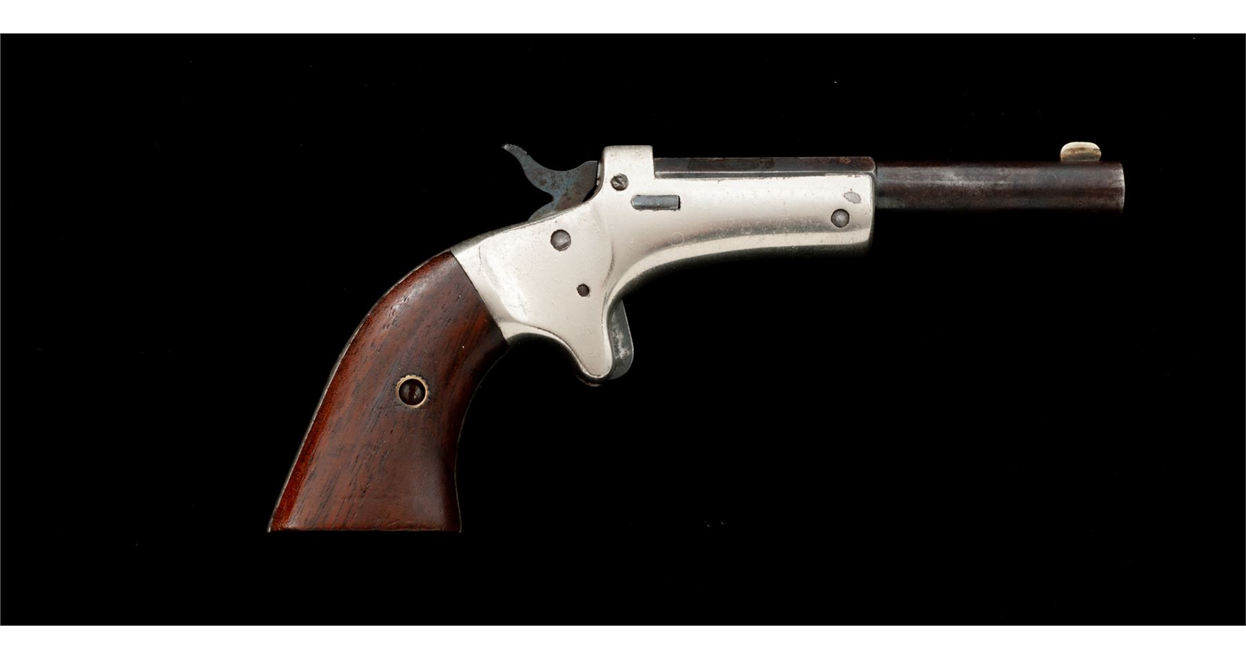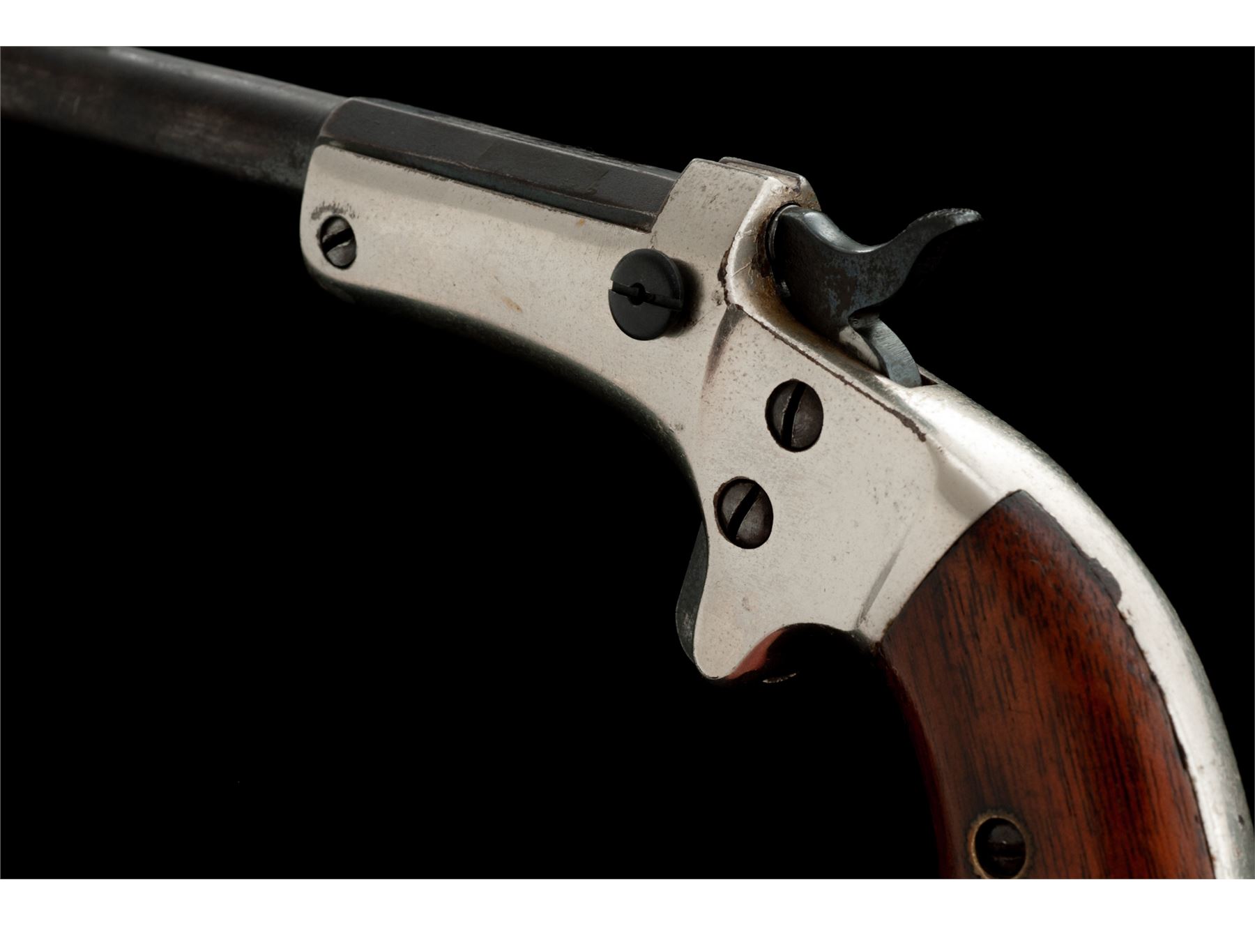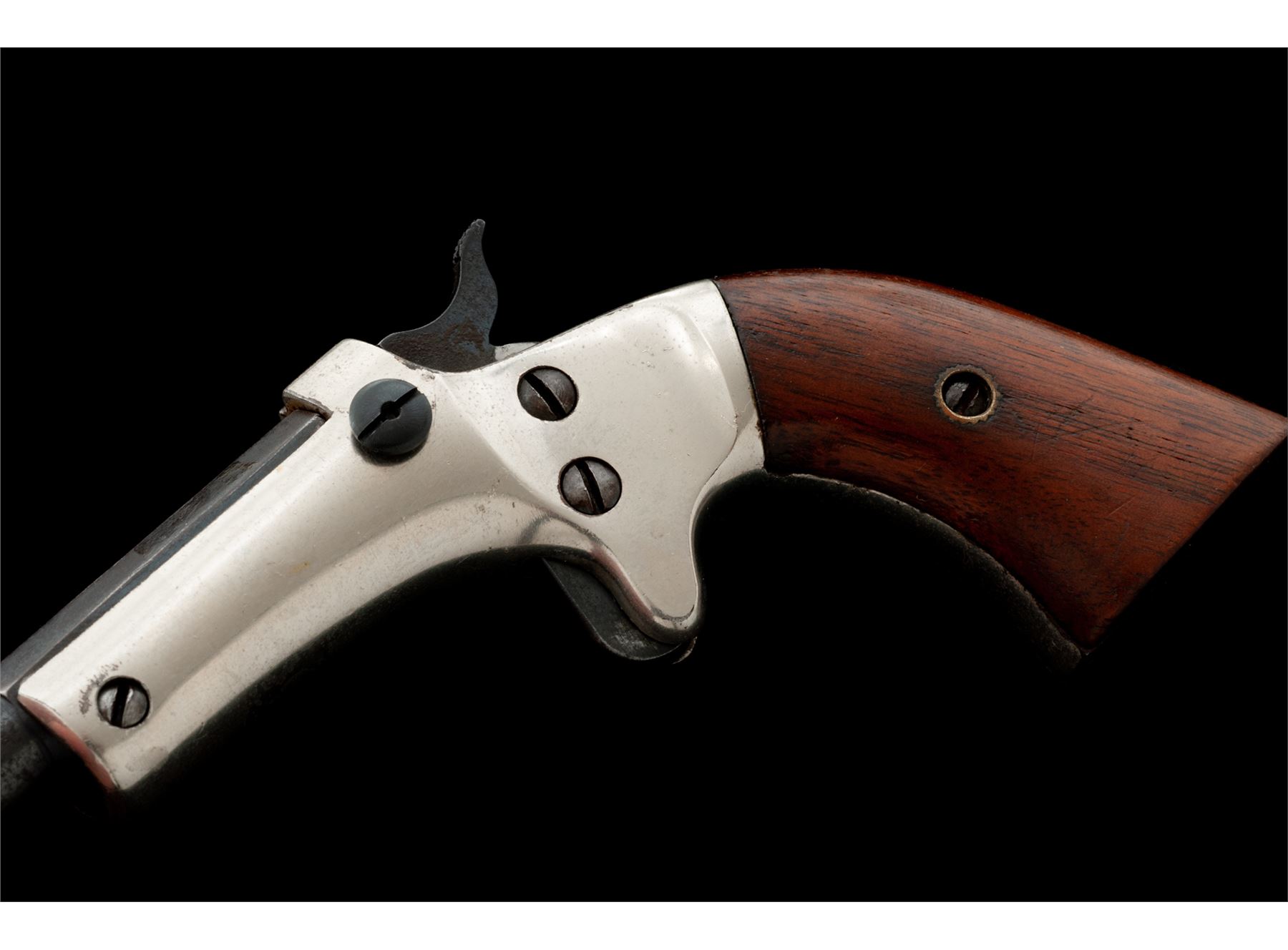 Stevens No. 41 Tip-Up 5th Model Single Shot Spurtrigger Pocket Pistol, #88571, .22 RF cal., 3.5'' round barrel marked on top ''J. Stevens A. & T. Co./Chicopee Falls, Mass. U.S.A.'' in two lines, with automatic lower ejector, spurtrigger, floating firing pin in steel frame with integral grip straps, and two-piece varnished walnut grips. Condition is excellent retaining approx. 96% original nickel plating to frame and gripstraps (very slight lifting along backstrap); barrel shows an aging/darkening blue color. Grips are smooth, unblemished and fit well. Action is smooth and sure; bore is dark. Est.: $200-$300. (C&R/PPT)