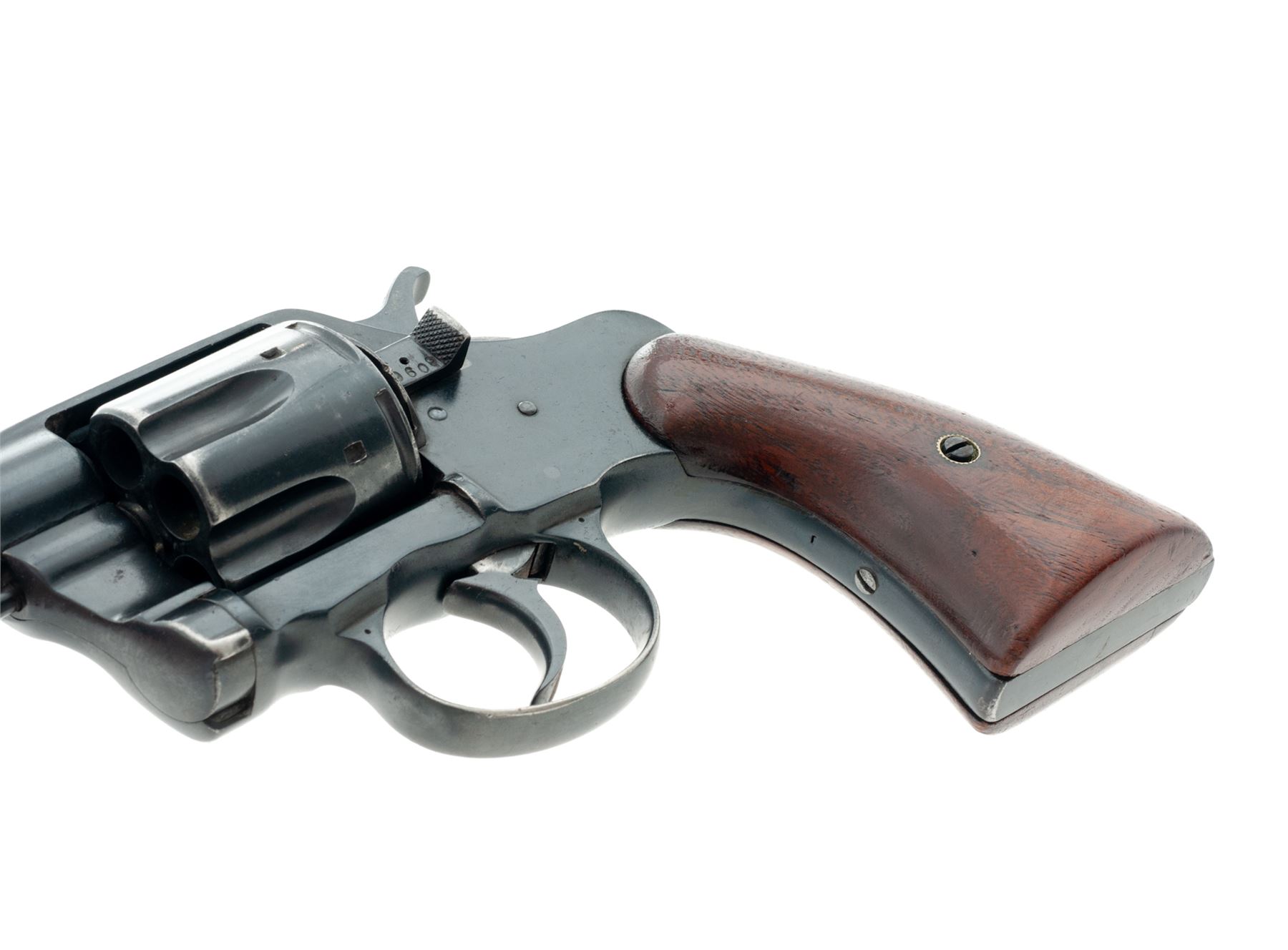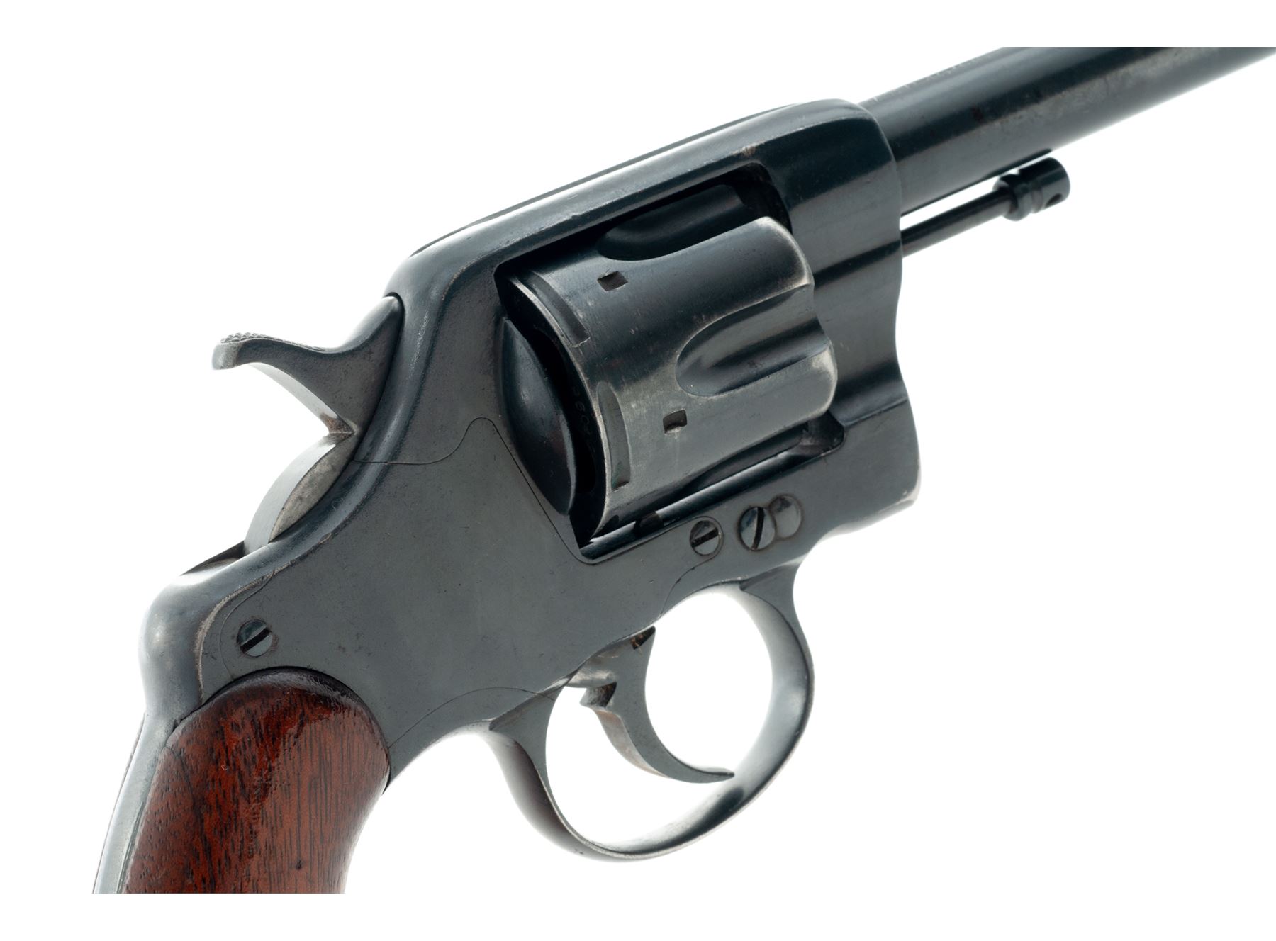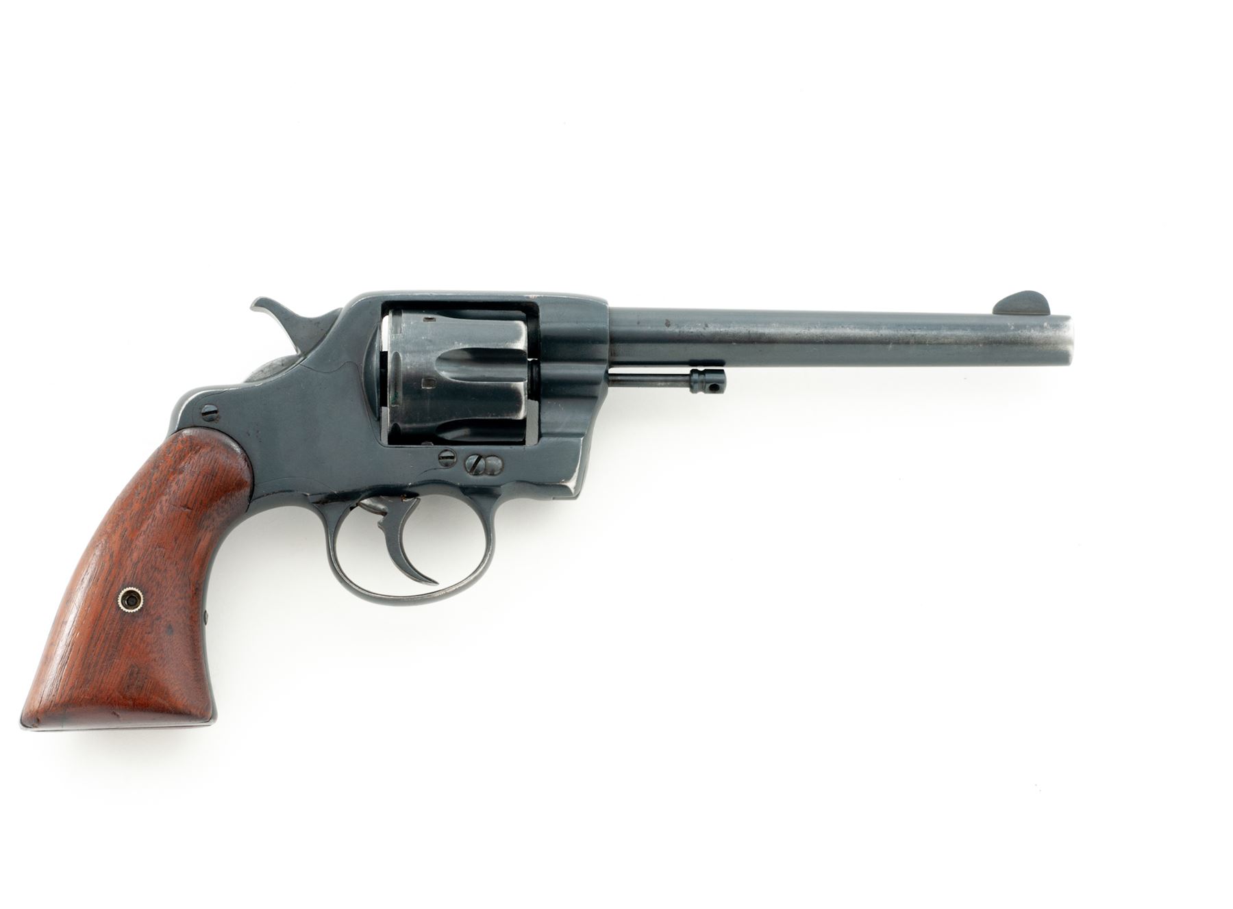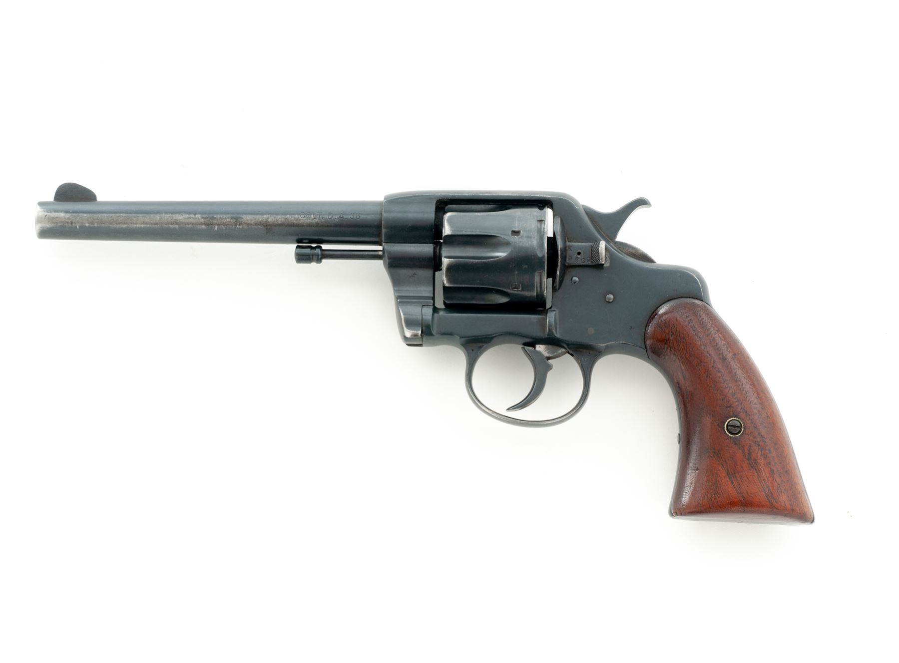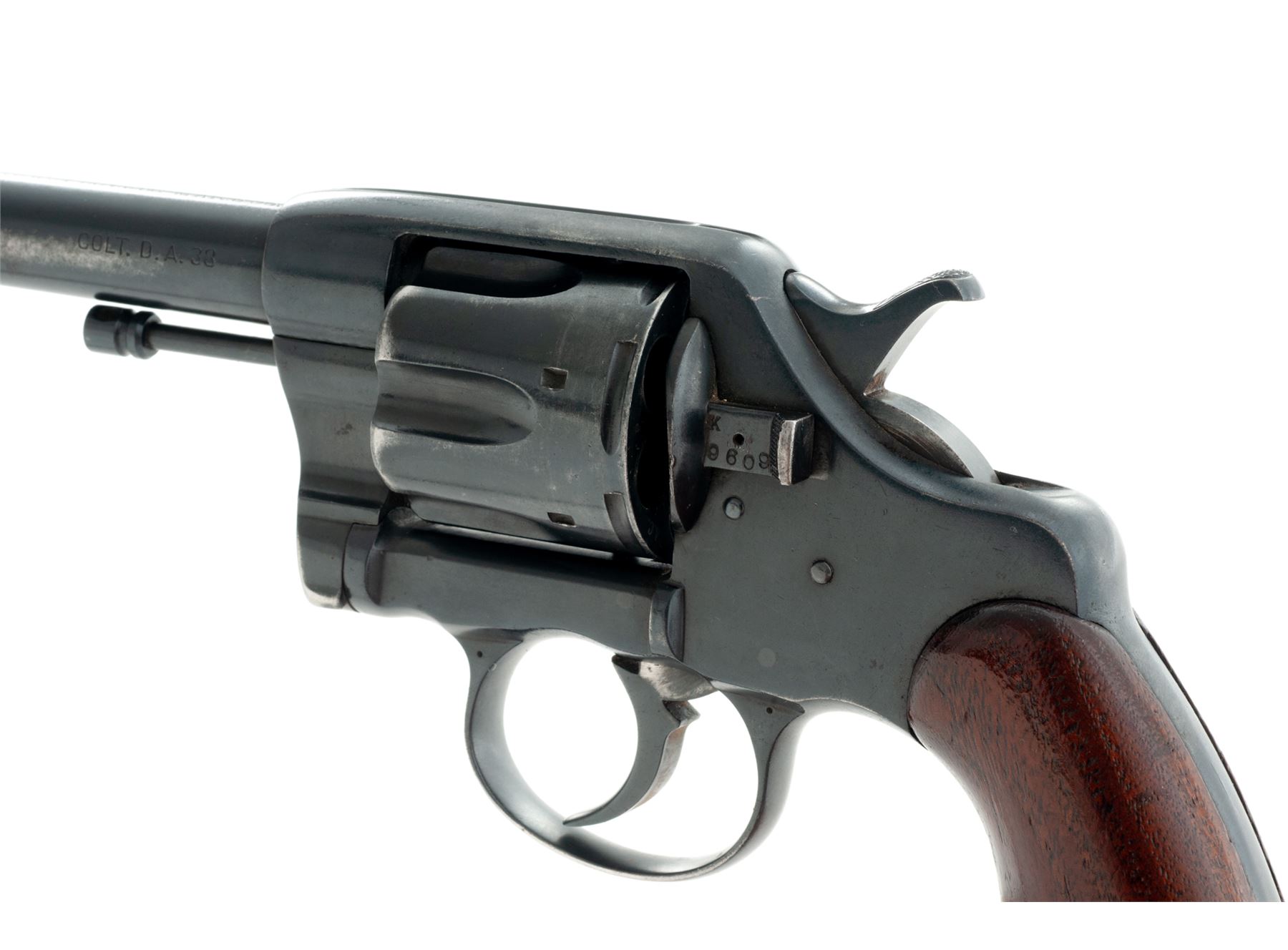 Colt Model of 1895 Double Action Revolver, #9609, .38 Colt CF cal., 6'' barrel and fitted with a tall blade front sight; 6-shot ''swing-out'' cylinder with short flutes has ''K'', ''9609'' and ''RAC'' (Rinaldo A. Carr) military inspector's mark on rear face and features automatic cartridge ejection via a sliding cylinder axle; solid frame (with top groove rear sight, sliding cylinder release and integral triggerguard having a dot on each left-side bow) marked ''10'' under left grip; two-piece oil-finished walnut grips. Mfg'd 1895. Serial numbers match on frame (also marked ''W'' and ''2''), cylinder crane (also marked ''K'') and sliding cylinder release (also marked ''K'' and with a dot); all markings are legible. Condition is very good retaining most of a satin blackish military style finish that may be original; grips are solid and smooth. Action is crisp in both single- and double-actions; bore is clean with defined rifling. This revolver presents somewhat of an enigma, as it bears the ''RAC'' military inspector's marks and military style plain walnut grips, but no Army or Navy contract markings; likely it was an overrun revolver sold on the civilian market. It is also notable for being one of the earliest swing-out cylinder Colt models. Est.: $300-$500. (Antique)