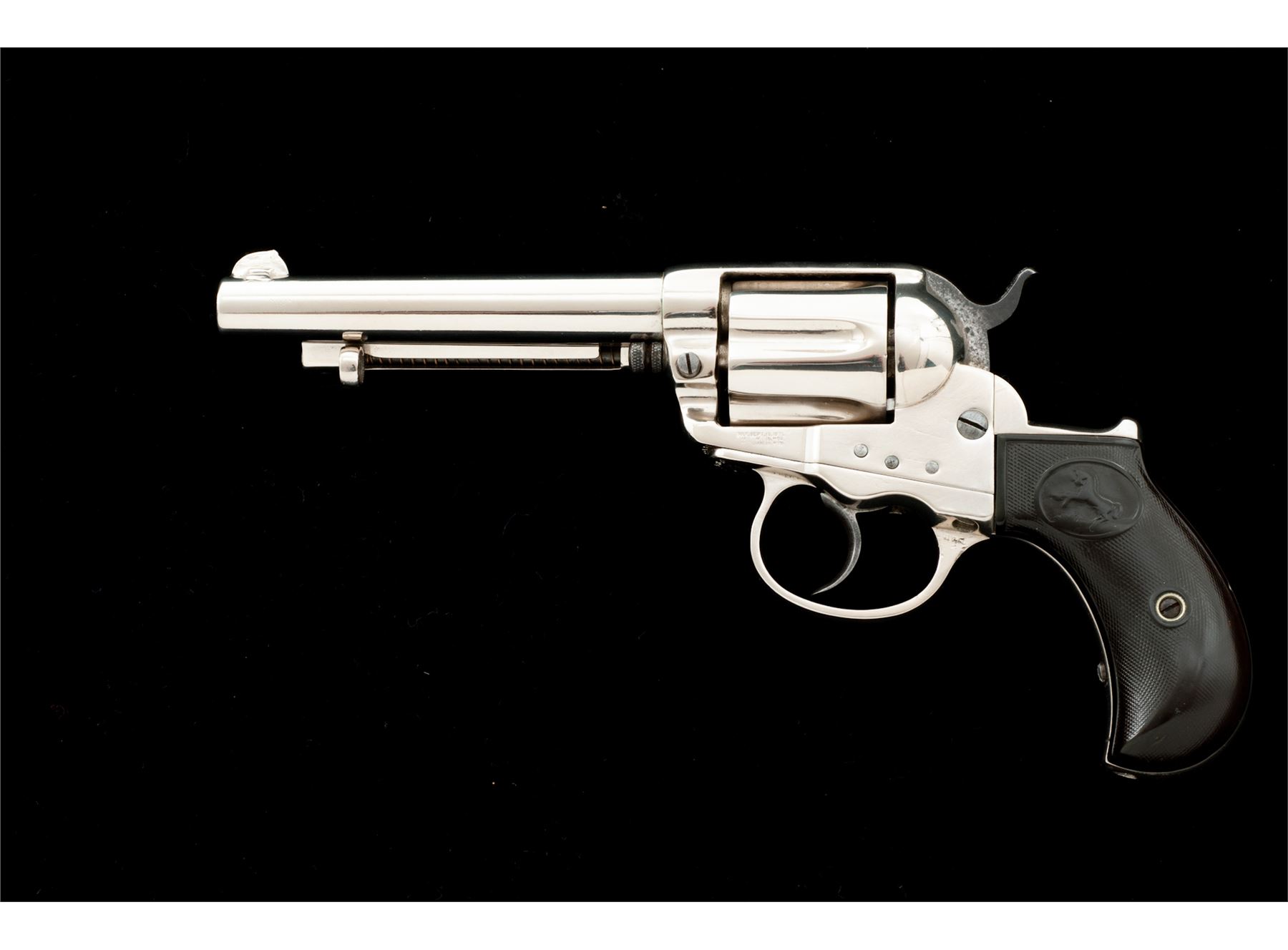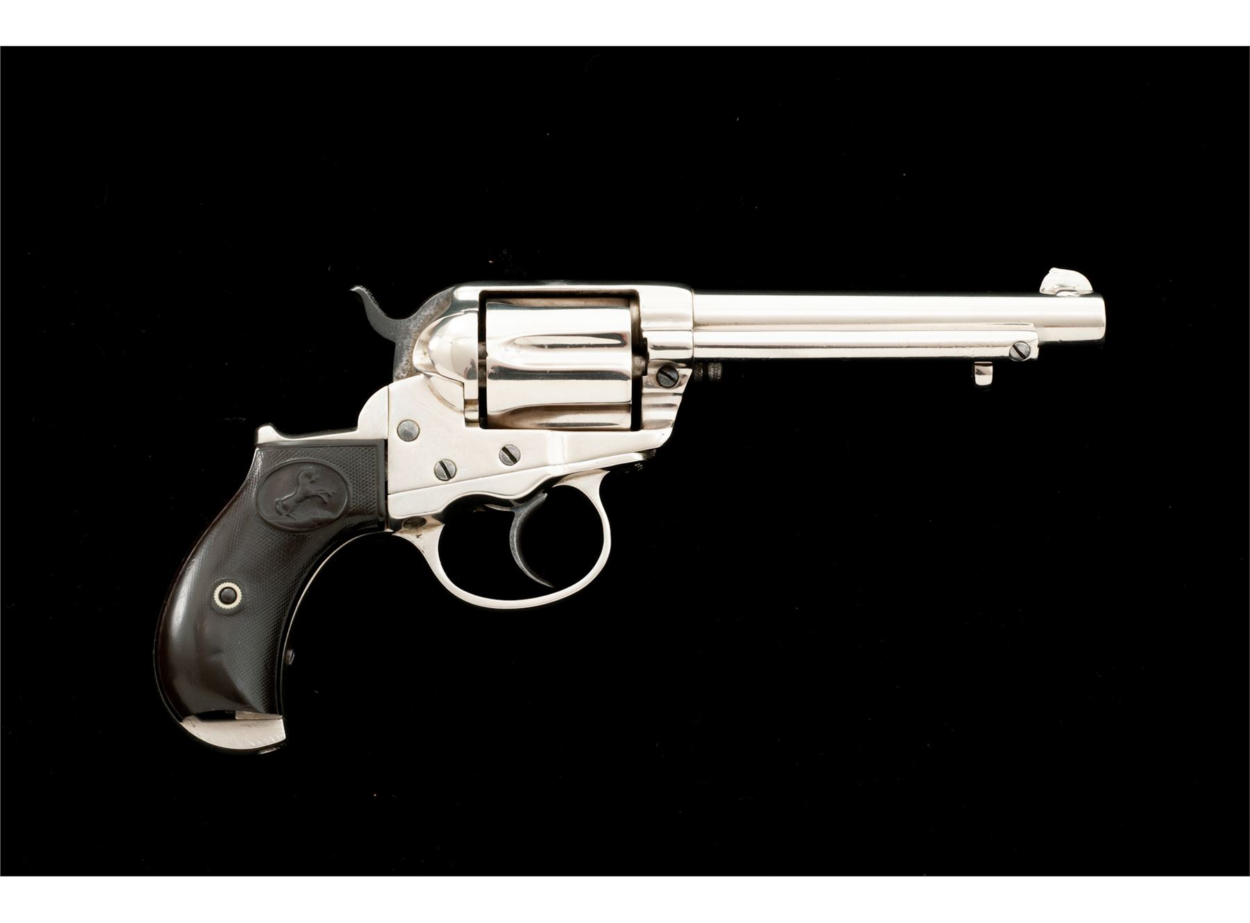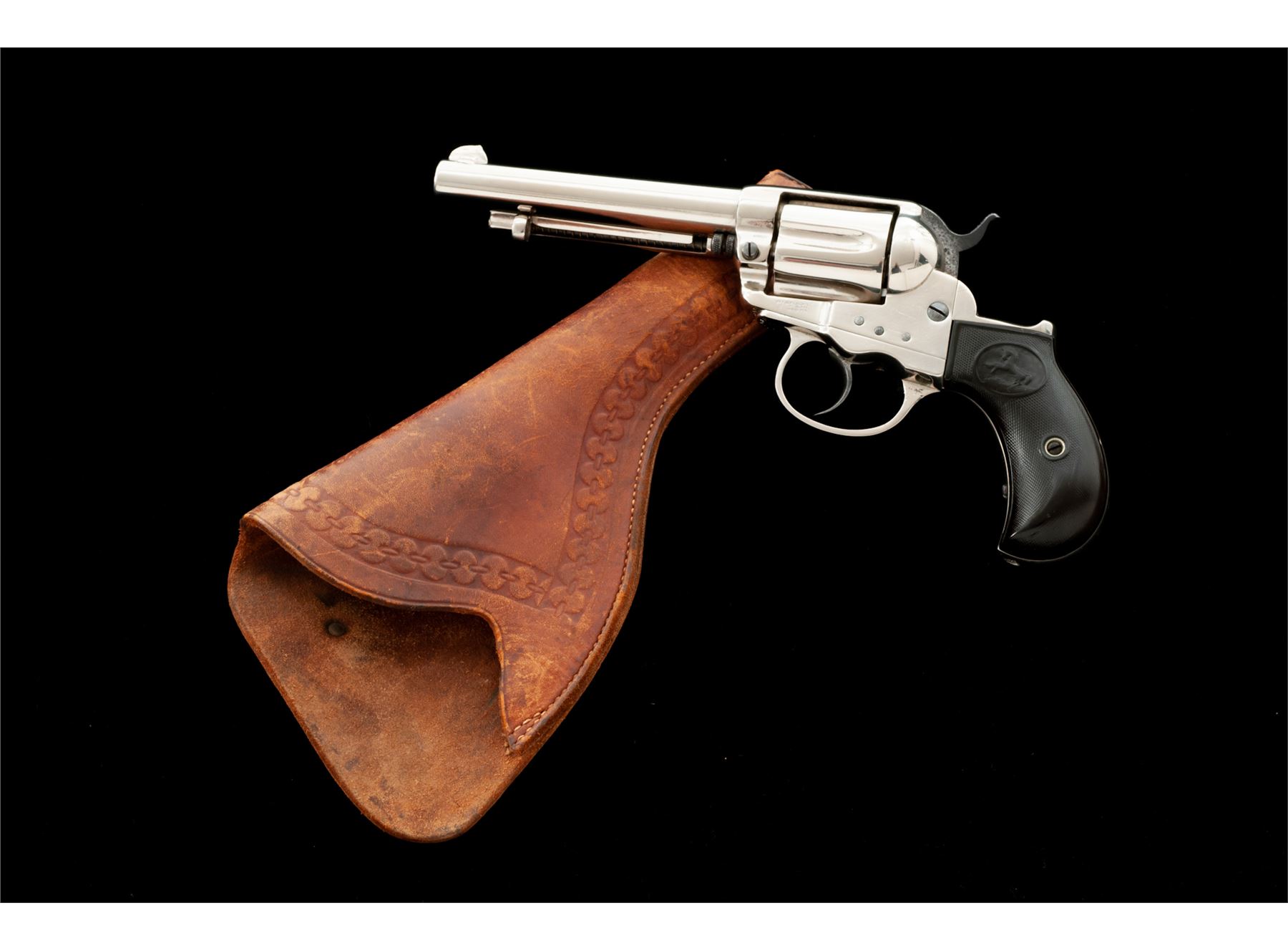 Colt Model 1877 ''Lightning'' Double Action Revolver, with holster, #32538, .38 Colt CF cal., 4-5/8'' barrel with ejector, 6-shot fluted cylinder, loading gate correctly batch numbered ''17'', two-piece checkered hard rubber ''bird's head'' grips having the ''Rampant Colt'' logo within an oval at top. Mfg'd 1881, likely in full nickel-plated finish as here presented. Condition is good retaining most of a re-nickeled finish (except hammer with approx. 40% bright blue and polished sides), with softened but clear markings. Hard rubber grips show smooth wear to checkering and Colt logo with a large chip out at bottom right side. Action is surprisingly crisp in both single- and double actions; bore is clean with discernible rifling. Tooled russet leather holster is in very good condition showing light age and is marked ''38'' (caliber) and ''6'' (barrel length) on rear belt loop. Est.: $350-$550. (Antique)