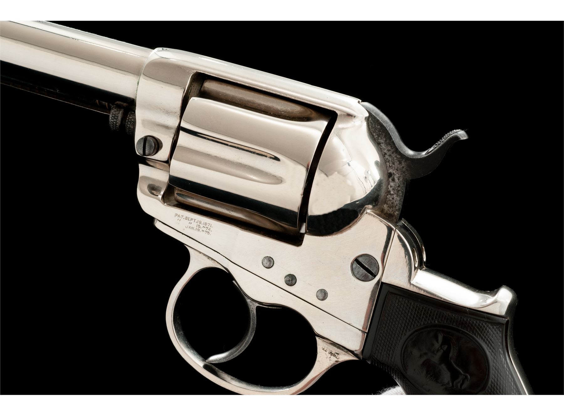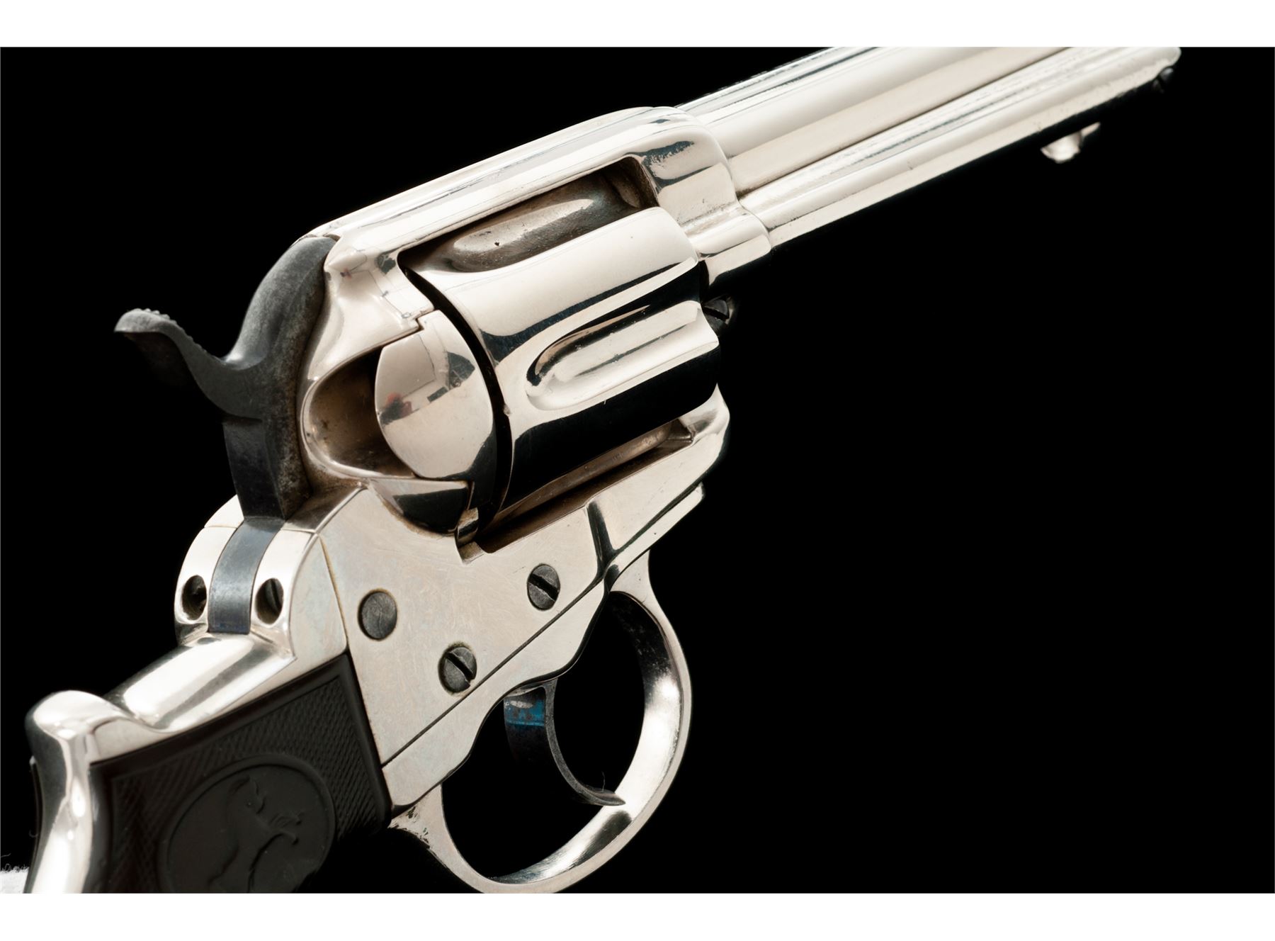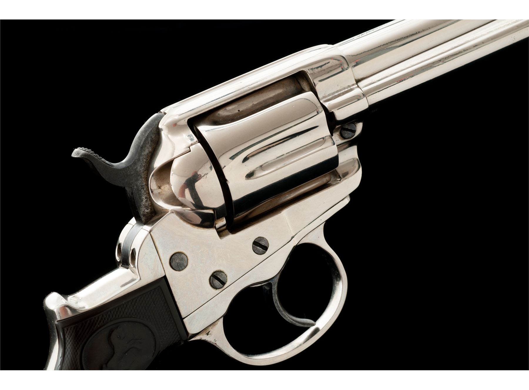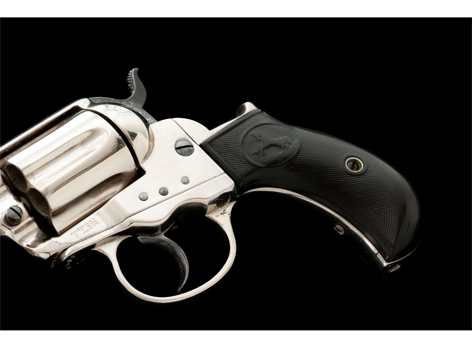 Colt Model 1877 ''Lightning'' Double Action Revolver, with holster, #32538, .38 Colt CF cal., 4-5/8'' barrel with ejector, 6-shot fluted cylinder, loading gate correctly batch numbered ''17'', two-piece checkered hard rubber ''bird's head'' grips having the ''Rampant Colt'' logo within an oval at top. Mfg'd 1881, likely in full nickel-plated finish as here presented. Condition is good retaining most of a re-nickeled finish (except hammer with approx. 40% bright blue and polished sides), with softened but clear markings. Hard rubber grips show smooth wear to checkering and Colt logo with a large chip out at bottom right side. Action is surprisingly crisp in both single- and double actions; bore is clean with discernible rifling. Tooled russet leather holster is in very good condition showing light age and is marked ''38'' (caliber) and ''6'' (barrel length) on rear belt loop. Est.: $350-$550. (Antique)