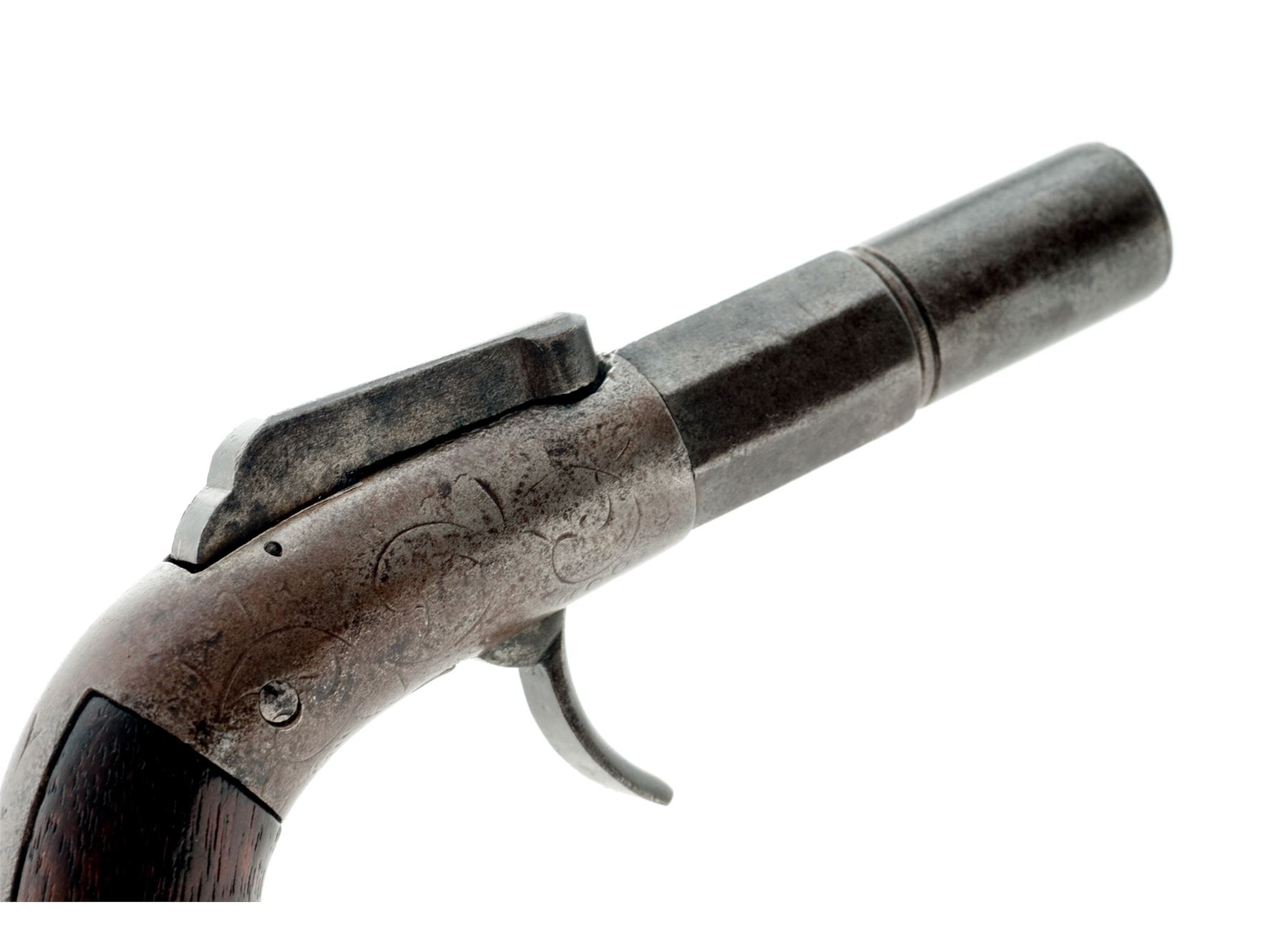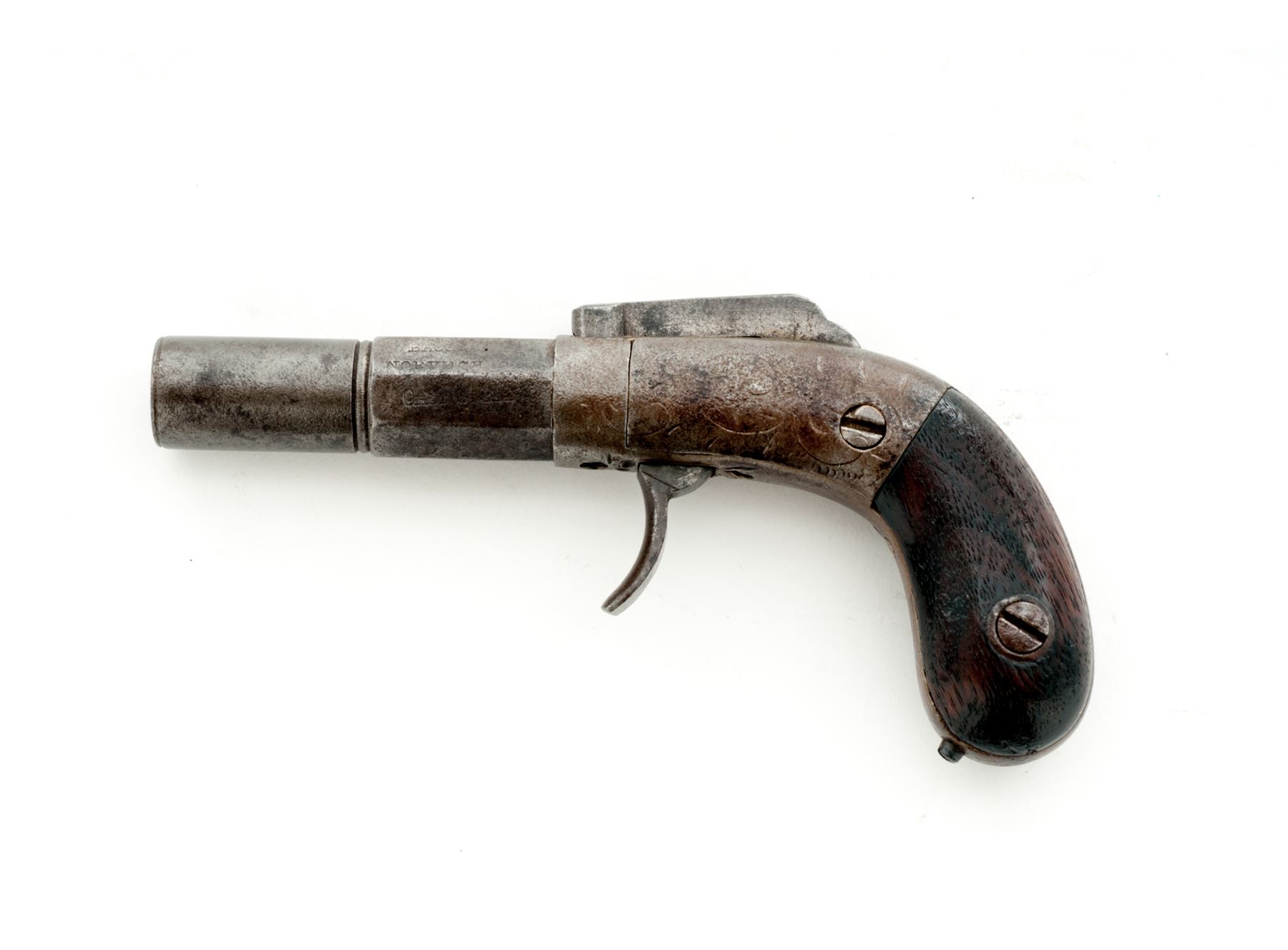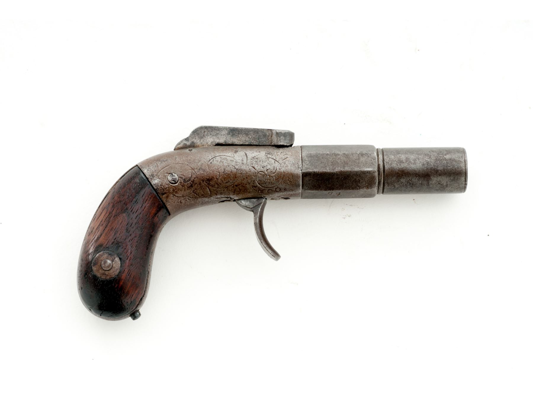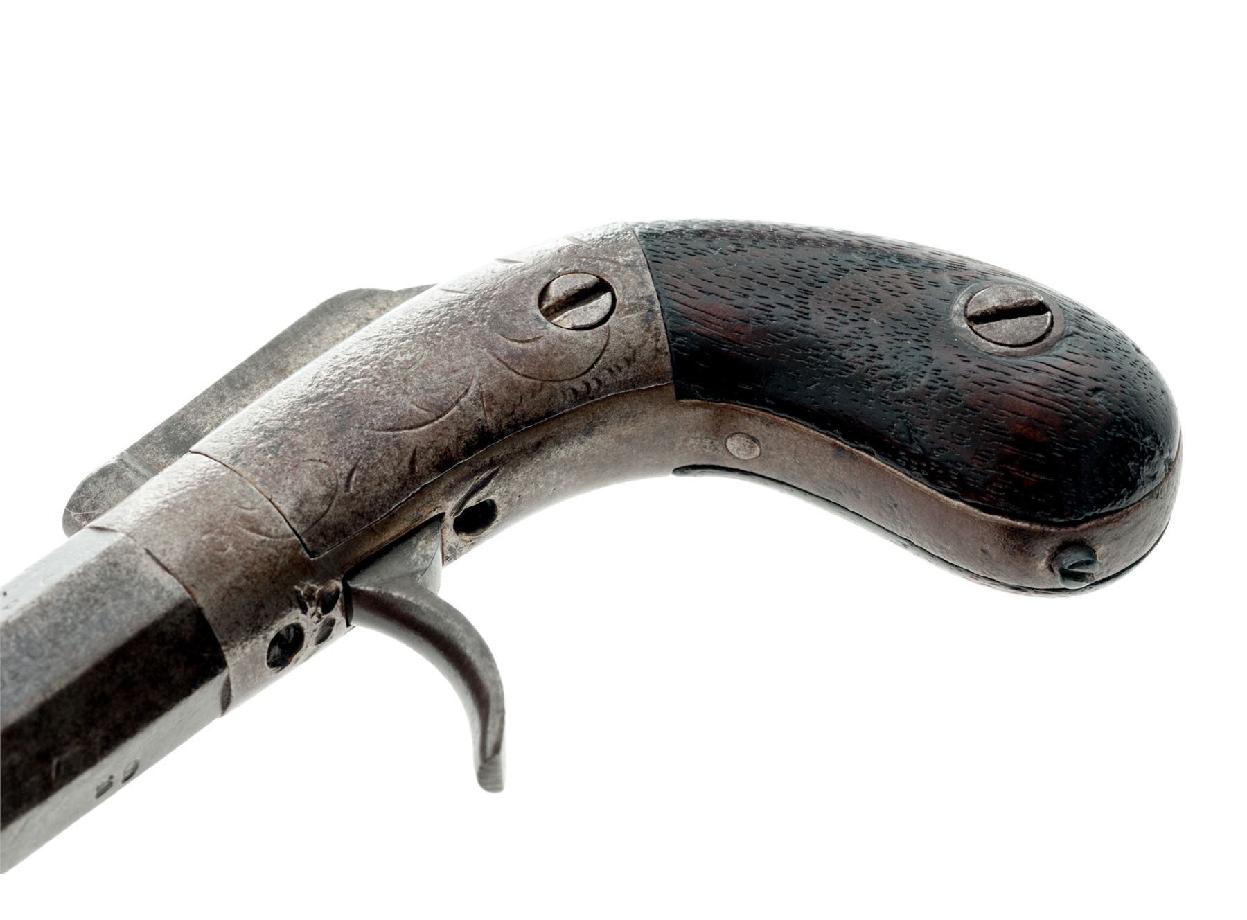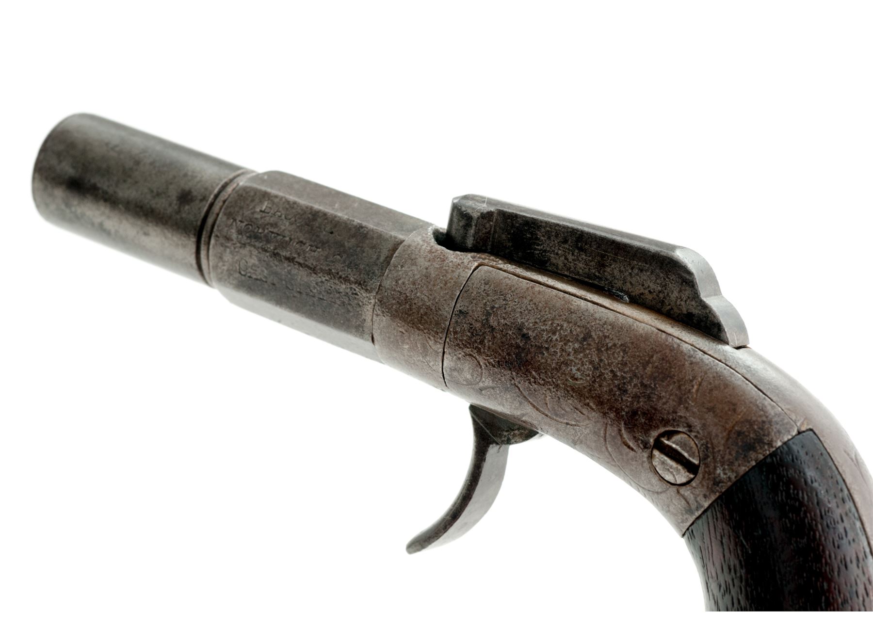 Antique Bacon Single Shot Bar Hammer Double Action Percussion Pocket Pistol, #68 (or #89), .31 cal., 2'' octagon-to-round barrel marked ''Bacon & Co./Norwich CT/Cast Steel'' on left two flats, lightly floral engraved frame and backstrap, walnut bag grips. Condition is good showing no original finish, worn engraving and light pitting to steel (mostly to left side), missing triggerguard. Grips are smooth and undamaged. Action functions; bore appears clean. A quite rare and collectible American pocket pistol in this small frame size and with its short 2'' barrel, of which only about 100 were made in the 1850s. Est.: $150-$250. (Antique)