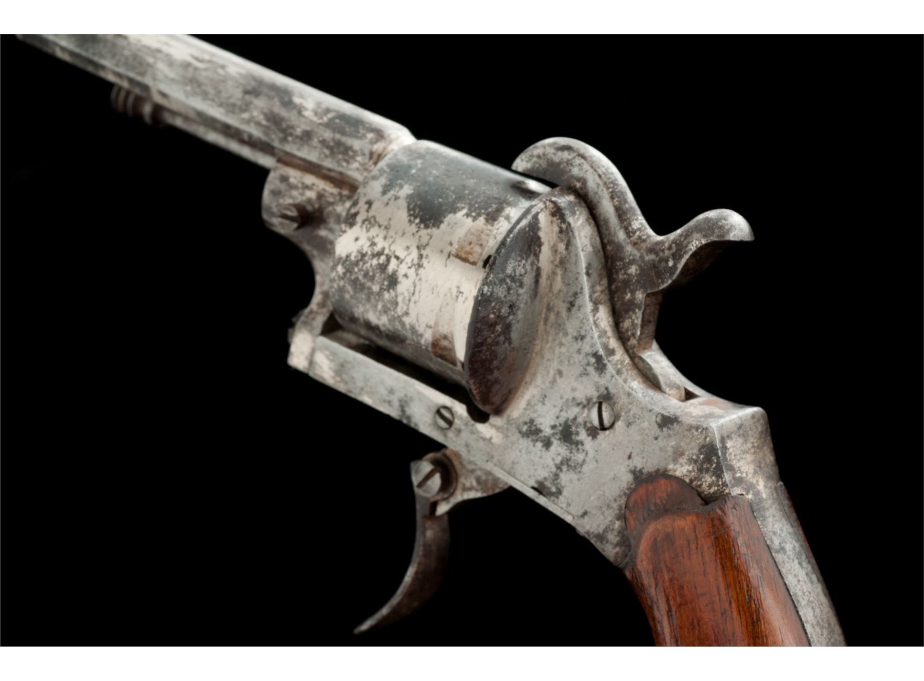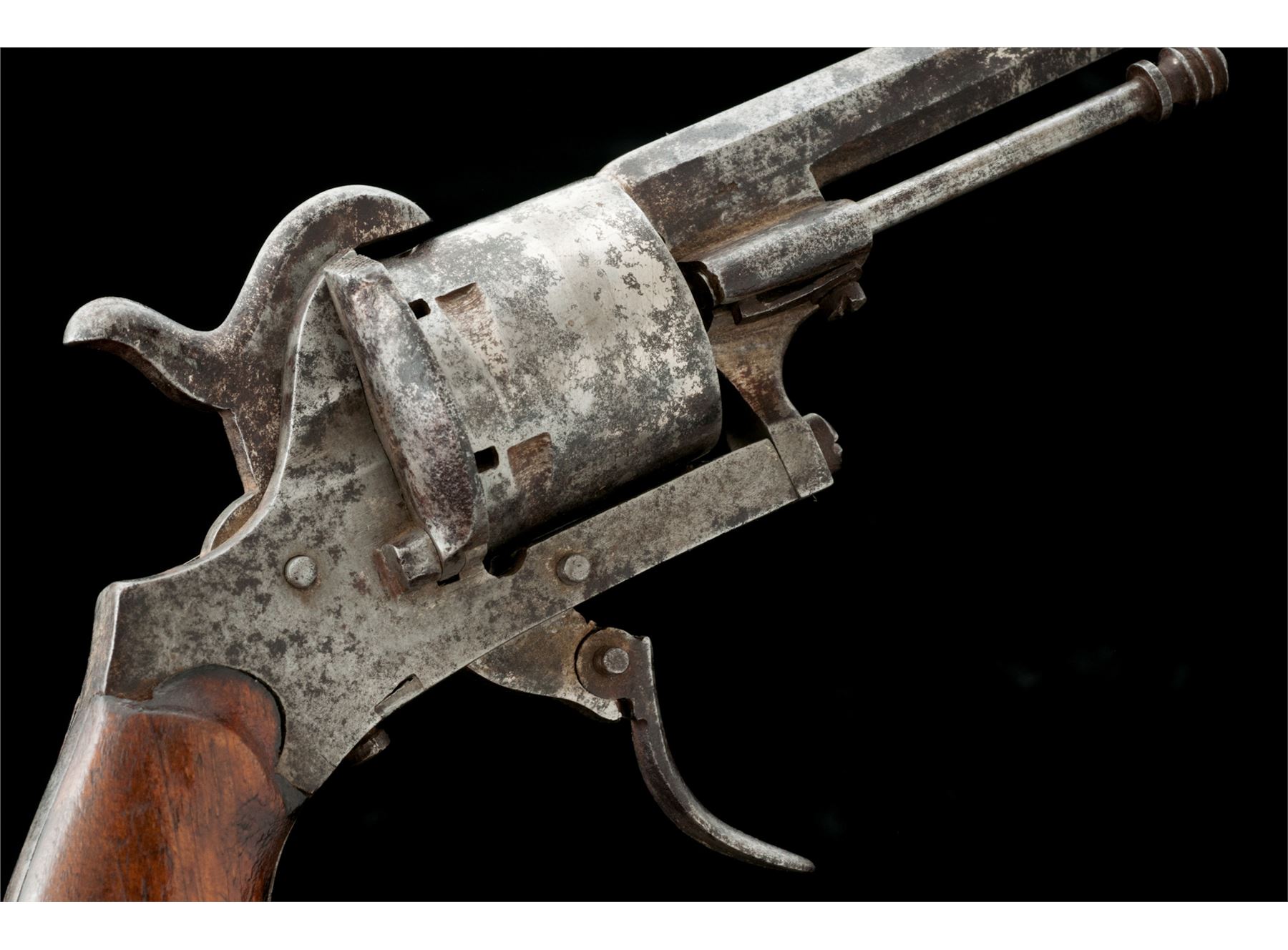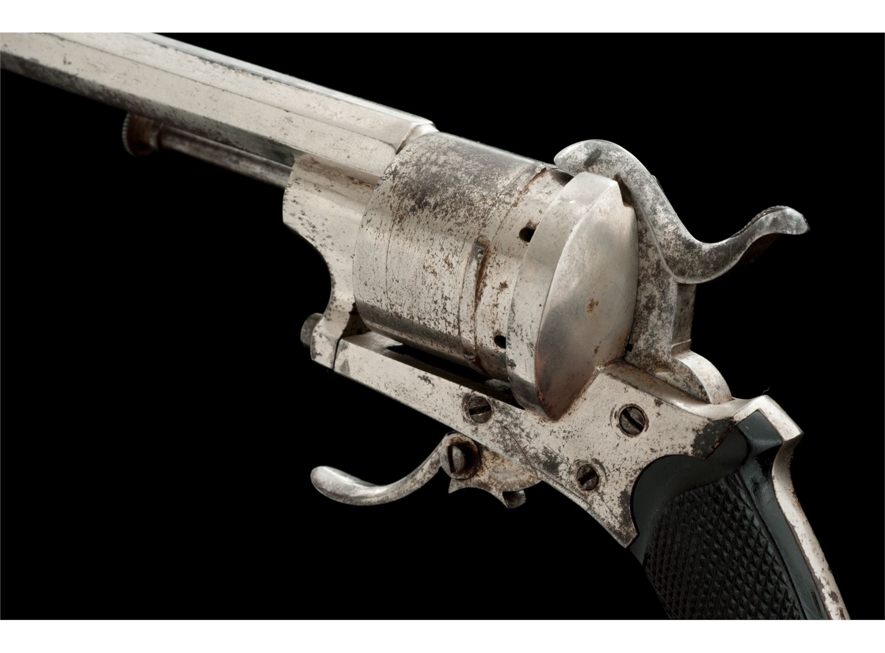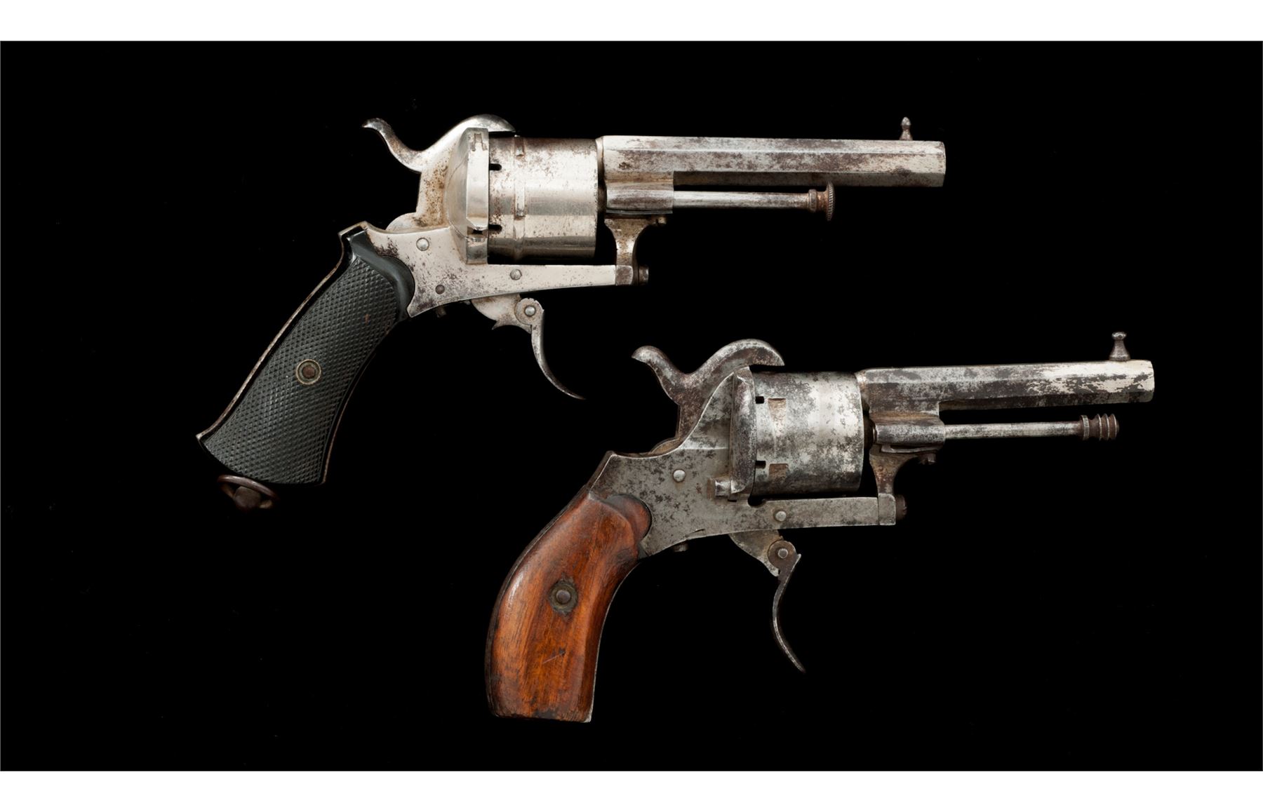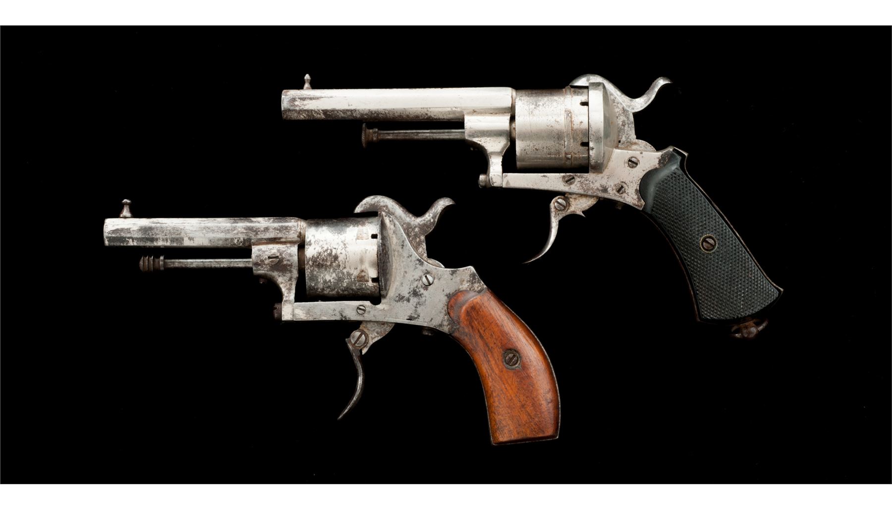 Lot of Two (2) Antique European Pinfire Pocket Revolvers: (1) NVSN, 7mm cal., 3-7/16'' octagonal barrel with distinctive high post front sight, hammer notch rear sight and single proofmark on right flat, right side cartridge ejector rod with knurled head, hinged loading gate, 6-shot round cylinder, folding trigger, checkered two-piece black hard rubber grips with lanyard ring at butt. Unmarked as to maker. Condition is fine retaining approx. 70% original nickel plating mixed with darkening and minor erosion that should clean; grips are quite nice with sharp checkering and no chips or cracks. Action is crisp; bore appears dirty with faint rifling. (2) NVSN, 7mm, 2-7/8'' octagonal barrel with distinctive turned front sight, no rear sight, right side cartridge ejector rod with fluted head, hinged loading gate marked ''M (rest illegible)'', 6-shot round cylinder, folding trigger, plain two-piece varnished hardwood grips. Unmarked as to maker. Condition is good retaining approx. 10% original nickel plating mixing with discoloration and erosion in places; grips show marks, minor chipping at one toe and much original varnish. Action functions; bore is dark. Est.: $250-$450/Lot. (Antique)
