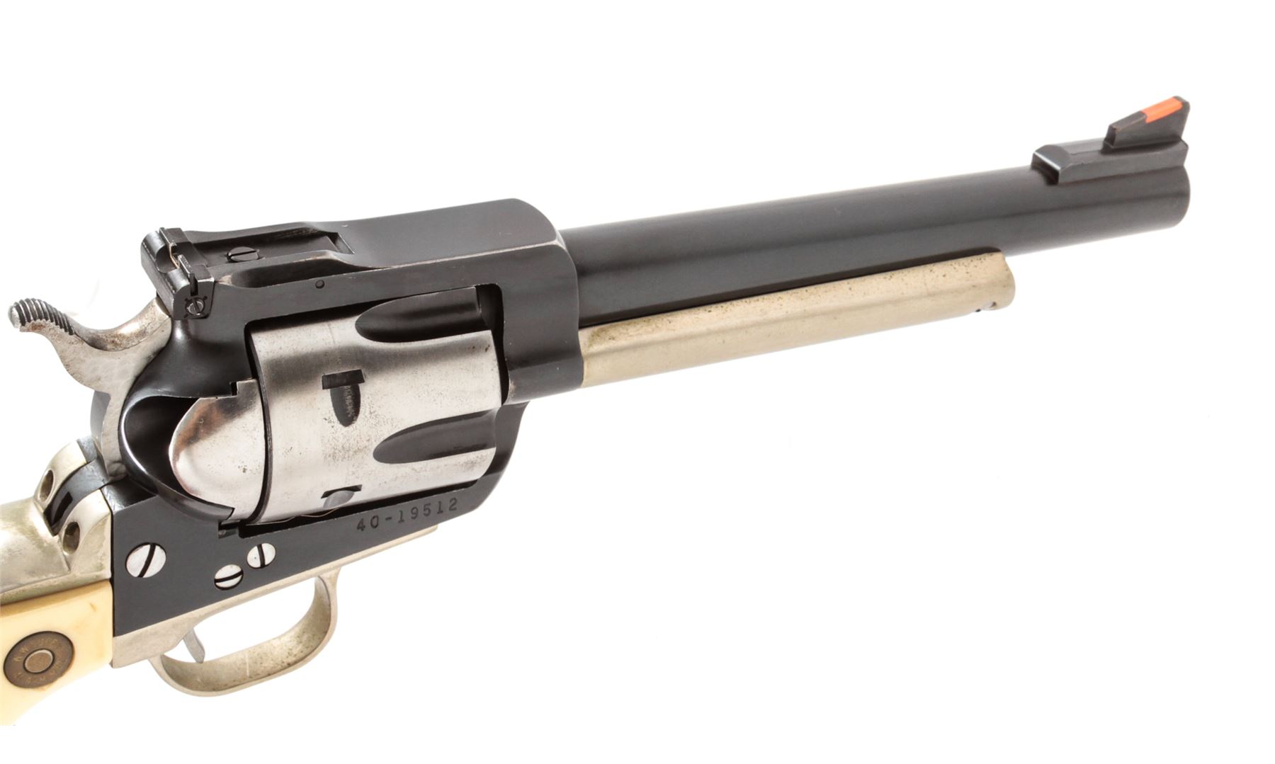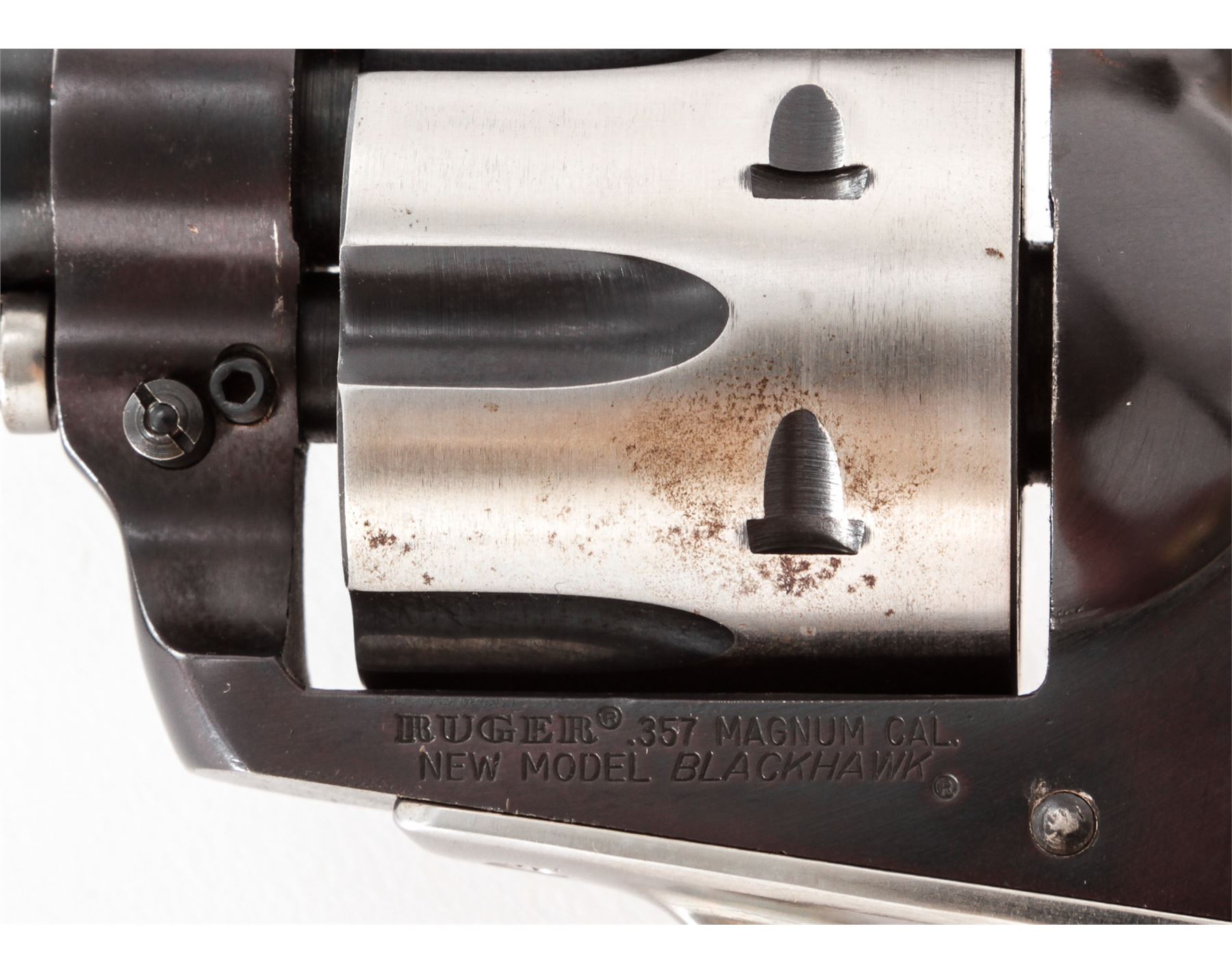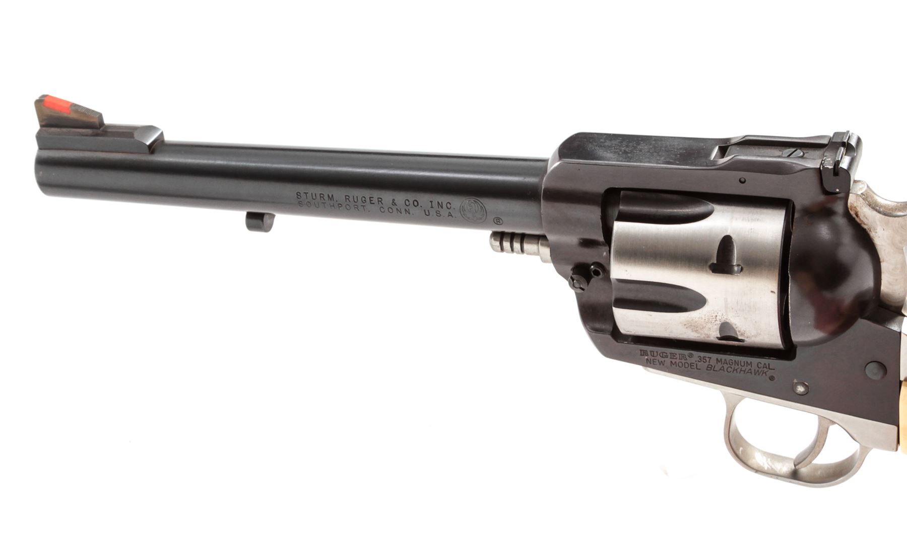 Ruger New Model Blackhawk Single Action Revolver, #32-87115, .357 mag. cal., 6.5'' barrel, blue finish, polished backstrap, triggerguard and cylinder, faux ivory grips with .357 mag. medallions. Condition is excellent as shooter modified with machine-turned hammer, red ramp and white outline front and rear sights, good grips with tuned action, fine bore. Est.: $450-$600. (Modern/PPT)