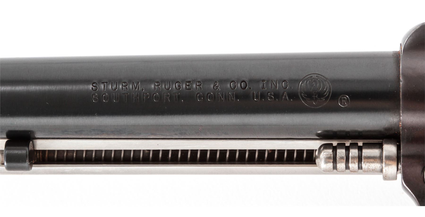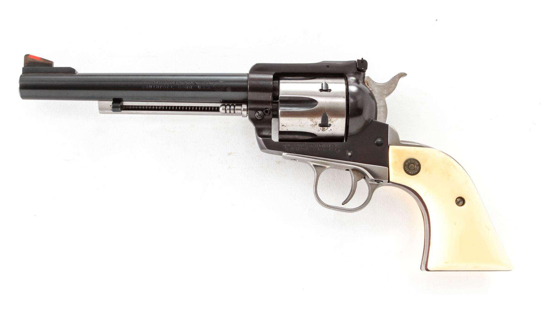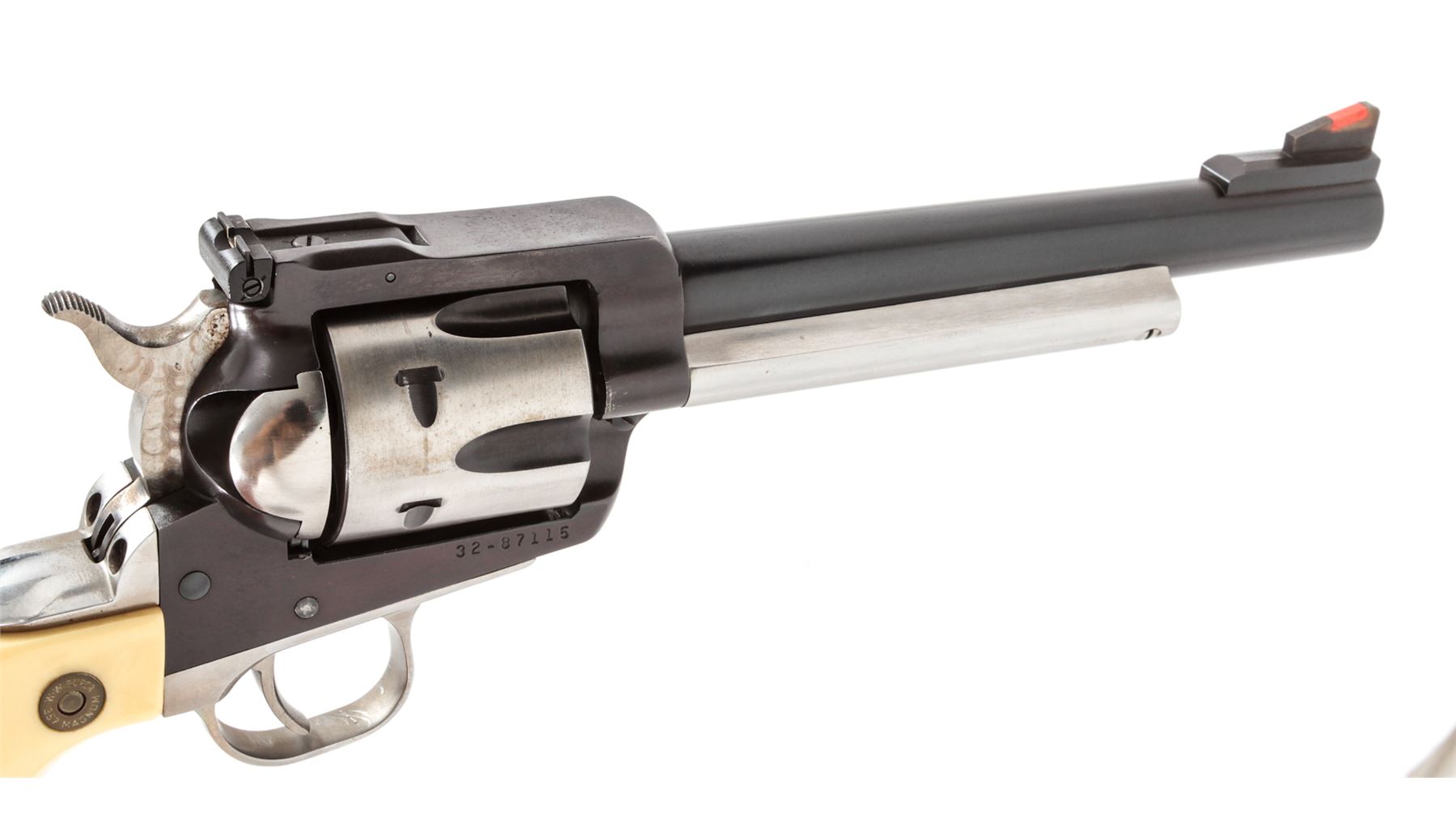 Ruger New Model Blackhawk Single Action Revolver, #32-87115, .357 mag. cal., 6.5'' barrel, blue finish, polished backstrap, triggerguard and cylinder, faux ivory grips with .357 mag. medallions. Condition is excellent as shooter modified with machine-turned hammer, red ramp and white outline front and rear sights, good grips with tuned action, fine bore. Est.: $450-$600. (Modern/PPT)