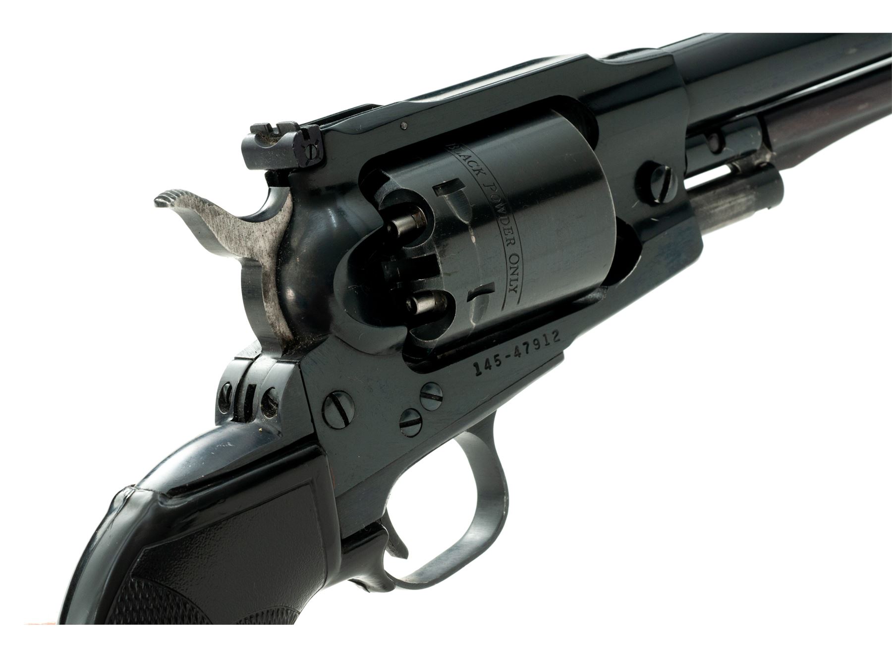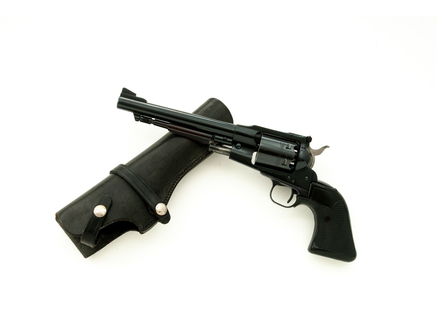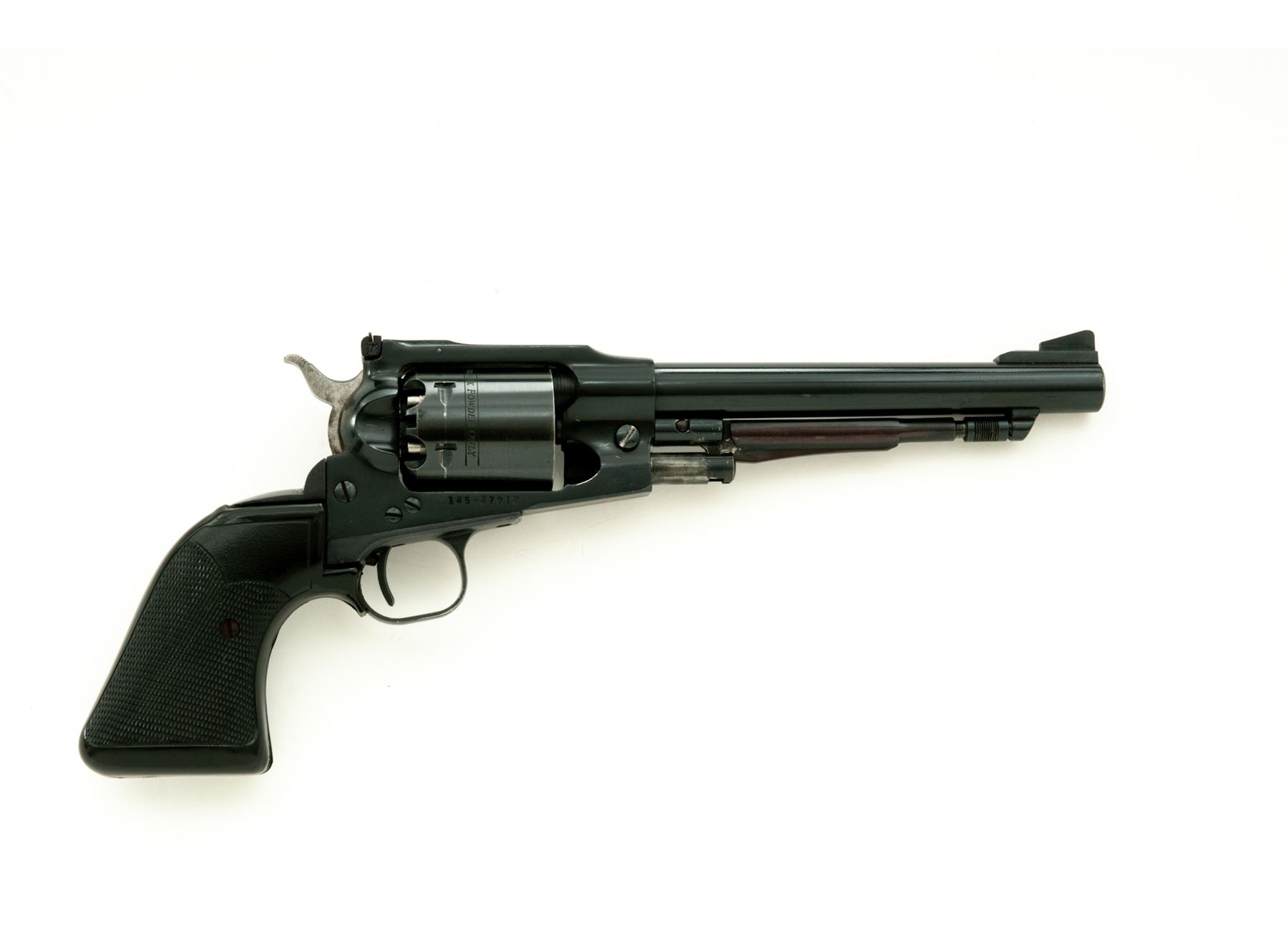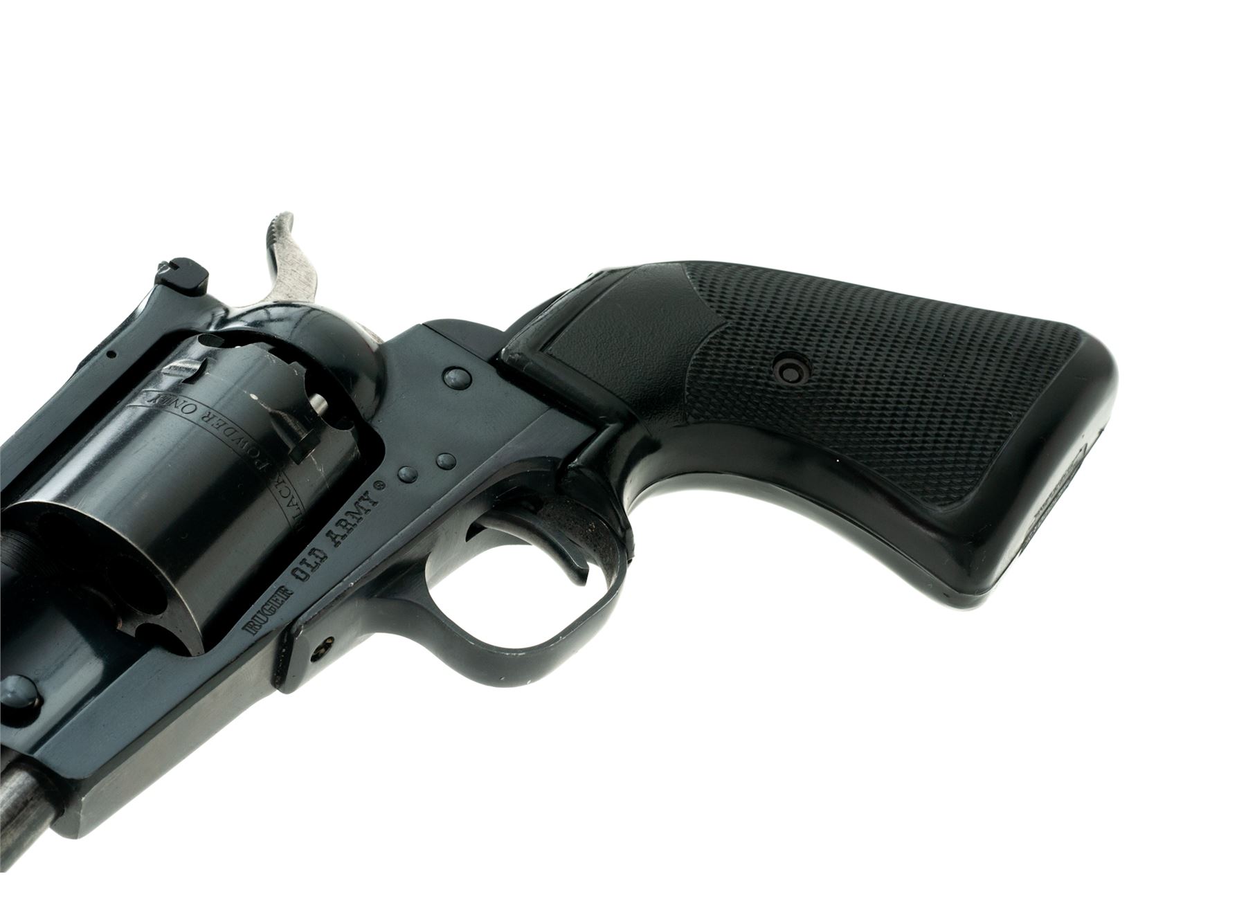 Ruger Old Army Black Powder Percussion Single Action Revolver, #145-47912, .45 cal., 7.5'' barrel, blue finish, checkered black rubber Pachmayr Presentation grips, blade front sight with a fully adjustable rear sight. Mfg'd 1983. Included is a black leather right-hand holster by Viking. Approx. 95% original blue finish remains and revolver rates as very good overall. Cylinder finish shows moderate thinning and toning; lever has toned to a mostly plum color. Factory lettering is clear and defined. Grips with only light handling marks; screw head is rusted. Action is smooth; excellent bore. Holster shows signs of normal light wear. Est.: $300-$500. (Modern/PPT) (This revolver is not classified as an antique and does require an FFL.)