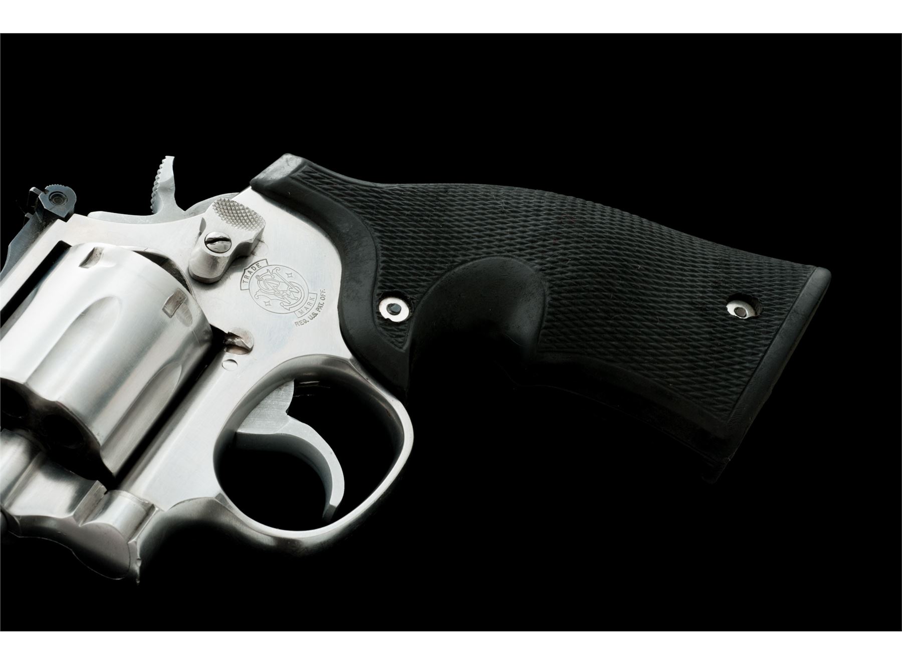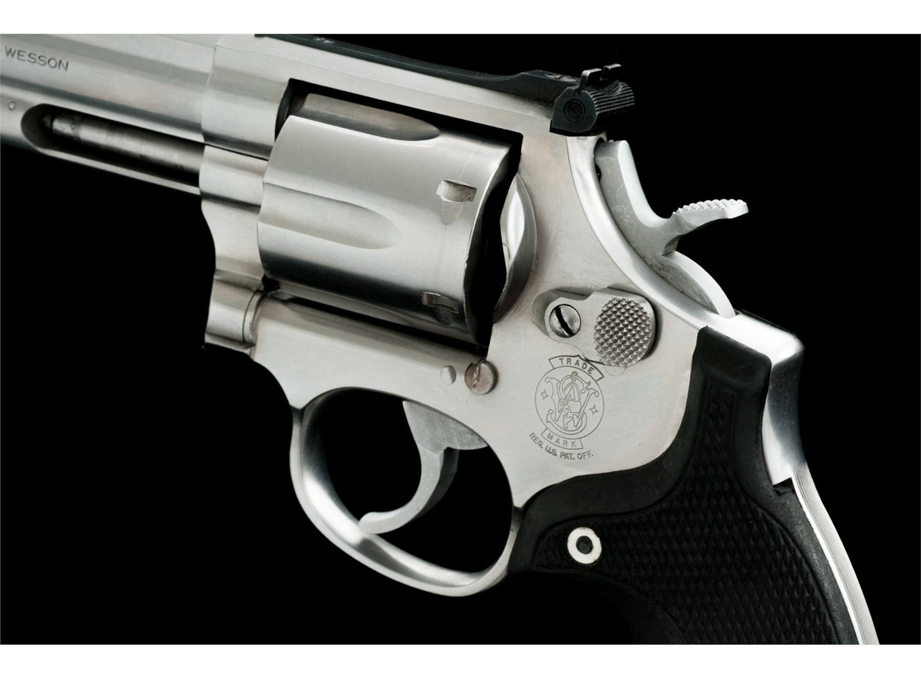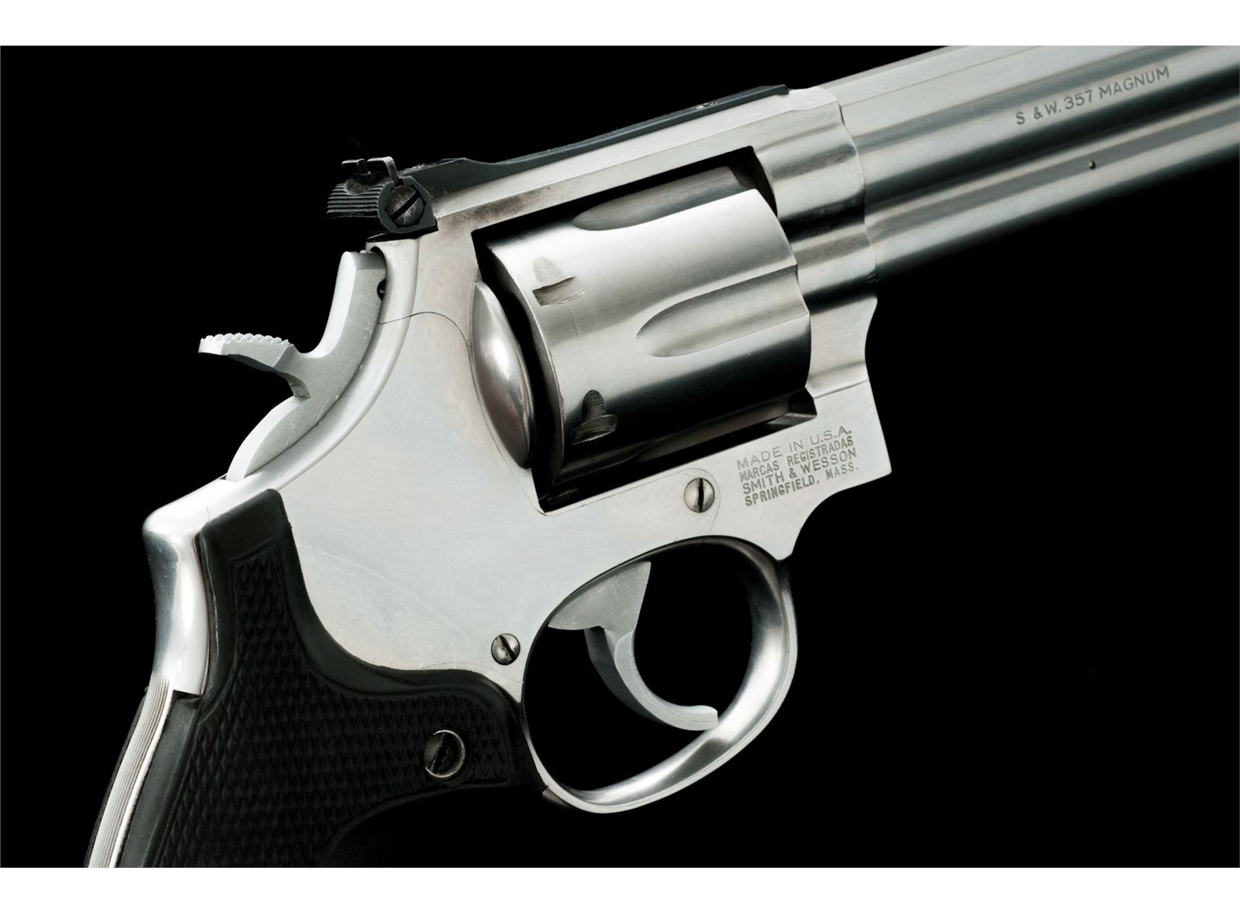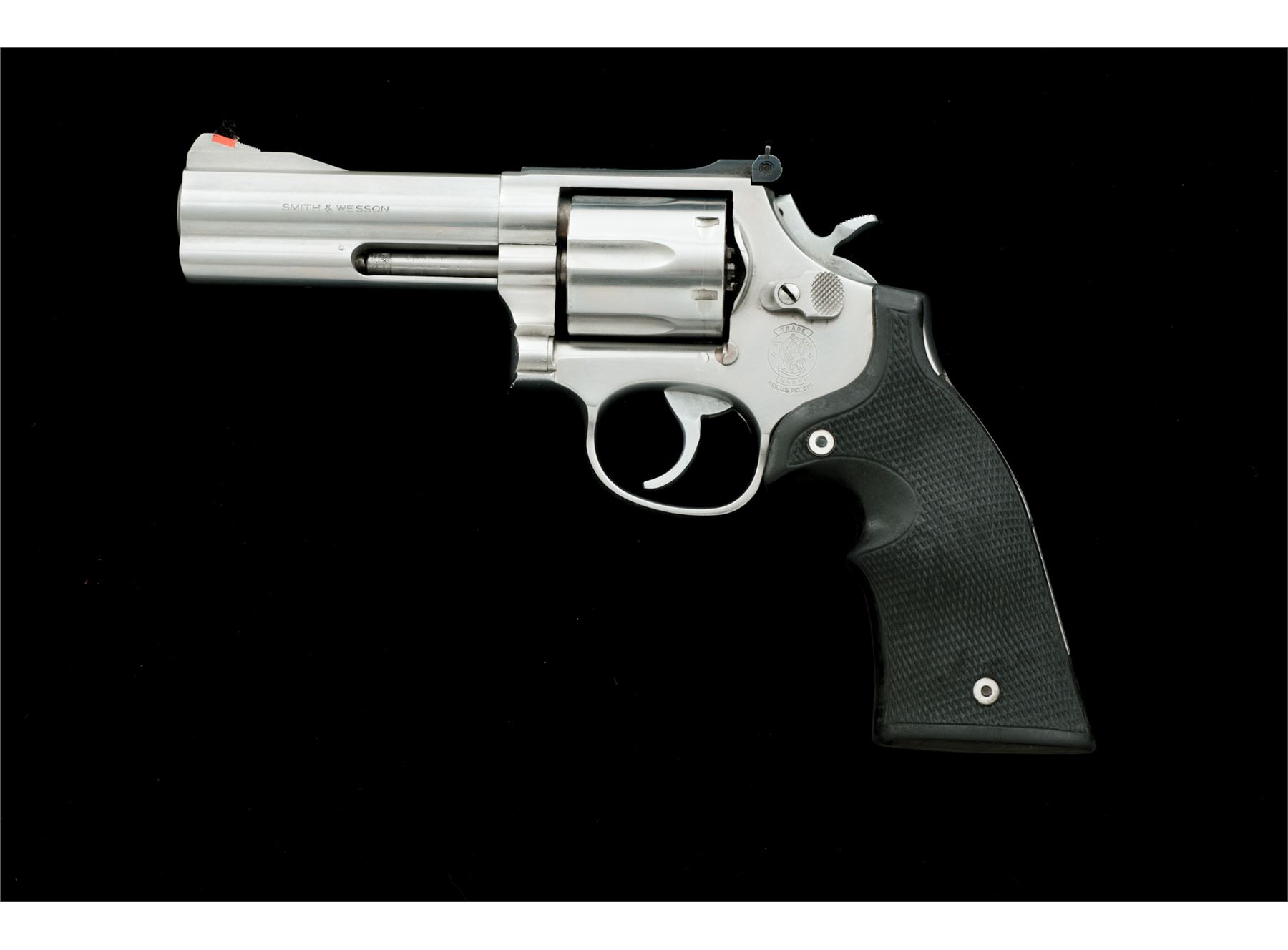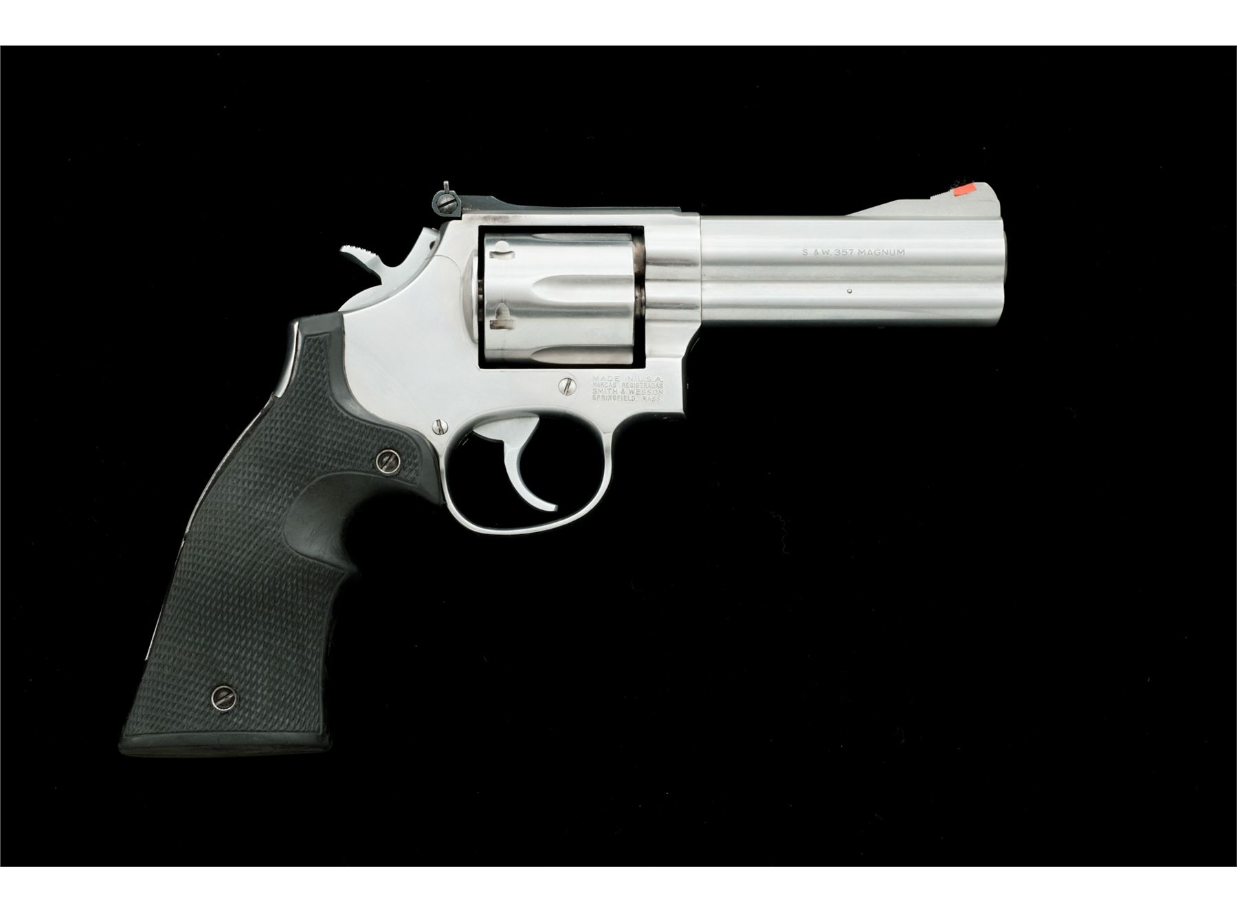 Smith & Wesson Model 686-3 Double Action Revolver, #BEH6776, .357 mag. cal., 4'' barrel, stainless steel, oversized checkered rubber grips, red ramp front, plain adjustable rear sights, with standard width trigger and hammer. Manual included. Condition is near excellent with light general overall scuffing to metal surfaces. Grips and action are crisp, bore is bright. Est.: $450-$650. (Modern/PPT)