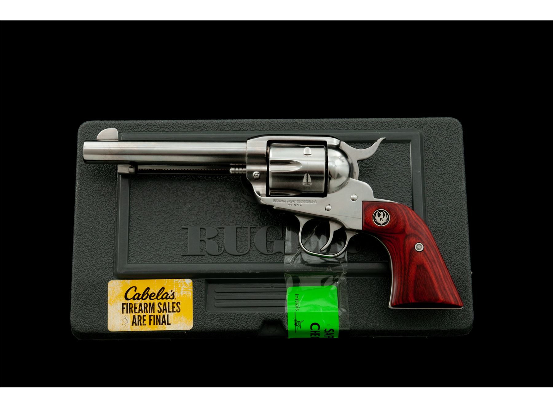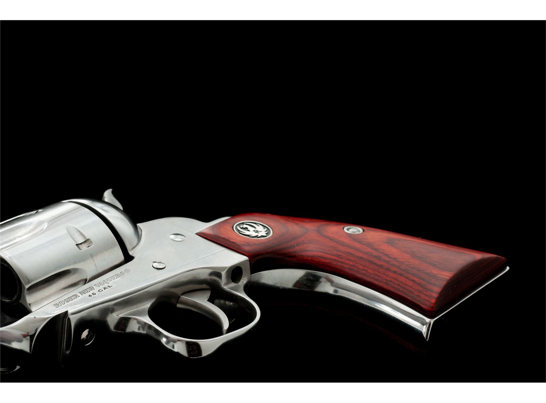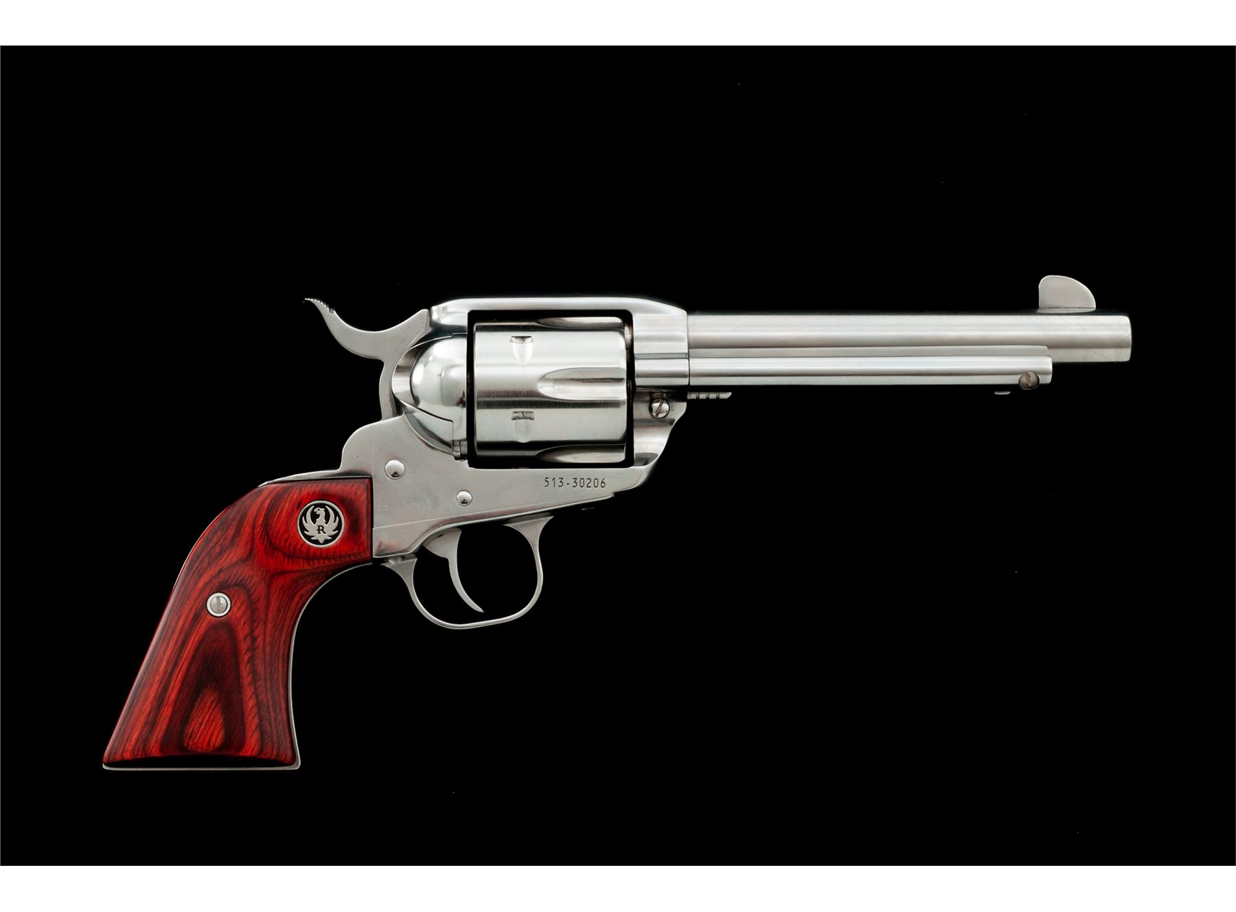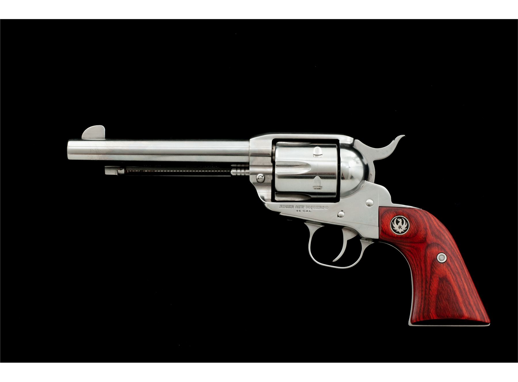 Ruger New Vaquero Model 05104 Single Action Revolver, #513-30206, .45 LC cal., 5-1/2'' barrel, bright stainless finish, transfer bar safety, laminate hardwood grips with Ruger ''silver eagle'' medallions, each grip with a slight contour and slimmer grip frame, standard sights. In original plastic Ruger case with matching end label and the owner's manual. Condition is excellent. Bright stainless surfaces with a small amount of micro-scratching and slight handling marks; cylinder with a light index line. Grips show no visible wear. Crisp action; bright bore. Est.: $450-$650. (Modern)