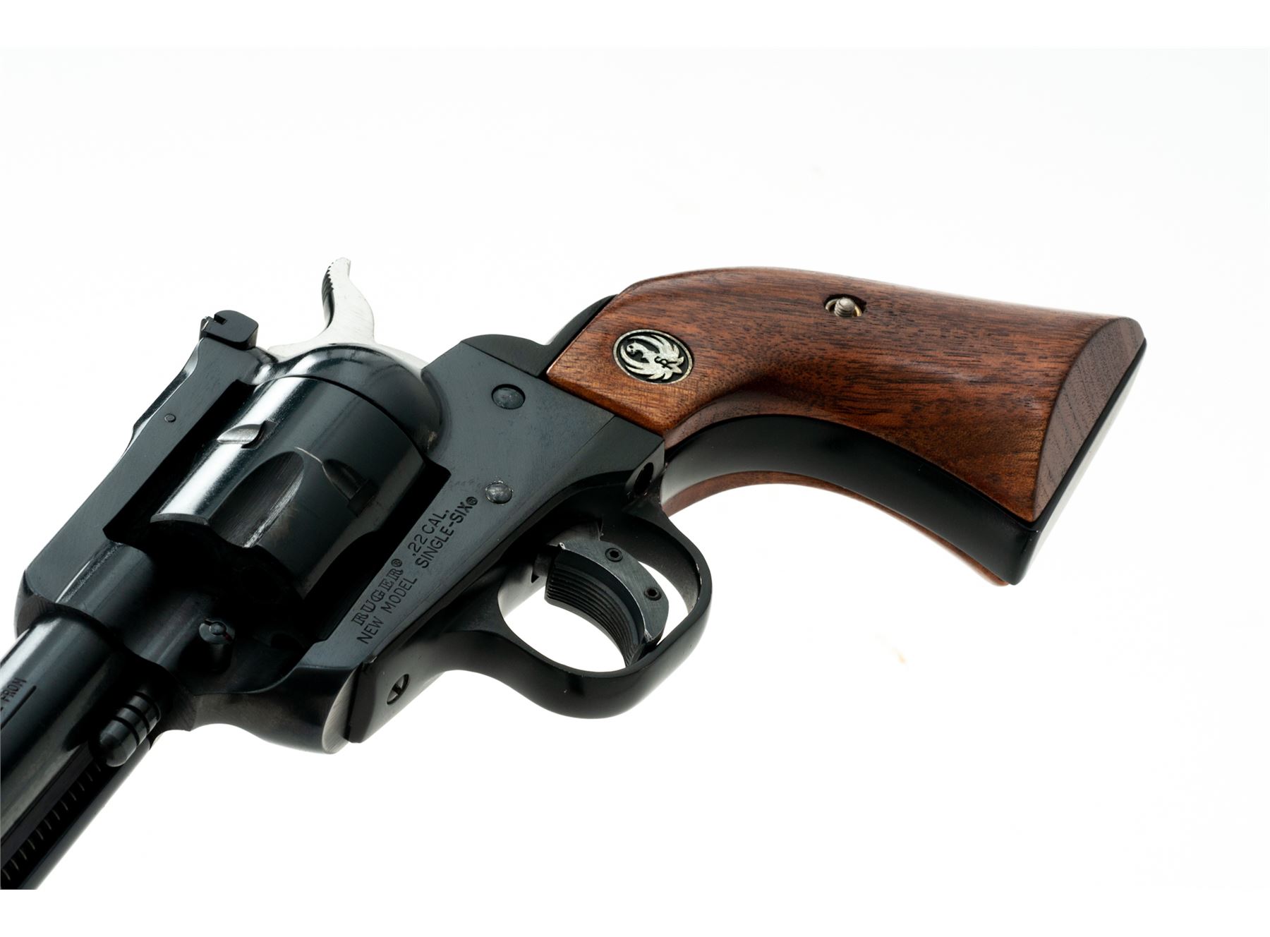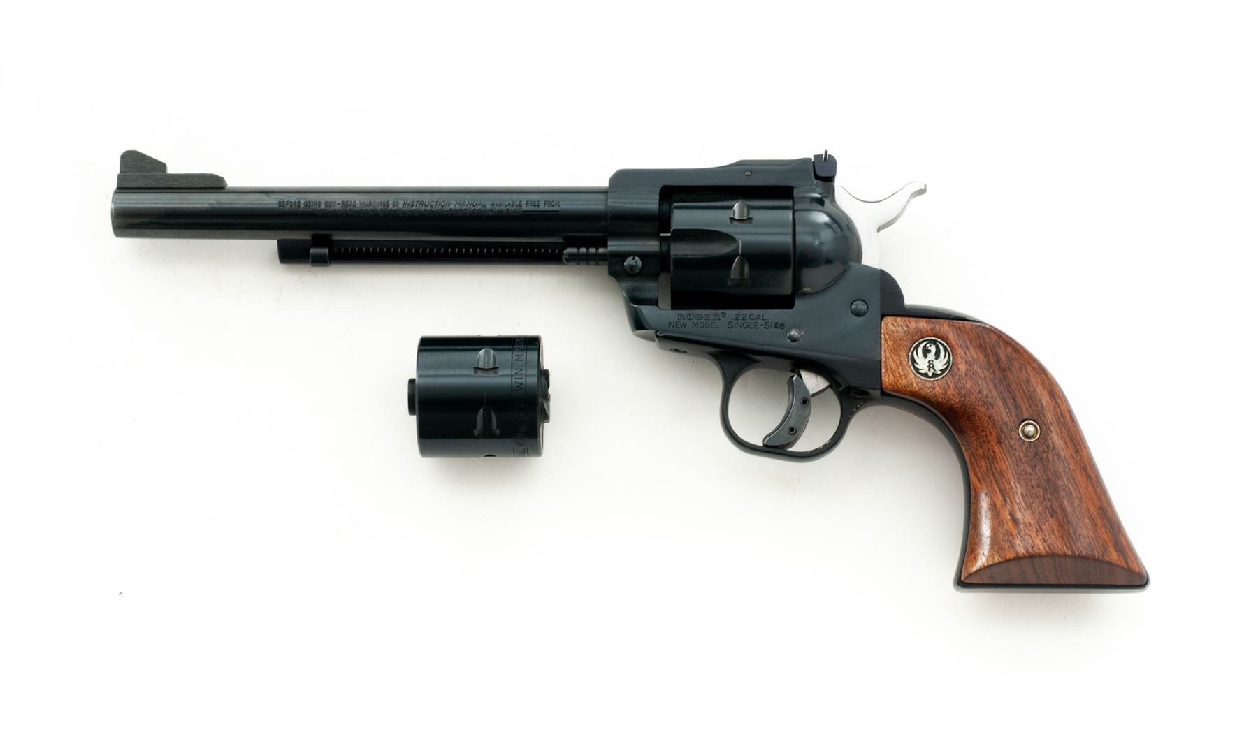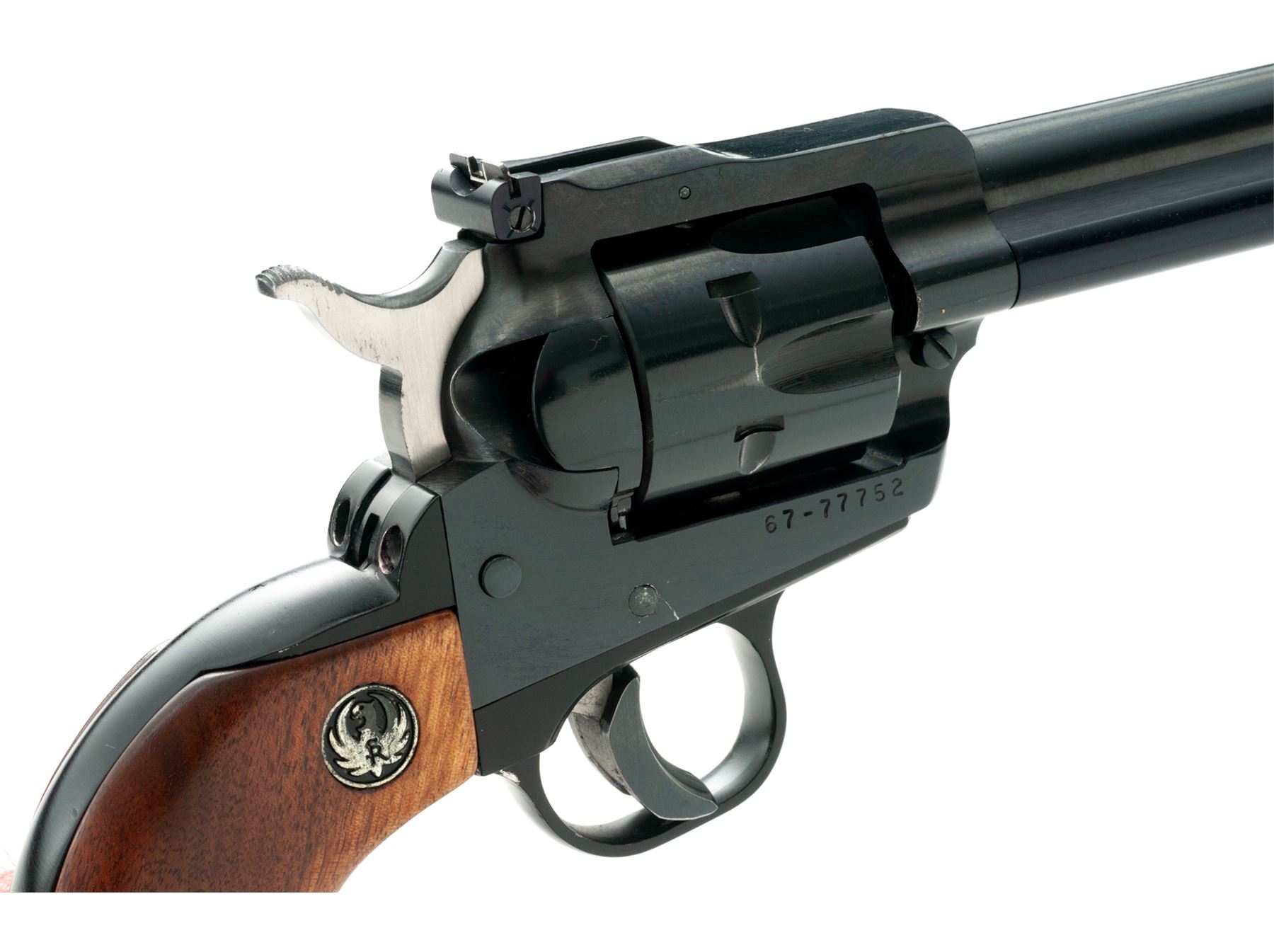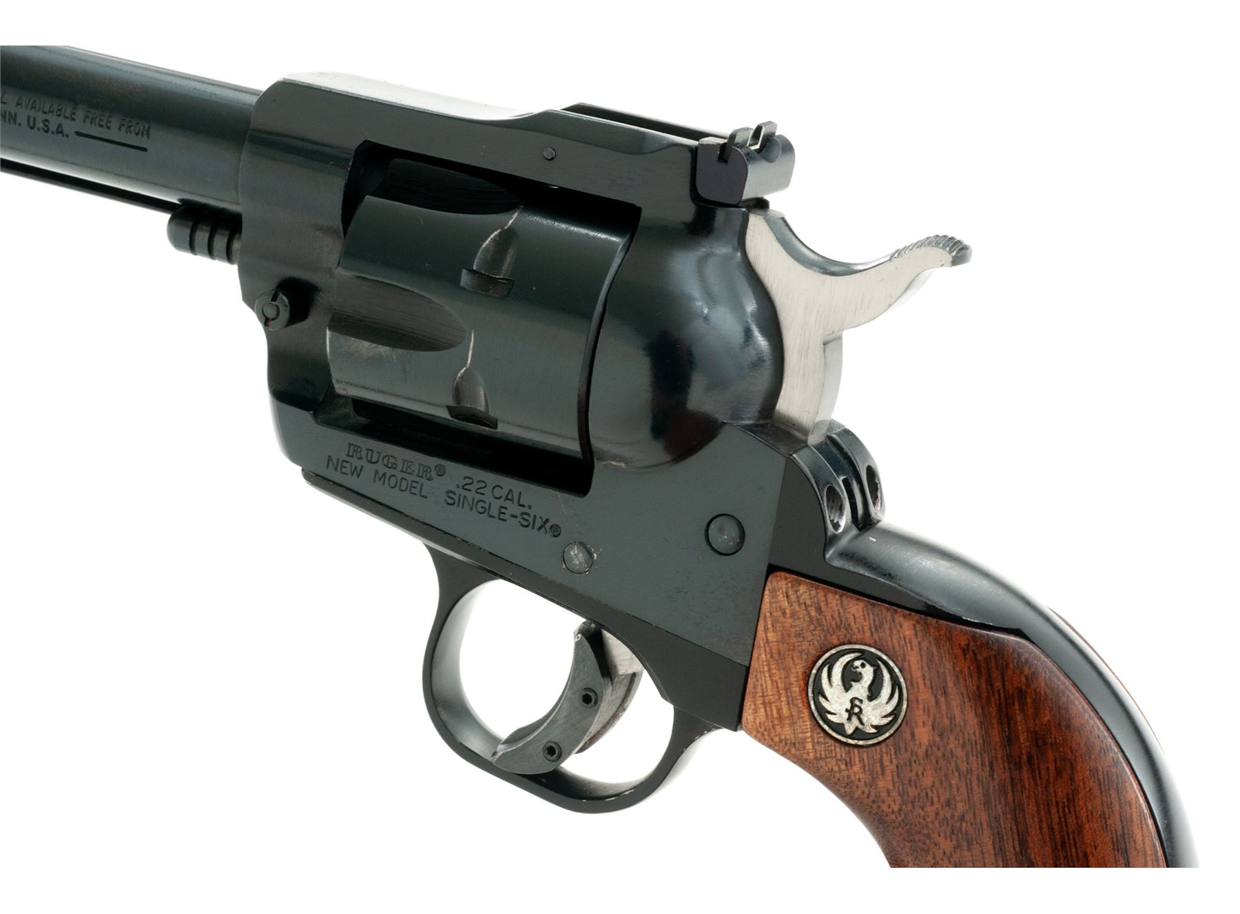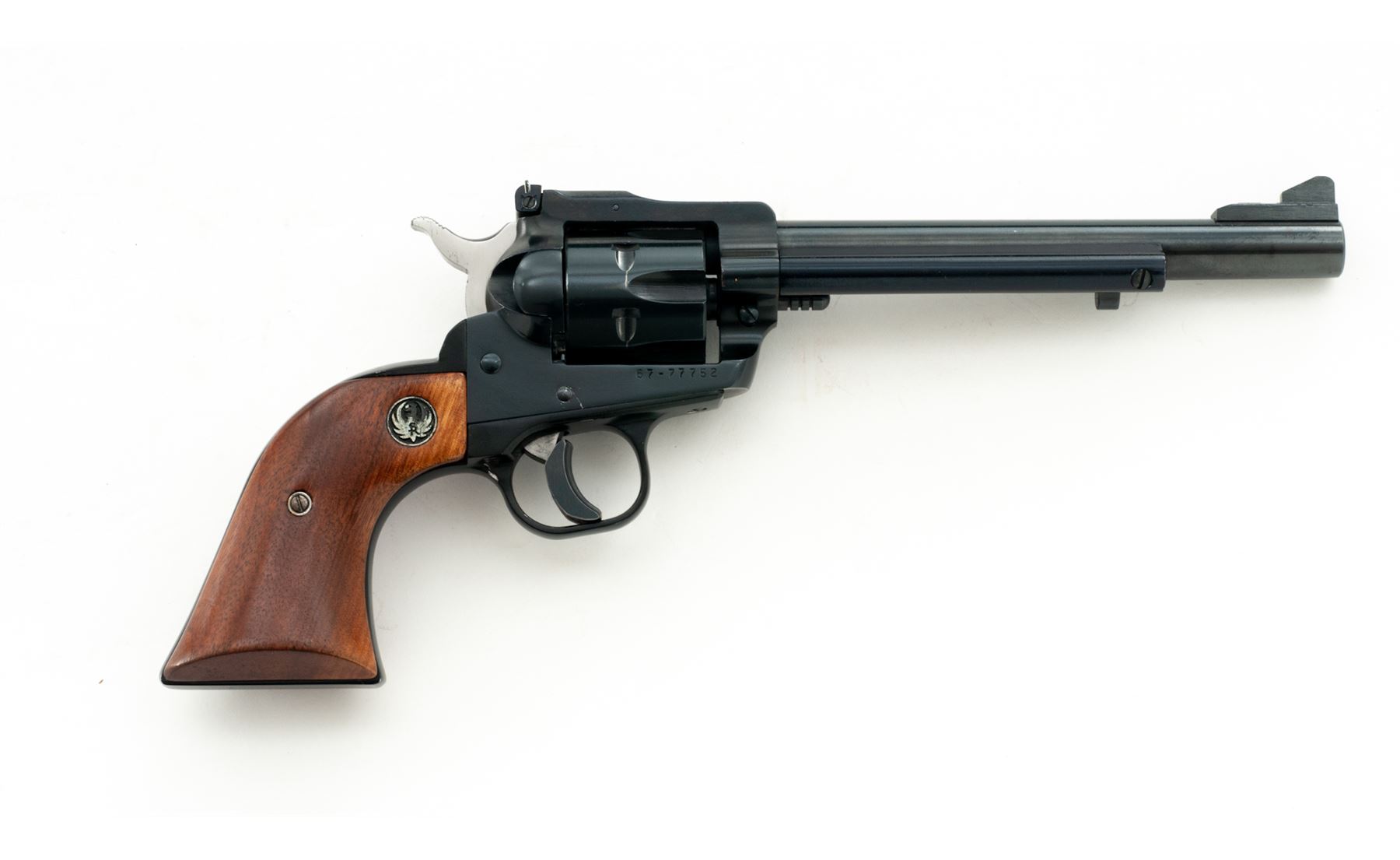 Ruger New Model Super Single-Six Convertible Single Action Revolver, #67-77752, with .22 LR and .22 Magnum cylinders that are both numbered to the gun; 6.5'' barrel, blue finish, smooth walnut grips with Ruger ''silver eagle'' medallions, fixed ramped front sight and fully adjustable rear sight, with trigger shoe. Overall condition is fine retaining approx. 97%-98% factory finishes; metal with normal intermittent small nicks and a few scratches. .22 LR cylinder with a handful specks of oxidation; both cylinders with light index lines, a little more noticeable on the .22 LR. Factory lettering is clear. Grips show only a few minor handling marks but have been refinished, both are a little light around the edges; added finish is smooth and was applied evenly. Crisp smooth action; bright bore rates excellent. Est.: $300-$500. (Modern/PPT)