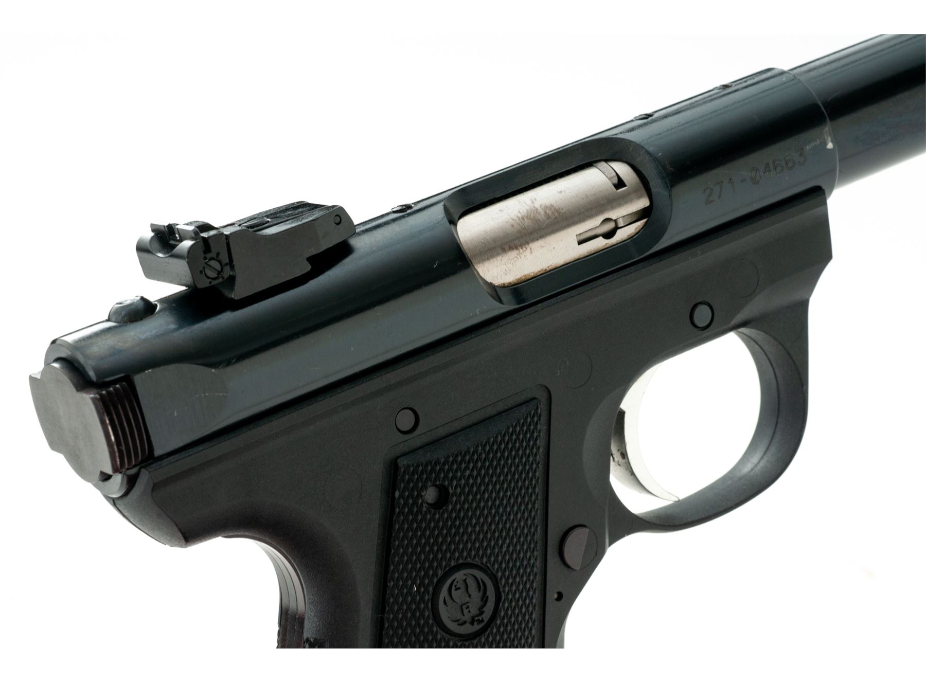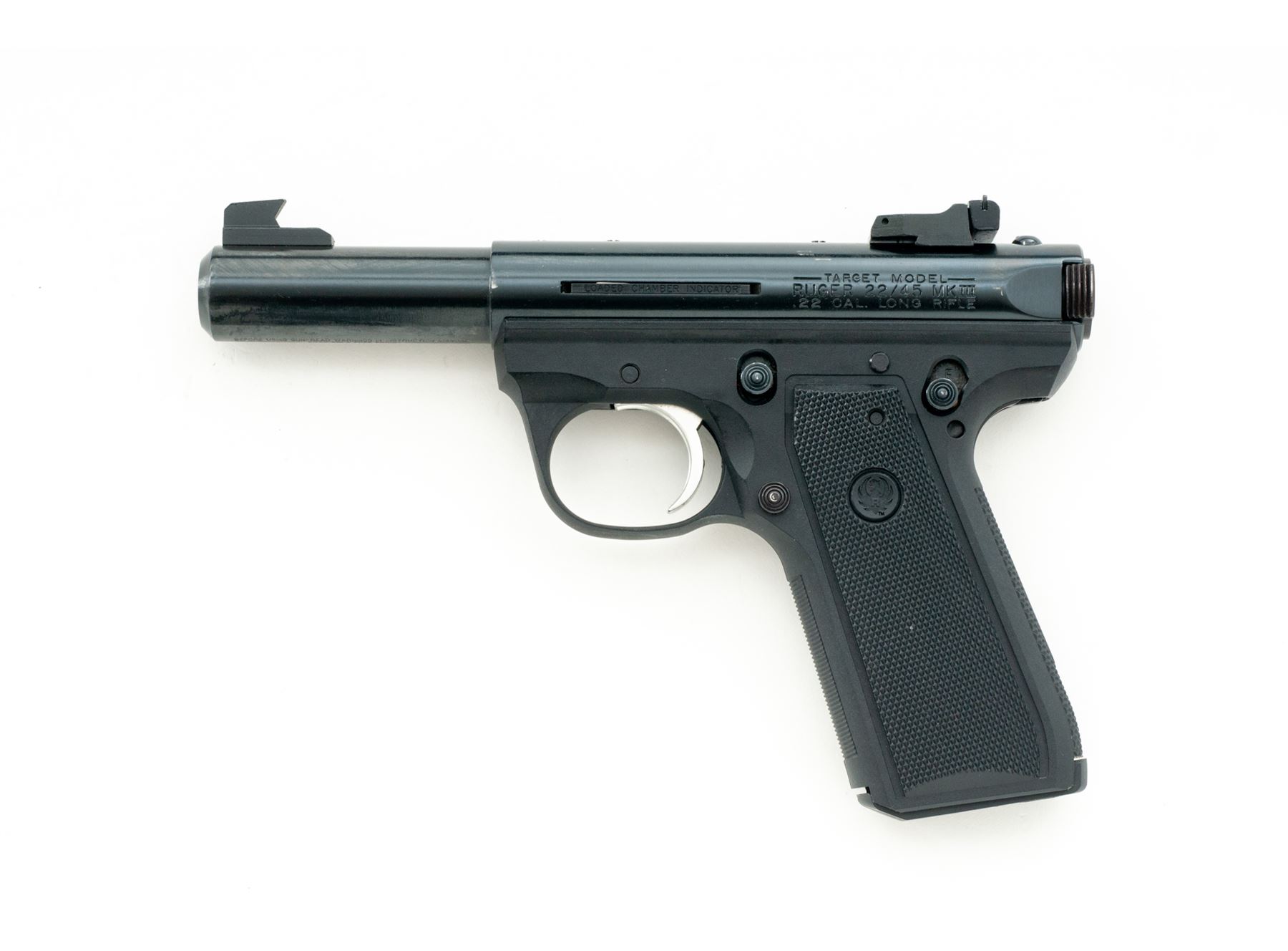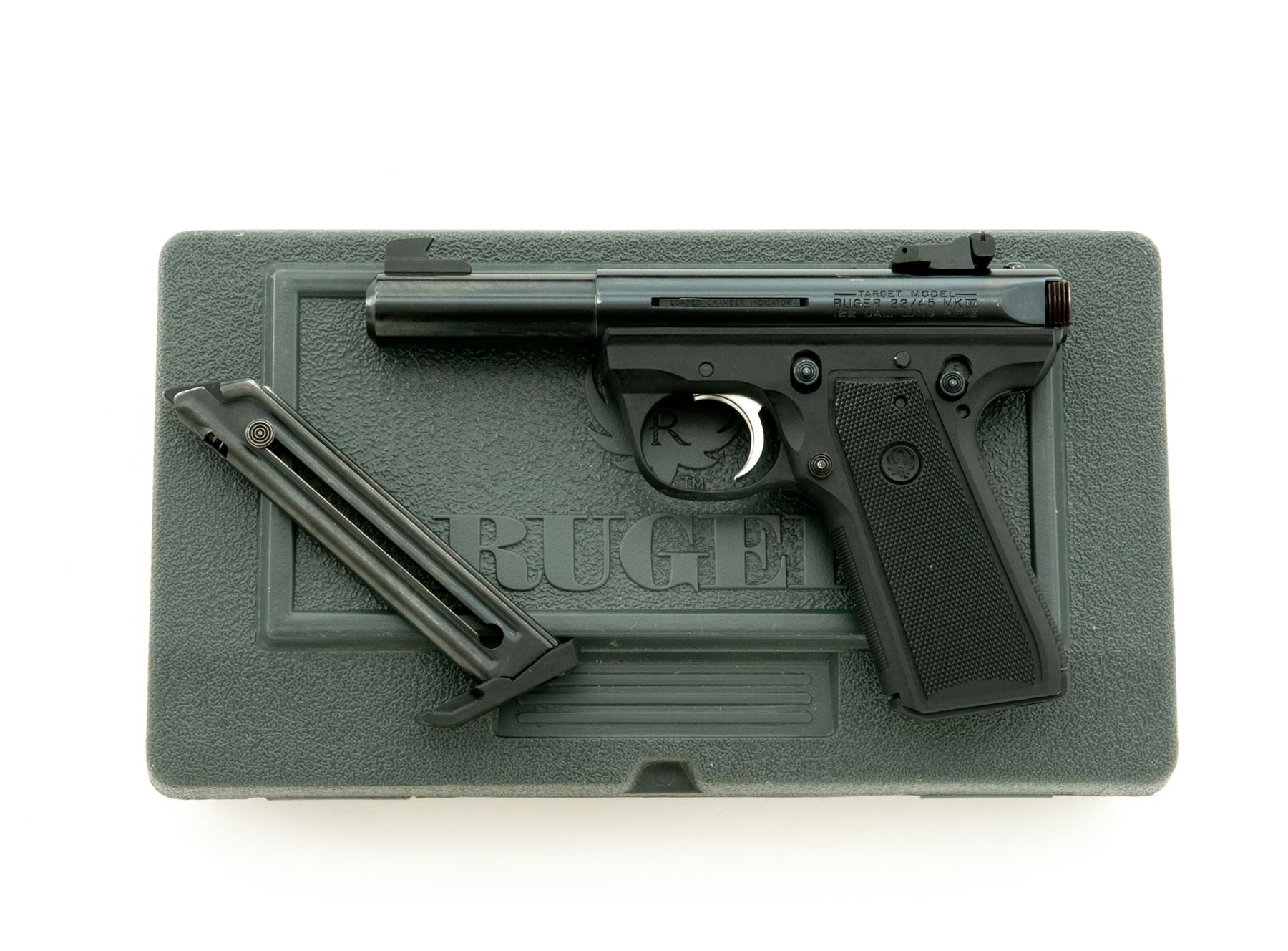 Ruger MK III 22/45 Target Model Semi-Automatic Pistol, #271-04663, .22 LR cal., 4'' bull barrel, black composite frame, integral checkered grips, Patridge front sight and fully adjustable rear sight, with two (2) factory Ruger magazines. In original gray Ruger case with matching end label and owner's manual. Blued steel surfaces retain approx. 96% original finish and rate as fine overall, with intermittent light rub marks and scratches. Factory lettering is clear and defined. Black composite frame is excellent and shows very little wear. Action is smooth, bore is mirror bright. Est.: $250-$400. (Modern/PPT)