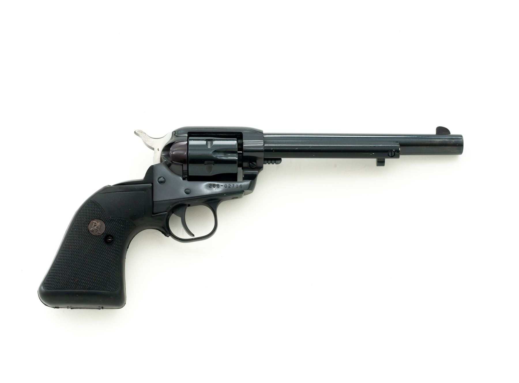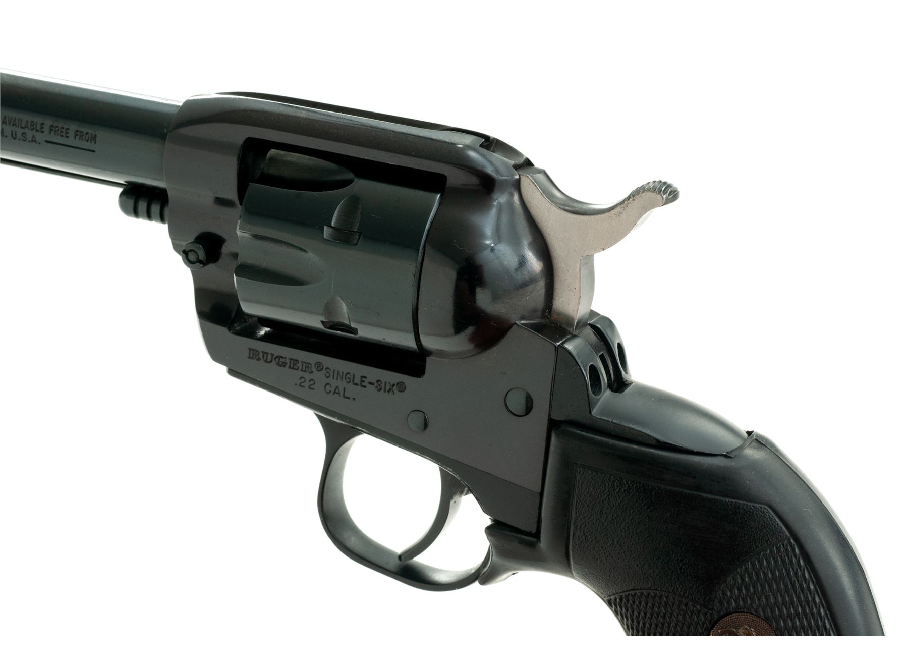 Ruger Single Six Convertible Single Action Revolver, #268-02716, with .22 LR and .22 Magnum cylinders that are both numbered to the gun; 6.5'' barrel, blue finish, checkered black rubber Pachmayr grips, and standard fixed sights. Included are the original wood grips with Ruger ''silver eagle'' medallions. Condition overall is near excellent retaining approx. 98% original finish; tiny specks and edgewear to the ejector rod housing account for most of the finish loss. Pachmayr grips that are on the revolver are originally for a Ruger New Model Blackhawk and fit pretty well, leaving a small gap along the front and bottom edges. Original grips with only light handling marks but the left grip has been cracked and repaired. Both cylinders with only the slightest index lines. Excellent crisp action and mirror bright bore. Est.: $300-$450. (Modern/PPT)