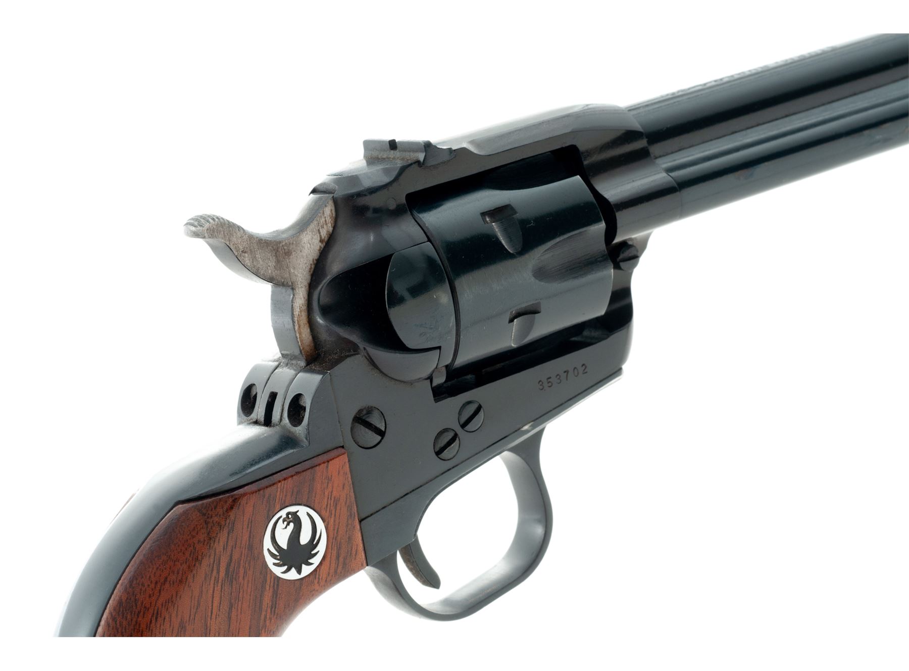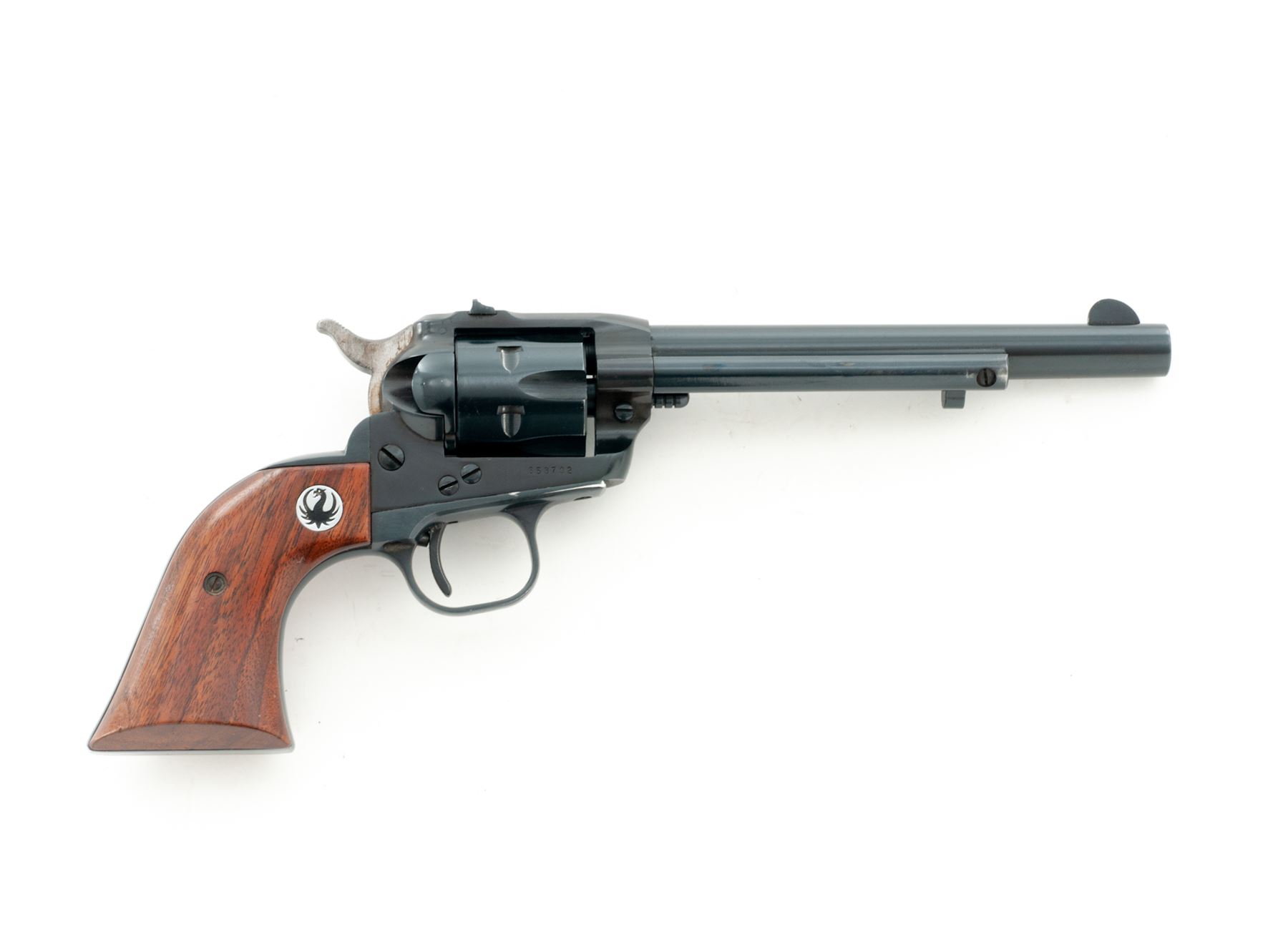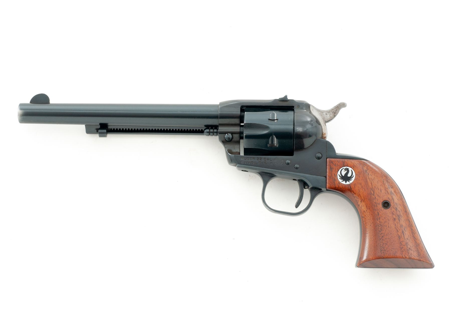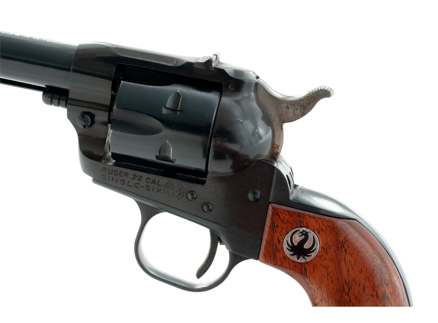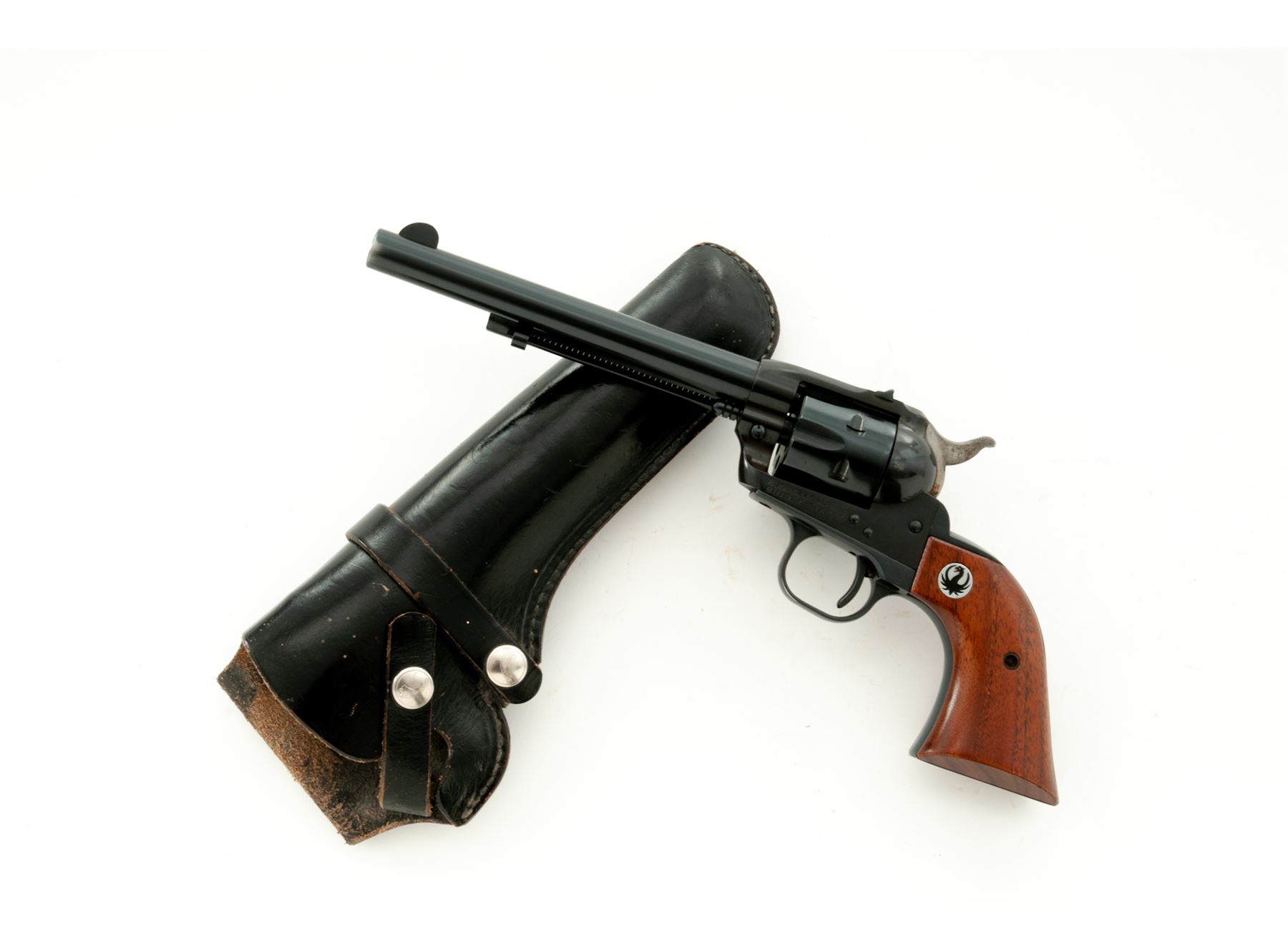 Ruger Old Model Single Six Revolver, with .22 Magnum cylinder, #353702, 6.5'' barrel, blue finish, XR3-Red anodized grip frame, smooth walnut grips with Ruger ''black eagle'' medallions, and standard sights. Cylinder is unnumbered; frame is not magnum marked. Mfg'd 1963. In right-hand black leather Hunter holster. Approx. 96% blue finish remains and revolver rates as fine overall. Muzzle wear accounts for a majority of the finish loss. Factory lettering is clear. Finish on the frame with a little mild brown toning in some protected areas. Grips with intermittent small handling marks, most noticeable on the left grip; most of the finish remains. Hammer shows moderate dark spotting. Crisp action; excellent bright bore. Holster shows mostly normal pressure dents and scratches, stitching at the tip has come loose. Est.: $250-$400. (C&R)