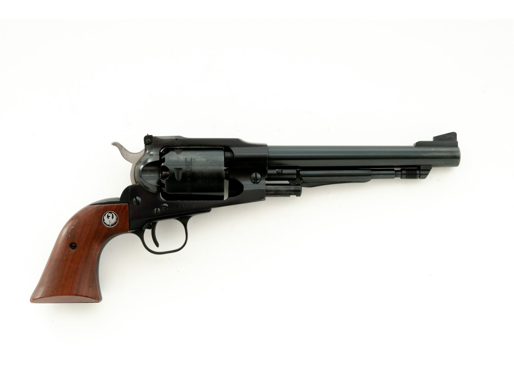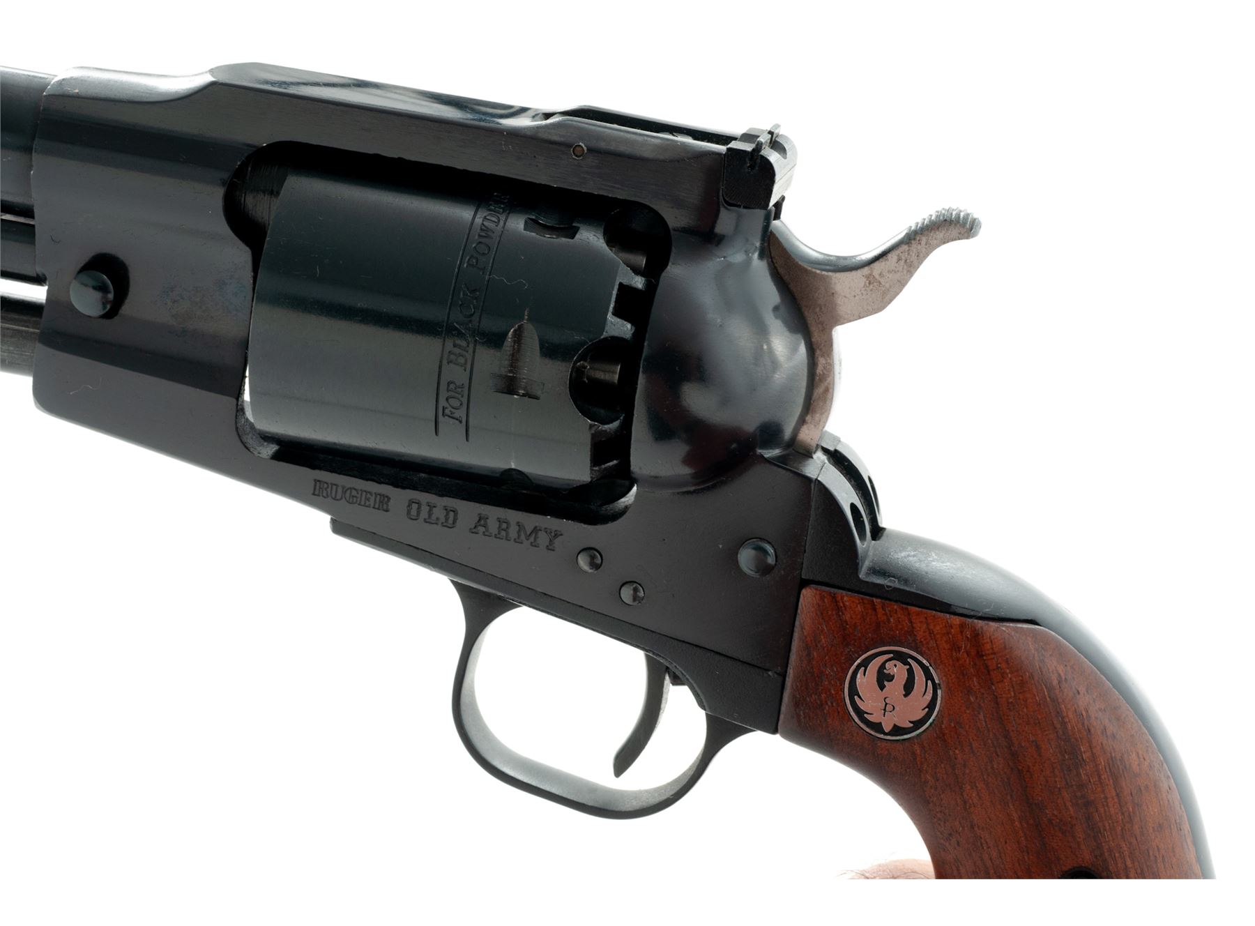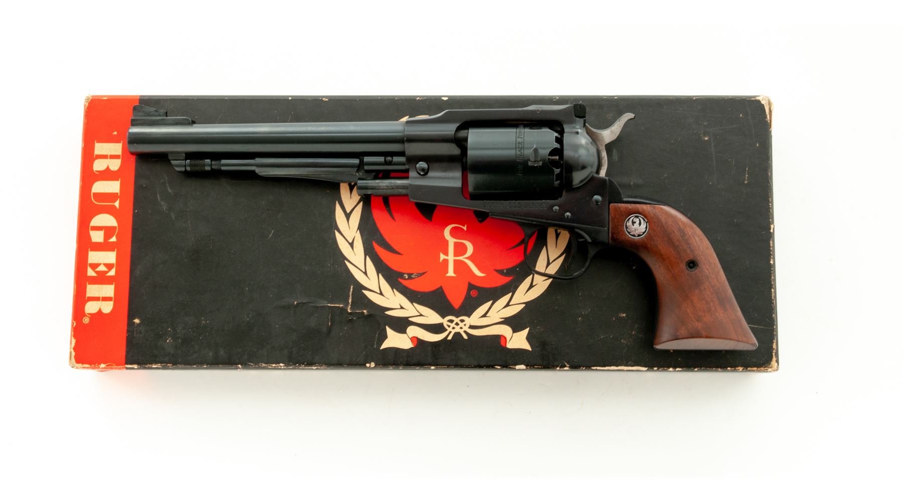 First Year Ruger Old Army Percussion Single Action Revolver, #140-00759, .45 cal., 7.5'' barrel, blue finish, smooth wood grips with Ruger ''silver eagle'' medallions, fixed blade front sight, with fully adjustable square notched rear sight. Included is the two-piece Ruger box that is hand numbered to the gun, with warranty card, and Ruger nipple wrench. Mfg'd 1972. Approx. 98% original finish remains and revolver rates as excellent overall. Right side of barrel with minor finish wear and a few small scratches, cylinder with only a light index line. Factory lettering is clear and crisp. Grips with a few small handling marks with a nice even color and finish. Sides of the hammer with some darkening (only visible when cocked). Crisp action; bright bore with excellent rifling. Box shows mostly moderate age and storage wear, firearm identification is clear, a lower corner on both the lid and bottom half each with a split corner; one has been repaired with household tape. Est.: $400-$600. (Modern/PPT) (This revolver is not classified as an antique and does require an FFL for registration.)