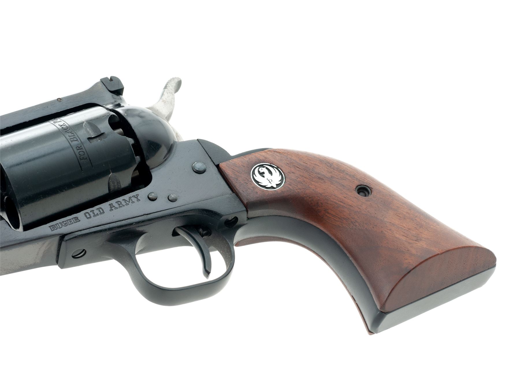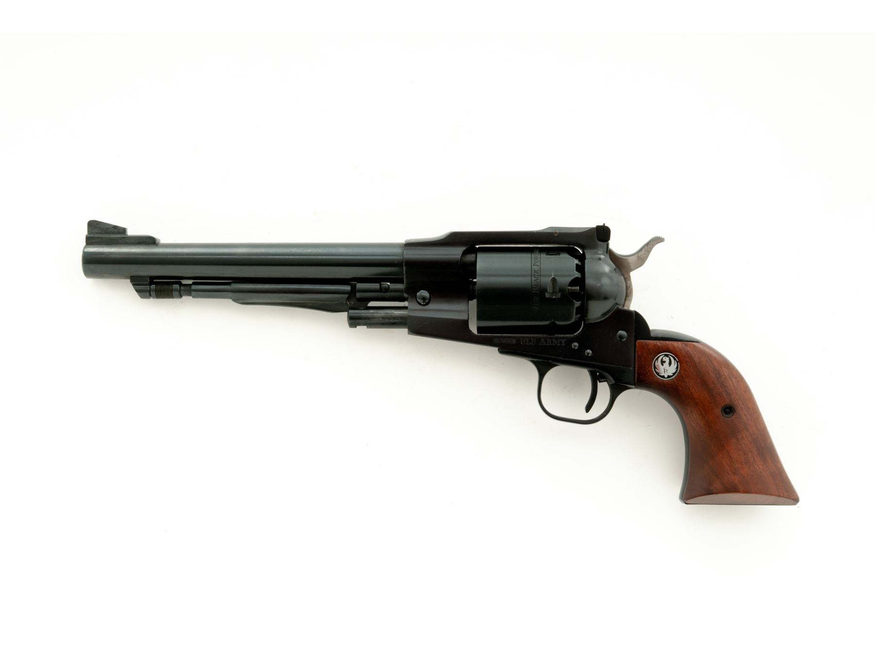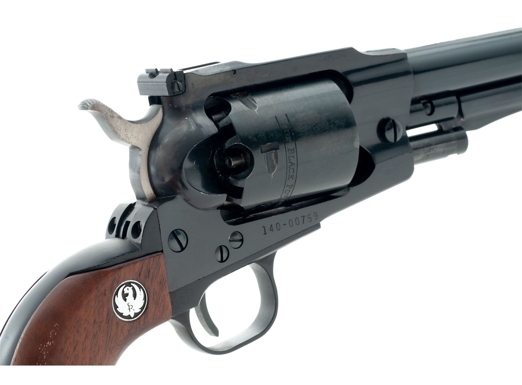 First Year Ruger Old Army Percussion Single Action Revolver, #140-00759, .45 cal., 7.5'' barrel, blue finish, smooth wood grips with Ruger ''silver eagle'' medallions, fixed blade front sight, with fully adjustable square notched rear sight. Included is the two-piece Ruger box that is hand numbered to the gun, with warranty card, and Ruger nipple wrench. Mfg'd 1972. Approx. 98% original finish remains and revolver rates as excellent overall. Right side of barrel with minor finish wear and a few small scratches, cylinder with only a light index line. Factory lettering is clear and crisp. Grips with a few small handling marks with a nice even color and finish. Sides of the hammer with some darkening (only visible when cocked). Crisp action; bright bore with excellent rifling. Box shows mostly moderate age and storage wear, firearm identification is clear, a lower corner on both the lid and bottom half each with a split corner; one has been repaired with household tape. Est.: $400-$600. (Modern/PPT) (This revolver is not classified as an antique and does require an FFL for registration.)