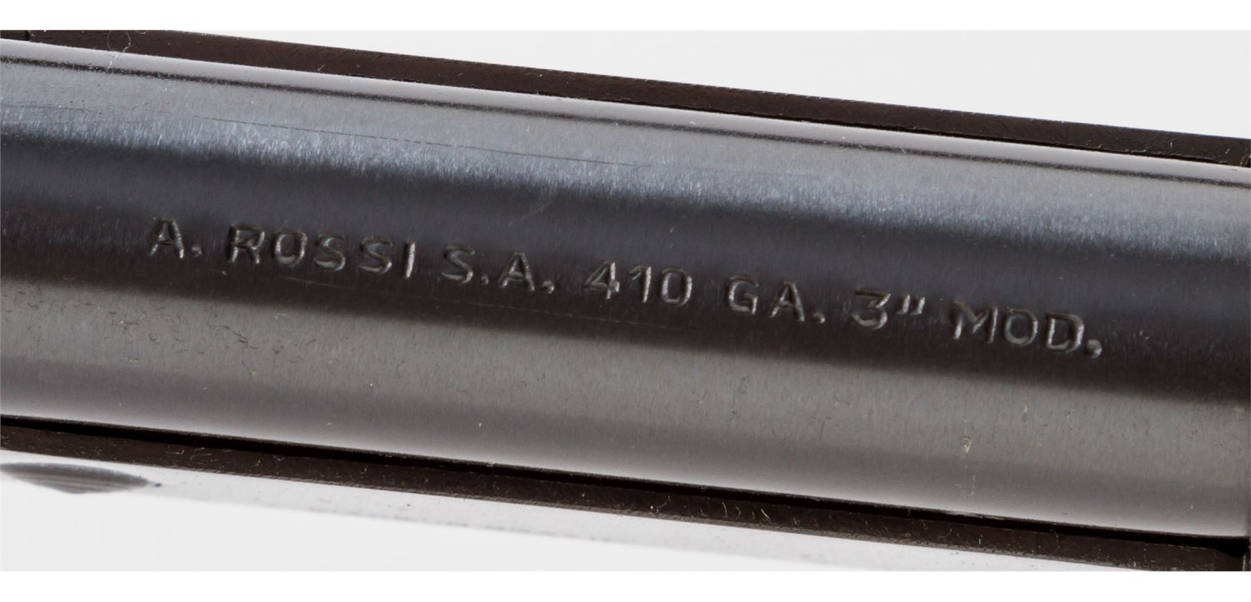 Brazilian Rossi Single Shot Shotgun, #S41-SP001727, .410 ga., 3'' chamber, 28'' round barrel choked Mod., blue finish, walnut stock and handguard. Condition is excellent, appearing new and unfired. Est.: $250-$400. (Modern)