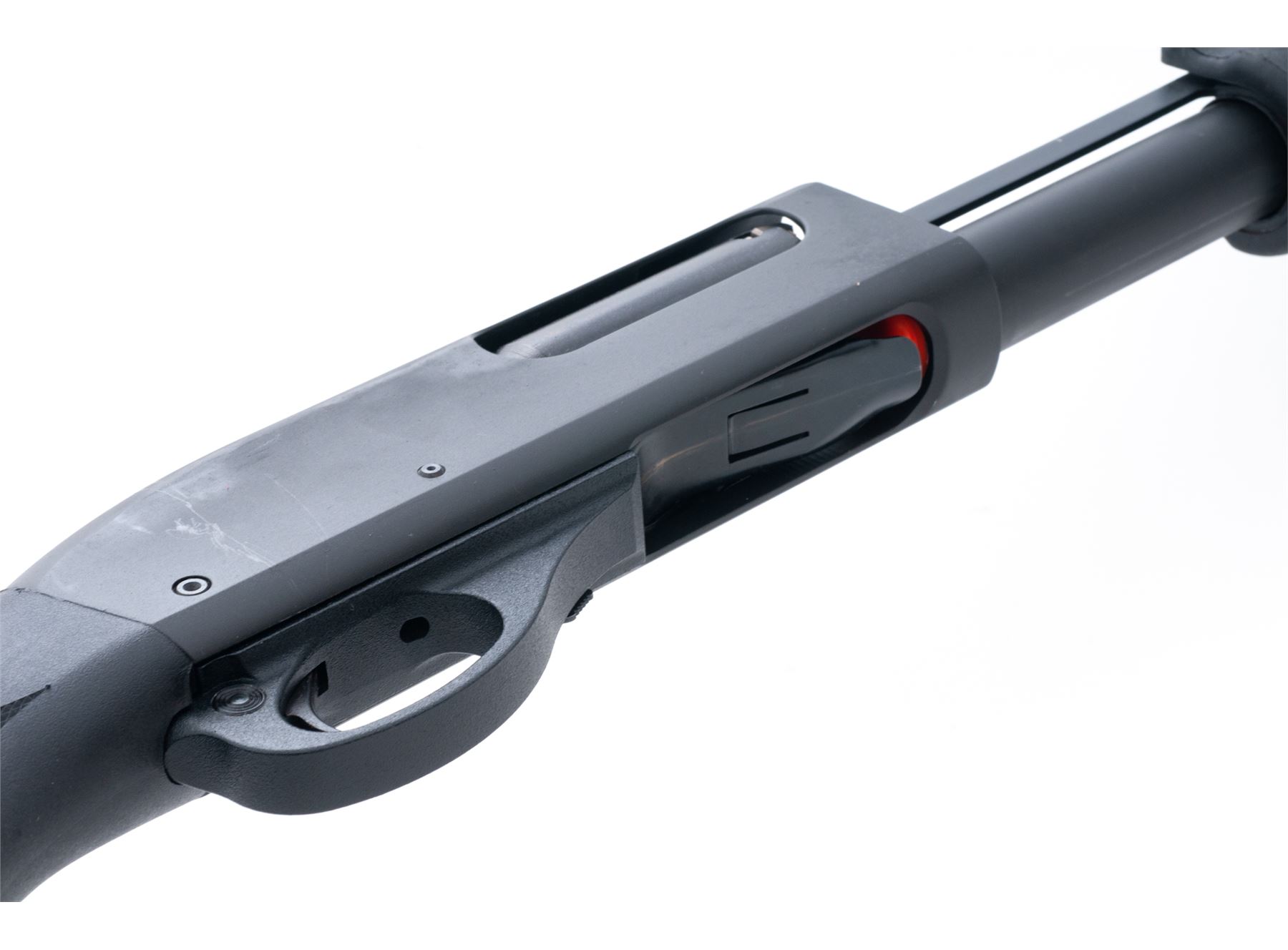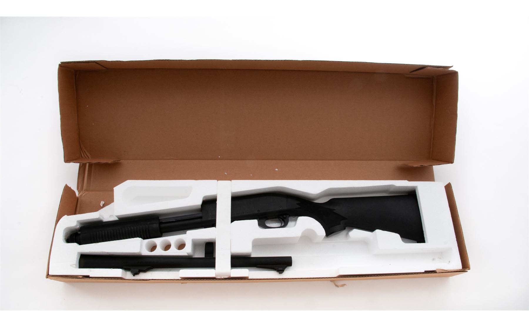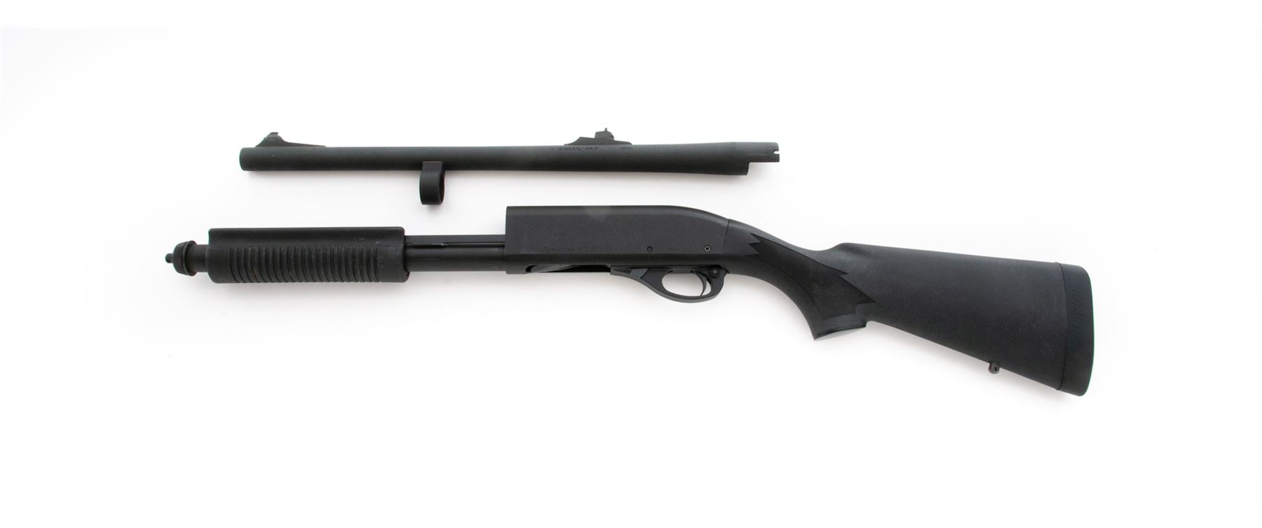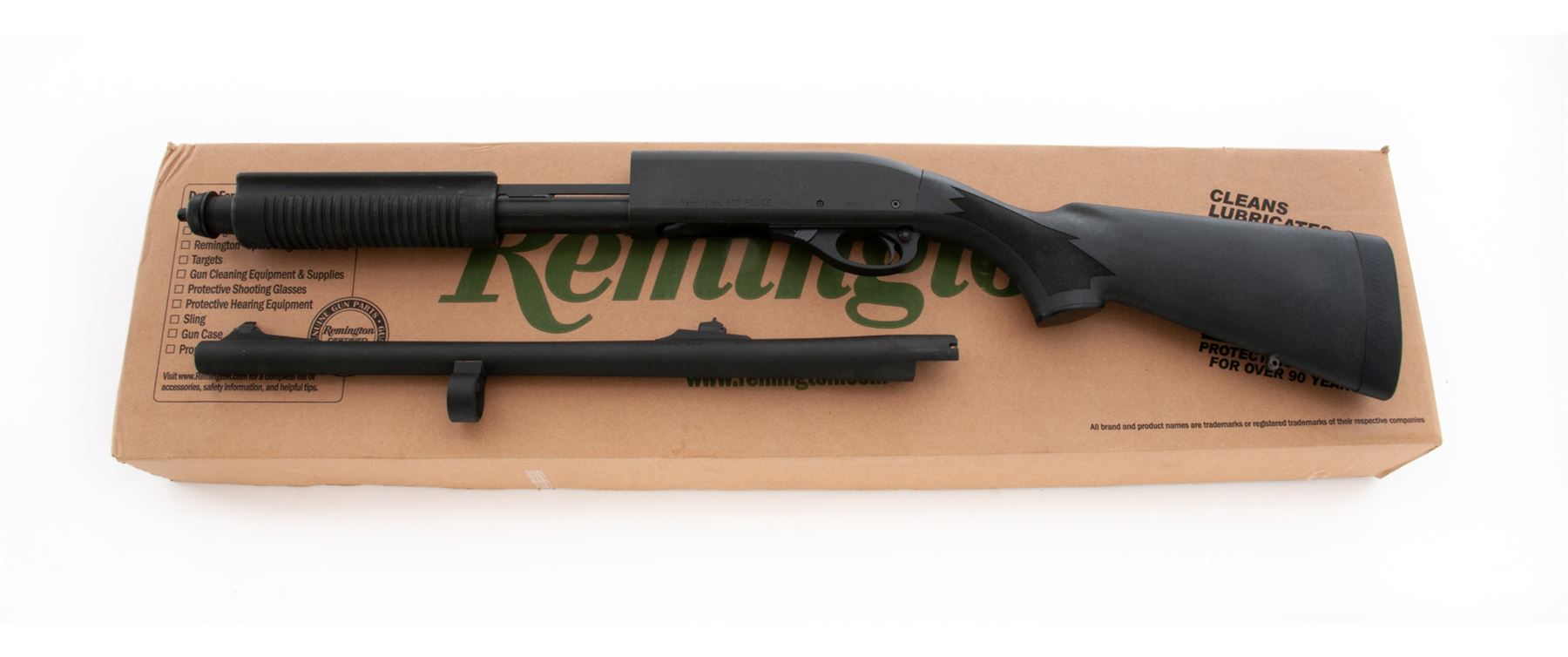 Remington Model 870 Police Slide Action Shotgun, #RS06149C, 12 ga., 3'' chamber, 18.5'' barrel, IMP Cyl. choke, parkerized finish, checkered black synthetic pistol-grip stock and grooved forend, black rubber Remington recoil pad, sling swivel studs, and rifle sights. In original box with matching end label and owner's manual. Metal is very good, receiver with general surface scuffs and scratches. Stock and forend are near excellent with normal light handling marks. Crisp action; bore is very good. Est.: $250-$350. (Modern)