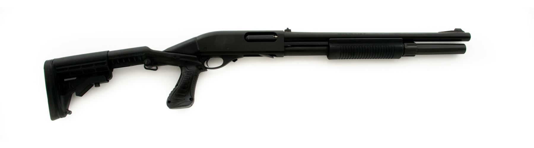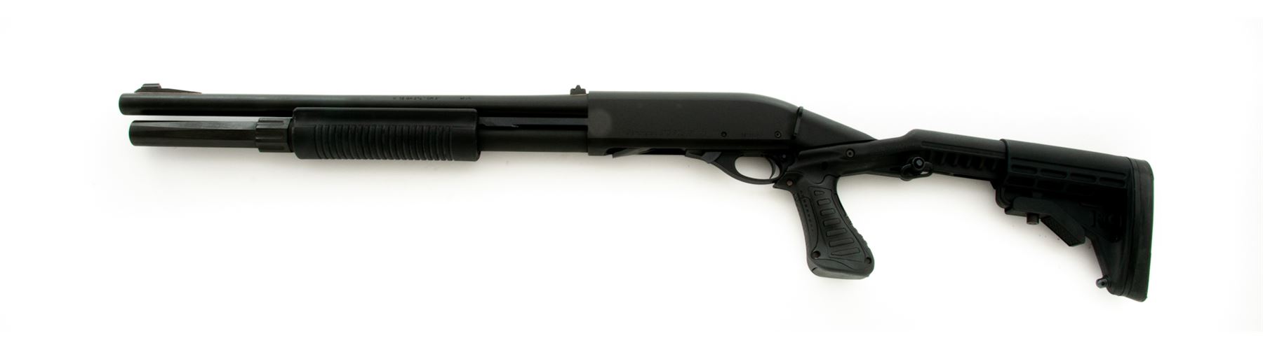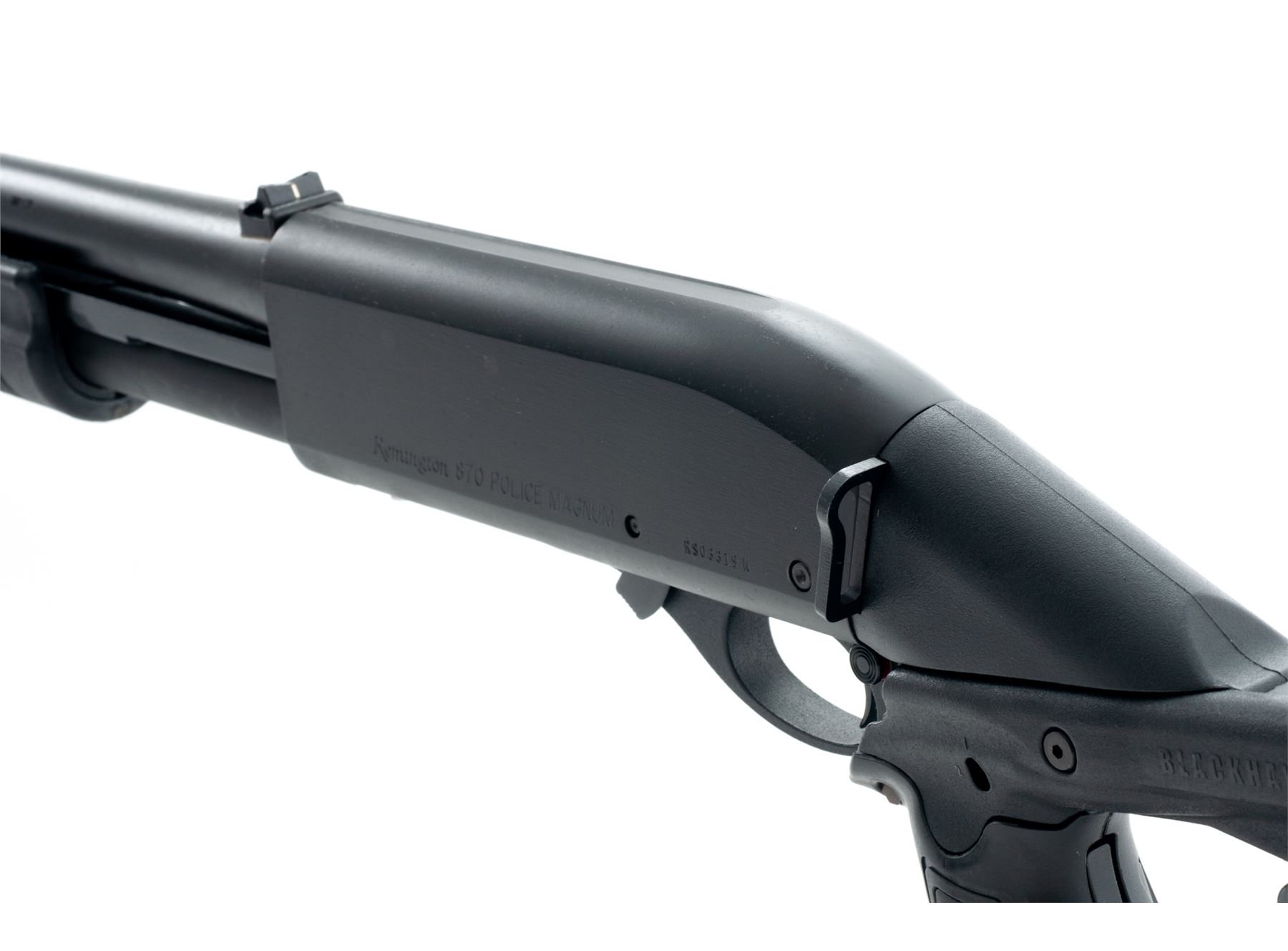 Upgraded Remington Model 870 Police Magnum Slide Action Shotgun, #RS03319N, 12 ga., 3'' chamber, 18.5'' barrel, parkerized finish, and rifle sights. Black synthetic Blackhawk SpecOps Gen II stock with full pistol grip, adjustable buttstock, black rubber recoil pad, and sling swivel. Original magazine tube has been replaced with a 2-shot extended solid billet tube by GG&G. Included is the original manual for the shotgun and aftermarket buttstock, cap and spring for the original magazine tube, and a new 5-round Uncle Mike's nylon buttstock shell holder. Condition overall is excellent appearing near new and showing only a few slight handling marks. Crisp action, bright bore. Est.: $400-$600. (Modern)