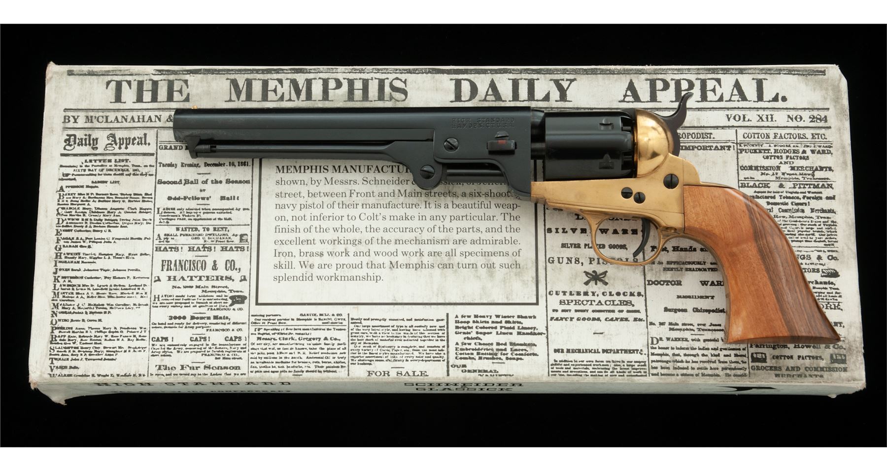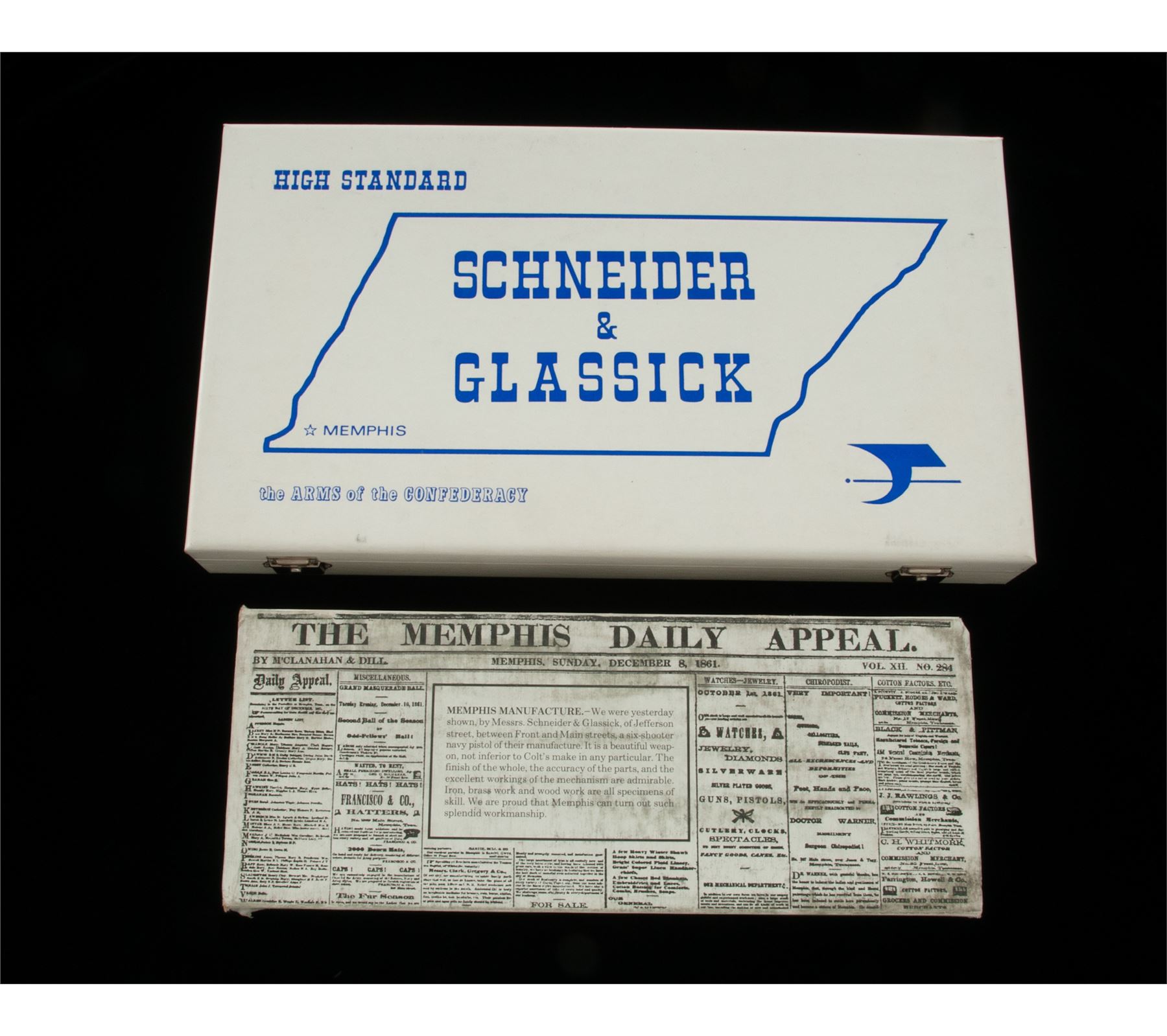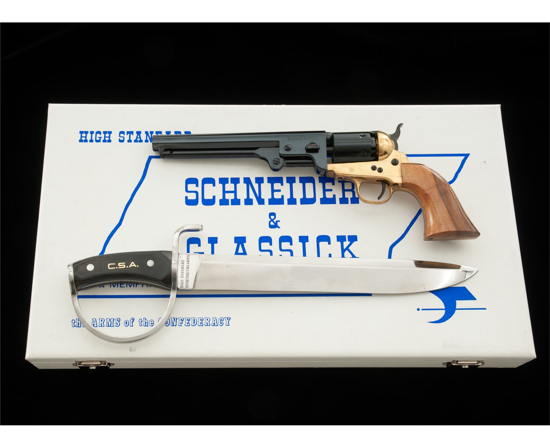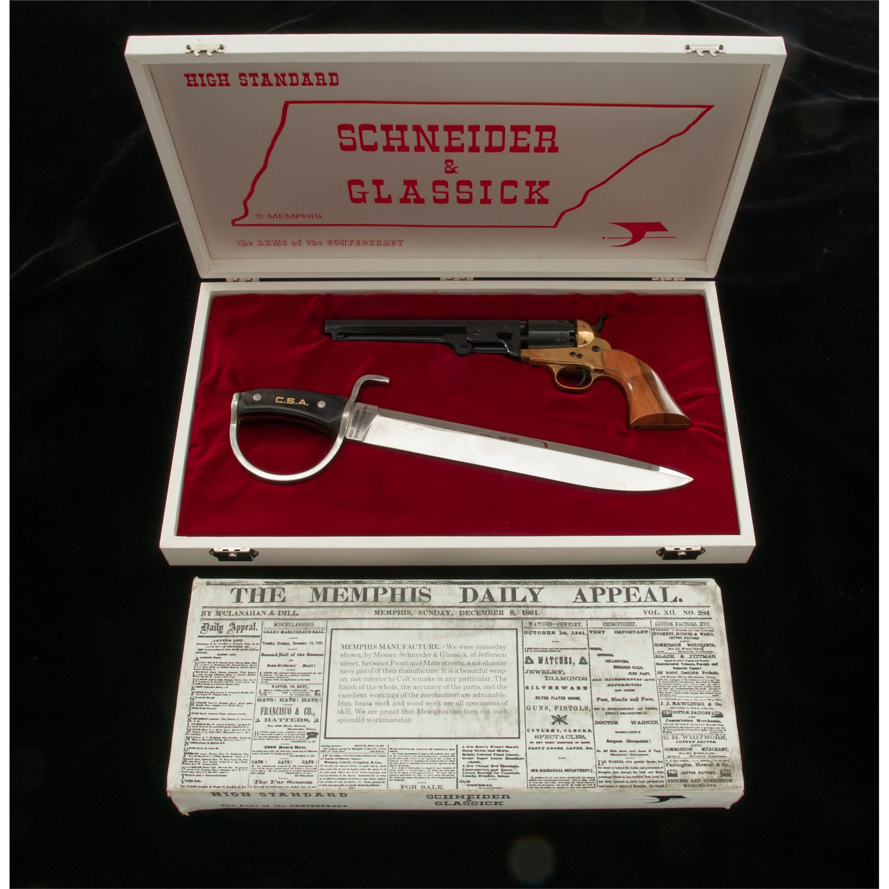 Reproduction Civil War Schneider & Glassick Navy Type Percussion Revolver, with associated Bowie knife, case, packaging and paperwork, #00679, .36 cal., 7.5'' blued octagonal barrel with brass post front sight marked on top flat ''Schneider & Glassick, Memphis Tenn.'' in one line, on left-side lug ''High Standard/Hamden, CT. U.S.A.'' in two lines, and with the serial number on right lug; blued loading lever and plunger, undecorated 6-shot round cylinder, brass frame is marked with the serial number on right side, brass gripstraps, one-piece varnished hardwood grip. Action and bore are mint. Loop guard Bowie knife of polished steel is fitted with two-piece ebonized wood grips marked ''C.S.A.'' on right panel, on right ricasso ''High Standard/Sporting Arms'' in two lines and on left ricasso ''Designed by/Jim Dickson'' in two lines. Hard case to hold both the revolver and Bowie knife is of decorated white leatherette lined with form-fitted red velveteen and contains a small envelope holding two case keys; shipping carton for the revolver is two-piece Styrofoam with a pictorial sleeve and contains a printed exploded view of the revolver with parts nomenclature; two-piece undecorated cardboard shipping box for the knife contains a sleeve for protecting the blade. Condition of the revolver is as new and appearing unfired, retaining all of its original finishes, slightest tarnish to the brass, and no cylinder turn line; Bowie knife is also as new and unblemished; the hard case is sound with only slight external handling marks and a mint, unmarked interior; the revolver shipping carton shows a bit of wear mainly to the outer sleeve and has an end label identifying this specific revolver by model and serial number; the knife shipping box shows tape residue outside but is sound and otherwise clean. Est.: $350-$550. (No FFL Required)