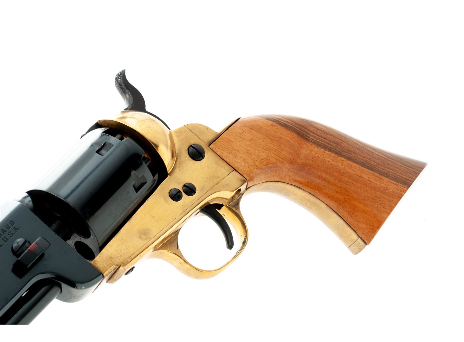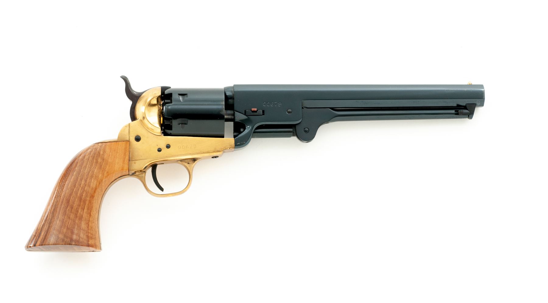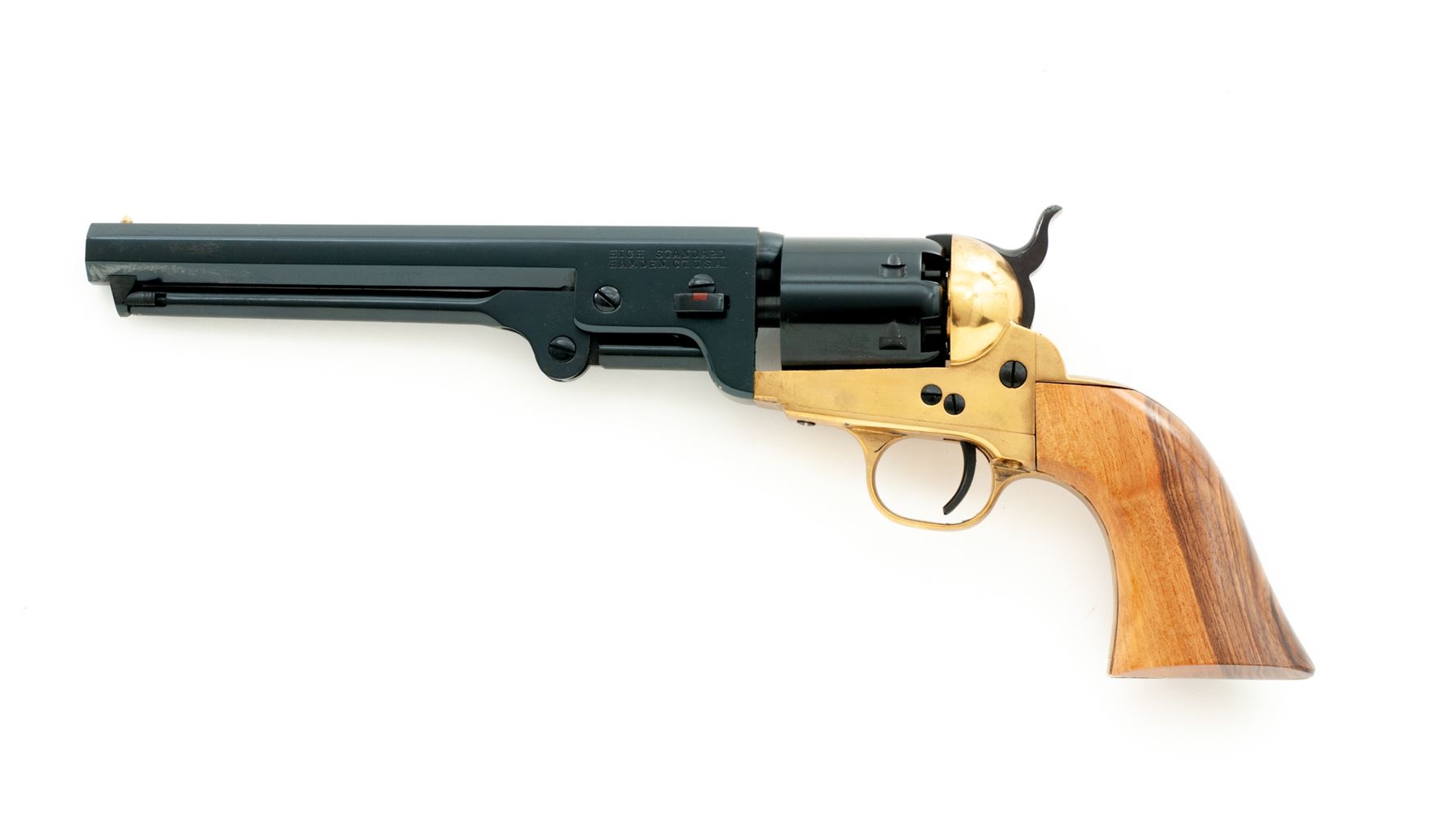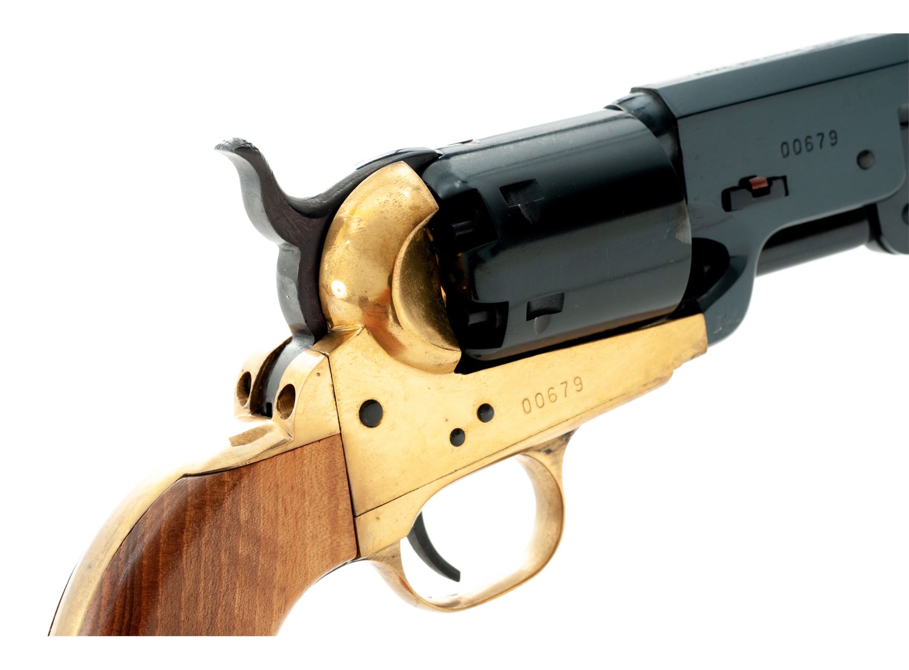 Reproduction Civil War Schneider & Glassick Navy Type Percussion Revolver, with associated Bowie knife, case, packaging and paperwork, #00679, .36 cal., 7.5'' blued octagonal barrel with brass post front sight marked on top flat ''Schneider & Glassick, Memphis Tenn.'' in one line, on left-side lug ''High Standard/Hamden, CT. U.S.A.'' in two lines, and with the serial number on right lug; blued loading lever and plunger, undecorated 6-shot round cylinder, brass frame is marked with the serial number on right side, brass gripstraps, one-piece varnished hardwood grip. Action and bore are mint. Loop guard Bowie knife of polished steel is fitted with two-piece ebonized wood grips marked ''C.S.A.'' on right panel, on right ricasso ''High Standard/Sporting Arms'' in two lines and on left ricasso ''Designed by/Jim Dickson'' in two lines. Hard case to hold both the revolver and Bowie knife is of decorated white leatherette lined with form-fitted red velveteen and contains a small envelope holding two case keys; shipping carton for the revolver is two-piece Styrofoam with a pictorial sleeve and contains a printed exploded view of the revolver with parts nomenclature; two-piece undecorated cardboard shipping box for the knife contains a sleeve for protecting the blade. Condition of the revolver is as new and appearing unfired, retaining all of its original finishes, slightest tarnish to the brass, and no cylinder turn line; Bowie knife is also as new and unblemished; the hard case is sound with only slight external handling marks and a mint, unmarked interior; the revolver shipping carton shows a bit of wear mainly to the outer sleeve and has an end label identifying this specific revolver by model and serial number; the knife shipping box shows tape residue outside but is sound and otherwise clean. Est.: $350-$550. (No FFL Required)